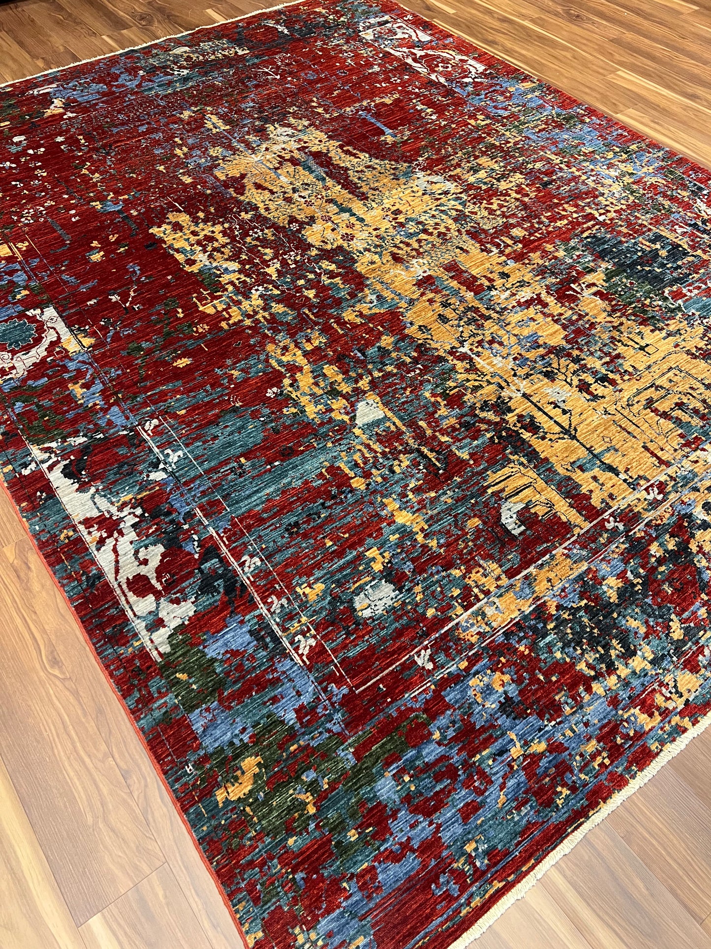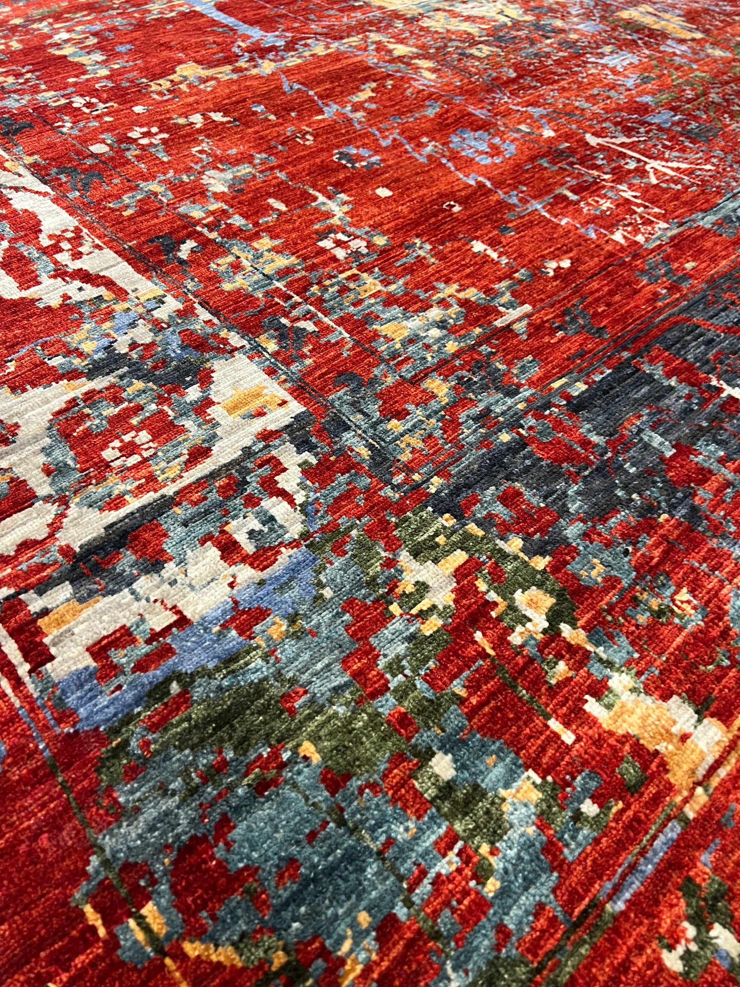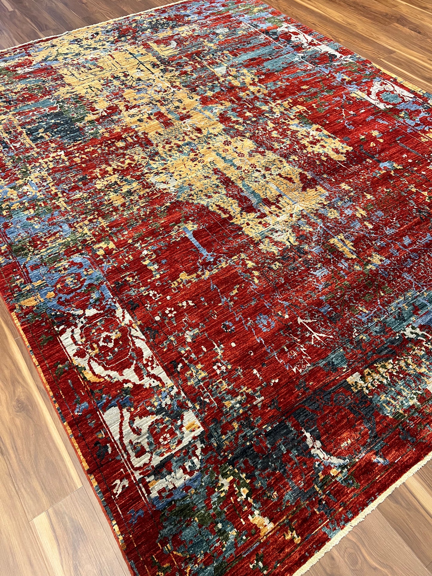 This captivating Abstract Serapi rug exhibits a harmonious blend of traditional Serapi motifs with a modern abstract design. The juxtaposition creates an alluring aesthetic, infusing classic elegance with contemporary flair. Various hues of red, orange, blue, and beige combine to form a dynamic pattern that offers depth and texture. Made from high-quality wool, the rug is both luxurious and durable, suitable for any room looking to add a touch of artistic sophistication.