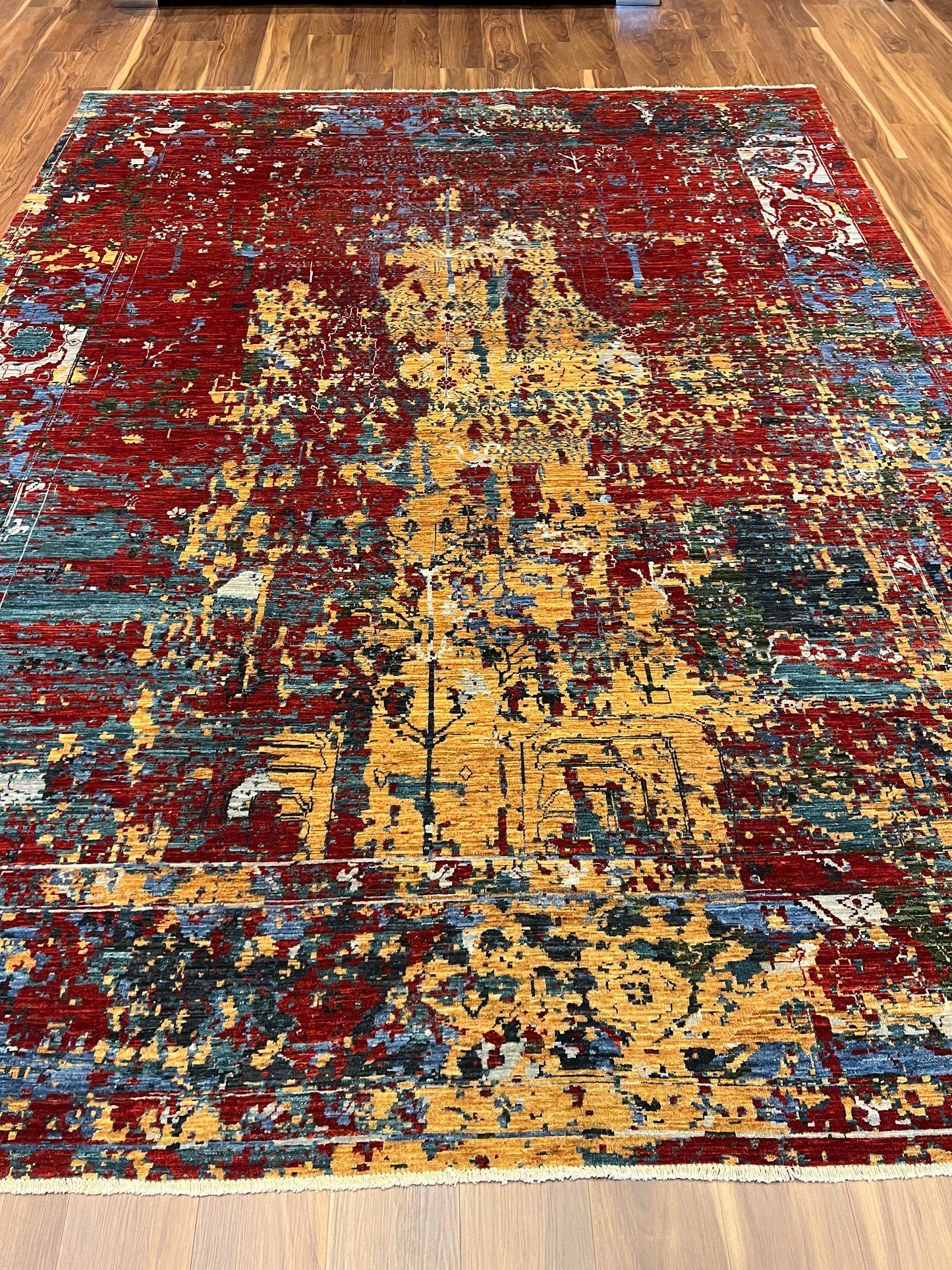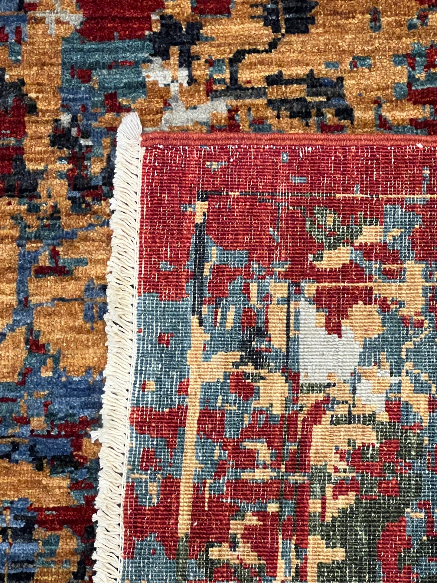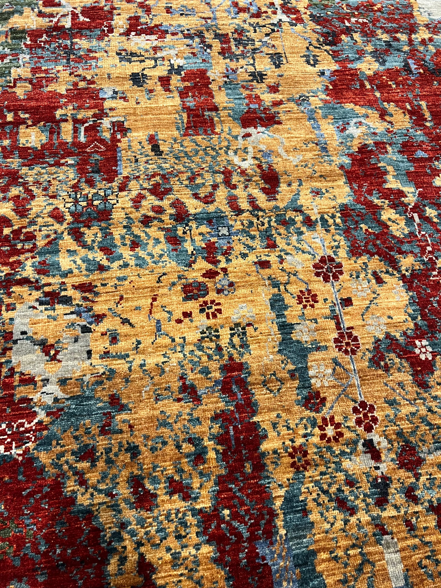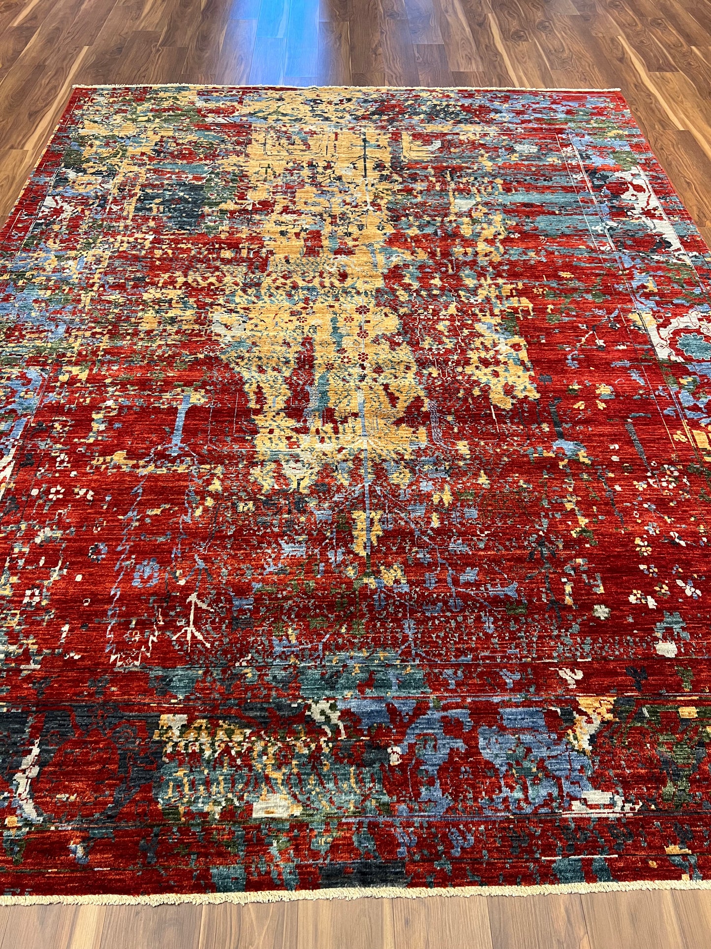 This captivating Abstract Serapi rug exhibits a harmonious blend of traditional Serapi motifs with a modern abstract design. The juxtaposition creates an alluring aesthetic, infusing classic elegance with contemporary flair. Various hues of red, orange, blue, and beige combine to form a dynamic pattern that offers depth and texture. Made from high-quality wool, the rug is both luxurious and durable, suitable for any room looking to add a touch of artistic sophistication.