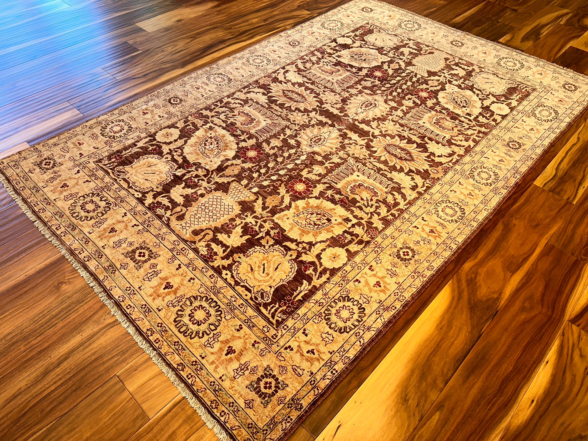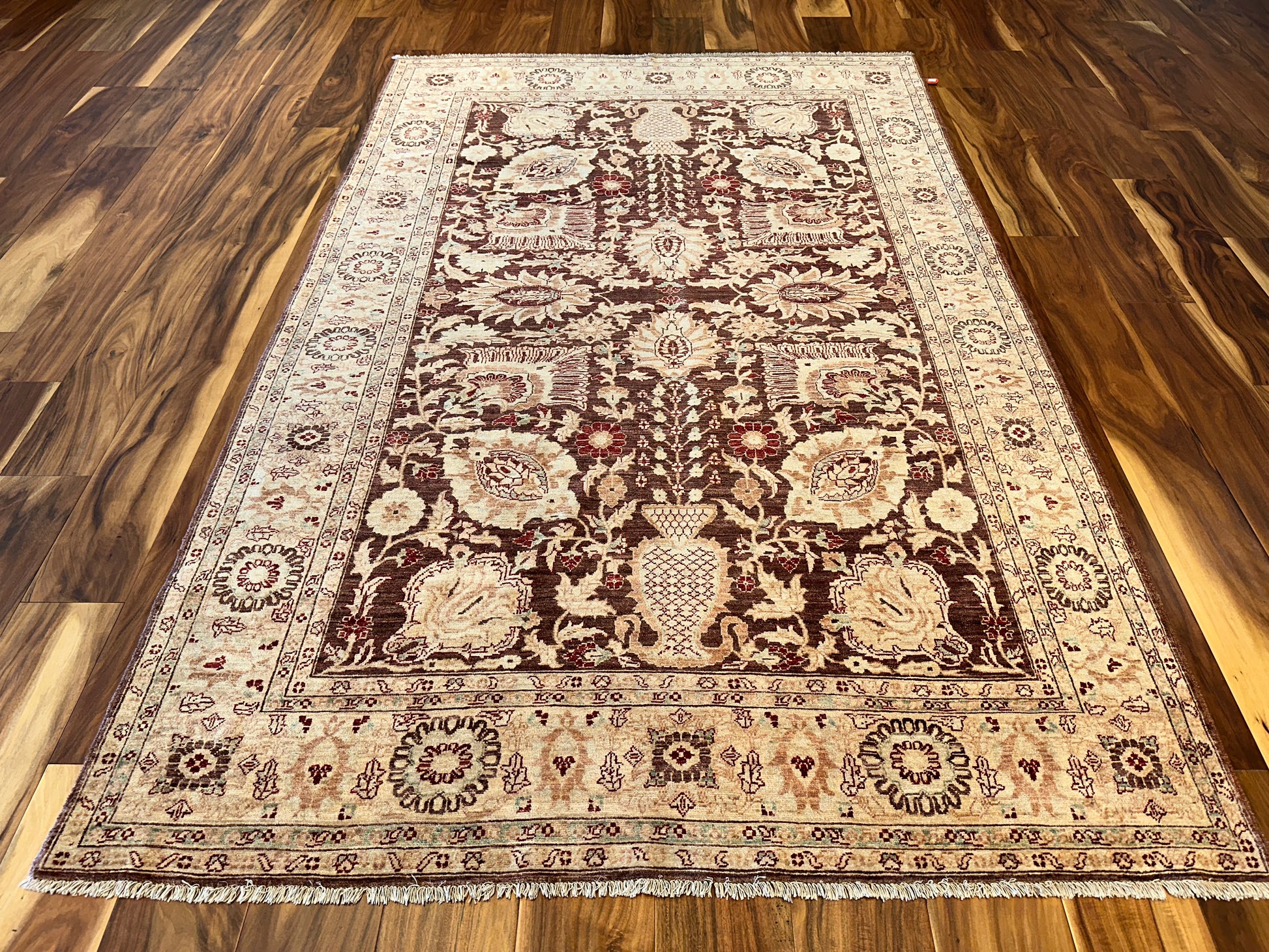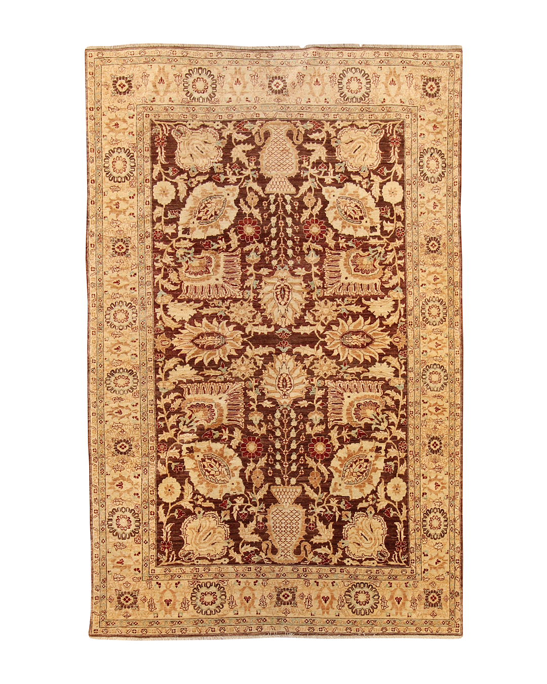 Richly detailed and deeply traditional, this handmade rug showcases a classic vase-and-palmette design set against a brown field. Intricate floral motifs unfold in mirrored symmetry, while the soft beige border provides an elegant contrast with rosette medallions and vinework. The warm palette and refined patterning lend it a timeless appeal steeped in old-world artistry.