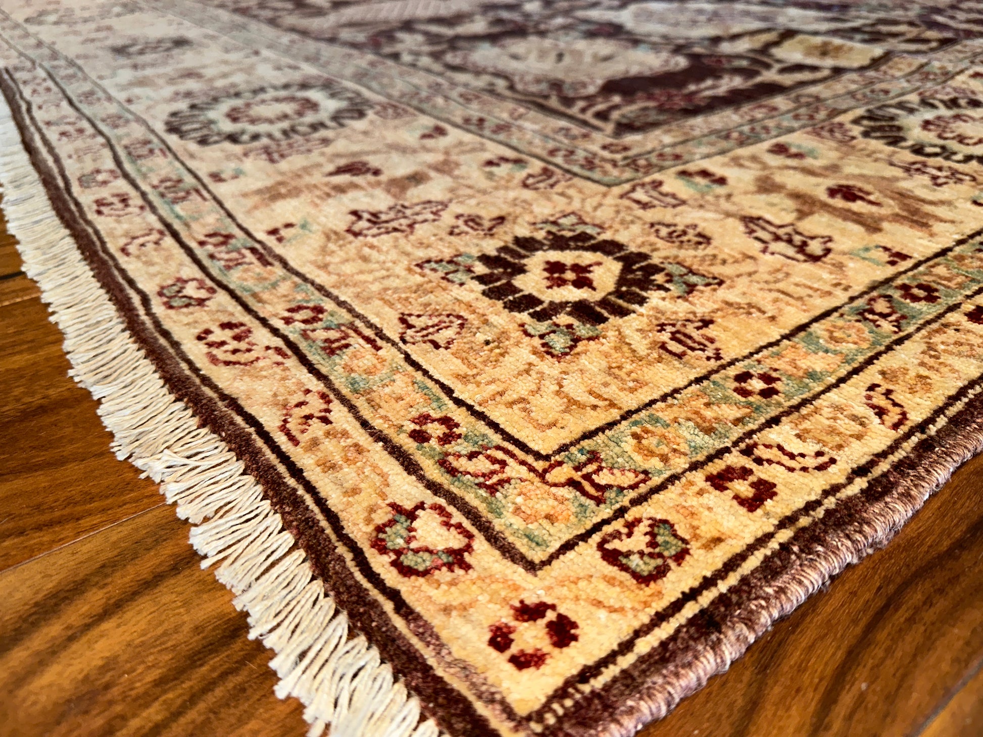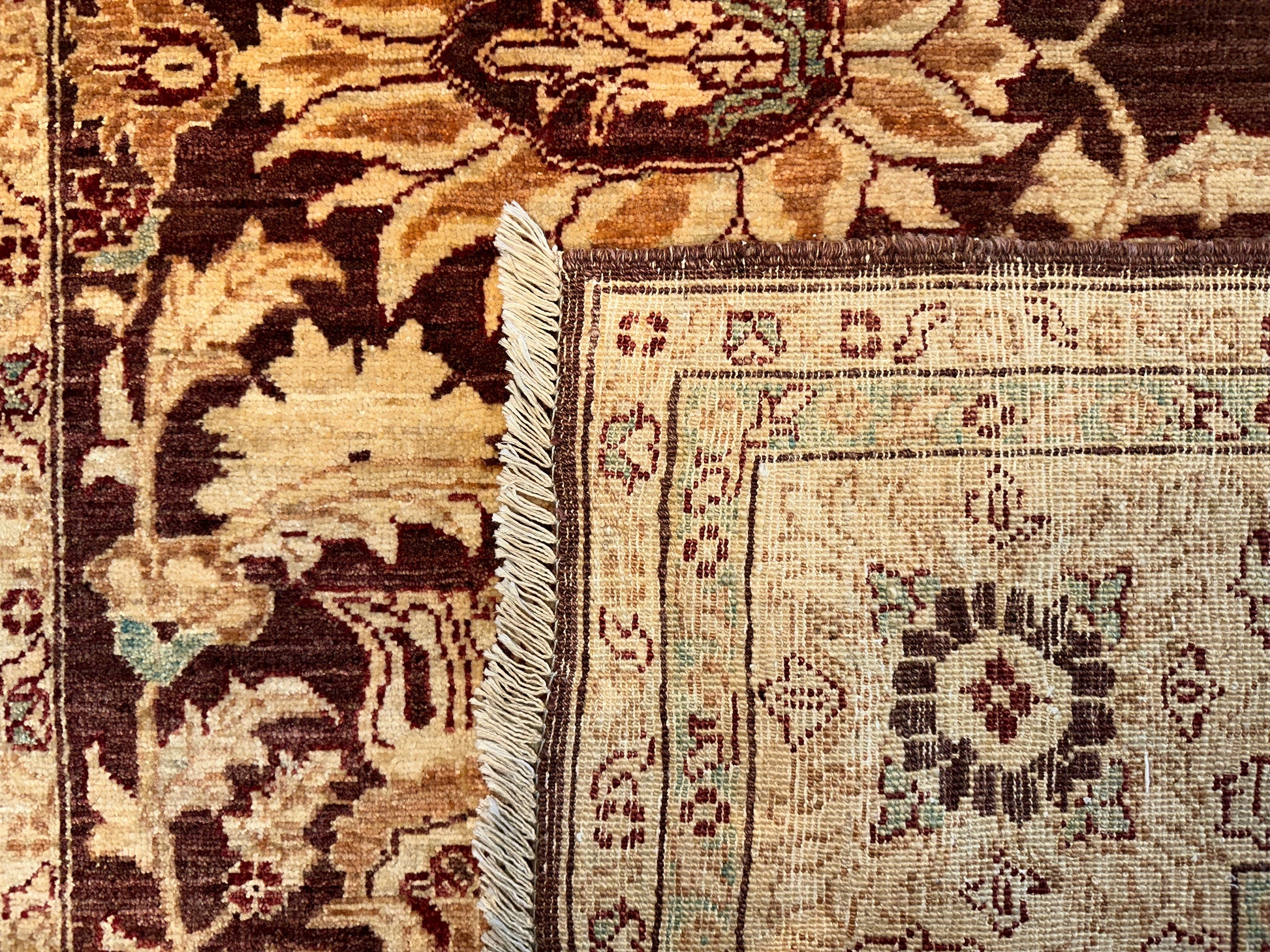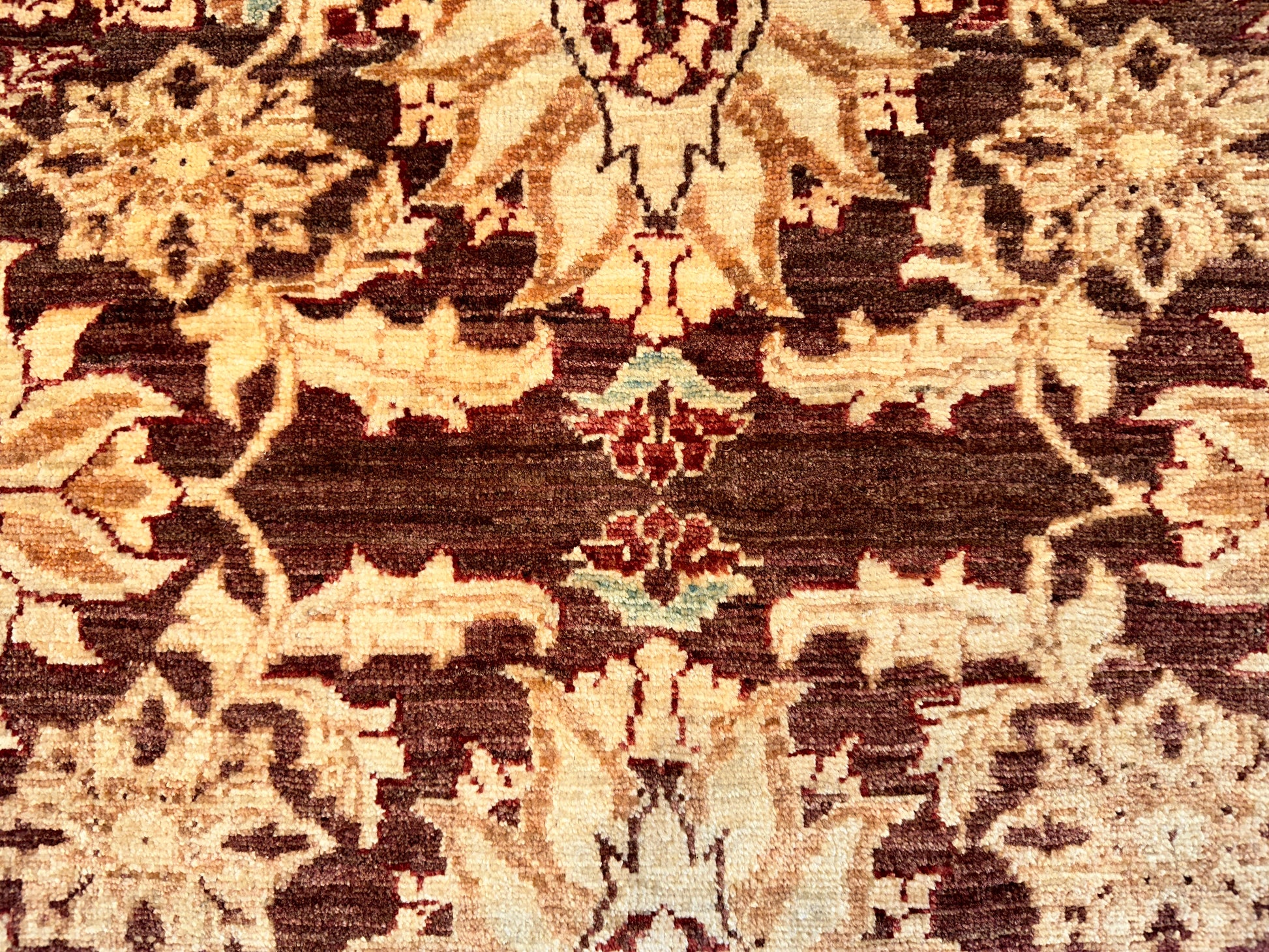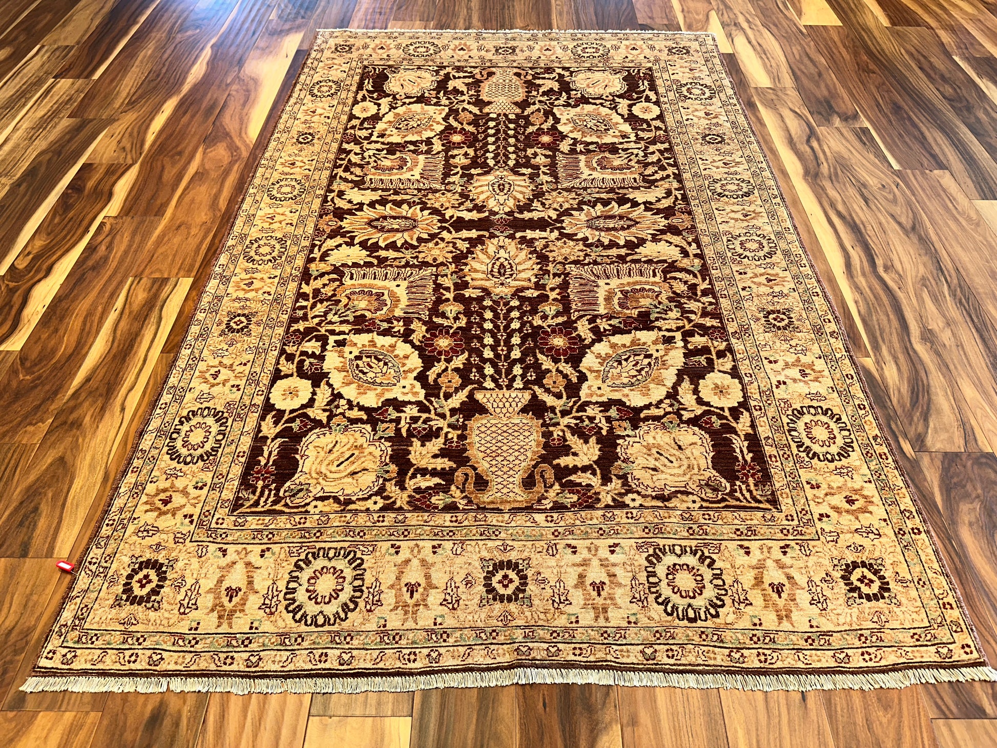 Richly detailed and deeply traditional, this handmade rug showcases a classic vase-and-palmette design set against a brown field. Intricate floral motifs unfold in mirrored symmetry, while the soft beige border provides an elegant contrast with rosette medallions and vinework. The warm palette and refined patterning lend it a timeless appeal steeped in old-world artistry.