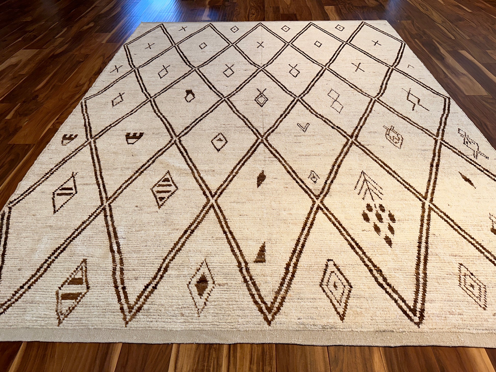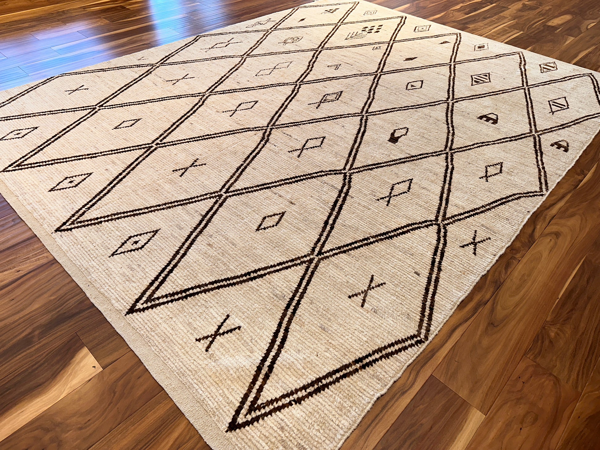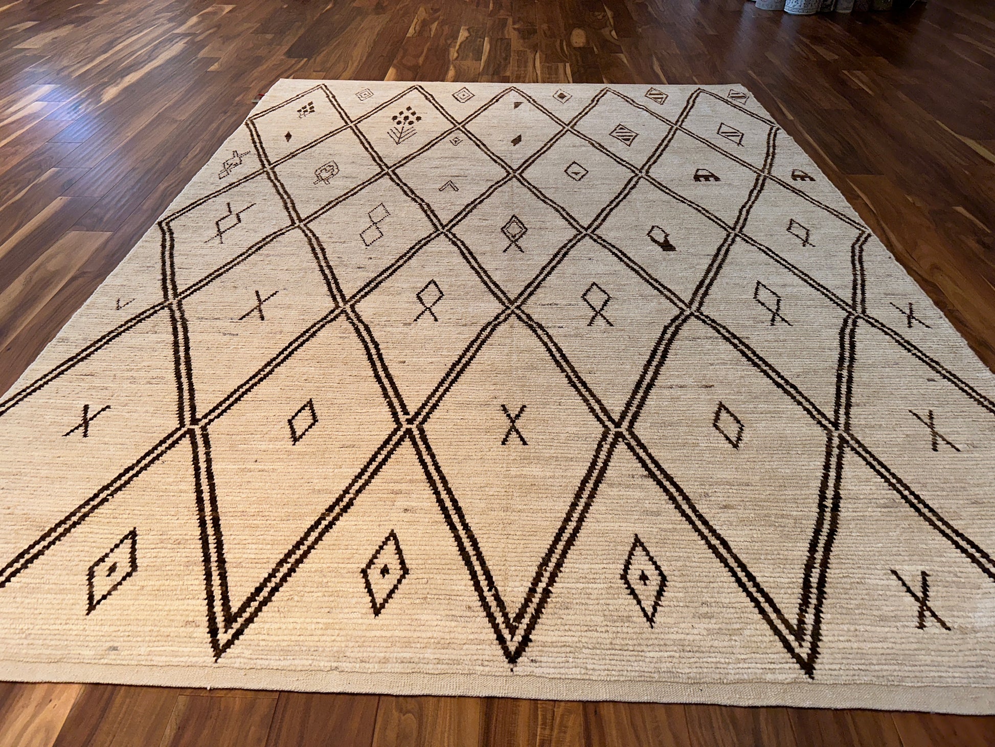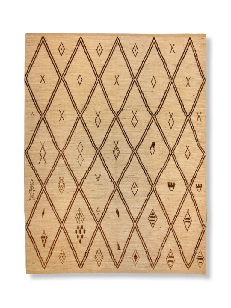 This rug channels the rustic charm of traditional Berber motifs with a modern sensibility. Hand-knotted in a warm beige palette with rich brown diamond and tribal patterns, it brings a sense of heritage and warmth to any interior.