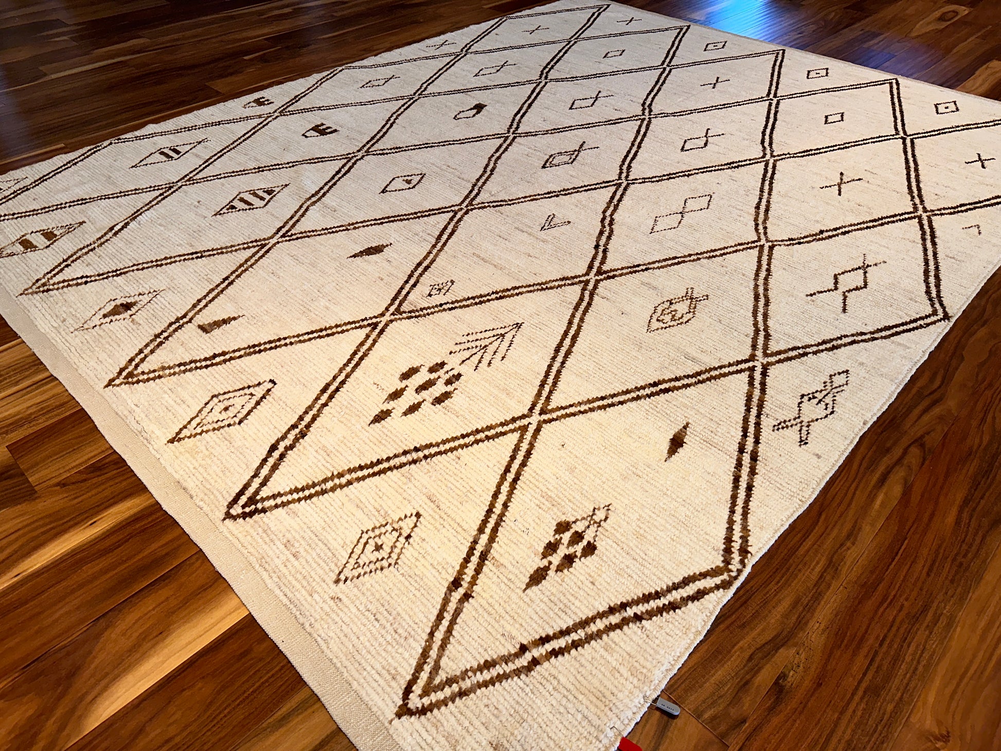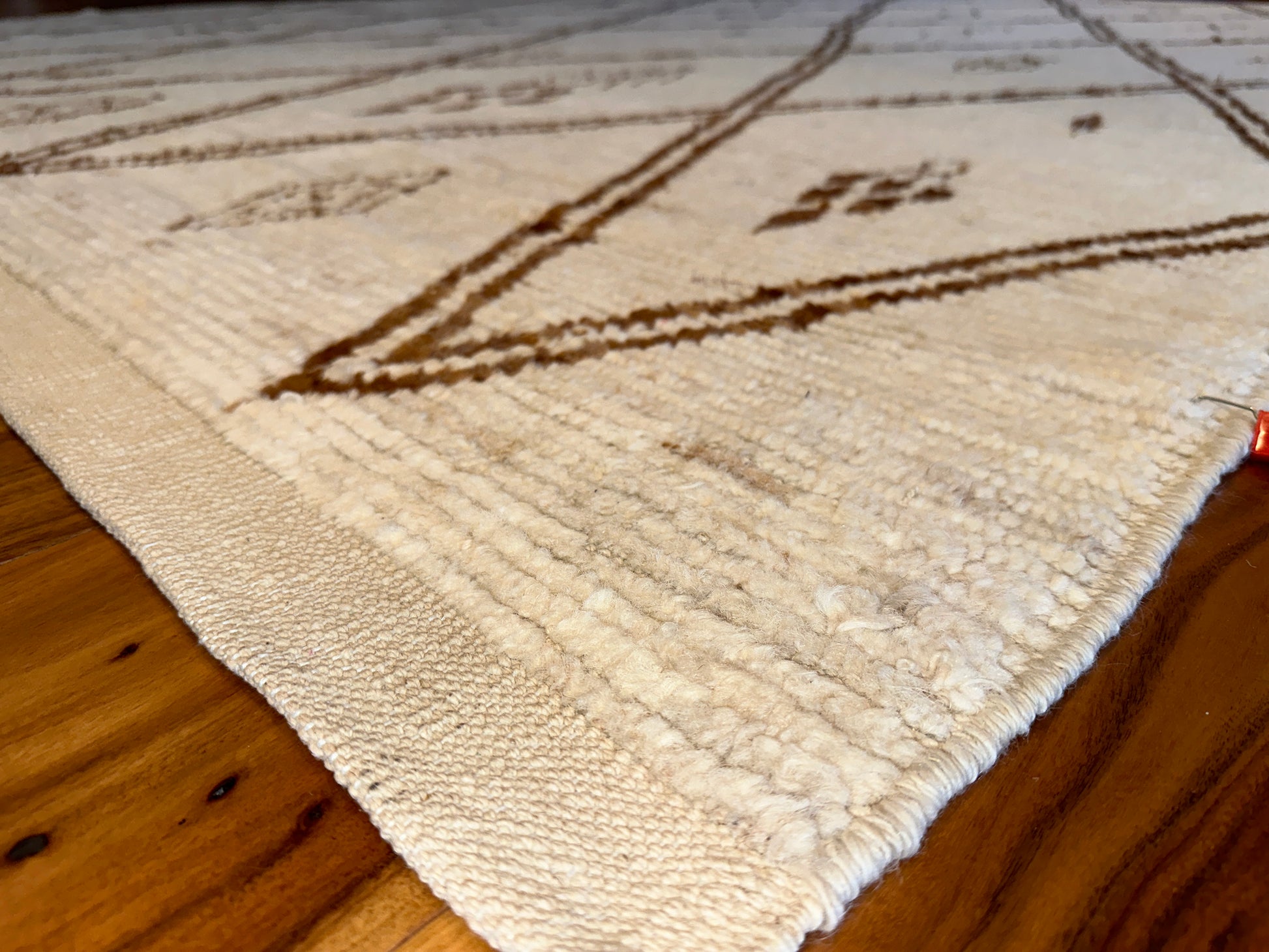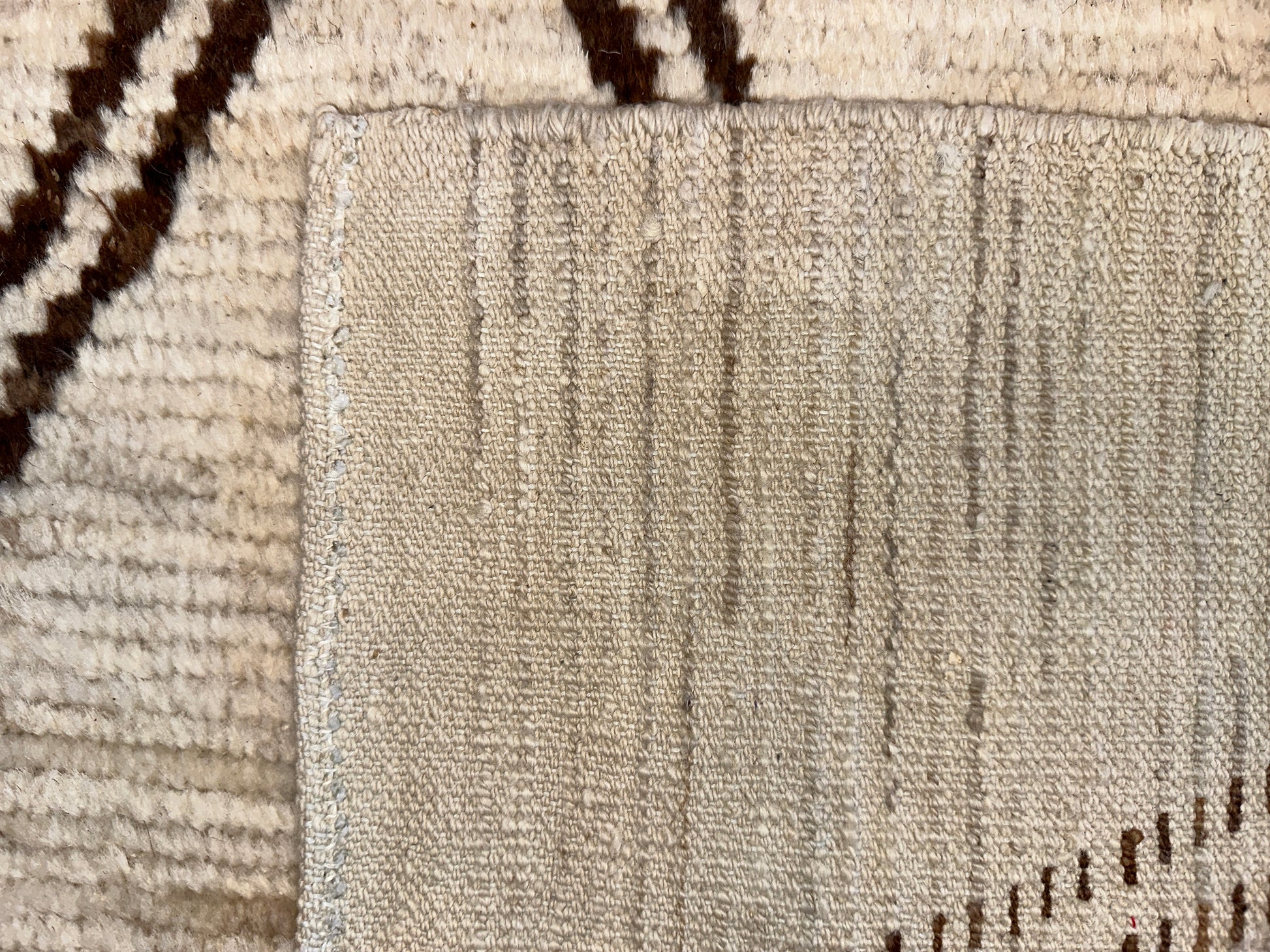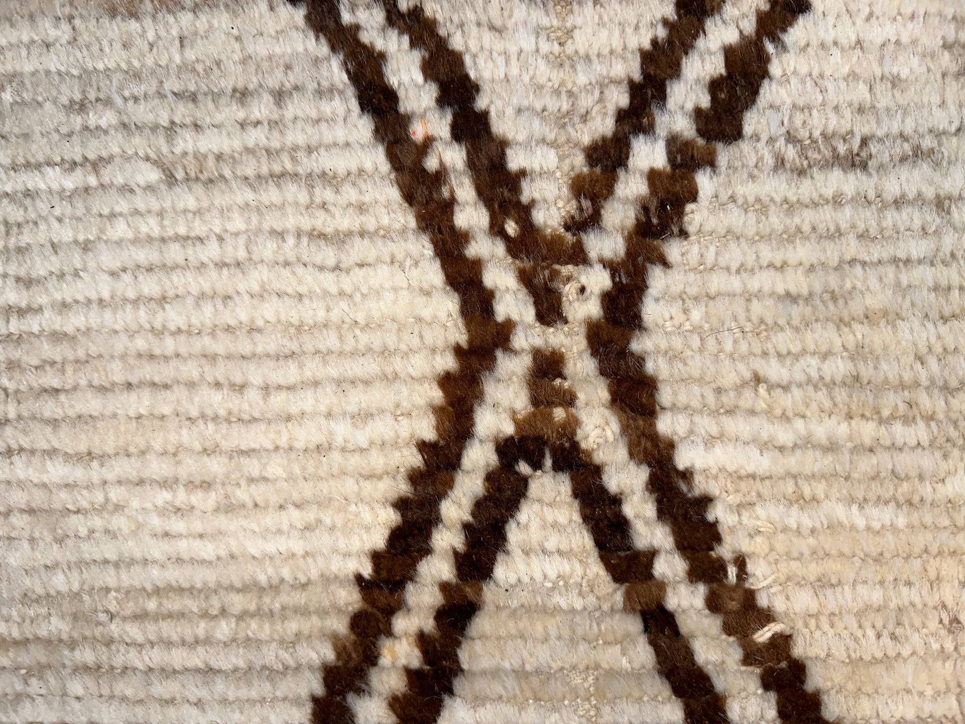 This rug channels the rustic charm of traditional Berber motifs with a modern sensibility. Hand-knotted in a warm beige palette with rich brown diamond and tribal patterns, it brings a sense of heritage and warmth to any interior.