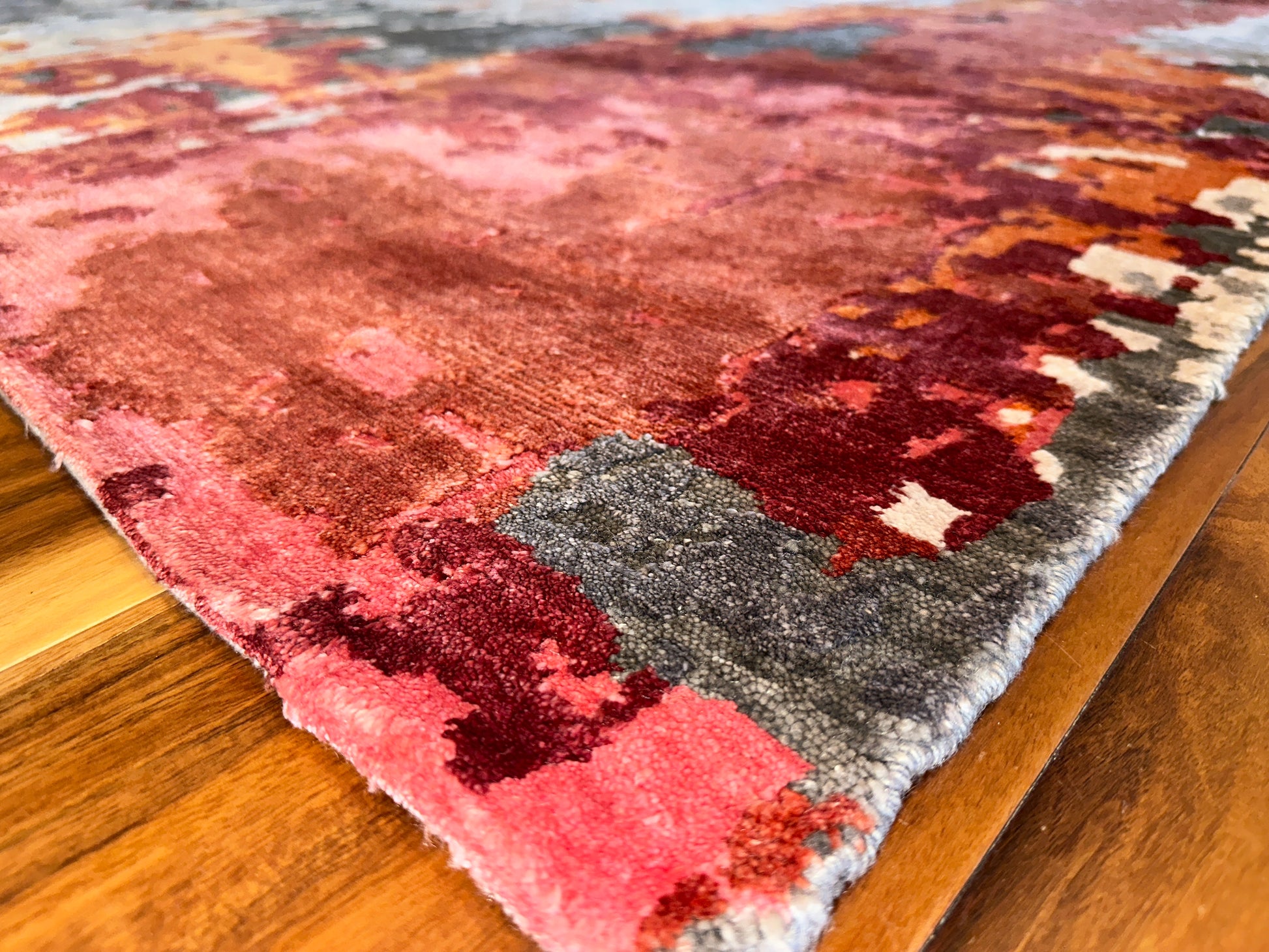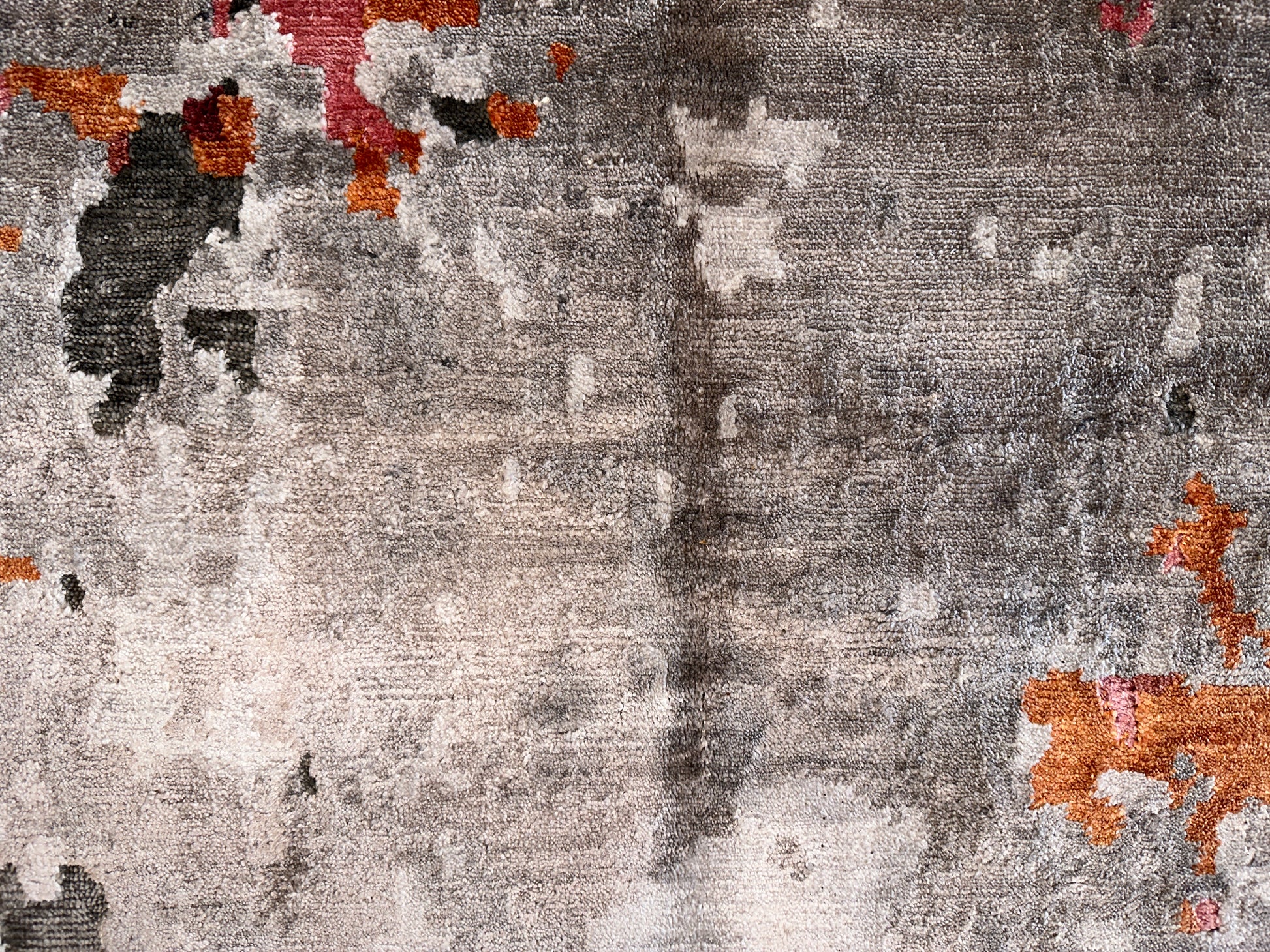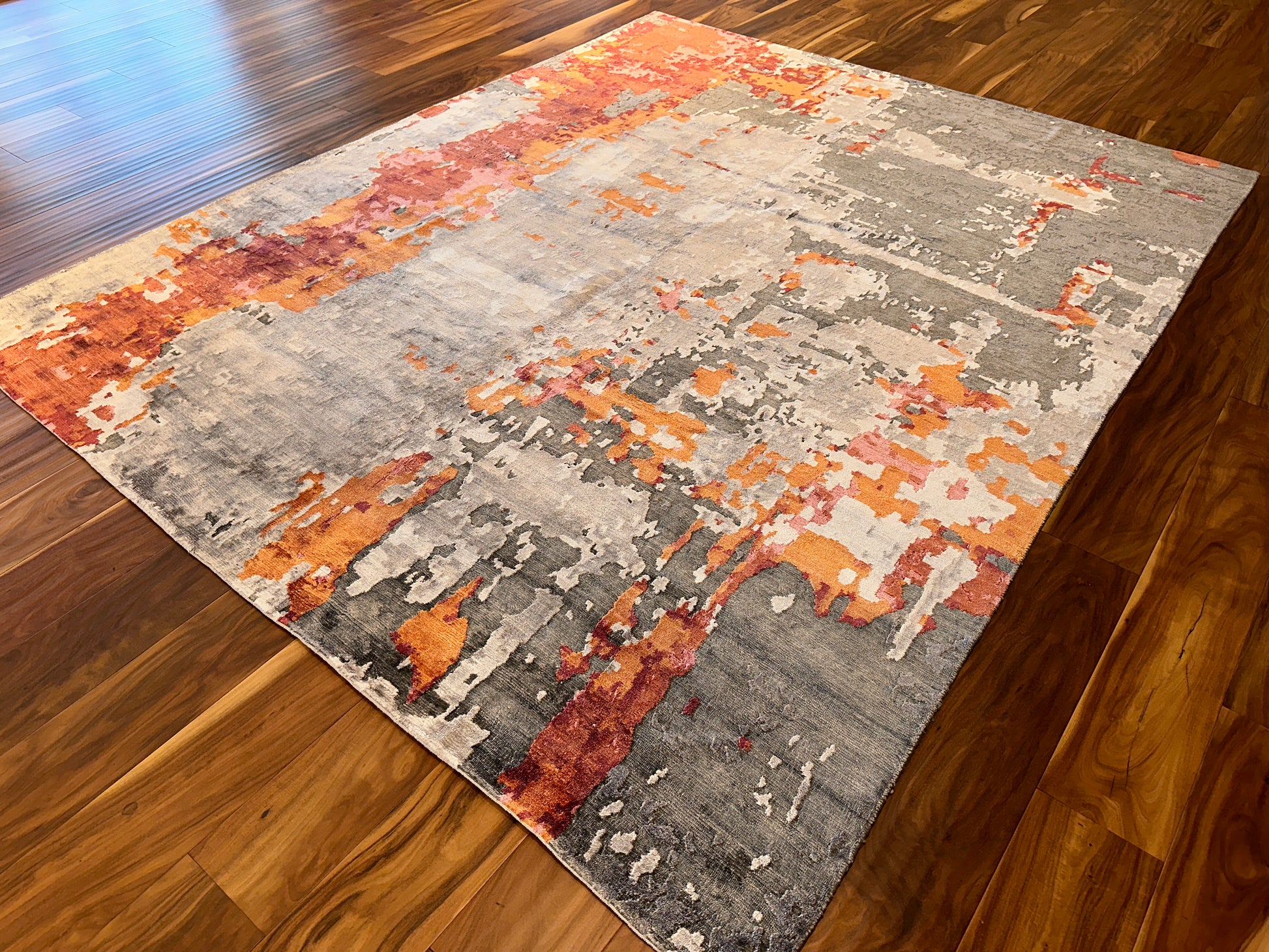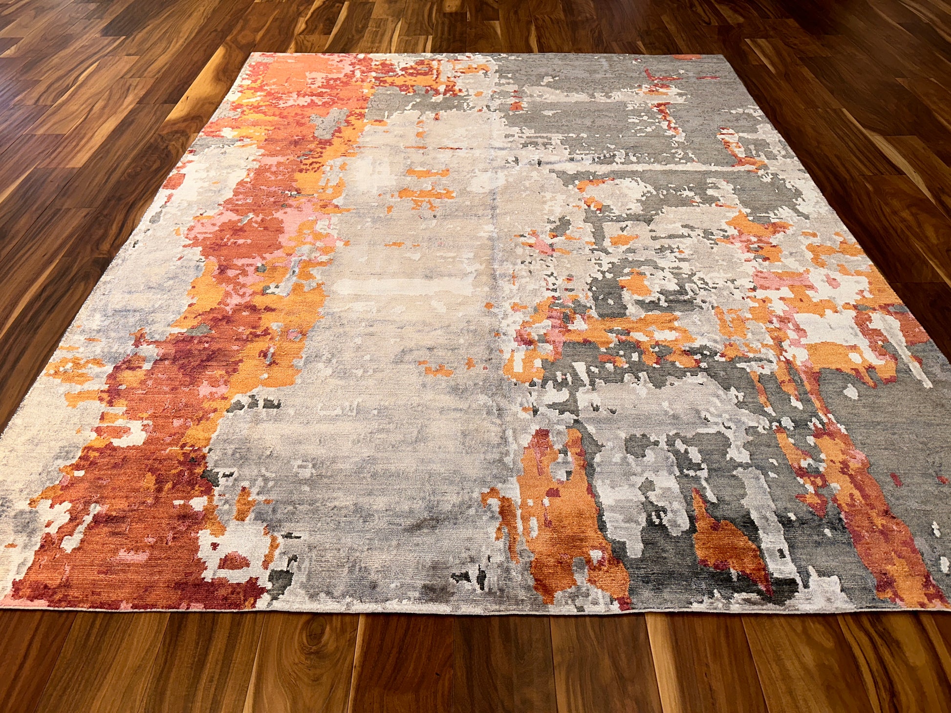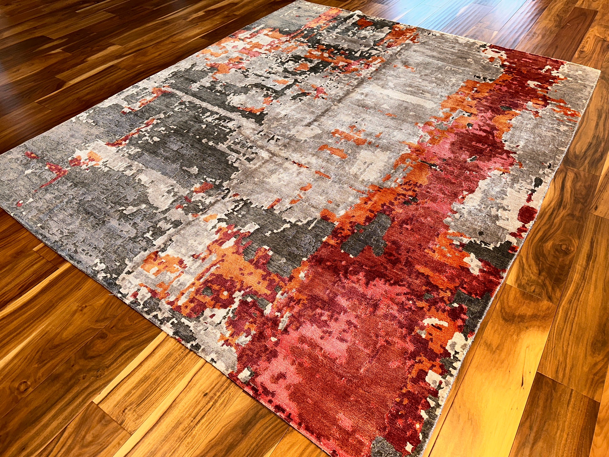 Bold, expressive, and full of energy, this rug features a dynamic mix of earthy greys, burnt orange, and fiery reds. Its abstract pattern evokes the feeling of a crisp fall landscape in motion, adding warmth and character to any contemporary space.