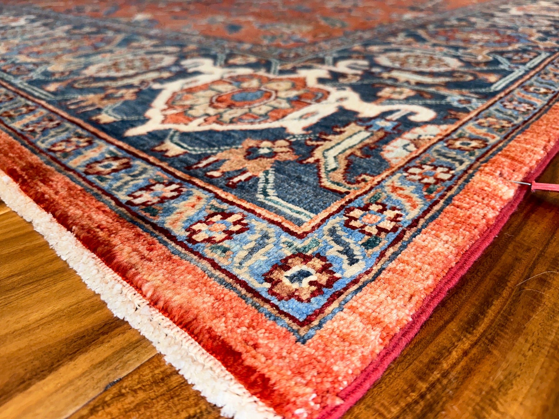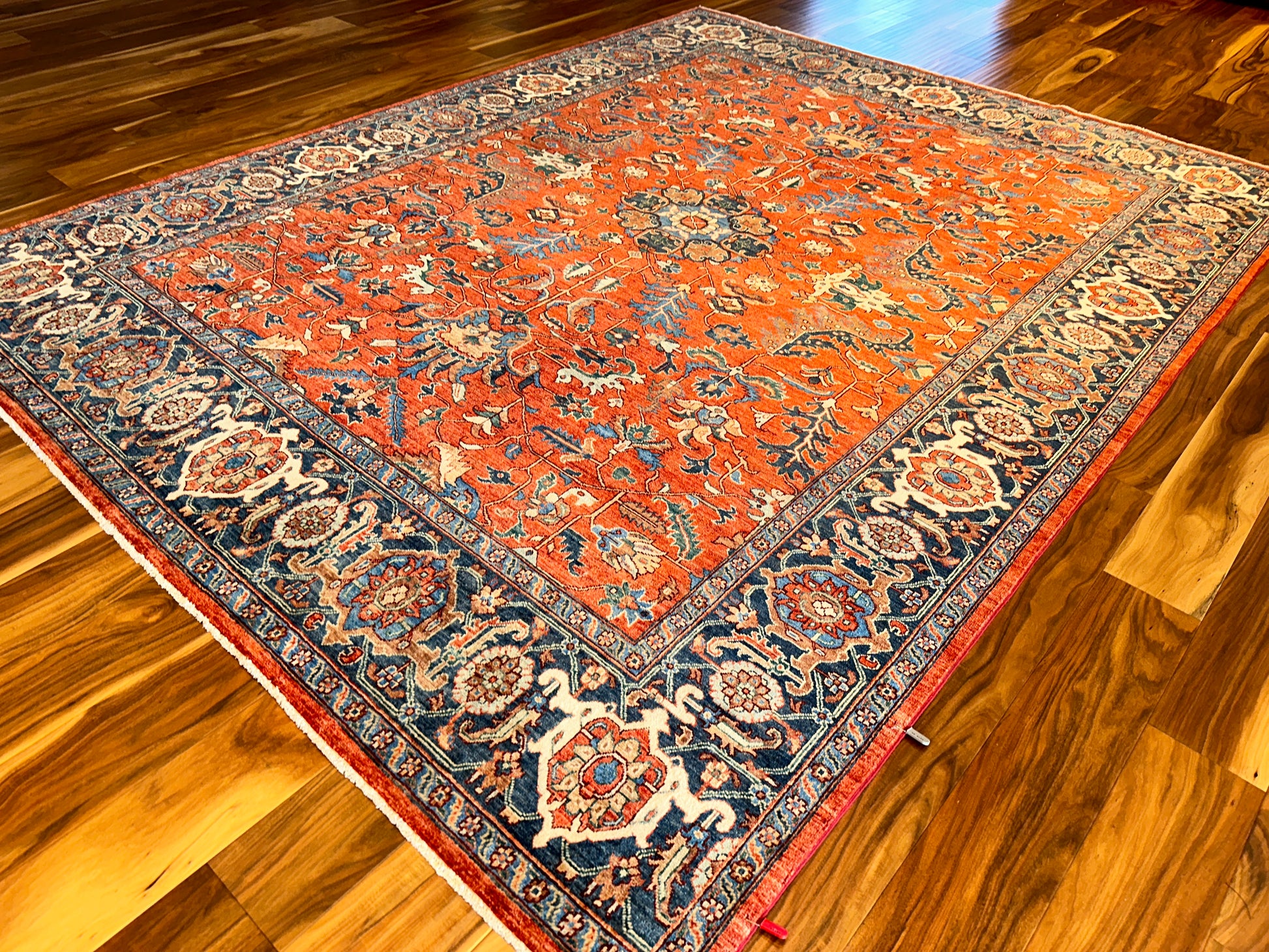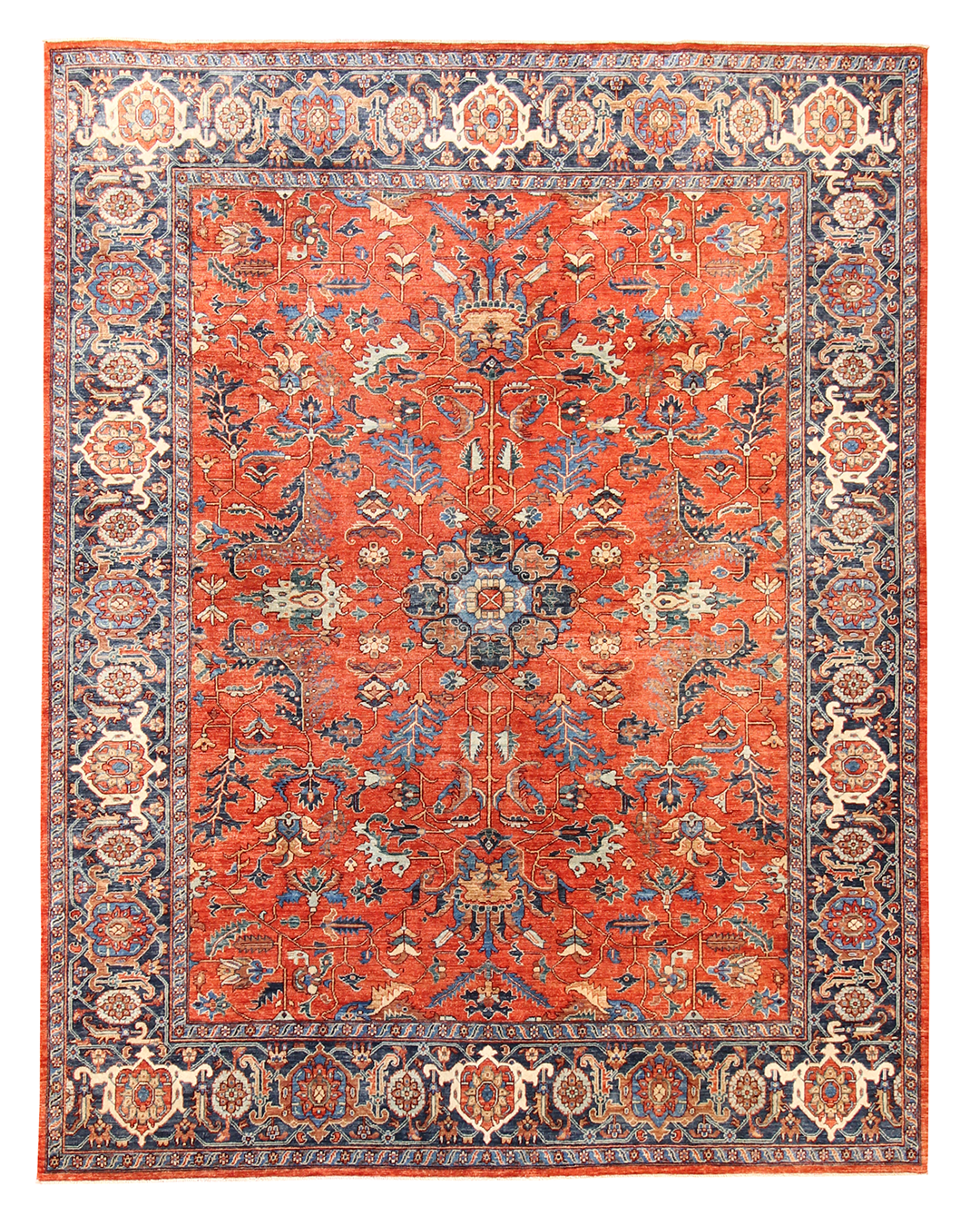 This striking handwoven rug features a deep orange field richly adorned with stylized floral motifs in sapphire blue, ivory, and soft camel tones. The central medallion and branching details create a sense of symmetry and movement, while the midnight blue border, intricately patterned with palmettes and scrolling vines, brings definition and depth to the piece. Bold yet balanced, it makes a confident statement in more formal living or dining areas.