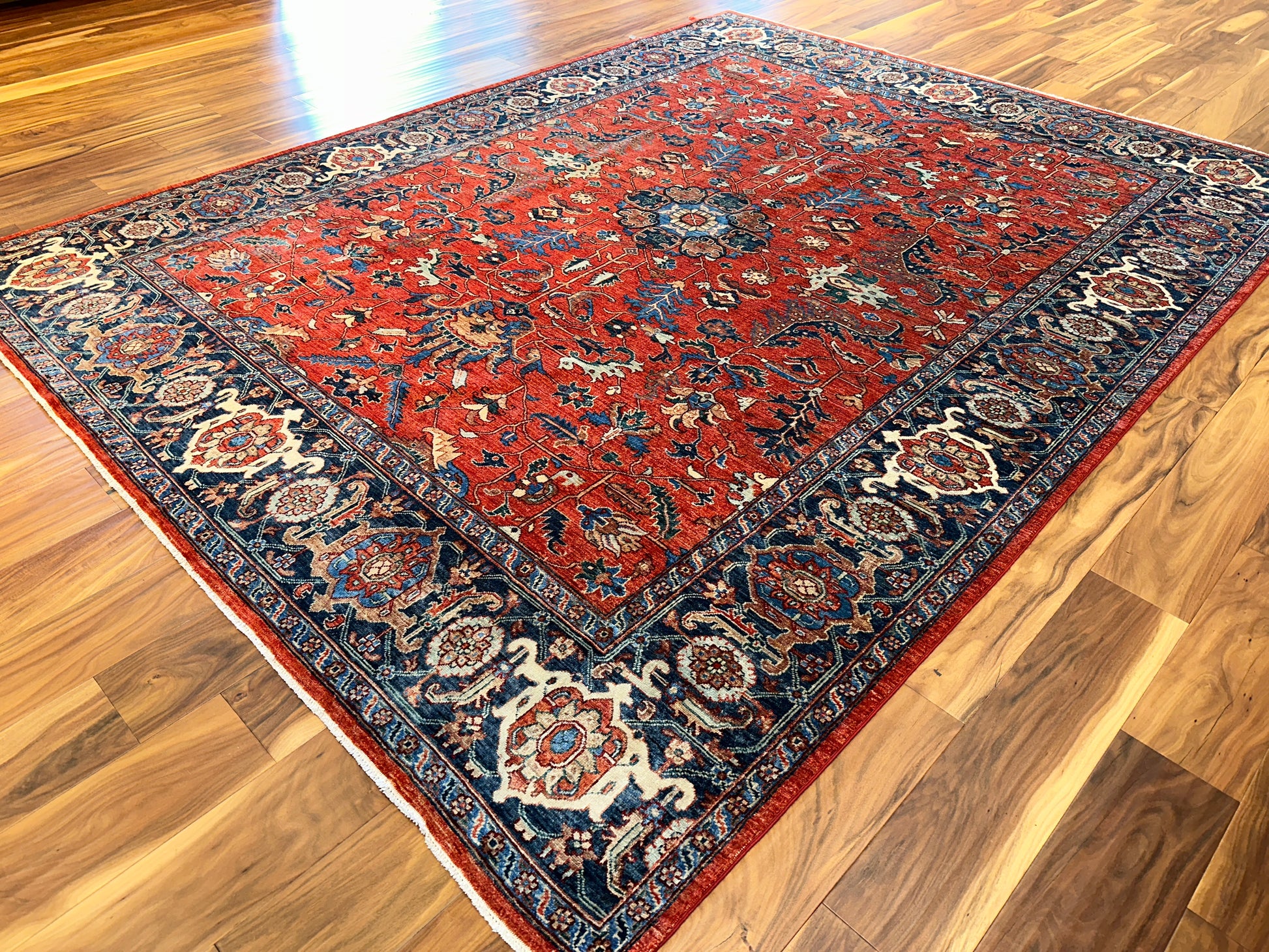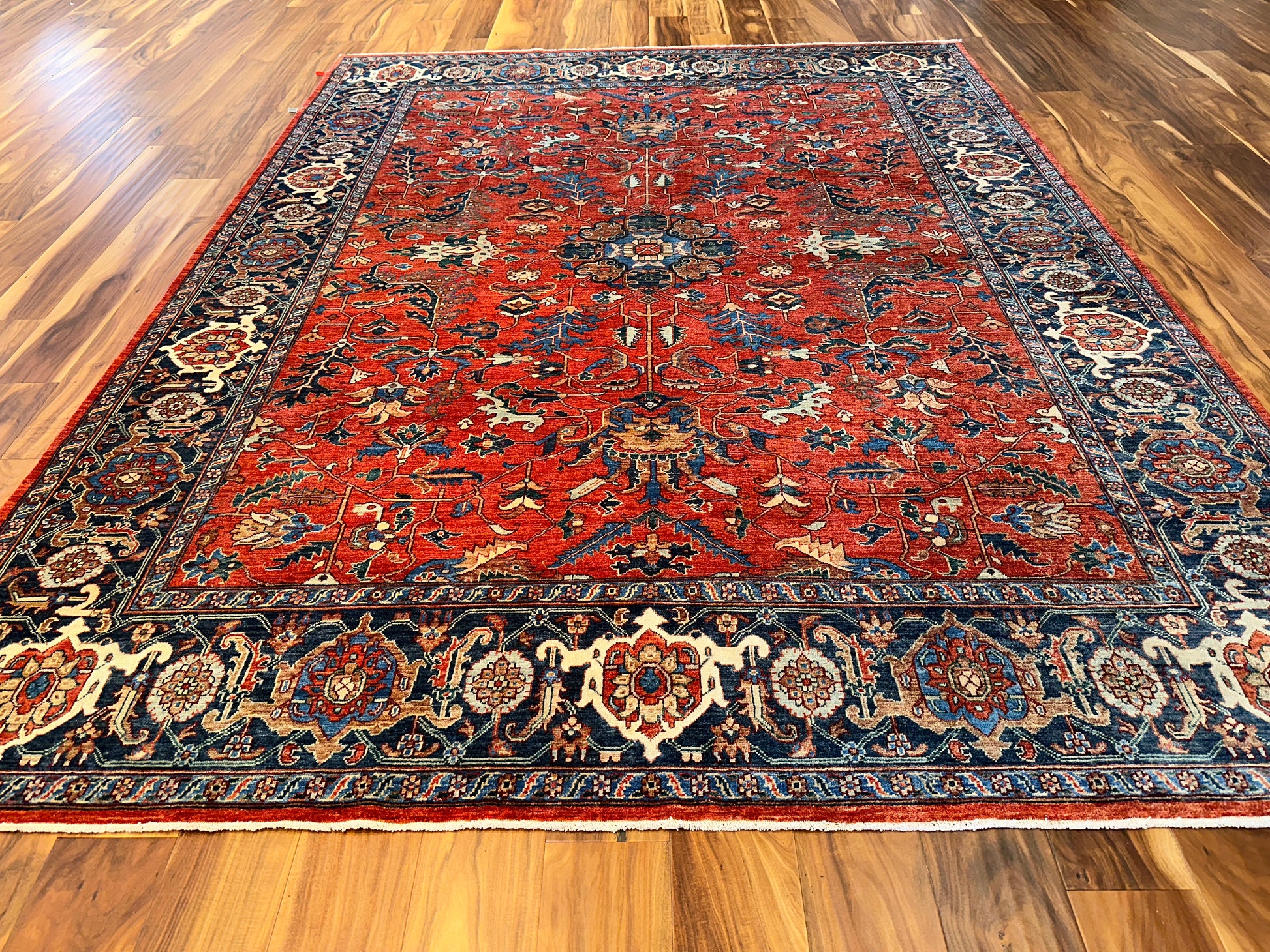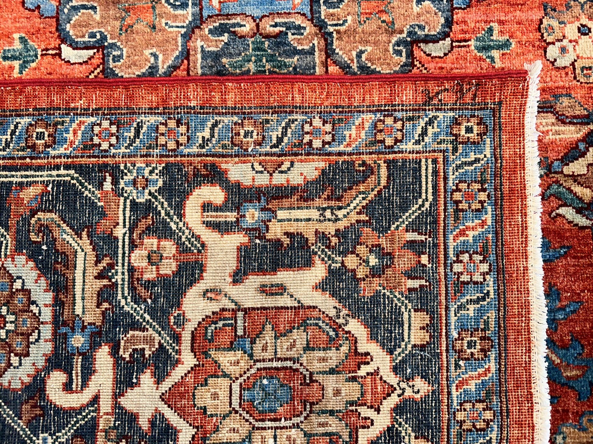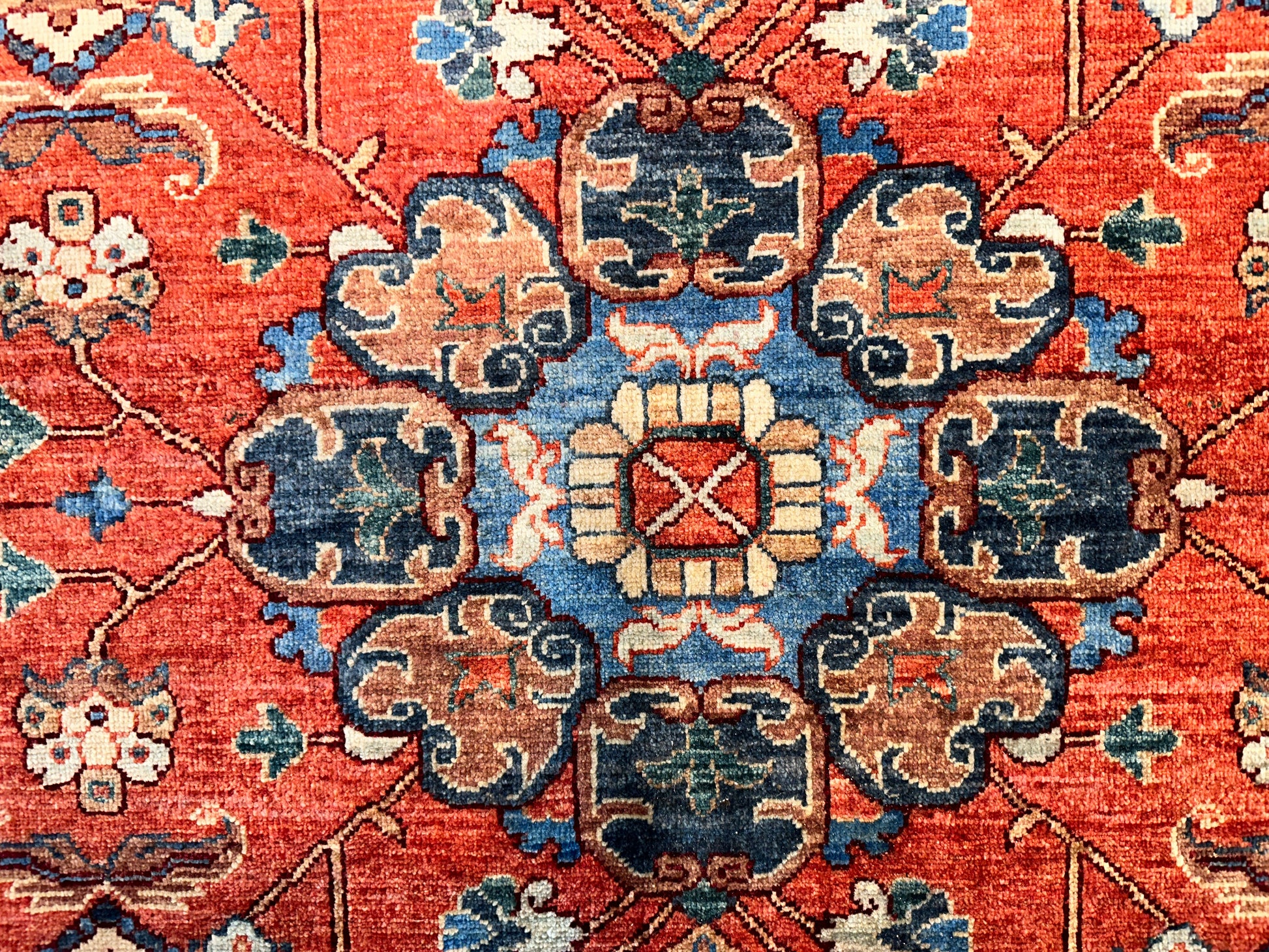 This striking handwoven rug features a deep orange field richly adorned with stylized floral motifs in sapphire blue, ivory, and soft camel tones. The central medallion and branching details create a sense of symmetry and movement, while the midnight blue border, intricately patterned with palmettes and scrolling vines, brings definition and depth to the piece. Bold yet balanced, it makes a confident statement in more formal living or dining areas.
