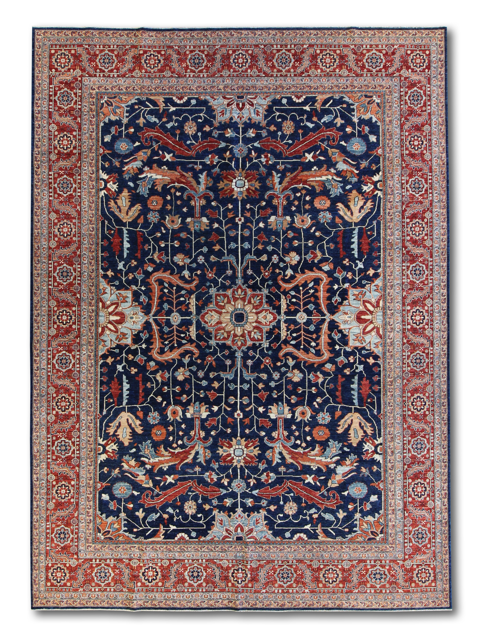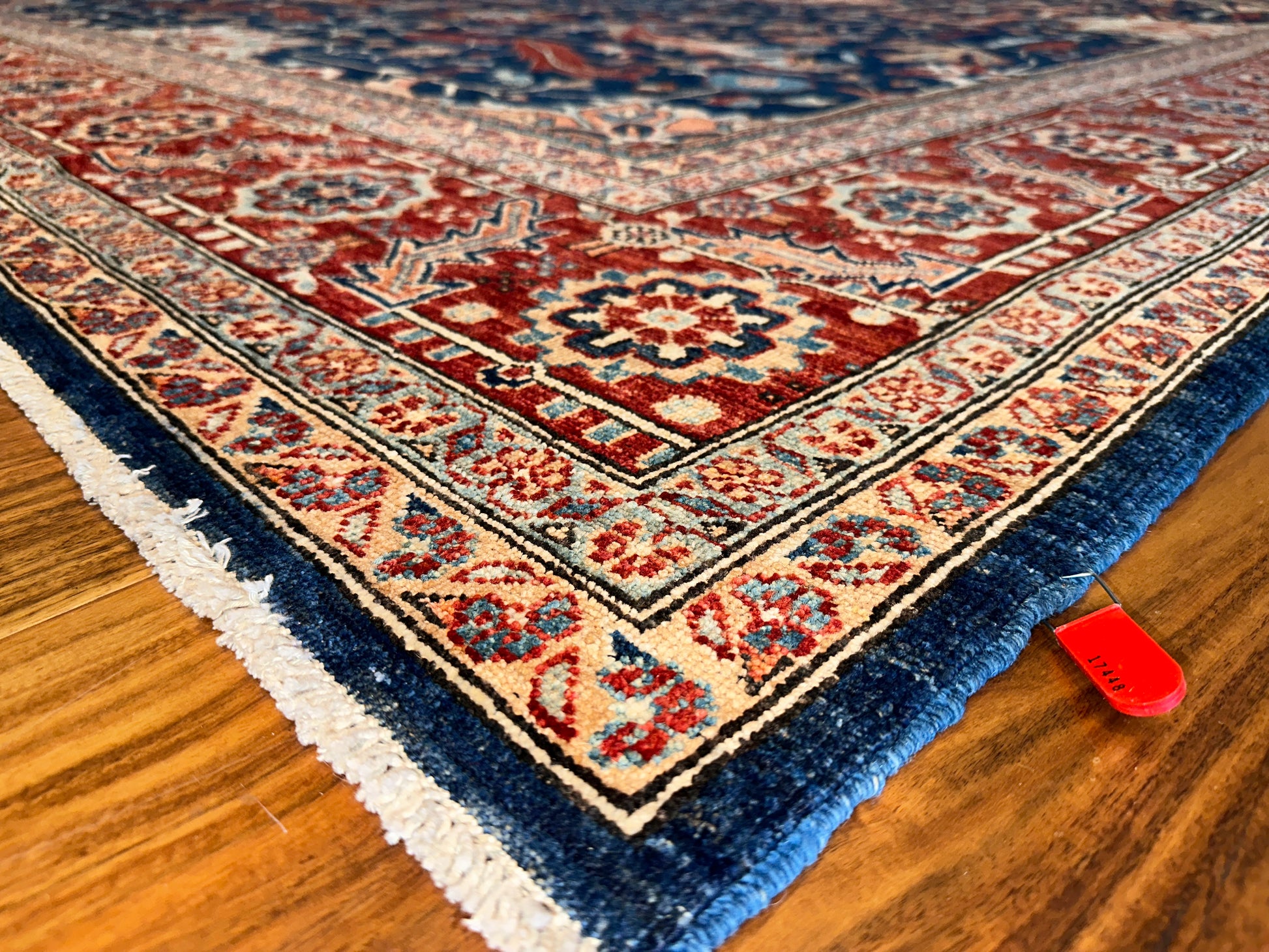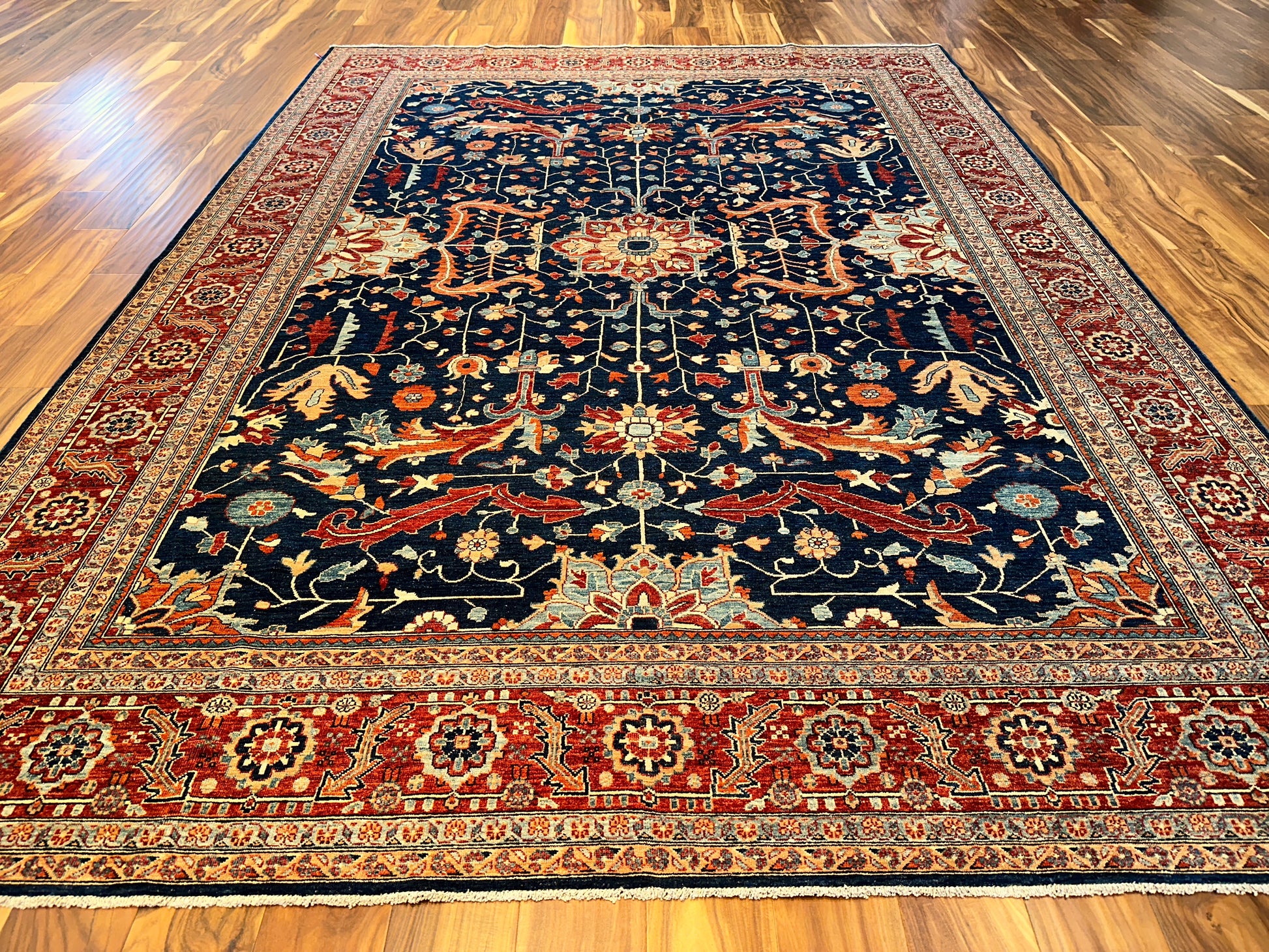 This striking handwoven rug features a deeply saturated midnight blue field, brought to life by an intricate Herati-style lattice of stylized blossoms, rosettes, and vinework. Terracotta, ivory, and pale blue details lend vivid contrast and rhythmic movement, framed by a rich red border that grounds the entire composition with classic elegance. A refined and expressive piece perfect for anchoring grand interiors.
