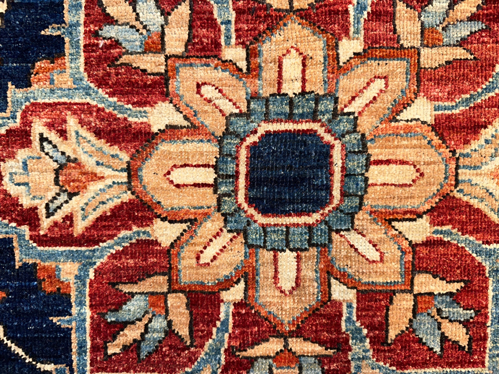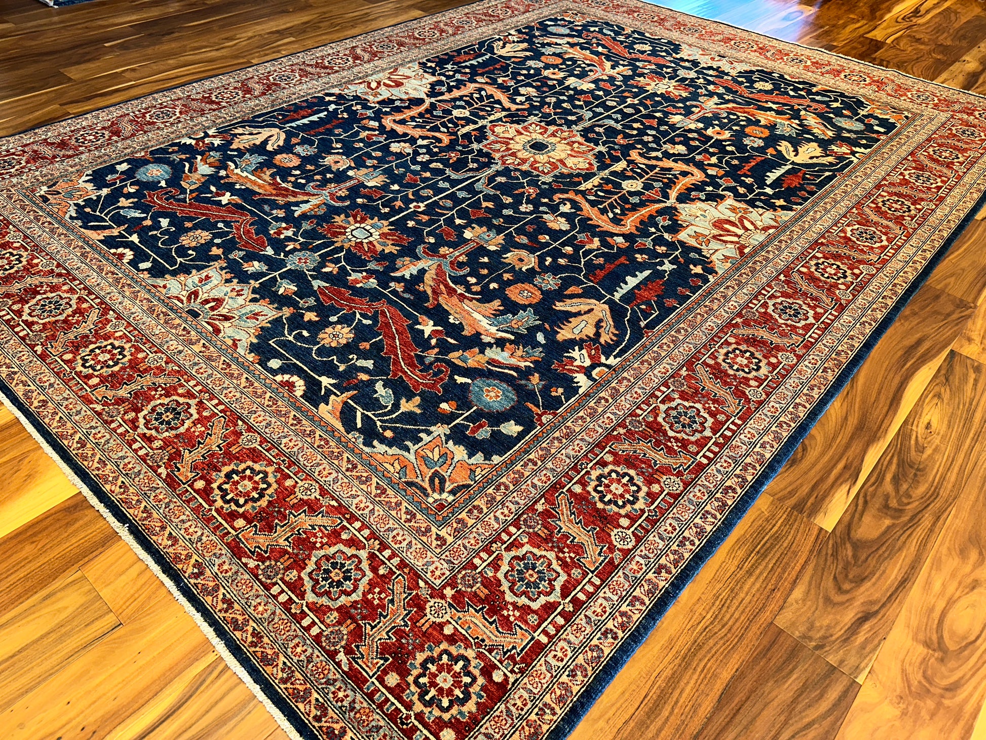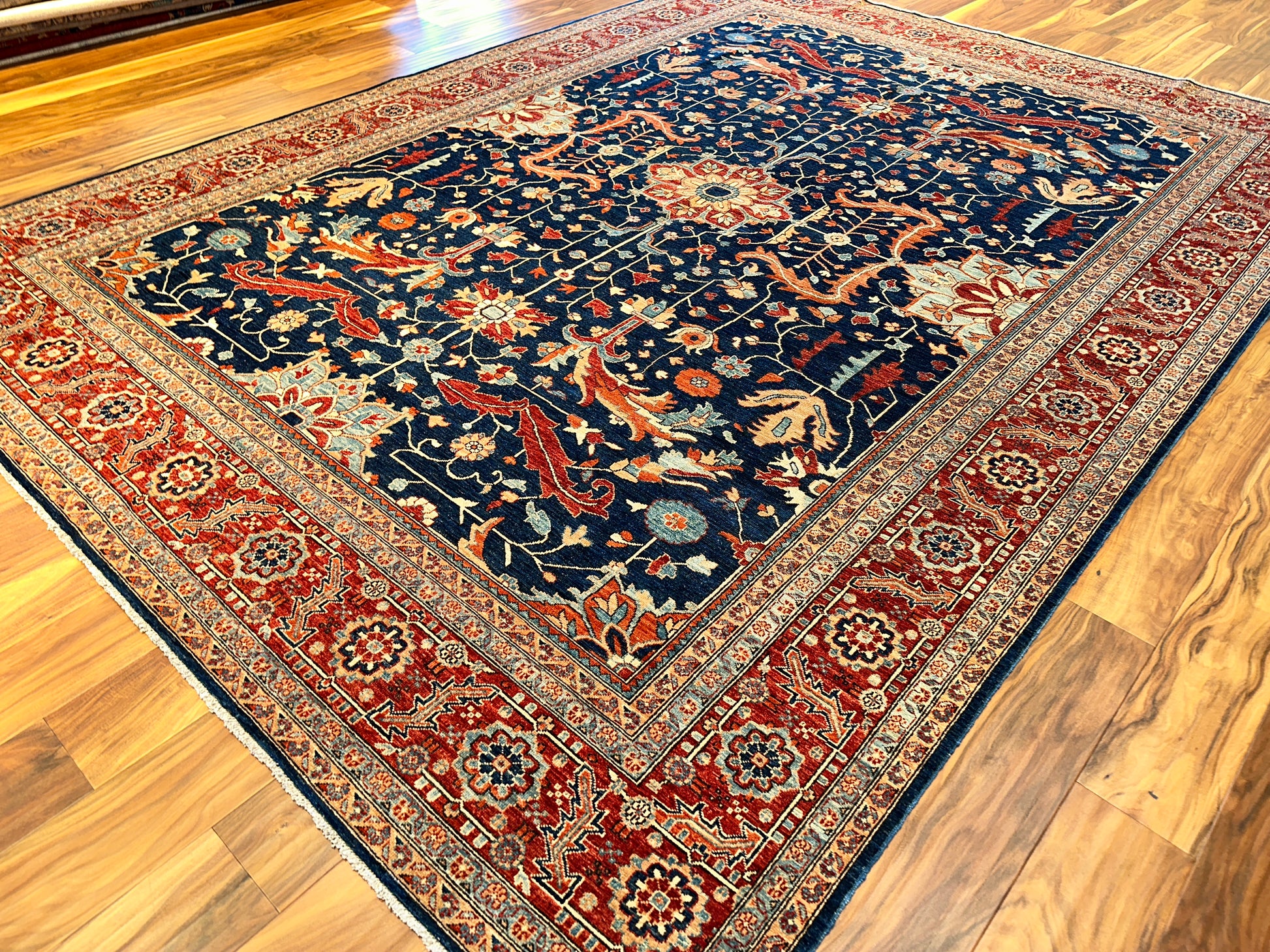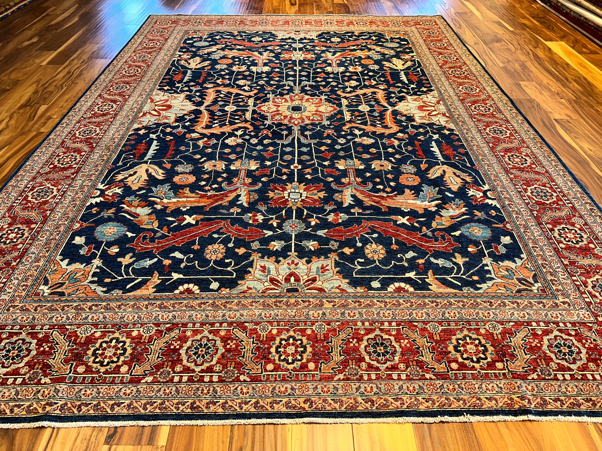 This striking handwoven rug features a deeply saturated midnight blue field, brought to life by an intricate Herati-style lattice of stylized blossoms, rosettes, and vinework. Terracotta, ivory, and pale blue details lend vivid contrast and rhythmic movement, framed by a rich red border that grounds the entire composition with classic elegance. A refined and expressive piece perfect for anchoring grand interiors.