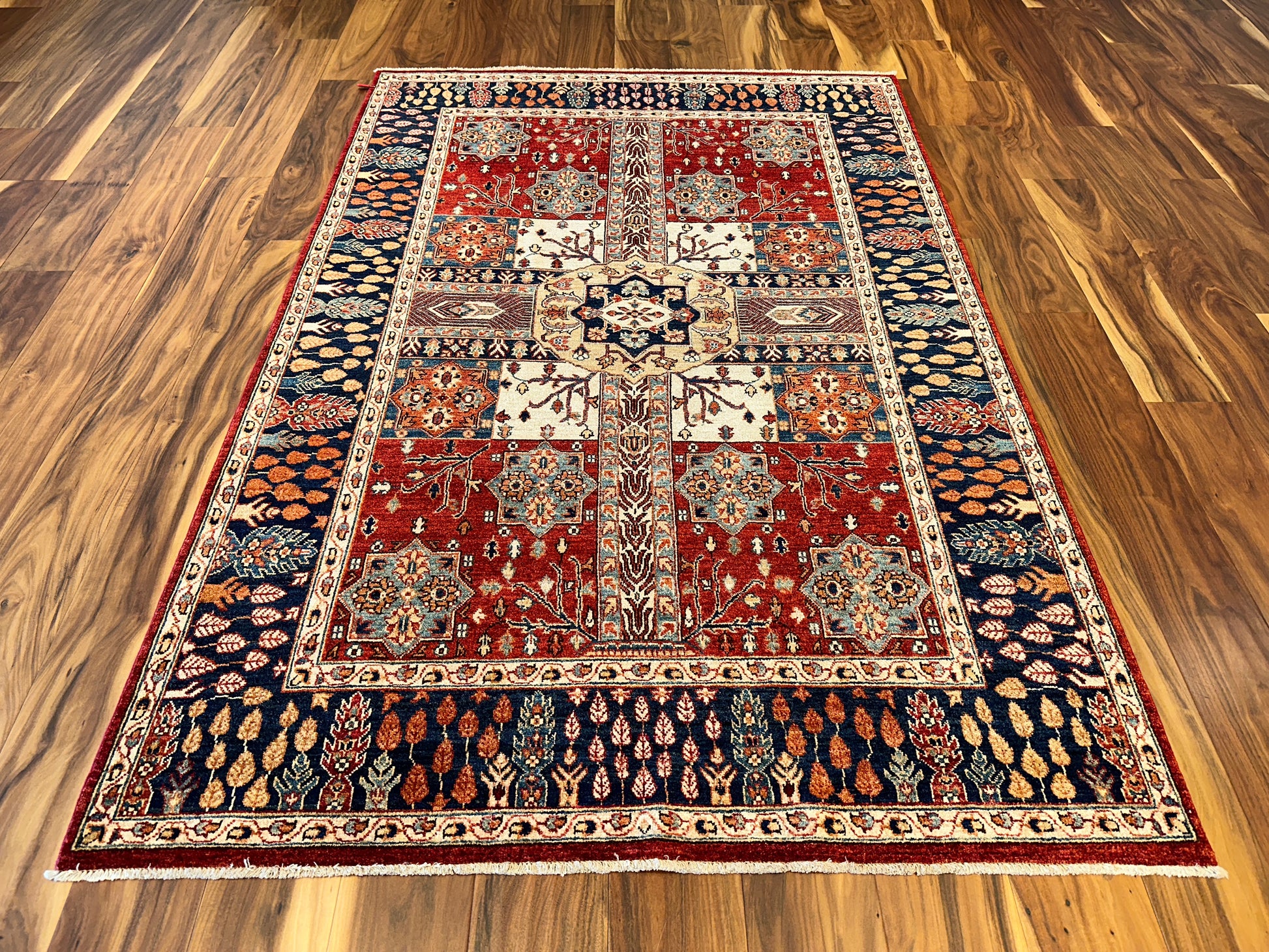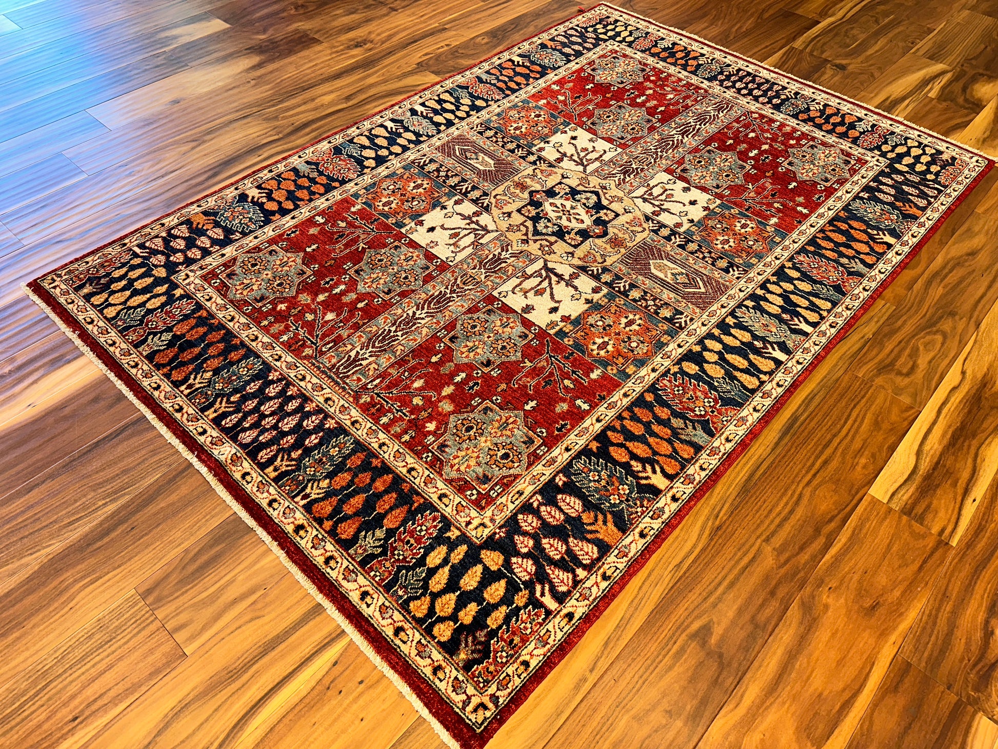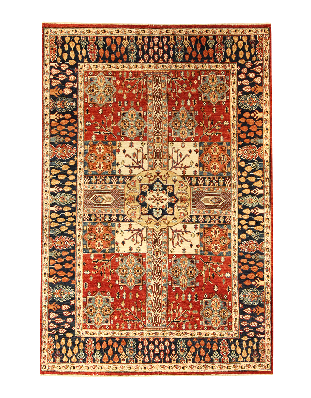 Ornate and inviting, this hand-knotted rug features a garden panel design centered around a stylized medallion, with floral clusters and branching vines framed in symmetrical compartments. Warm shades of terracotta and ivory are grounded by deep navy borders filled with autumnal leaf motifs, creating a richly detailed and harmonious layout. A classic composition with decorative charm and depth.