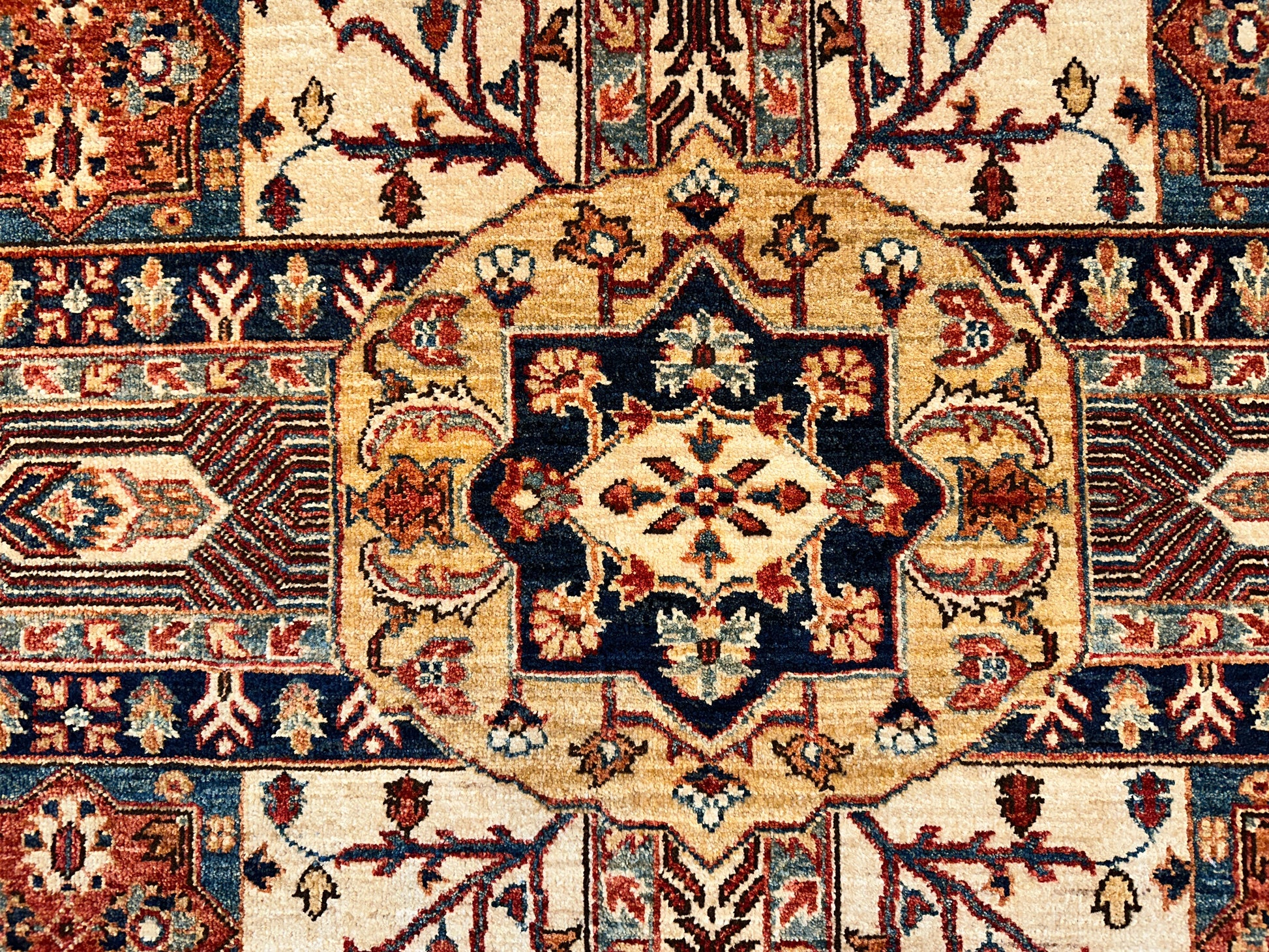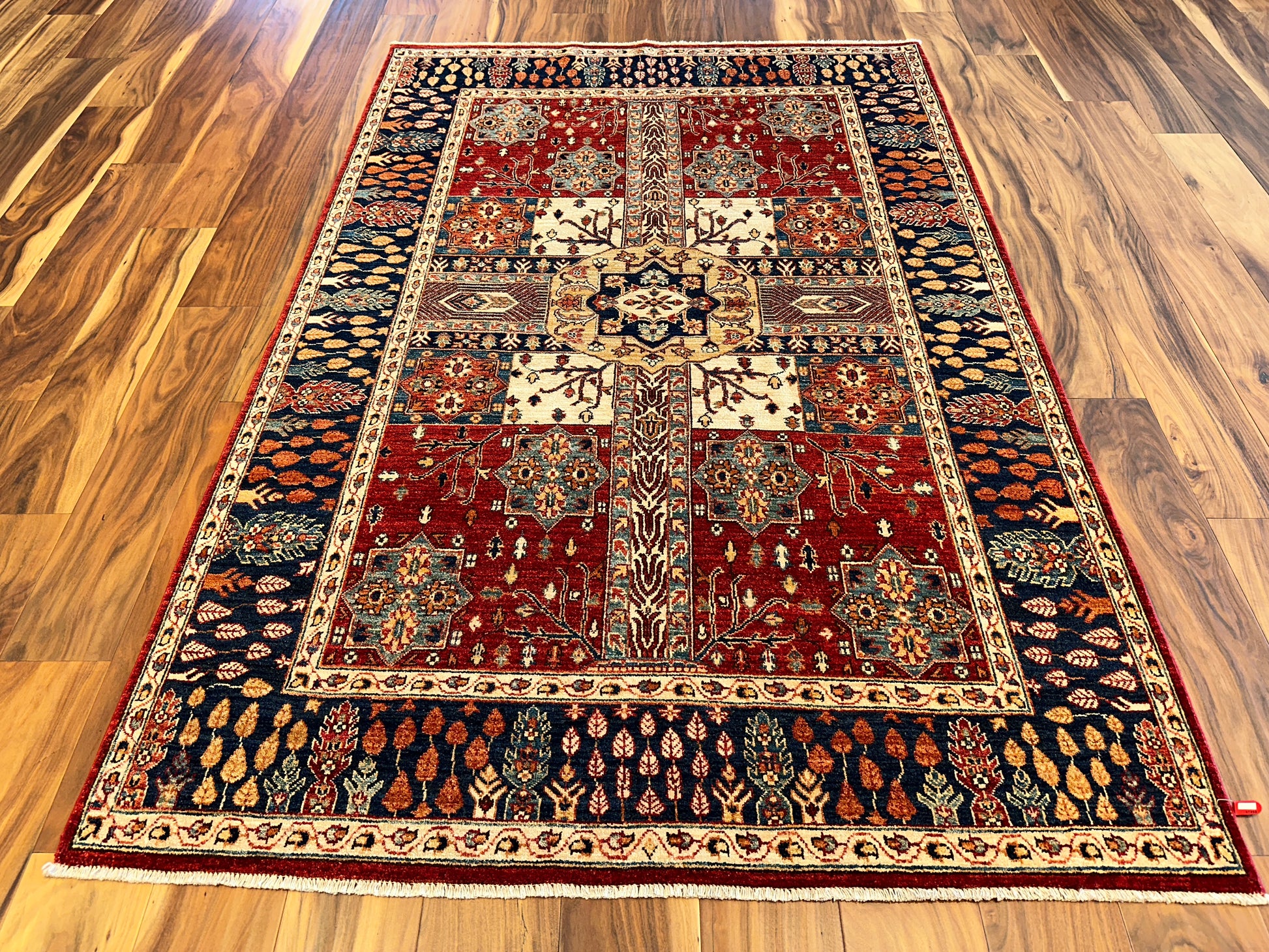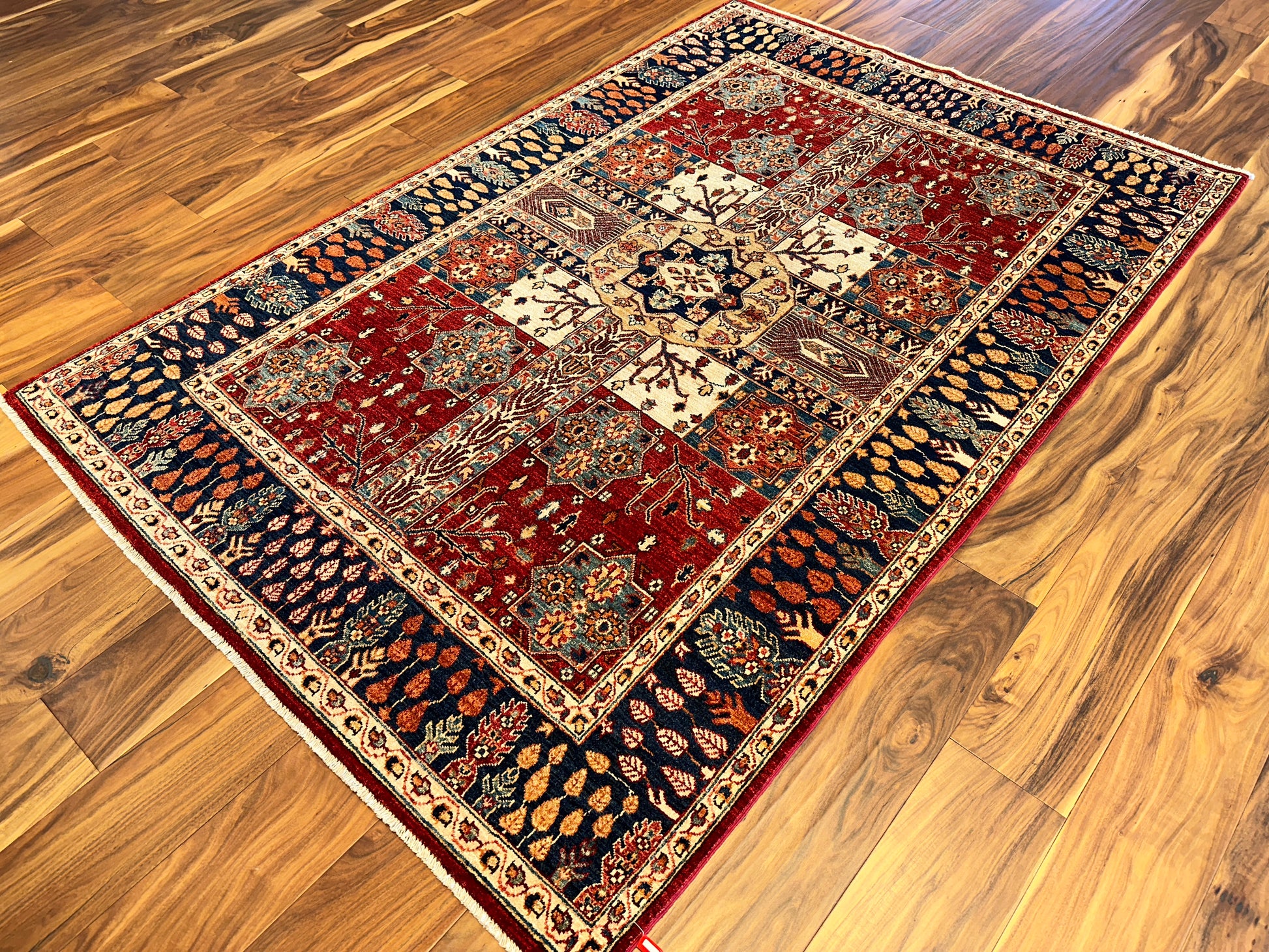 Ornate and inviting, this hand-knotted rug features a garden panel design centered around a stylized medallion, with floral clusters and branching vines framed in symmetrical compartments. Warm shades of terracotta and ivory are grounded by deep navy borders filled with autumnal leaf motifs, creating a richly detailed and harmonious layout. A classic composition with decorative charm and depth.