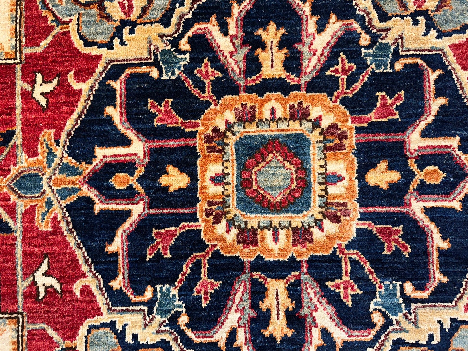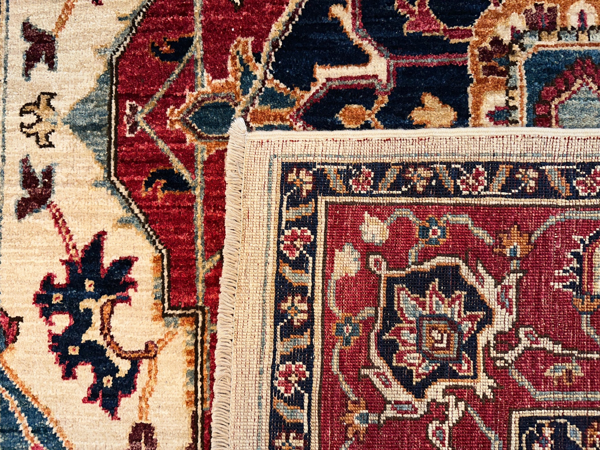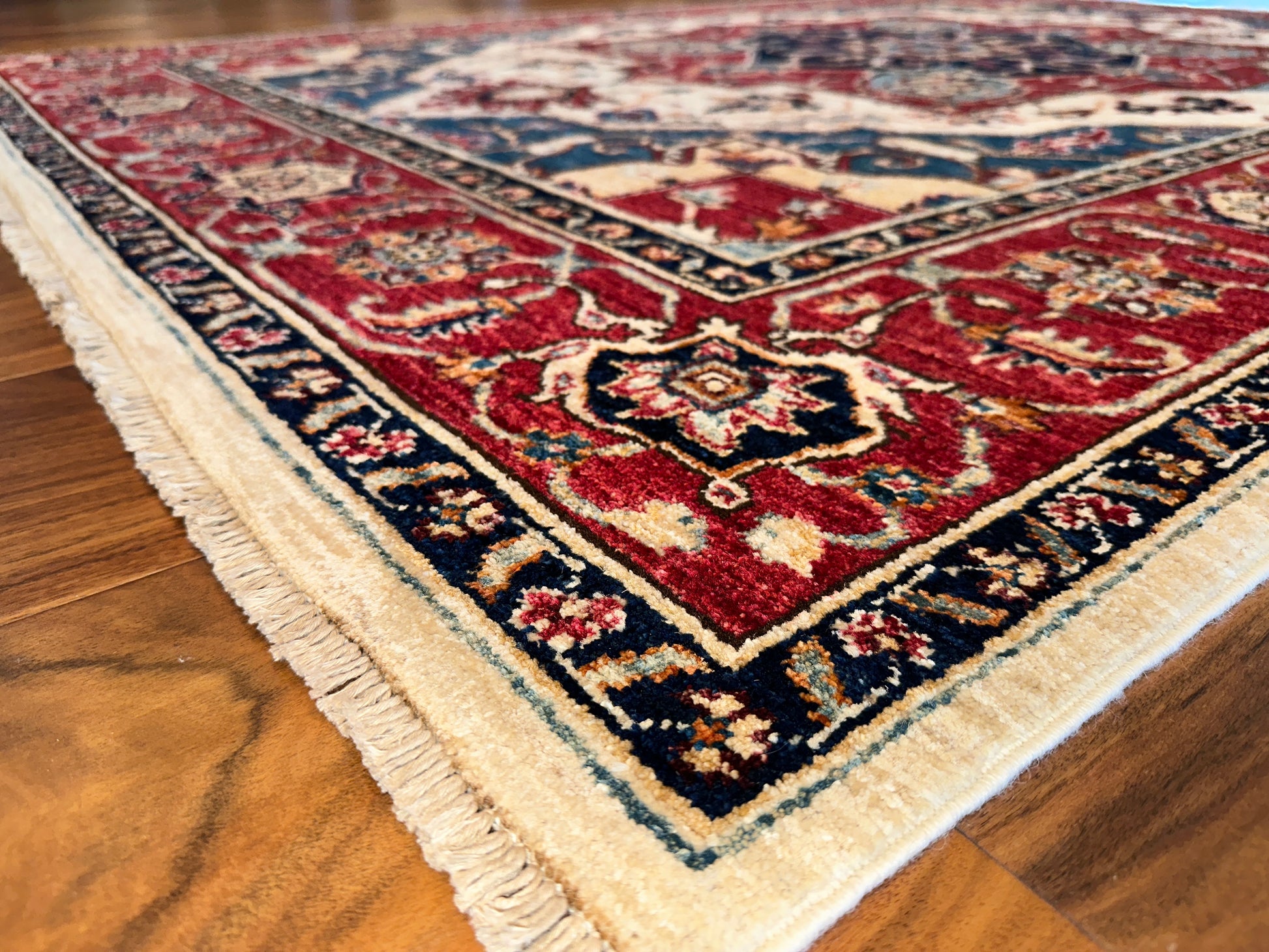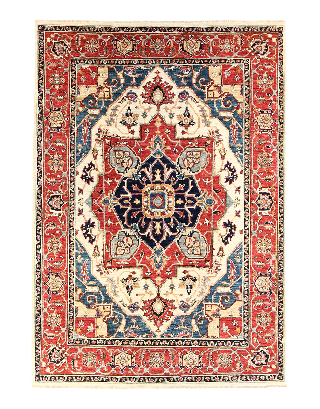 Boldly composed and richly detailed, this hand-knotted rug features a commanding central medallion set within a stepped field of red, ivory, and soft blue. Intricate corner spandrels and floral motifs surround the center, while the ornate border completes the composition with balance and refinement. The strong contrast and sharp geometry give the piece timeless visual strength.