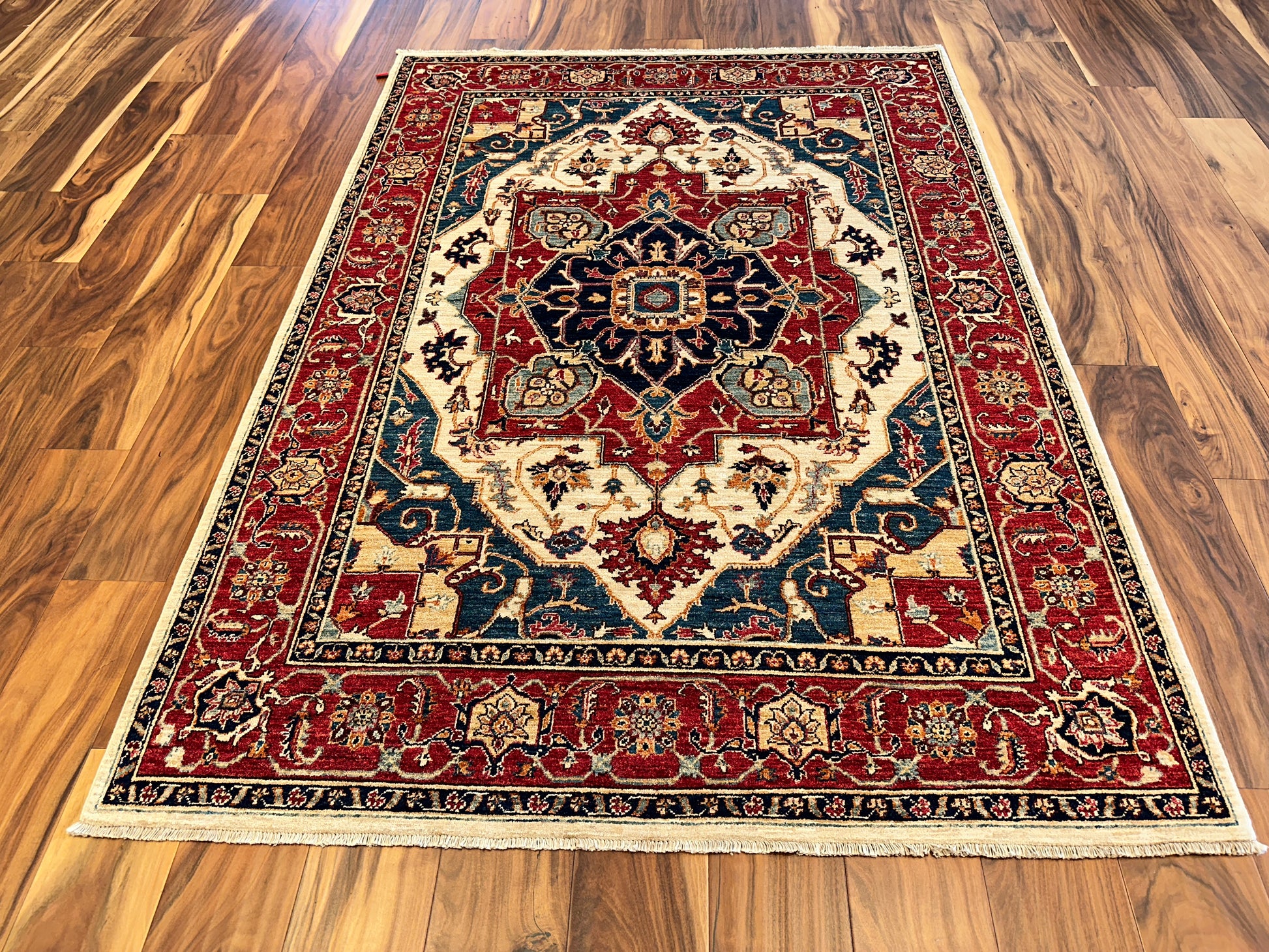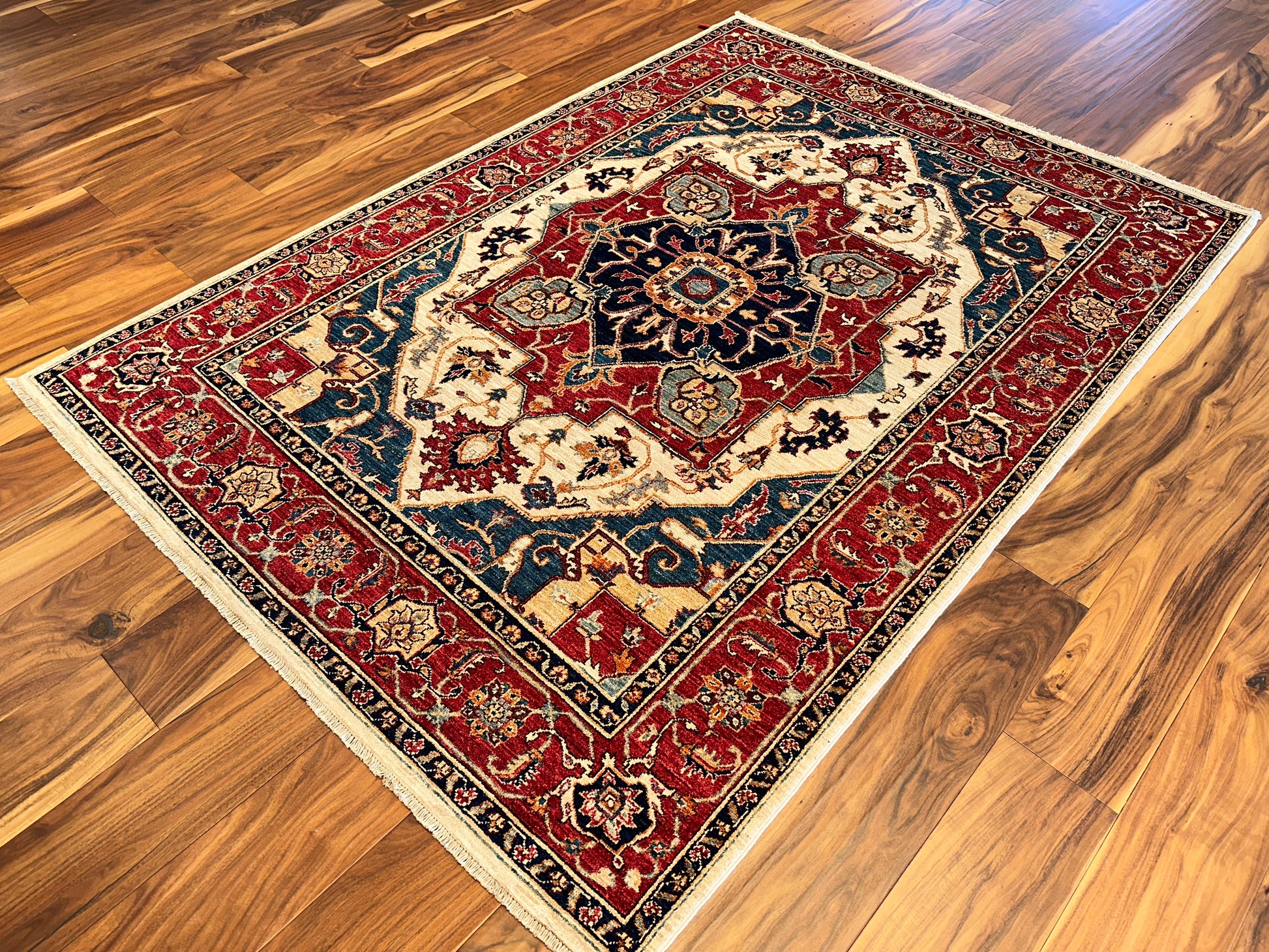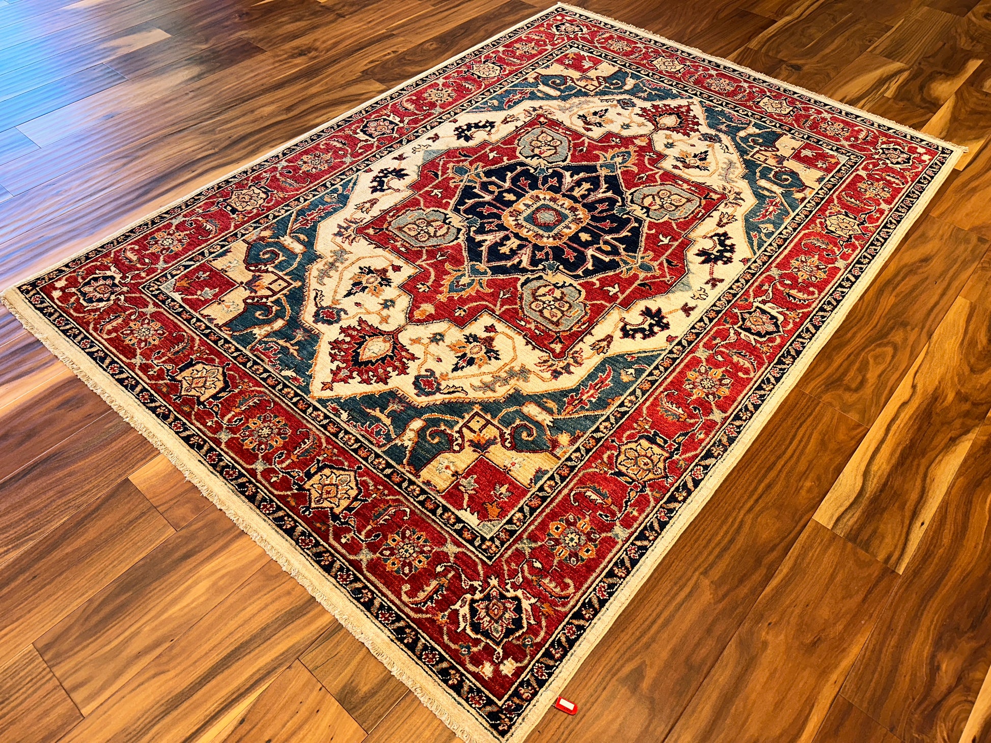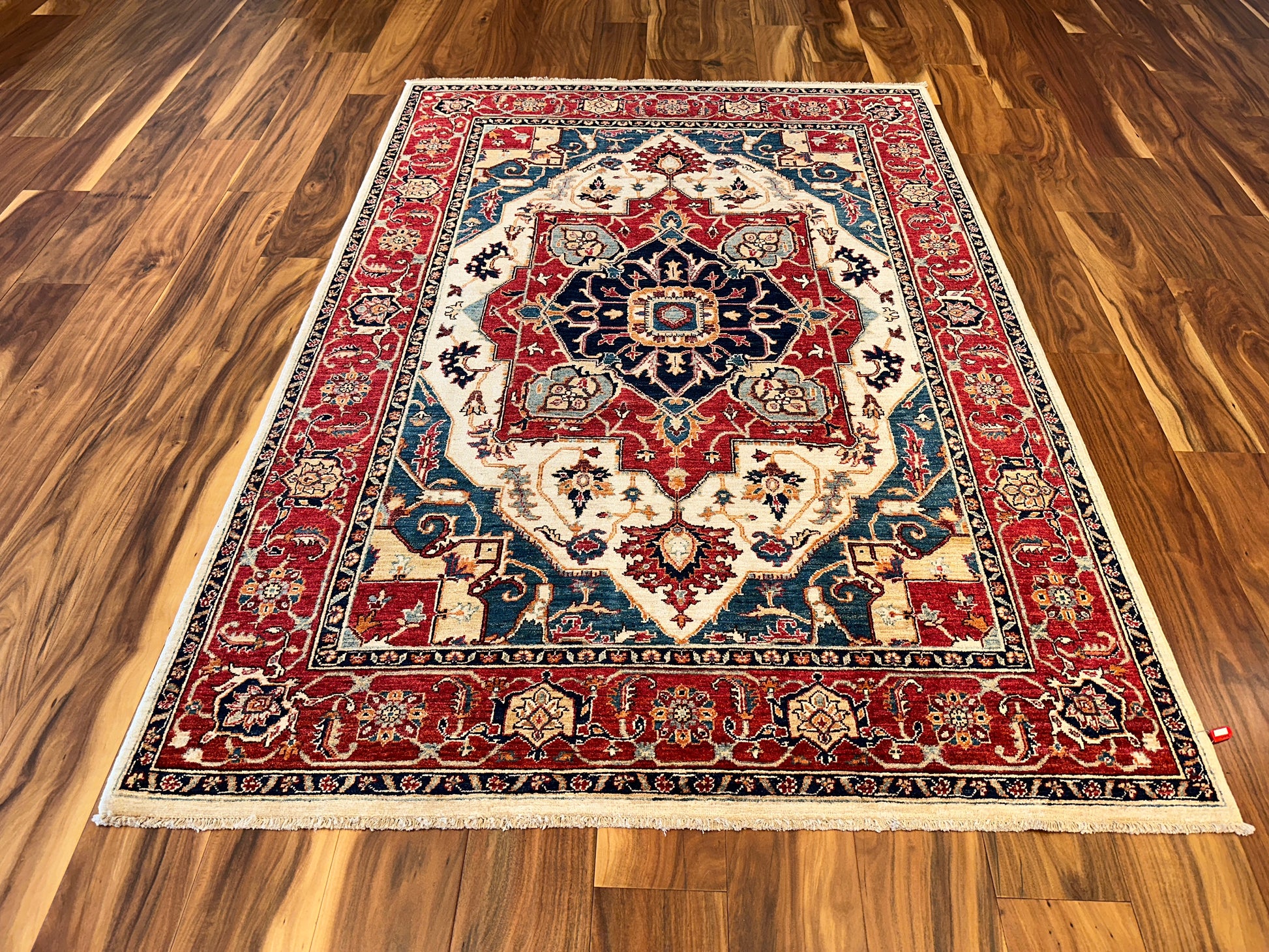 Boldly composed and richly detailed, this hand-knotted rug features a commanding central medallion set within a stepped field of red, ivory, and soft blue. Intricate corner spandrels and floral motifs surround the center, while the ornate border completes the composition with balance and refinement. The strong contrast and sharp geometry give the piece timeless visual strength.