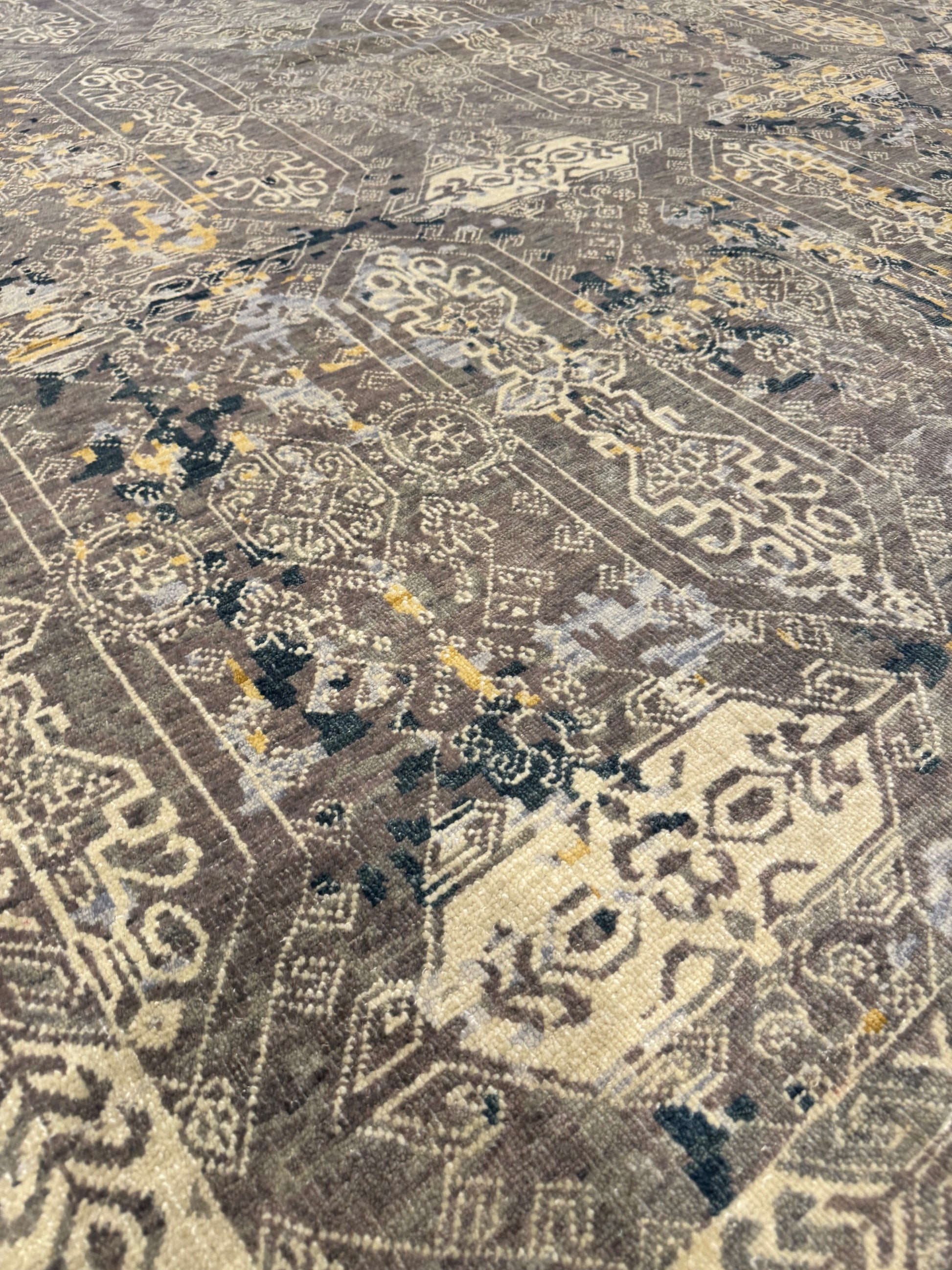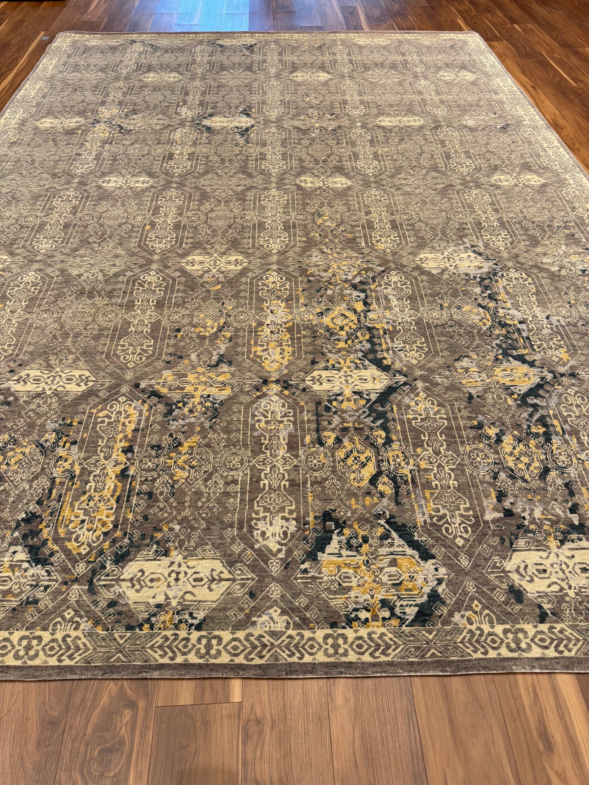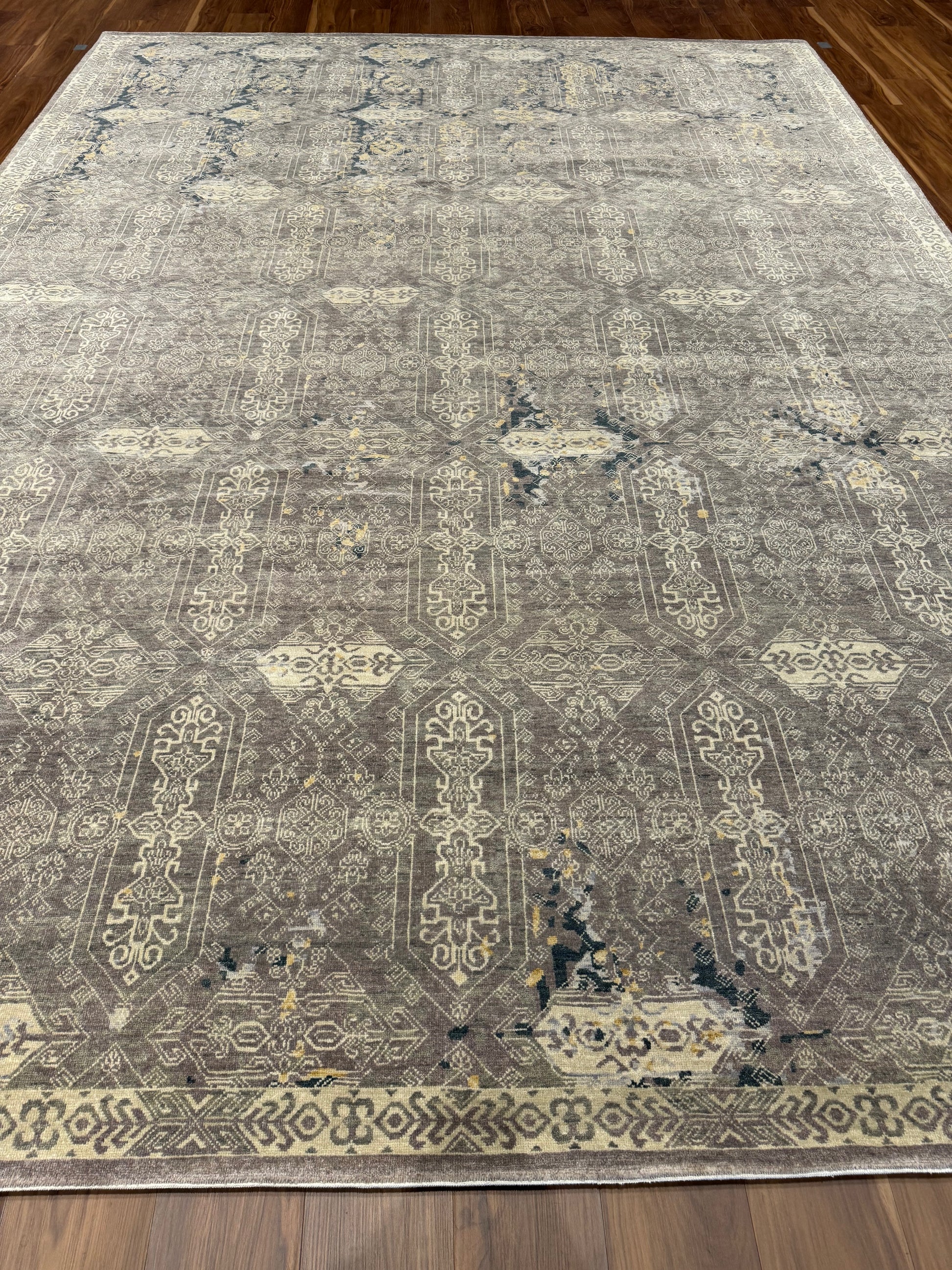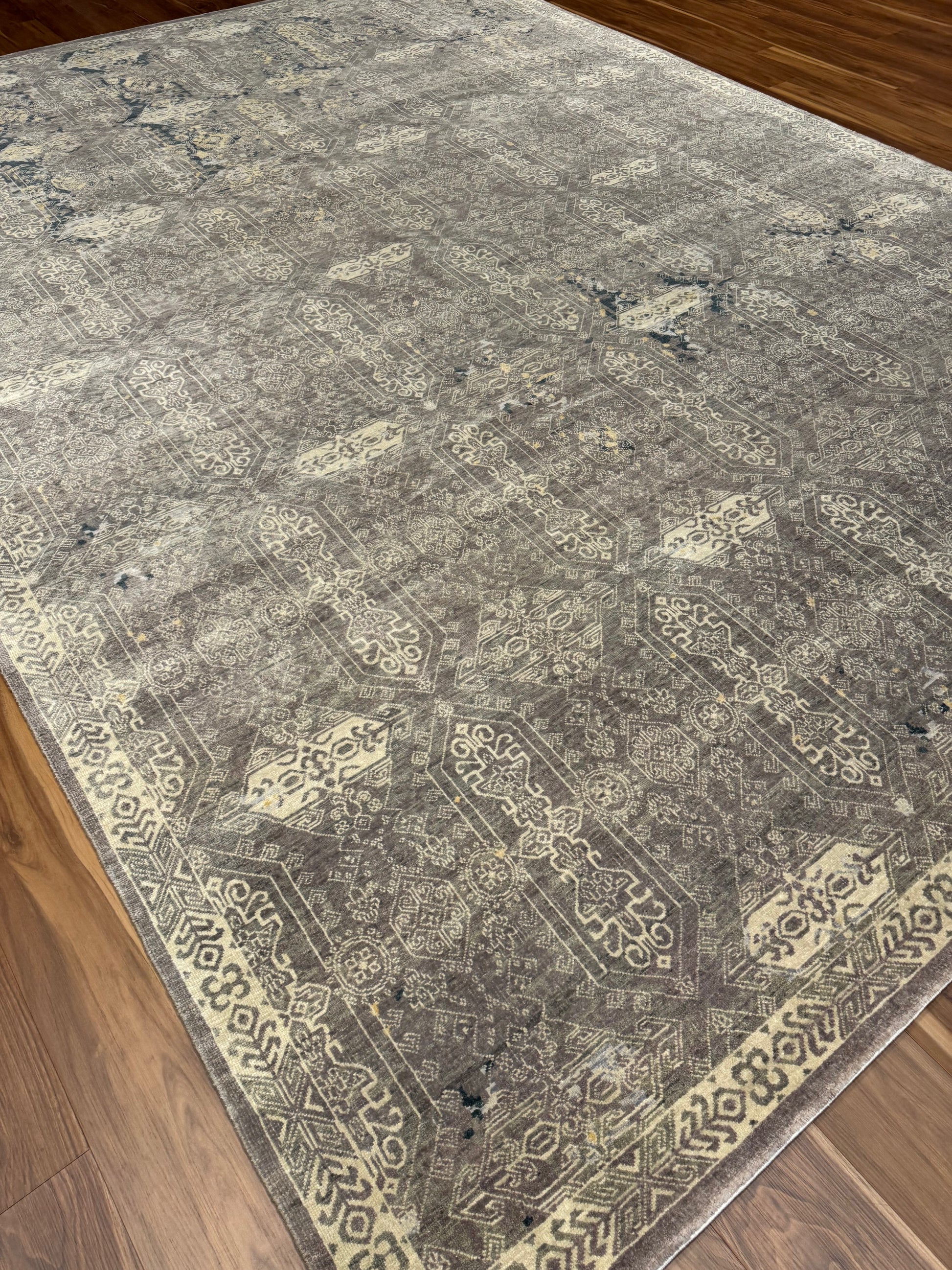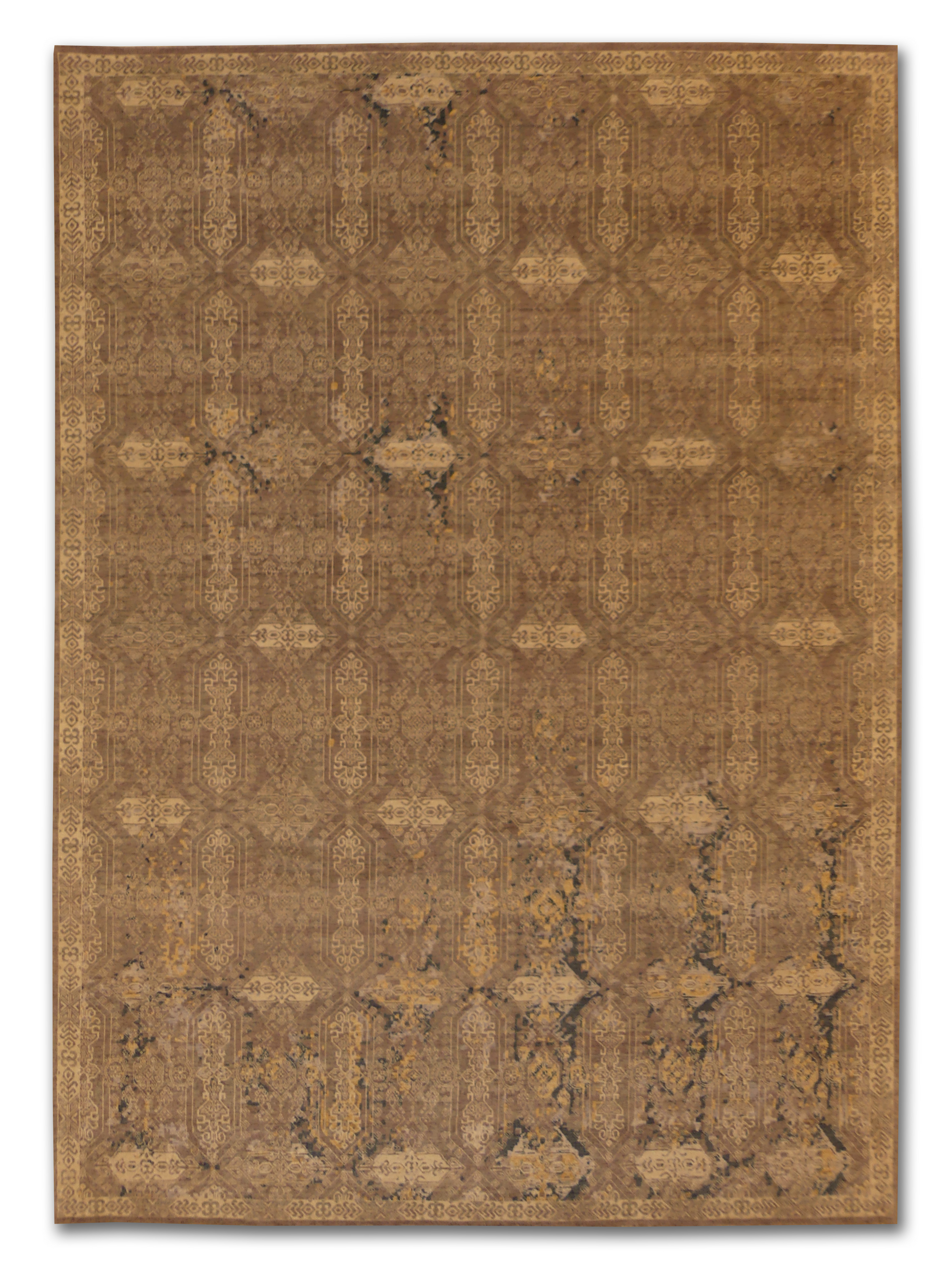 This Aubusson Modern rug made of wool showcases a refined traditional design with modern color tones, creating a timeless elegance suitable for various interior styles. The muted color palette offers versatility, while the intricate detailing adds depth and sophistication. Its construction promises enduring beauty and comfort underfoot.