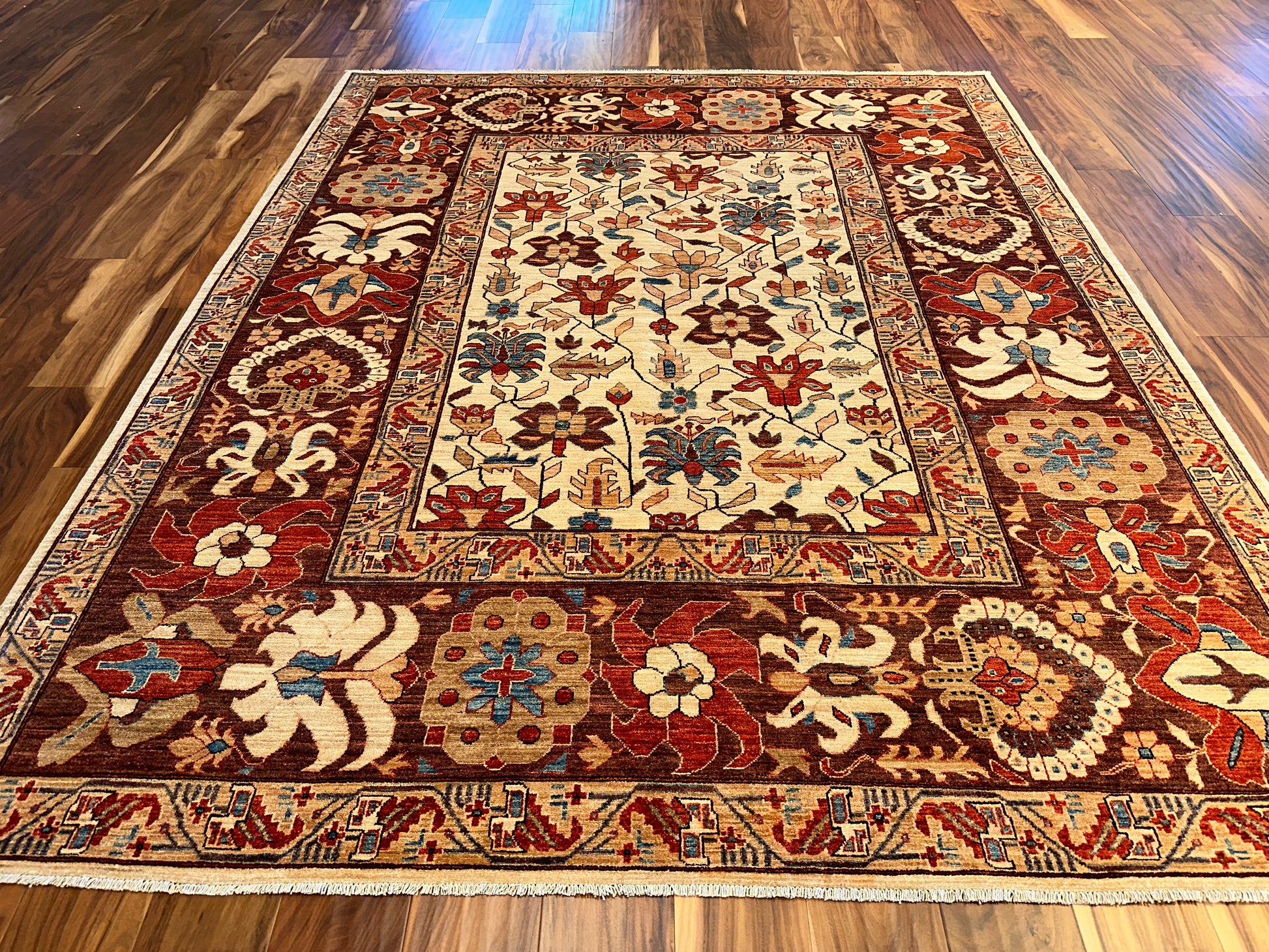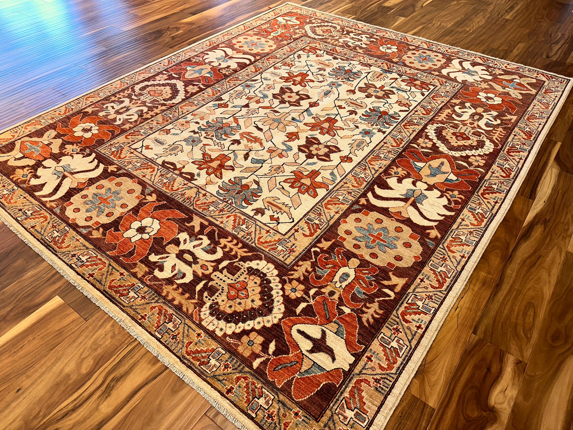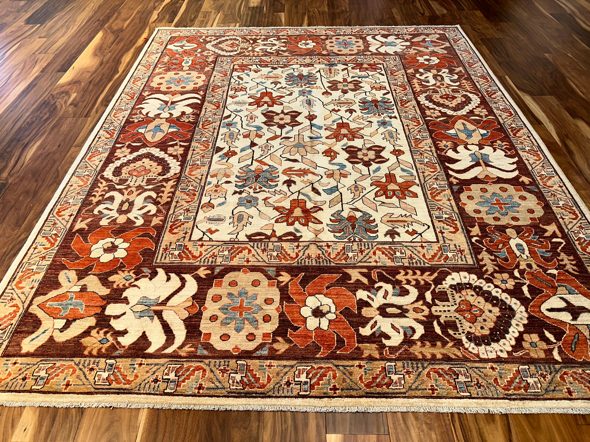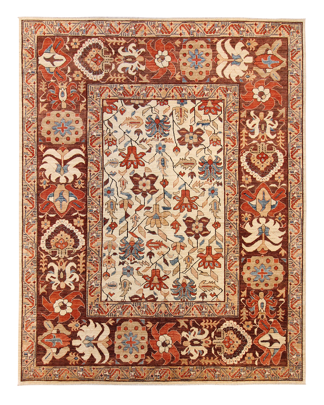 Lively and richly patterned, this hand-knotted wool rug features a bold contrast between its deep rust border and the lighter interior field. Stylized florals bloom in rhythmic repetition, brought to life with warm beige, soft blue, and brick red accents. The composition has a charming folk-art quality, ideal for adding warmth and energy to curated spaces.
