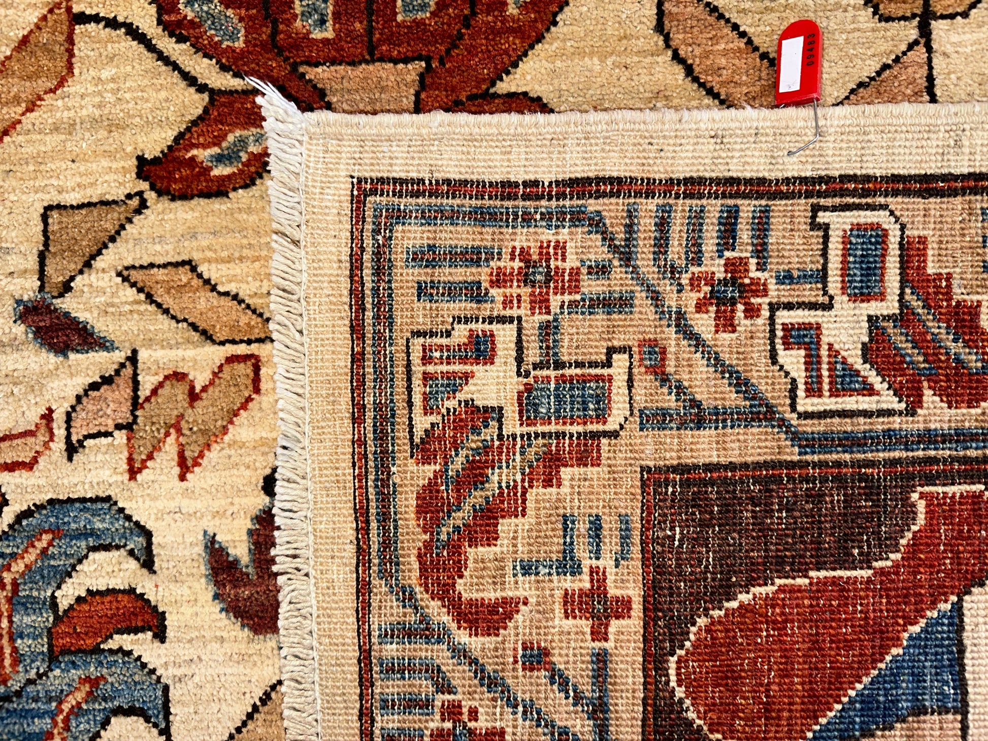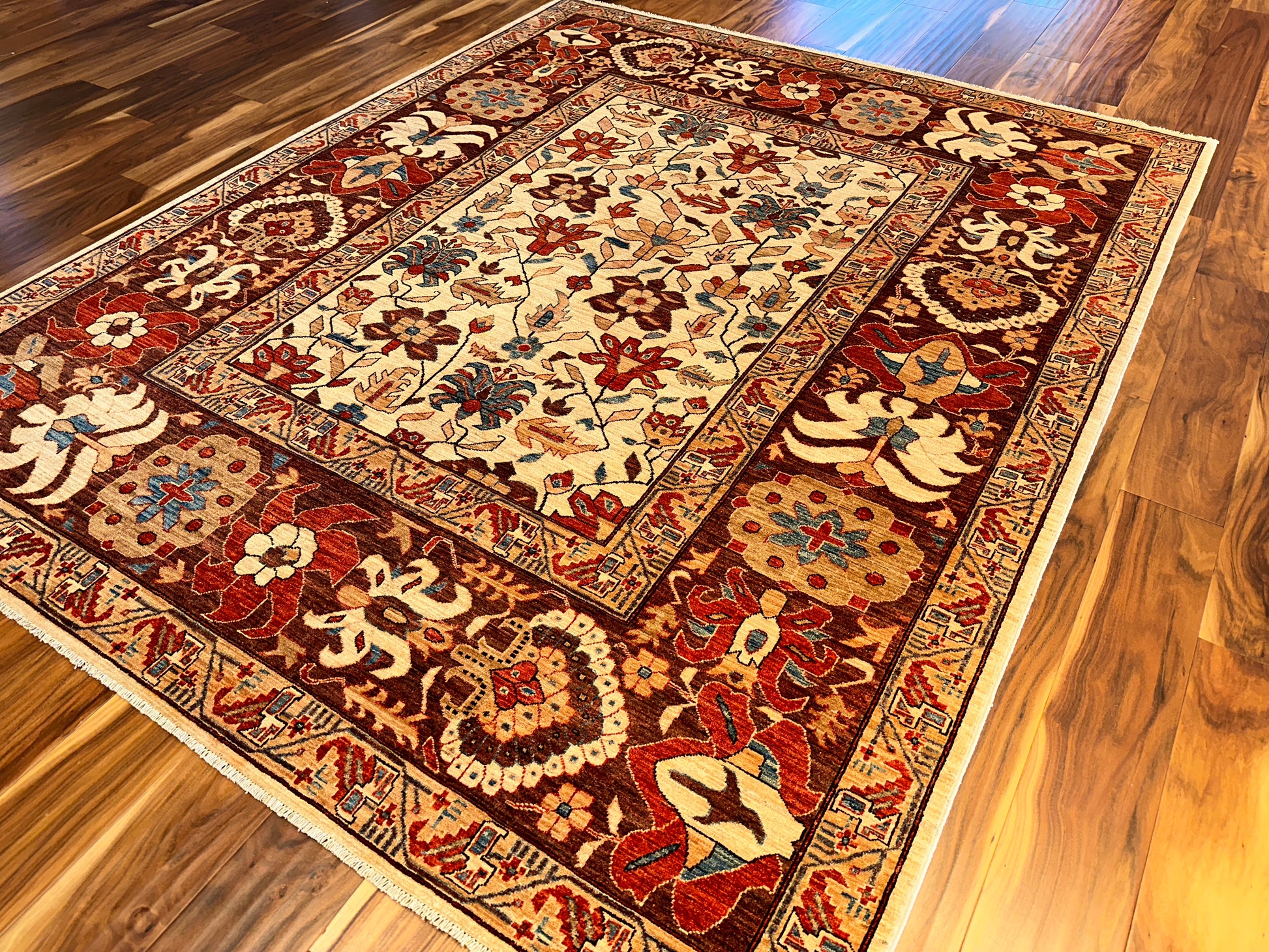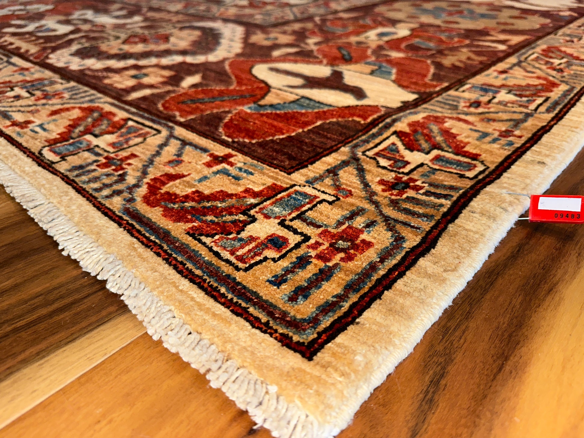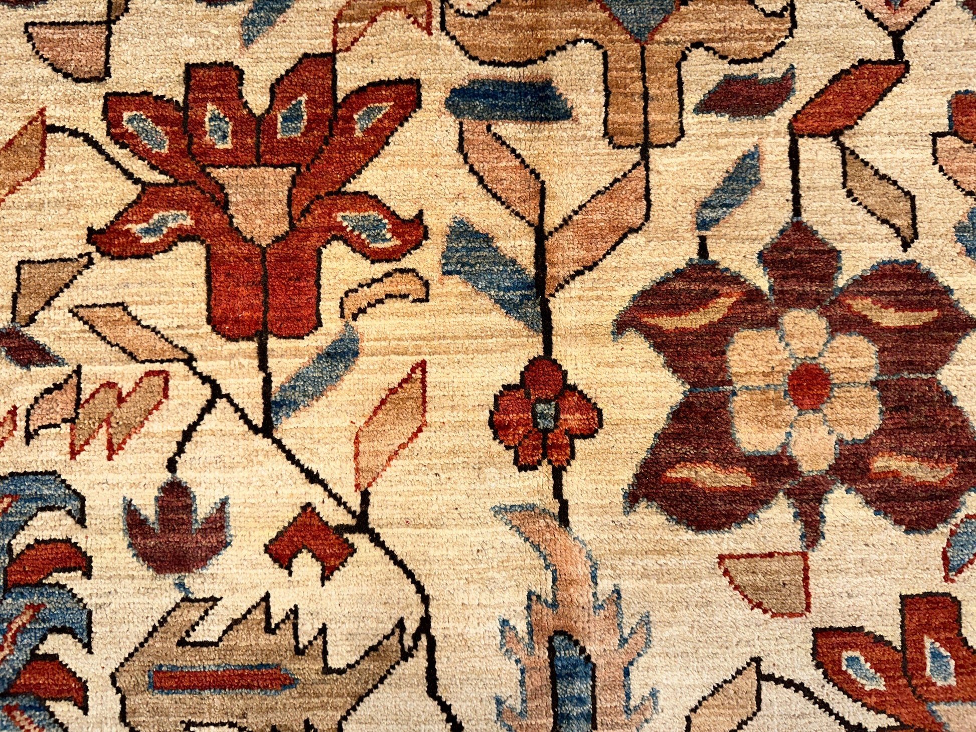 Lively and richly patterned, this hand-knotted wool rug features a bold contrast between its deep rust border and the lighter interior field. Stylized florals bloom in rhythmic repetition, brought to life with warm beige, soft blue, and brick red accents. The composition has a charming folk-art quality, ideal for adding warmth and energy to curated spaces.
