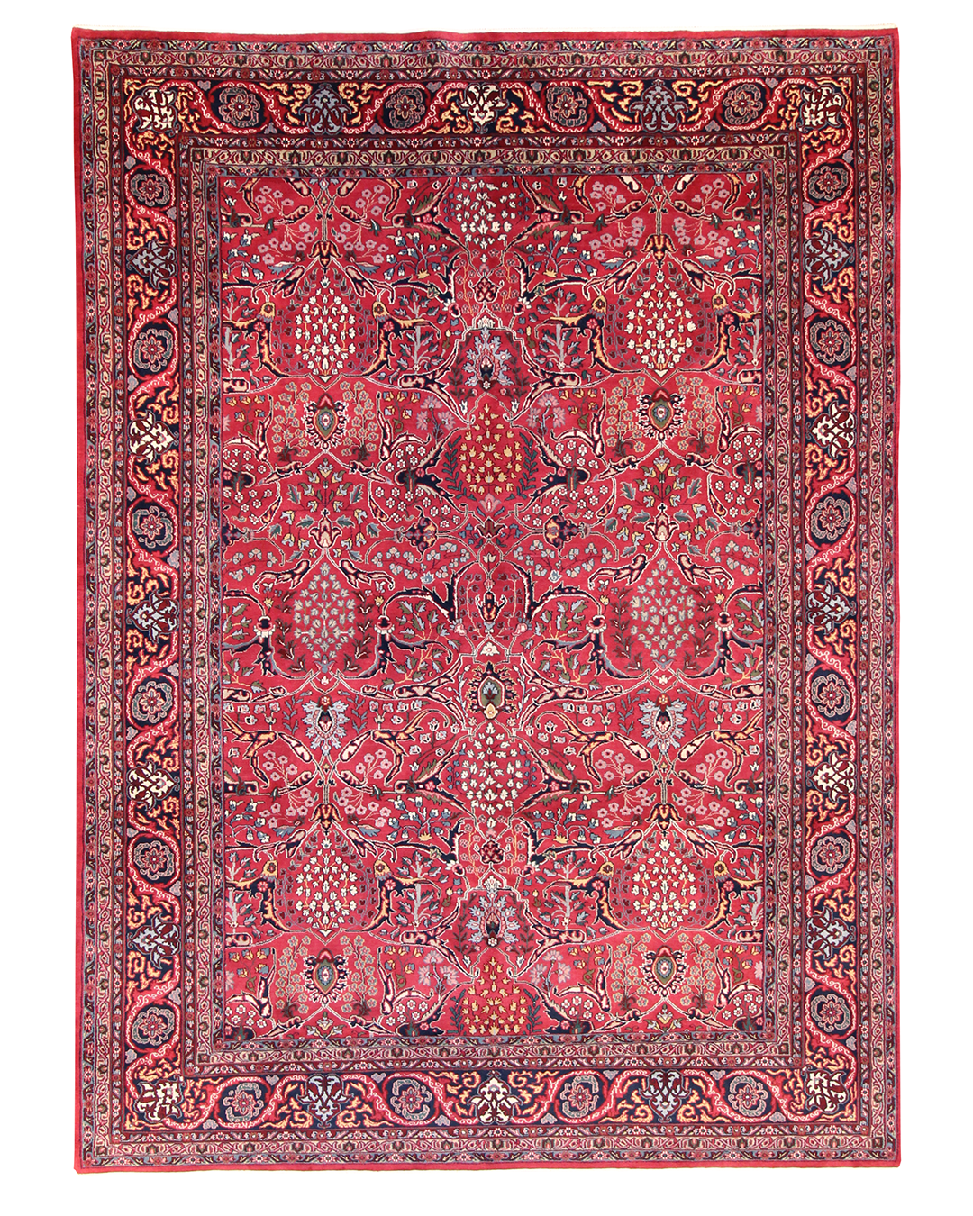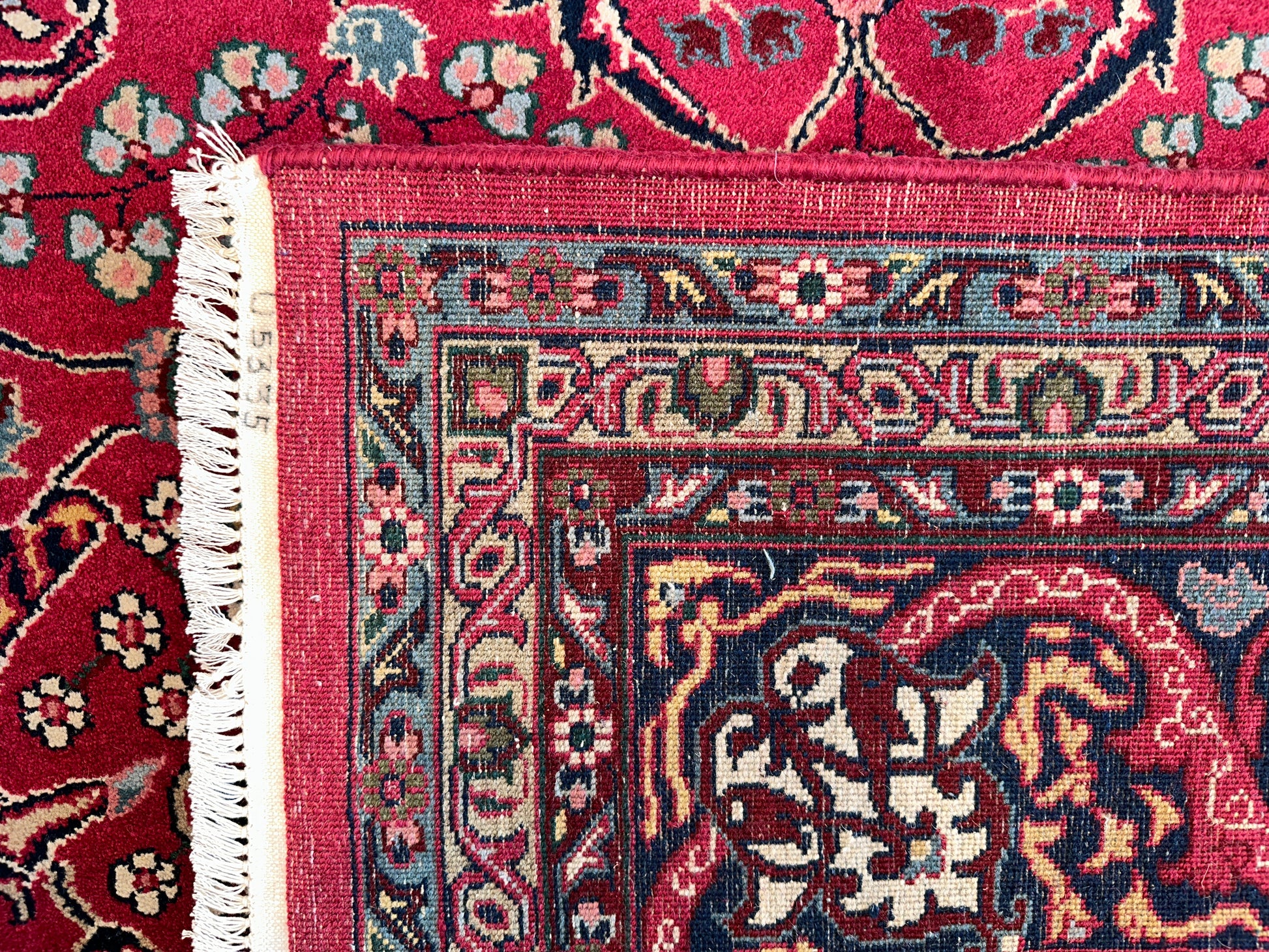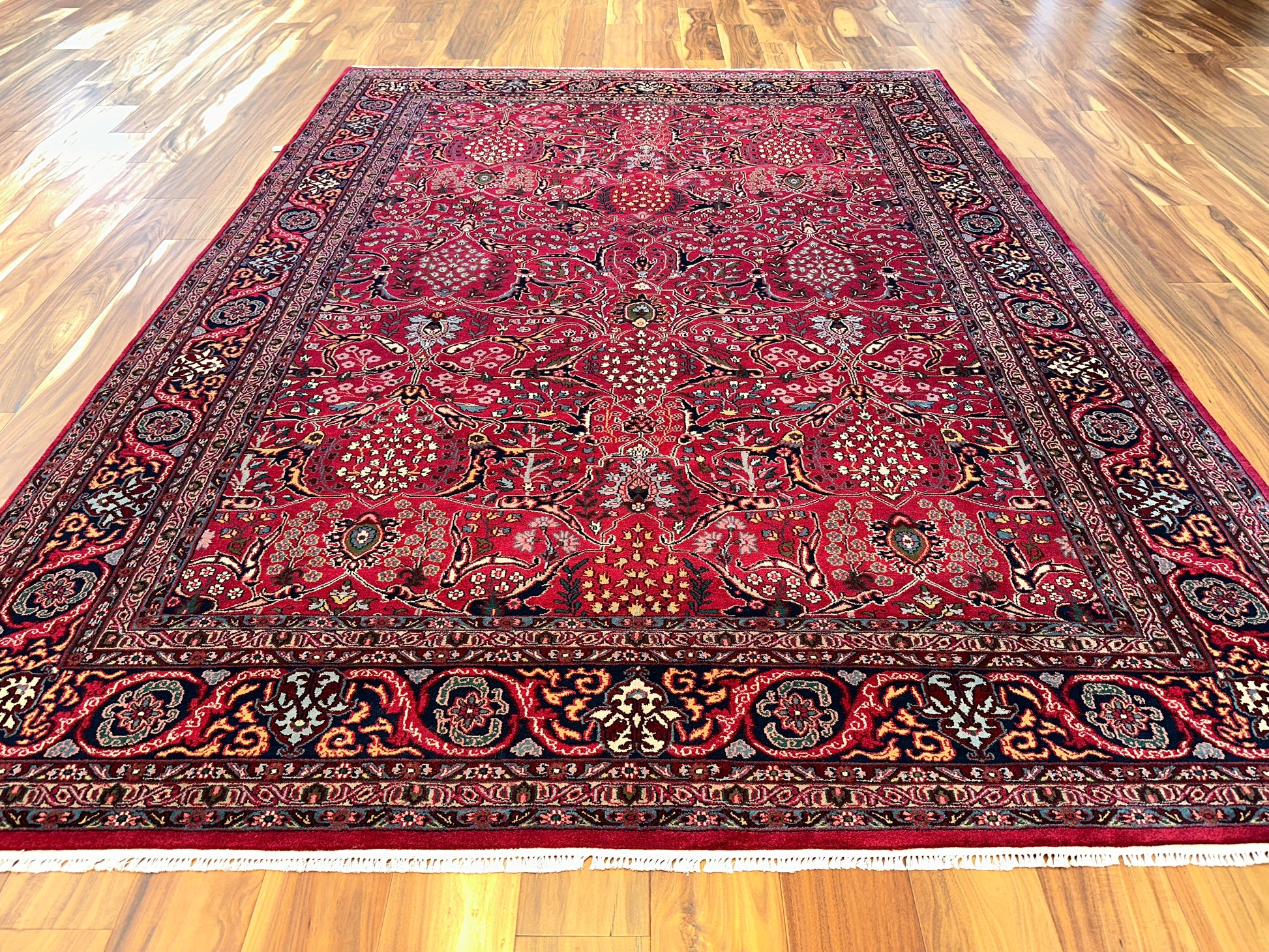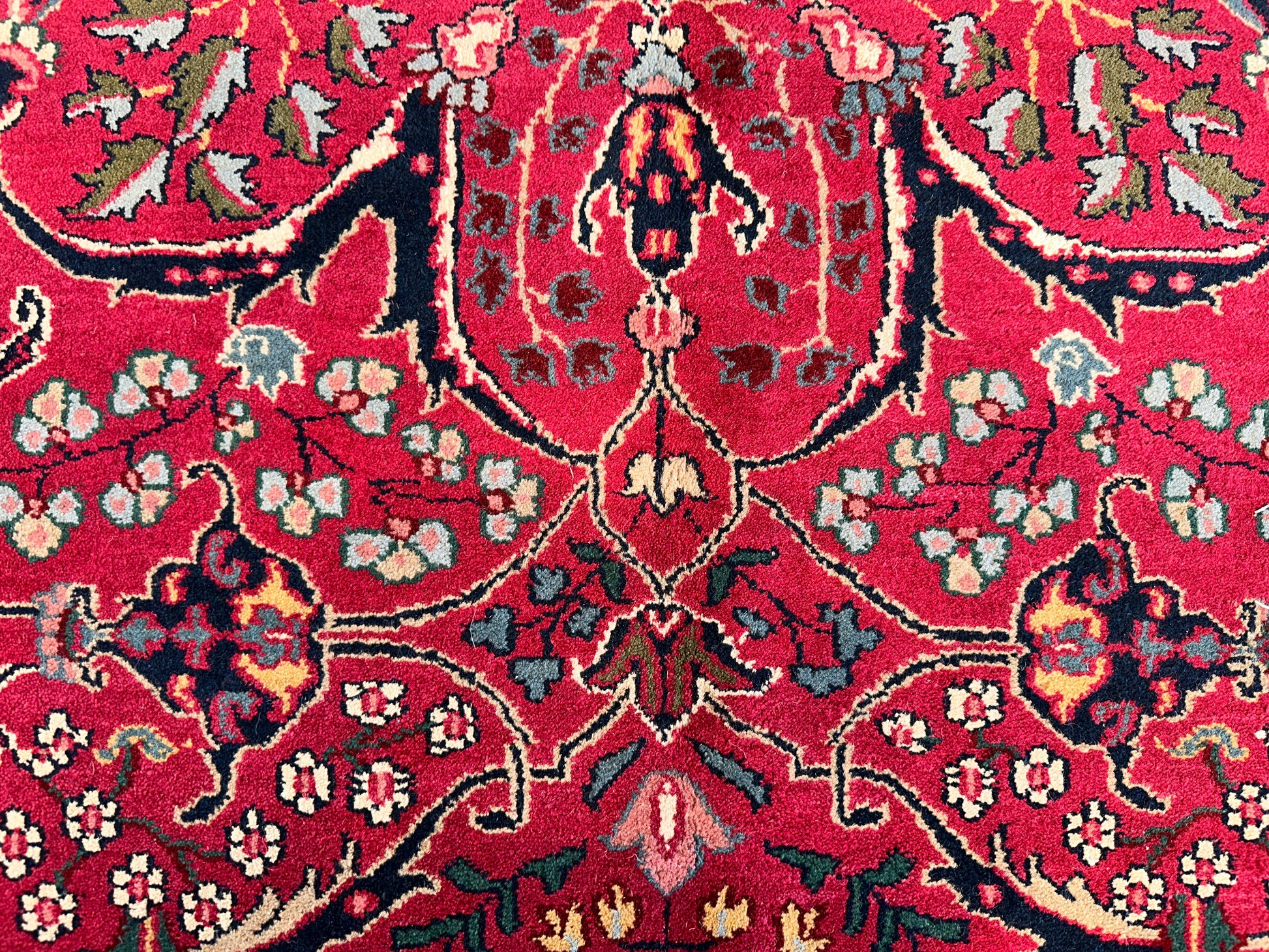 This stunning hand-knotted rug bursts with vibrant energy, showcasing a deep crimson field adorned with a tapestry of intricate floral and boteh motifs. Framed by a richly detailed border in midnight blue and ivory, the composition is balanced yet bold, with every flourish echoing classical Persian design heritage. Perfect for anchoring a traditional room or bringing warmth to a formal setting.