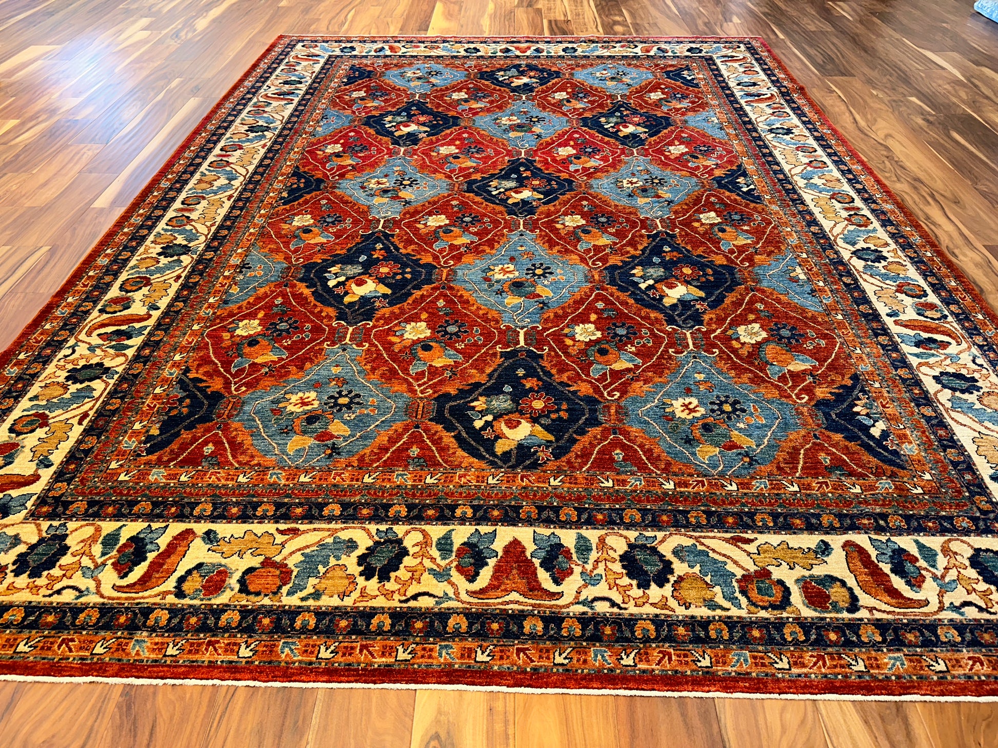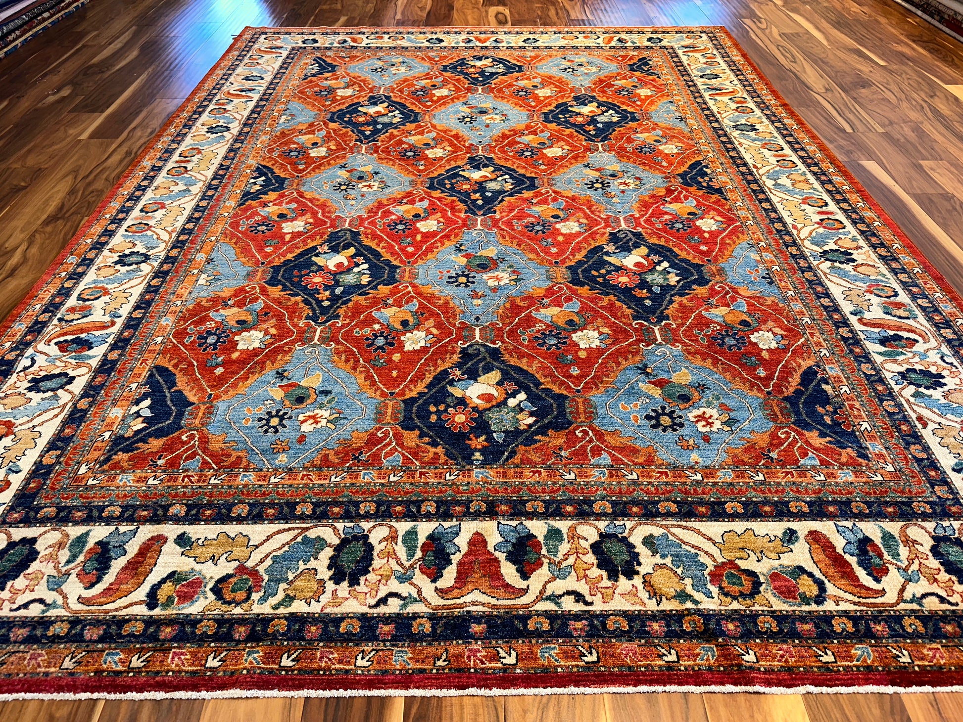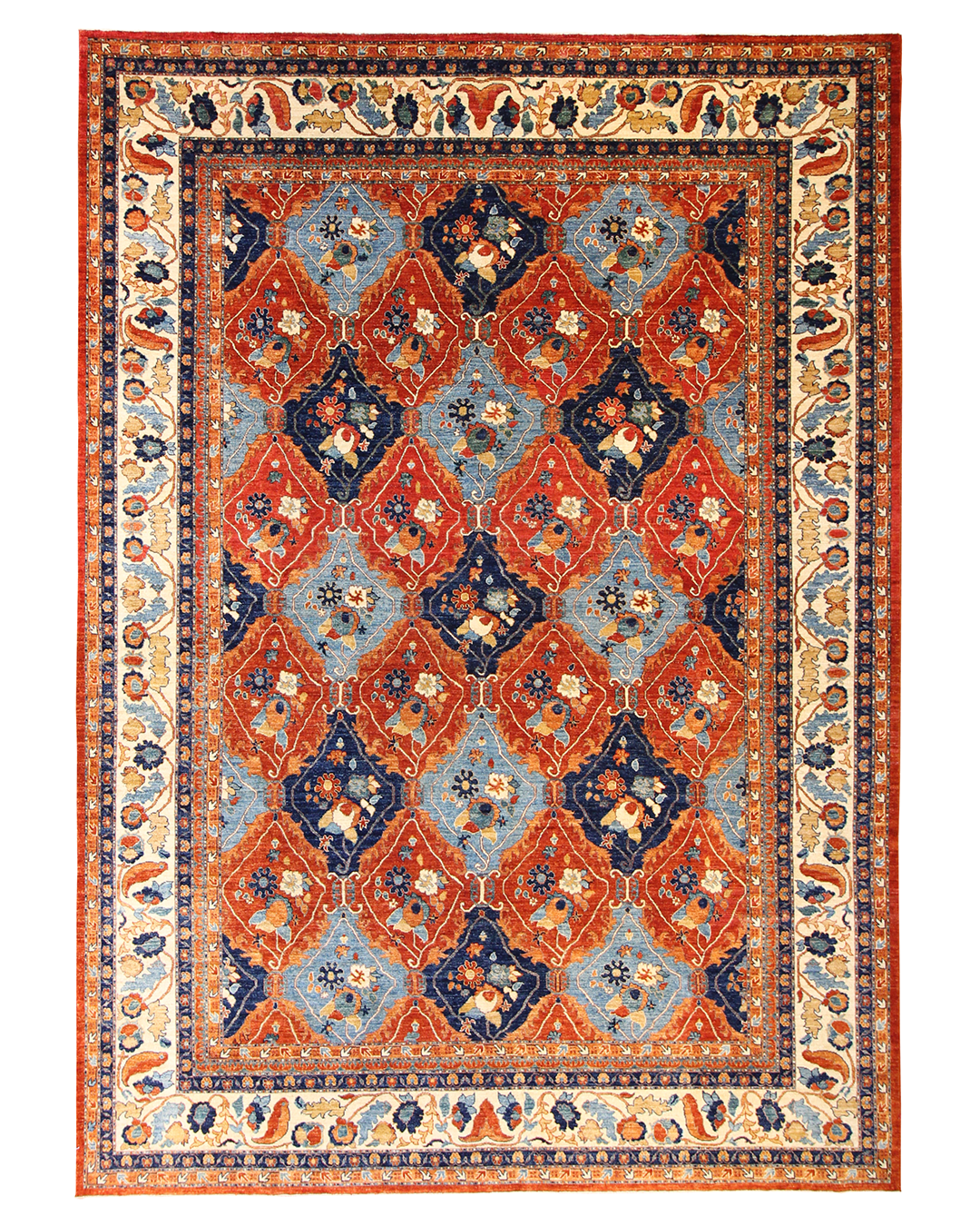 This striking handwoven rug brings together classic refinement and vivid color in a balanced, rhythmic design. Deep reds and rich blues are paired with soft ivory and gentle touches of tan, forming a field of repeating diamond medallions filled with stylized floral motifs. A detailed floral border surrounds the composition, adding an element of traditional elegance while enhancing the vibrant energy of the pattern. This rug adds bold sophistication to any interior, making it especially fitting for formal living or dining rooms.