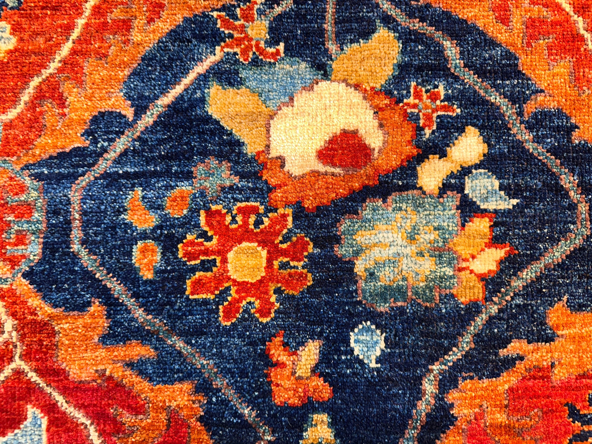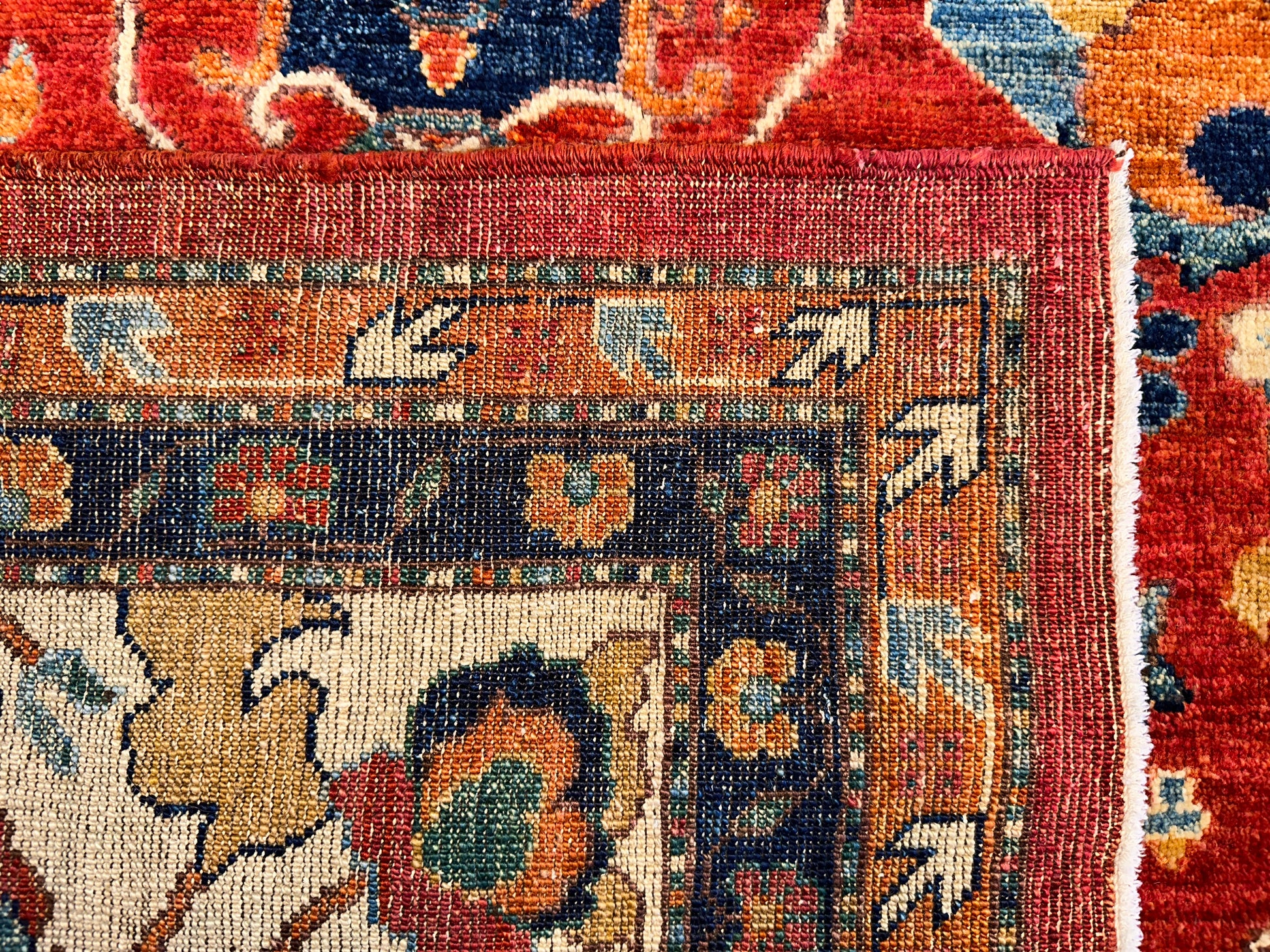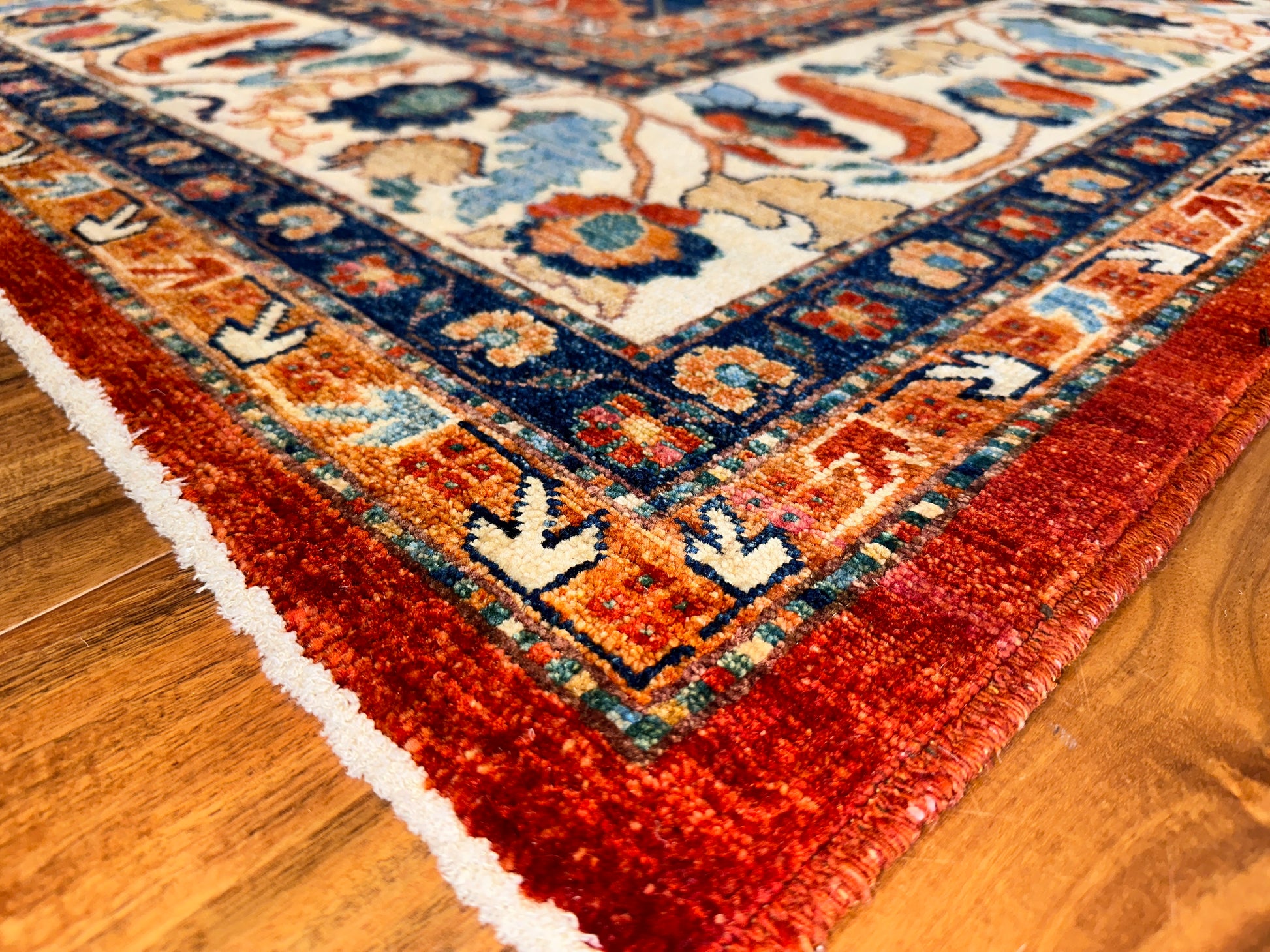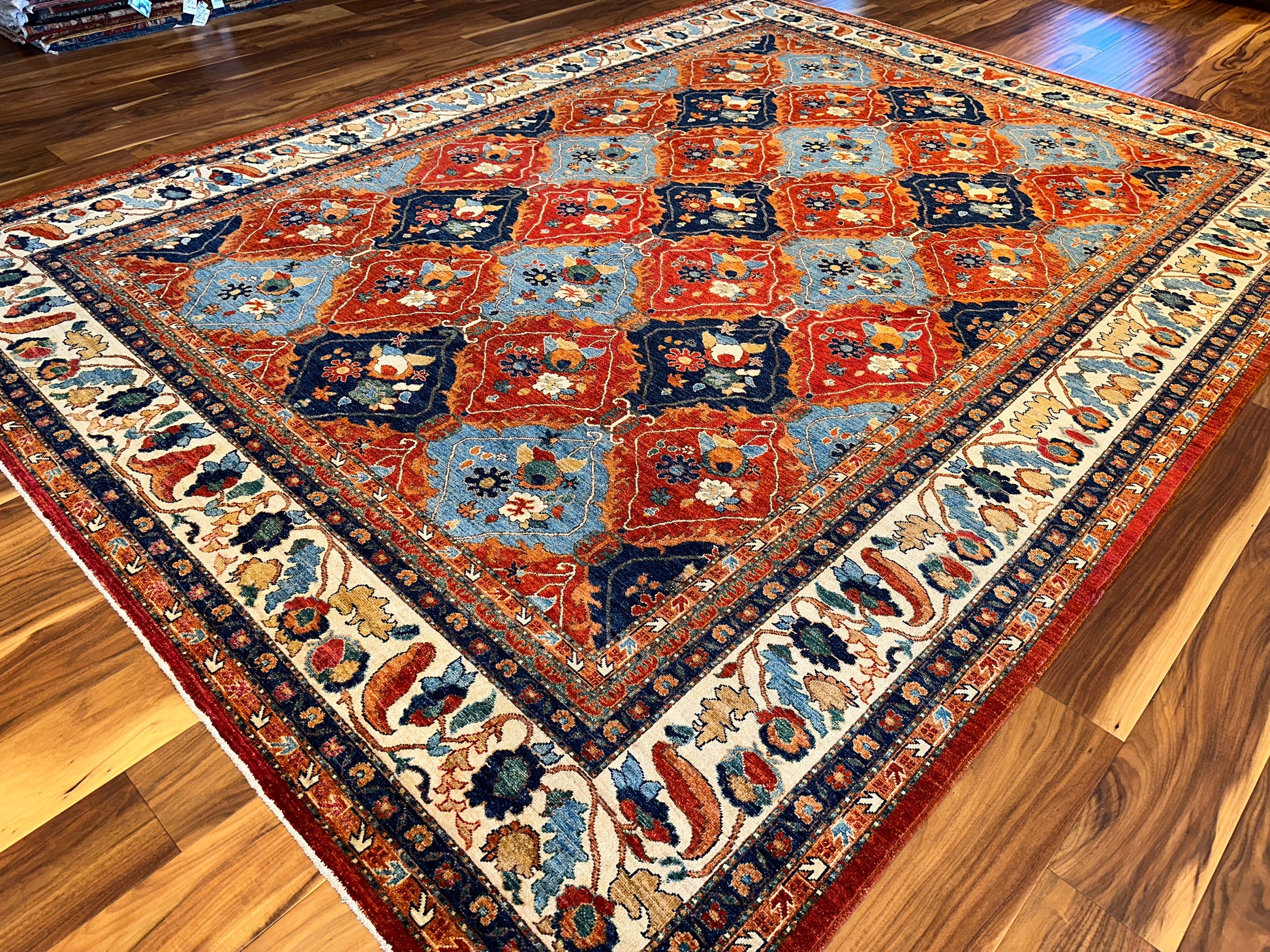 This striking handwoven rug brings together classic refinement and vivid color in a balanced, rhythmic design. Deep reds and rich blues are paired with soft ivory and gentle touches of tan, forming a field of repeating diamond medallions filled with stylized floral motifs. A detailed floral border surrounds the composition, adding an element of traditional elegance while enhancing the vibrant energy of the pattern. This rug adds bold sophistication to any interior, making it especially fitting for formal living or dining rooms.