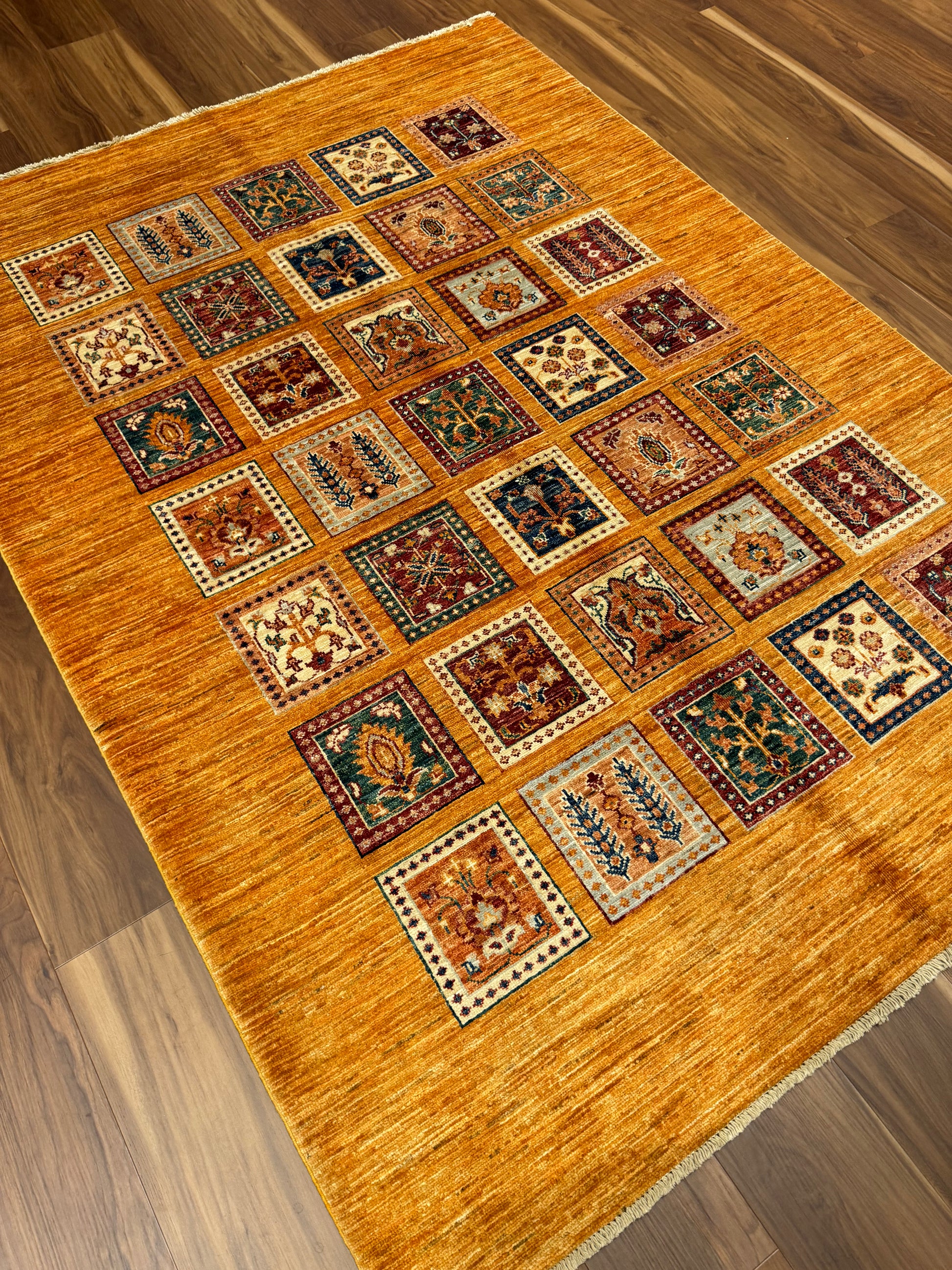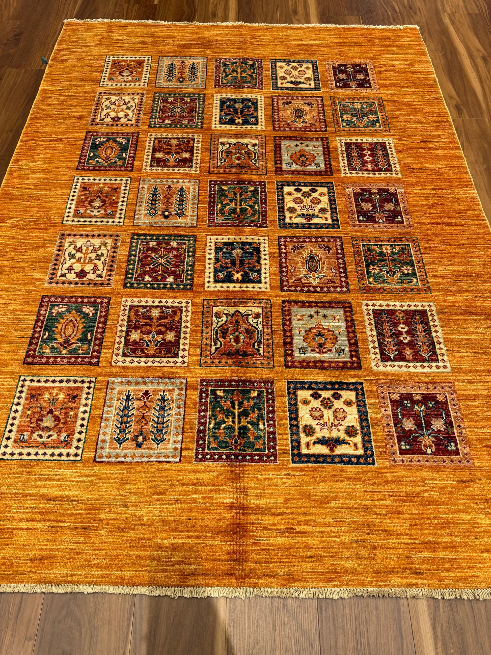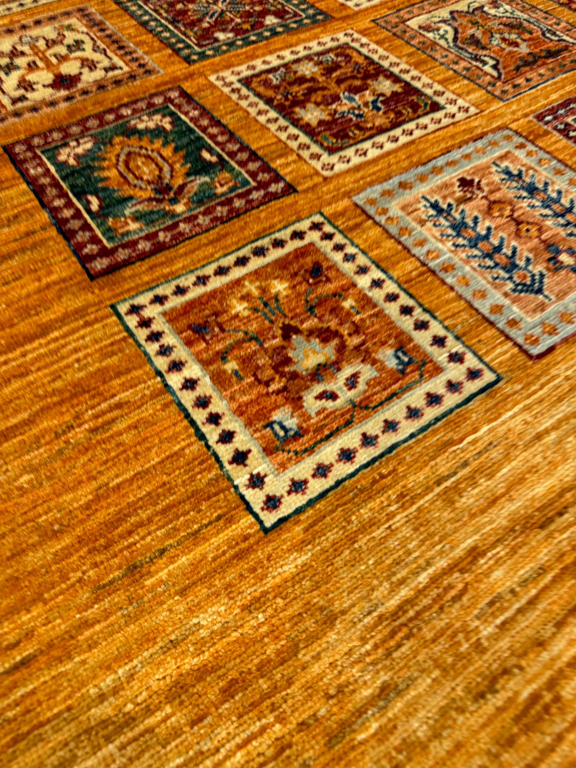 This exquisitely crafted Bakhtiari rug, woven from high-quality wool, features a garden compartment design, a hallmark of the Bakhtiari tribe's artistic tradition. Each compartment presents a unique floral or garden motif, creating a stunning mosaic of vibrant colors and intricate patterns. The rich orange background provides a warm, inviting ambiance while the diverse jewel tones offer splashes of contrast, making this rug a captivating centerpiece for any room.