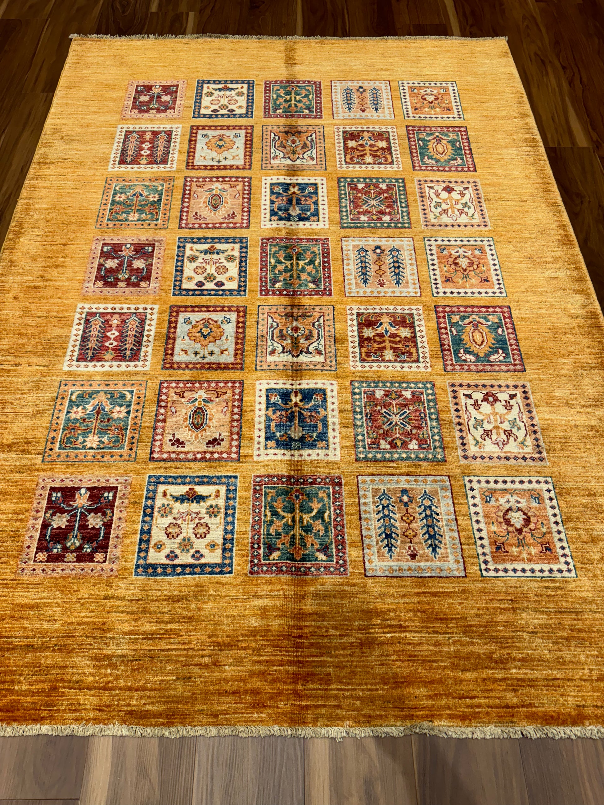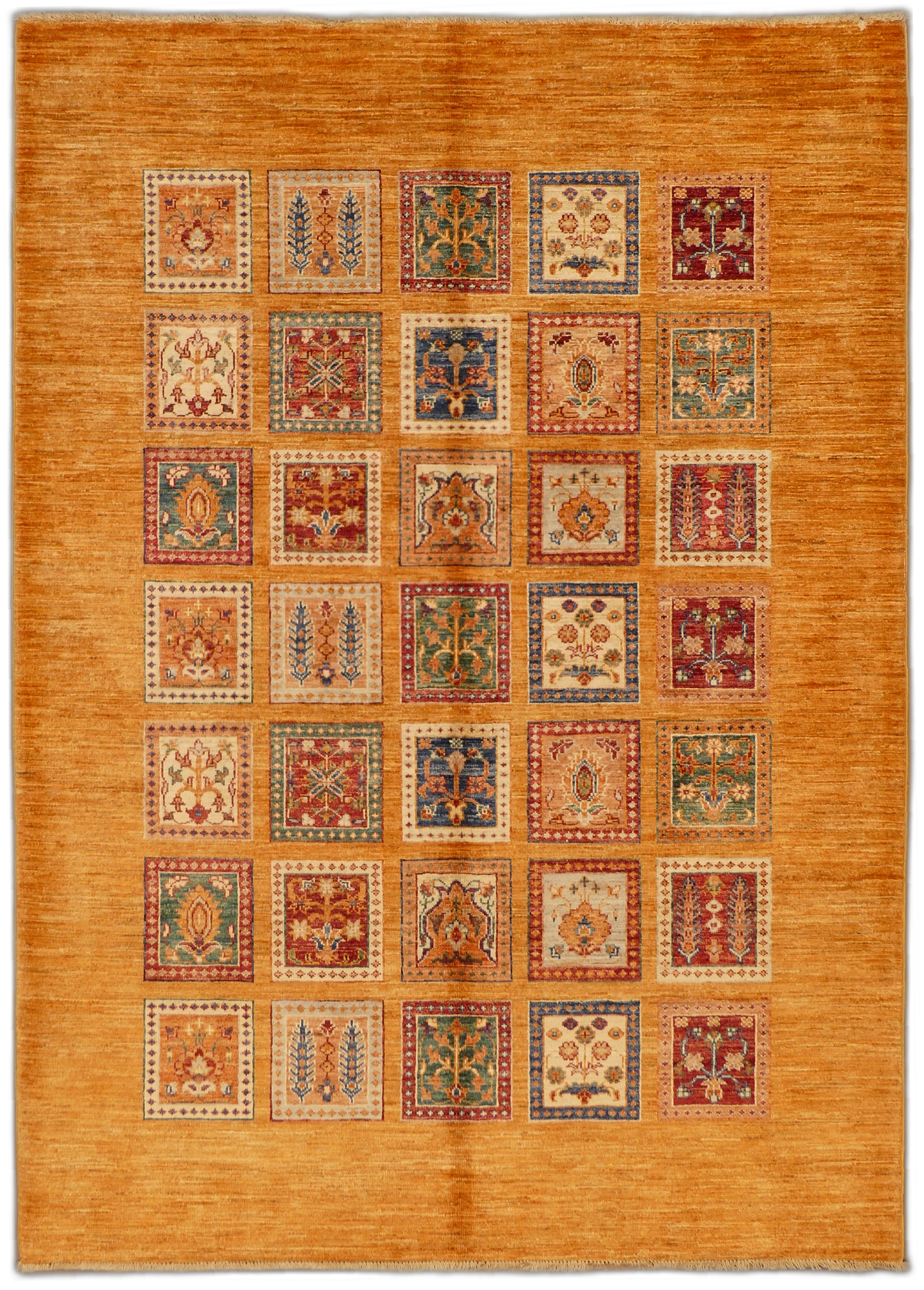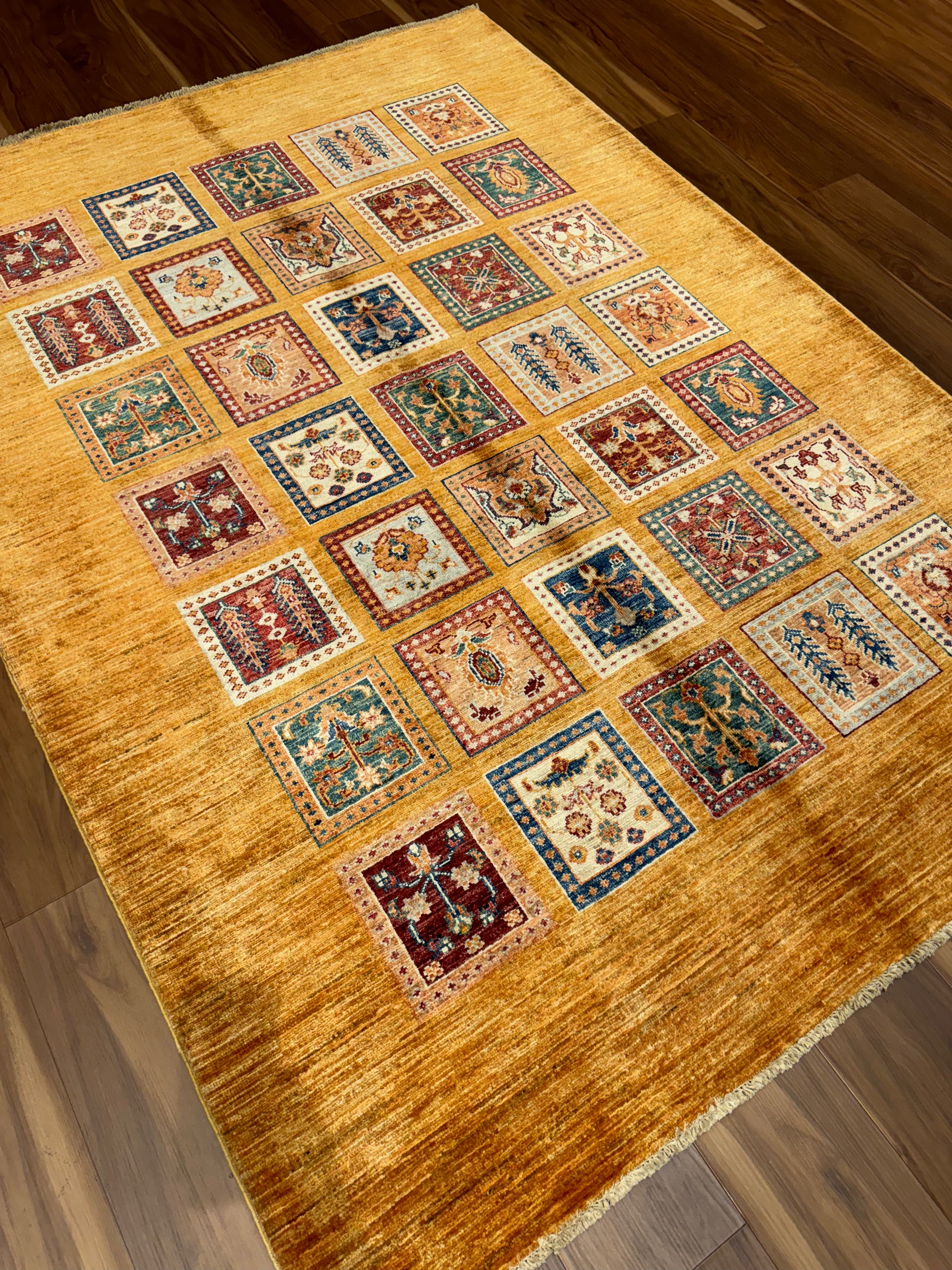 This exquisitely crafted Bakhtiari rug, woven from high-quality wool, features a garden compartment design, a hallmark of the Bakhtiari tribe's artistic tradition. Each compartment presents a unique floral or garden motif, creating a stunning mosaic of vibrant colors and intricate patterns. The rich orange background provides a warm, inviting ambiance while the diverse jewel tones offer splashes of contrast, making this rug a captivating centerpiece for any room.