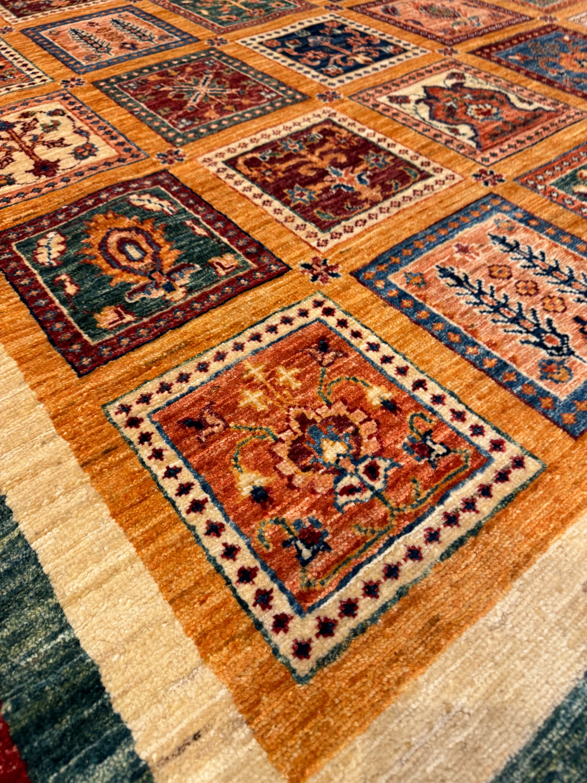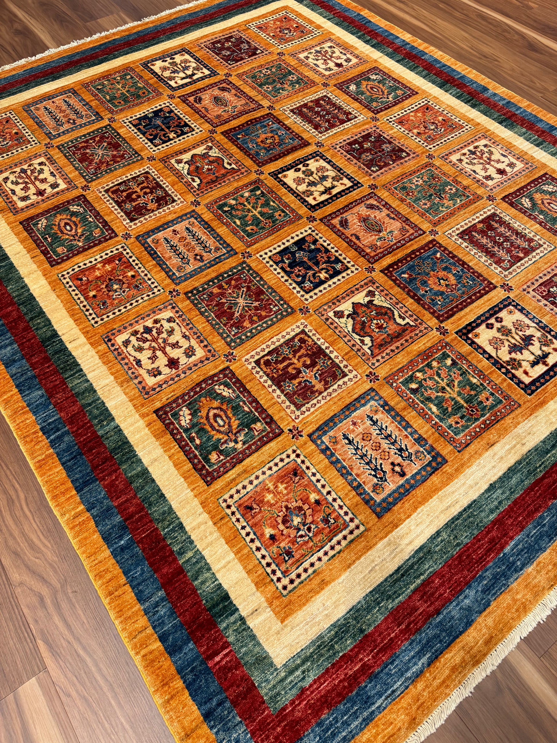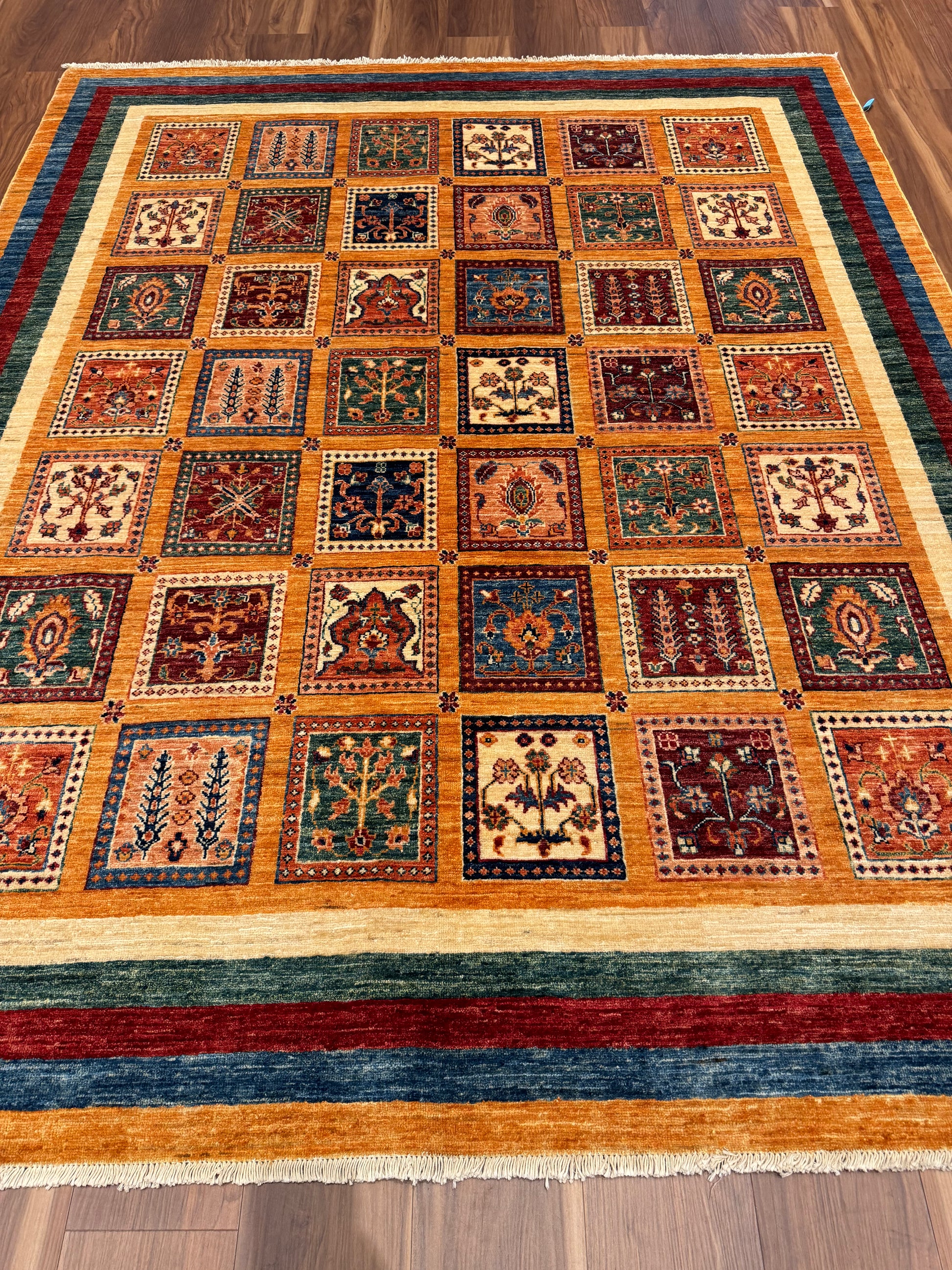 This exquisite Bakhtiari wool rug is a quintessential piece showcasing a garden design often featured in these Persian weavings. It is composed of various compartmentalized squares, each filled with vibrant plant motifs, suggesting an individual garden in each. The colors remain bold and vivid, a hallmark of Bakhtiari craftsmanship. With its rich cultural heritage, this rug is not only a decorative piece but also a tapestry of storied tradition. Ideal for collectors or as a statement piece in a classic interior setting.