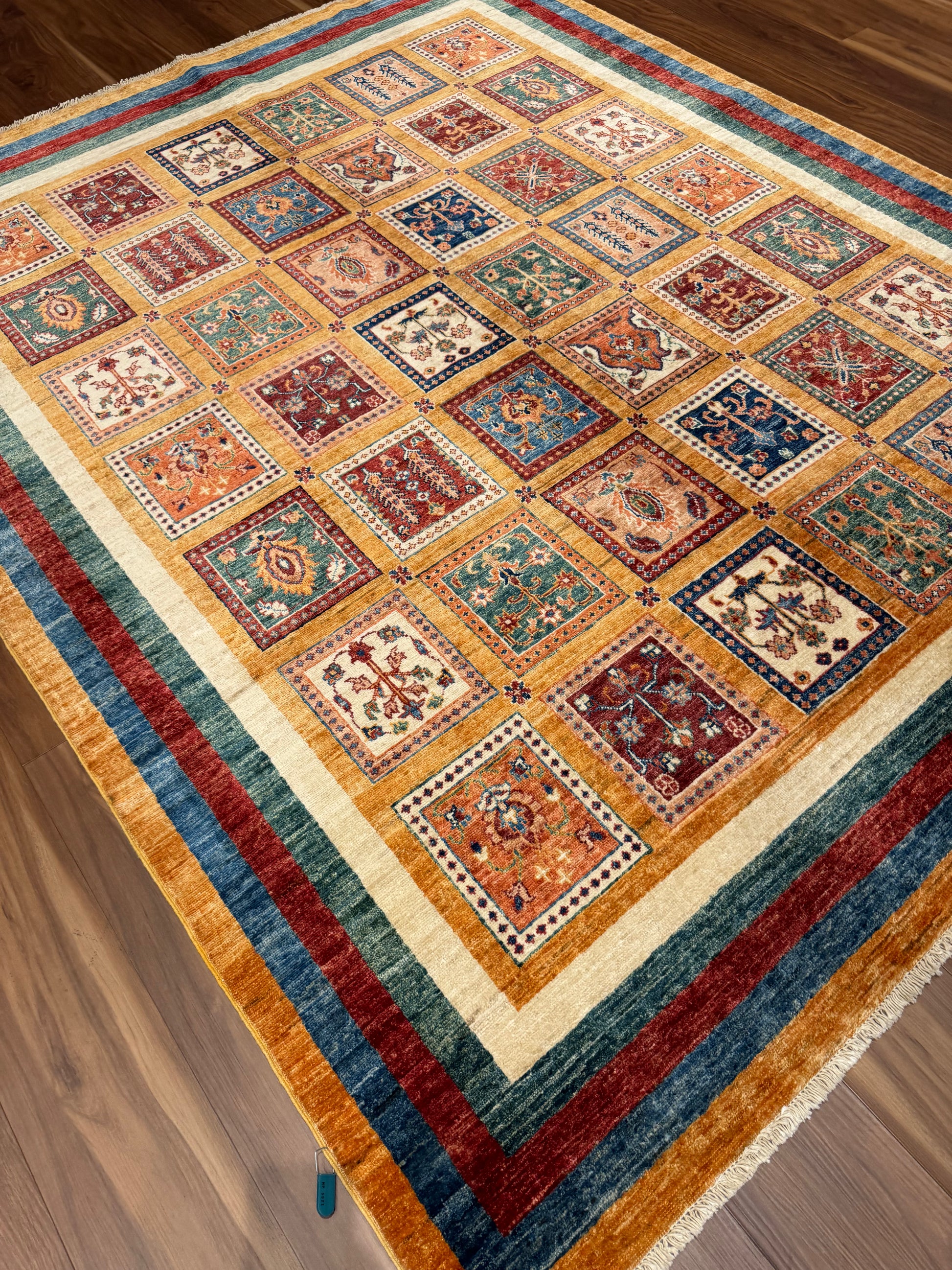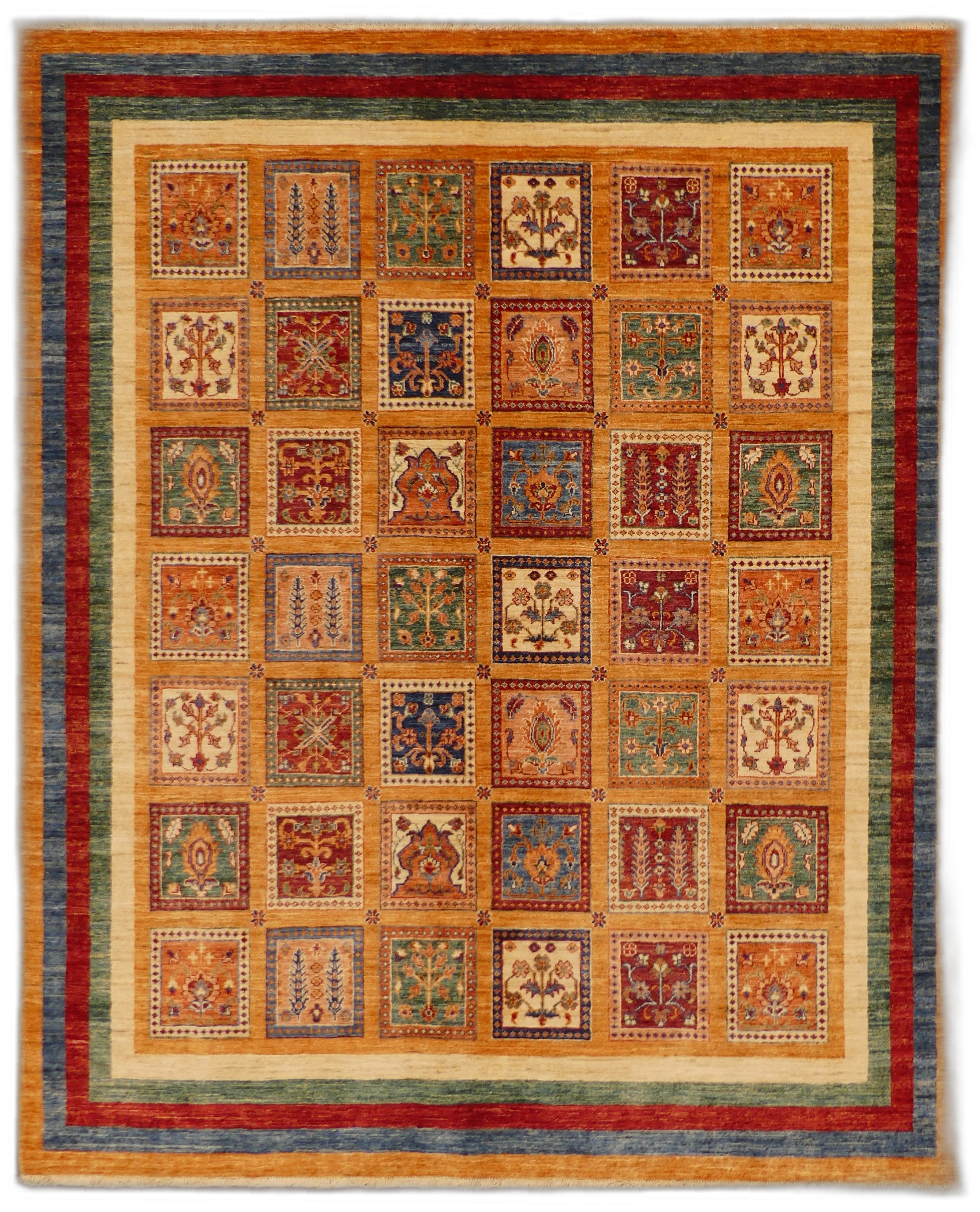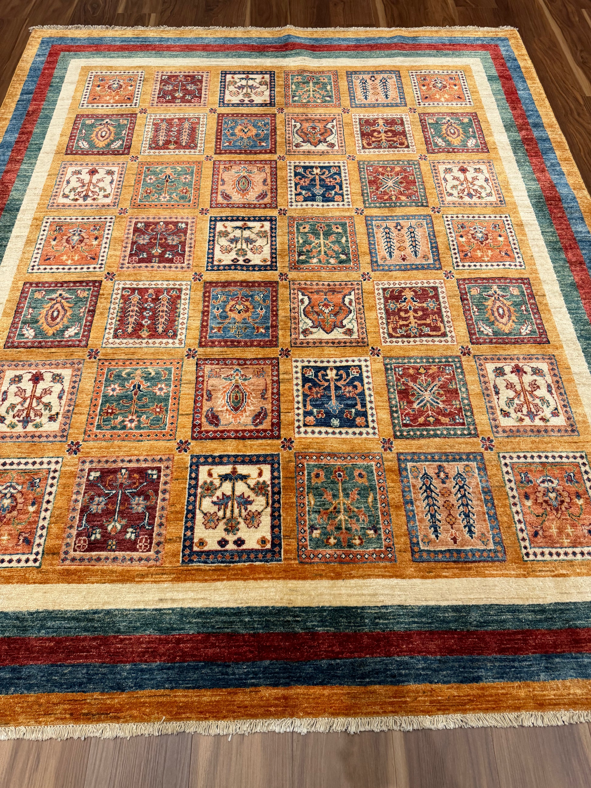 This exquisite Bakhtiari wool rug is a quintessential piece showcasing a garden design often featured in these Persian weavings. It is composed of various compartmentalized squares, each filled with vibrant plant motifs, suggesting an individual garden in each. The colors remain bold and vivid, a hallmark of Bakhtiari craftsmanship. With its rich cultural heritage, this rug is not only a decorative piece but also a tapestry of storied tradition. Ideal for collectors or as a statement piece in a classic interior setting.