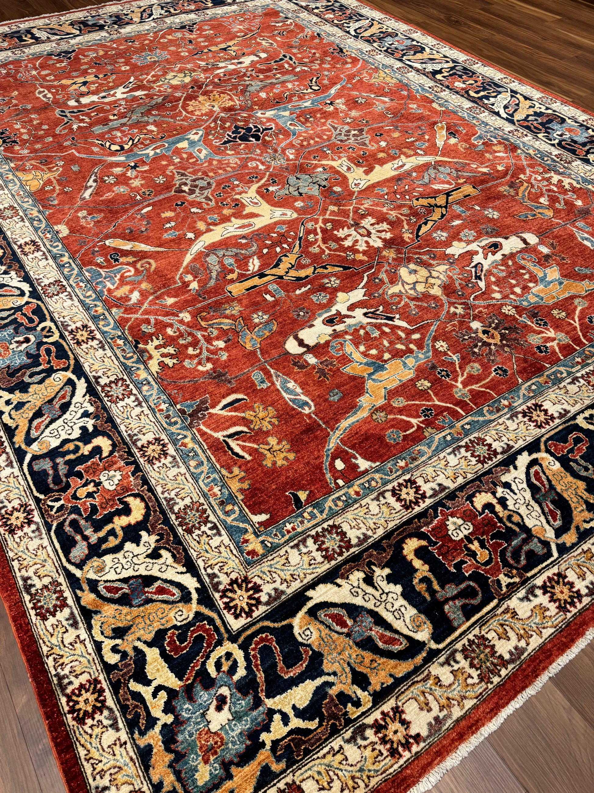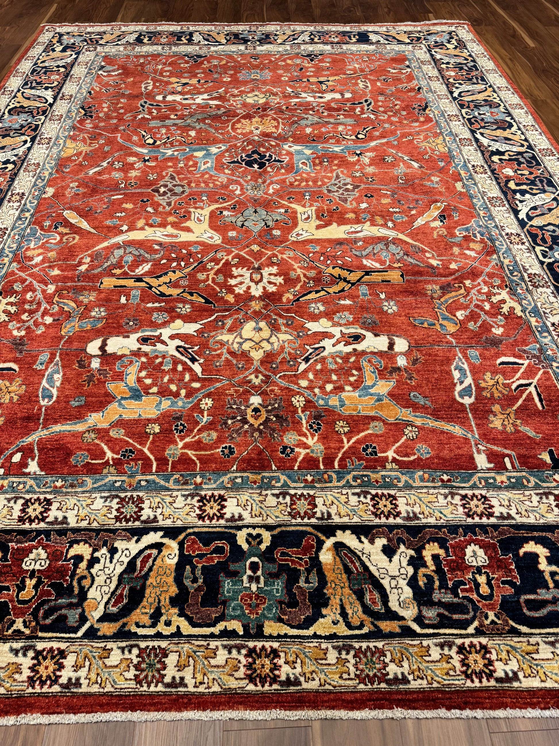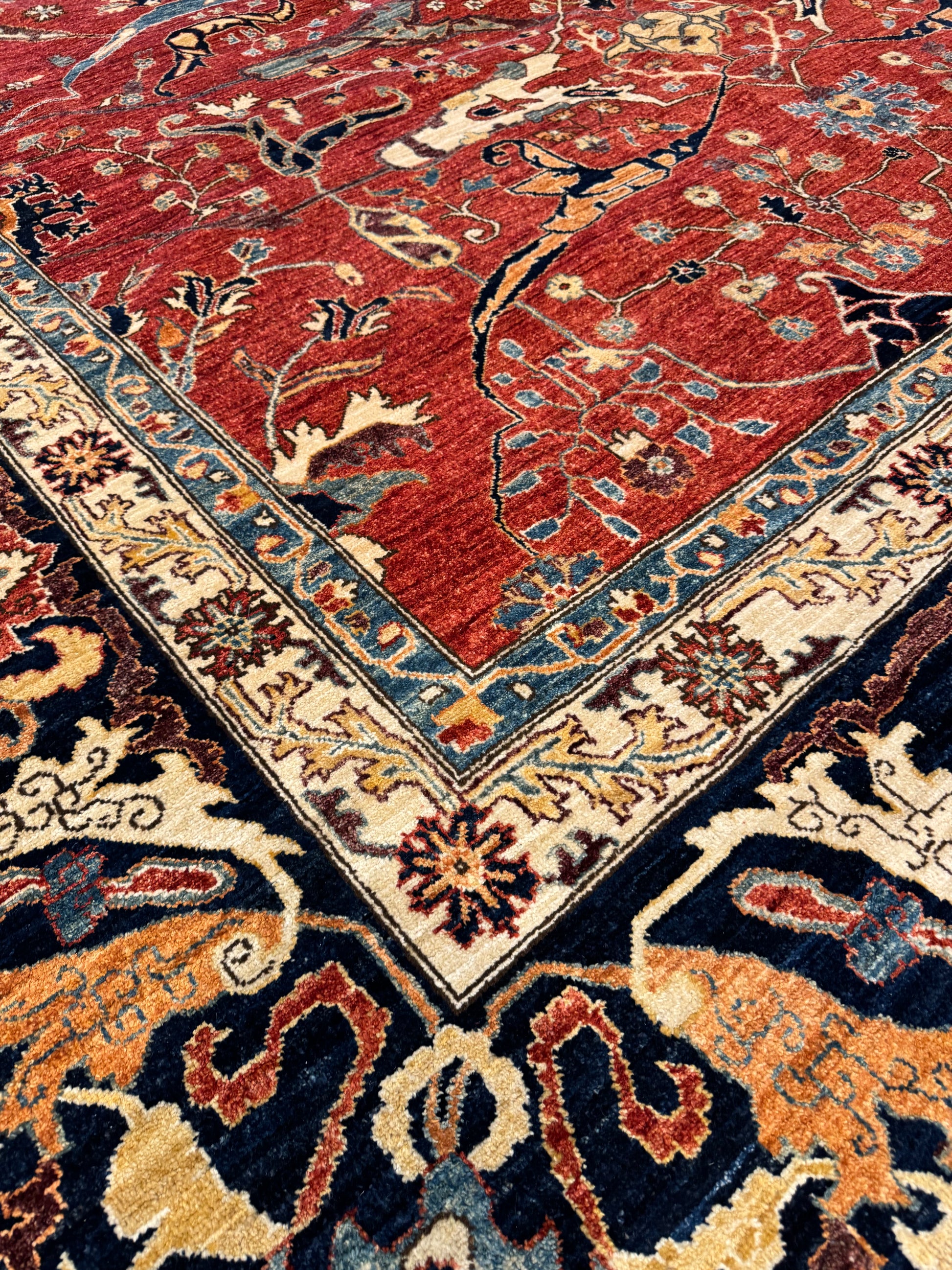 The Bidjar rug, named after a town in Kurdistan, features a durable wool weave known for its longevity and resilience. This particular piece showcases a rich red field complemented by intricate patterns in hues of blue, beige, and gold. The elaborate central medallion and detailed borders are inspired by classical Persian motifs, which include florals and possibly symbolic animal figures, providing a timeless elegance suitable for both modern and traditional interiors.