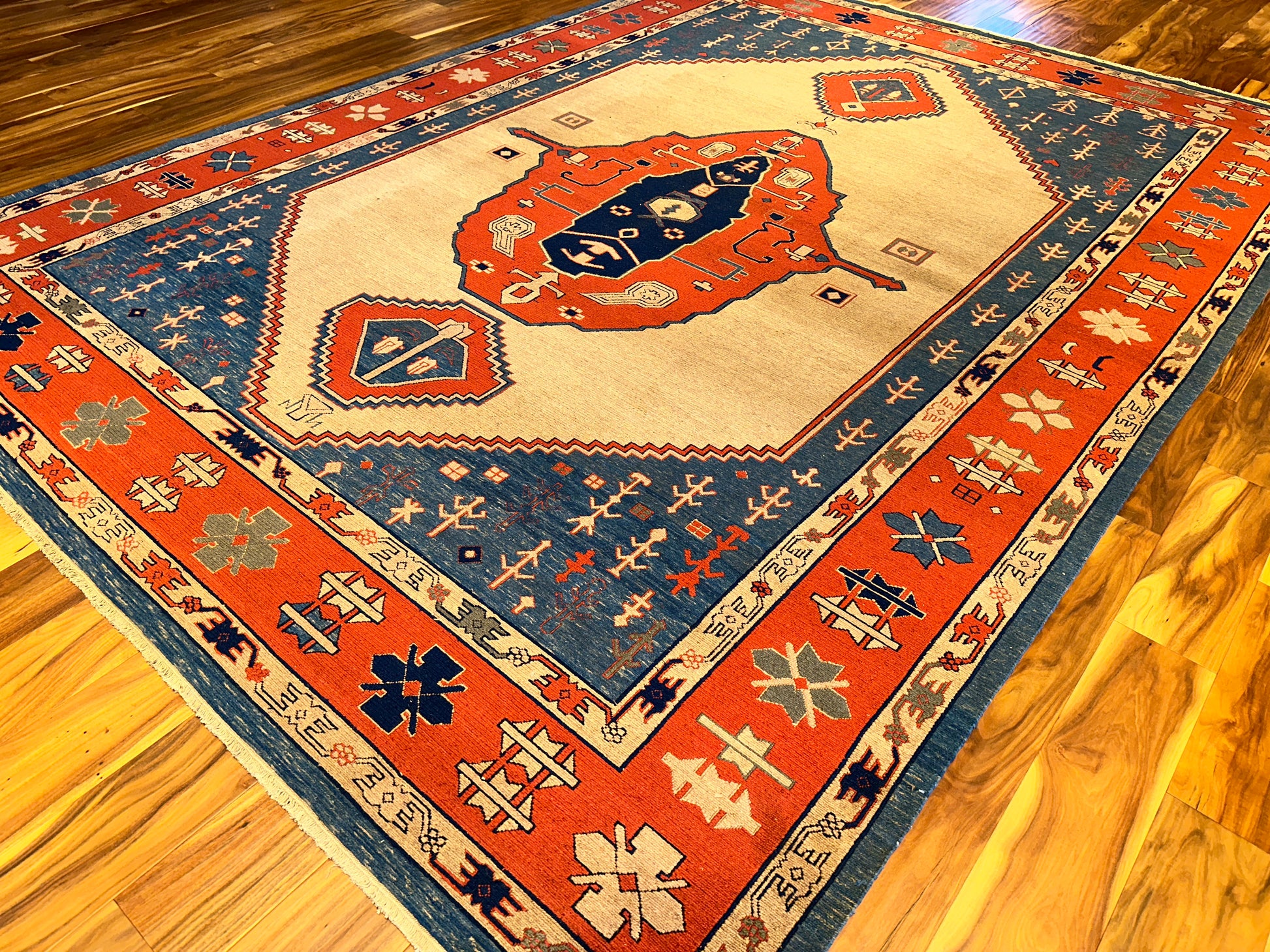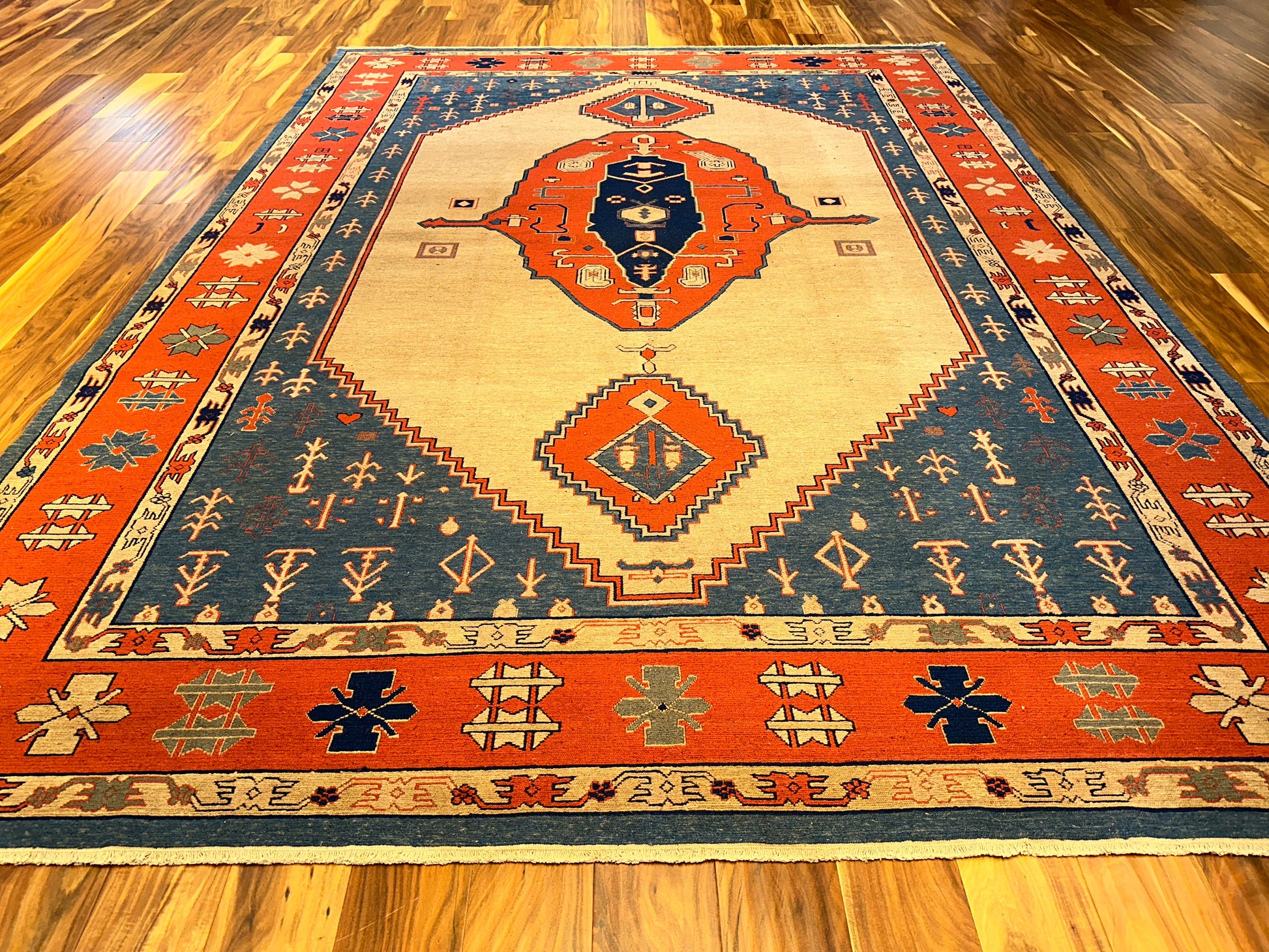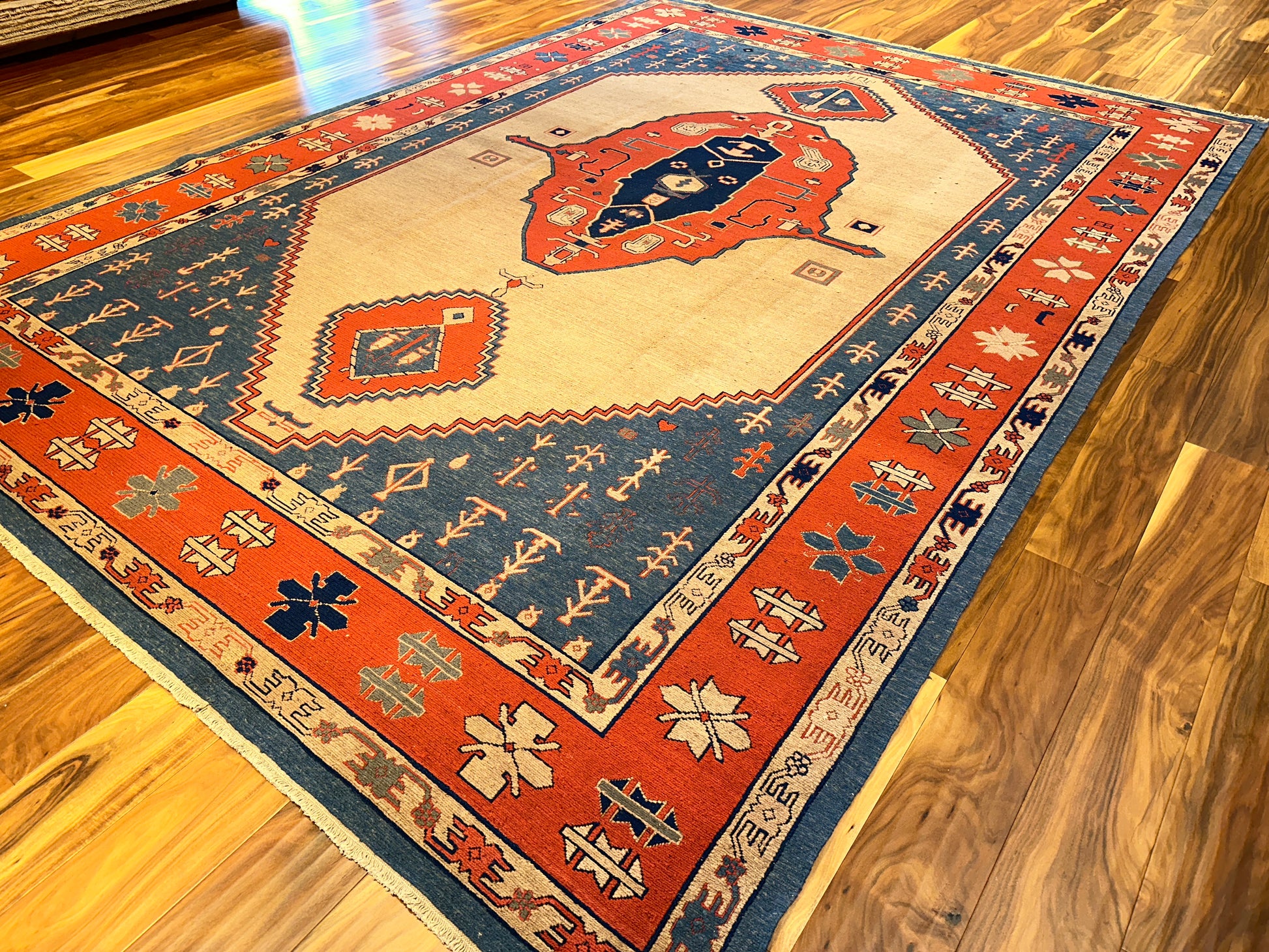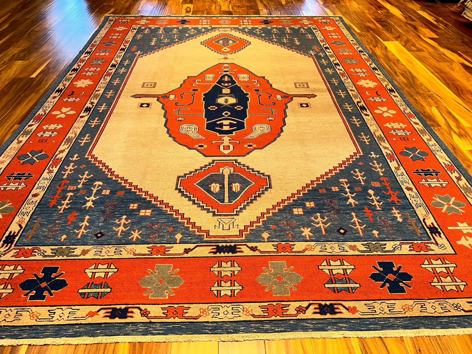 This striking handwoven rug showcases a bold tribal medallion design, rooted in tradition and rich with symbolic motifs. A commanding central medallion in navy and terracotta rests within an open beige field, framed by stepped corners in slate blue and accented with stylized figures and flora. Its saturated tones and geometric composition evoke a strong, grounded atmosphere—perfect for interiors that embrace heritage and strength.