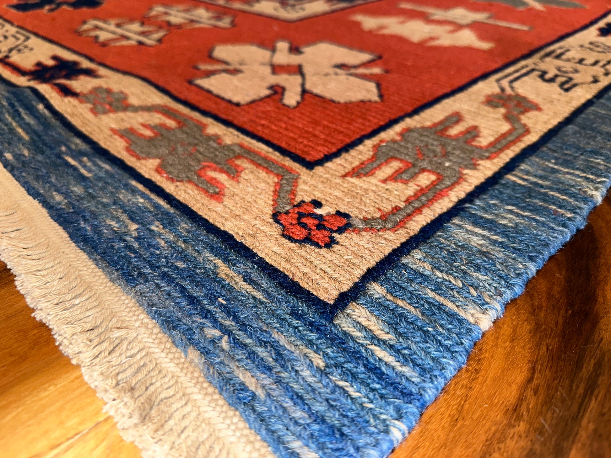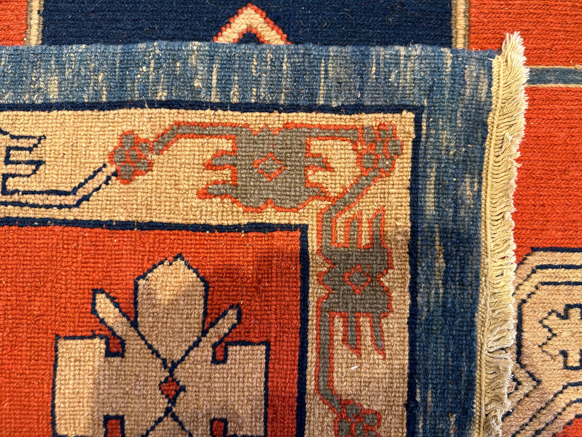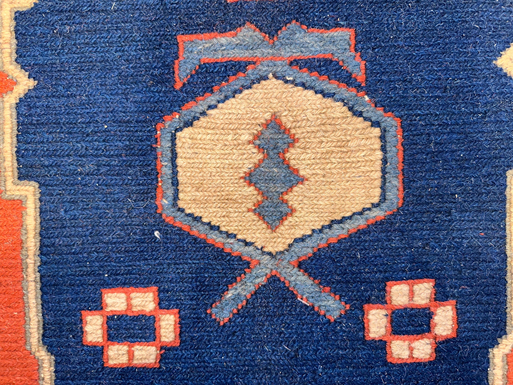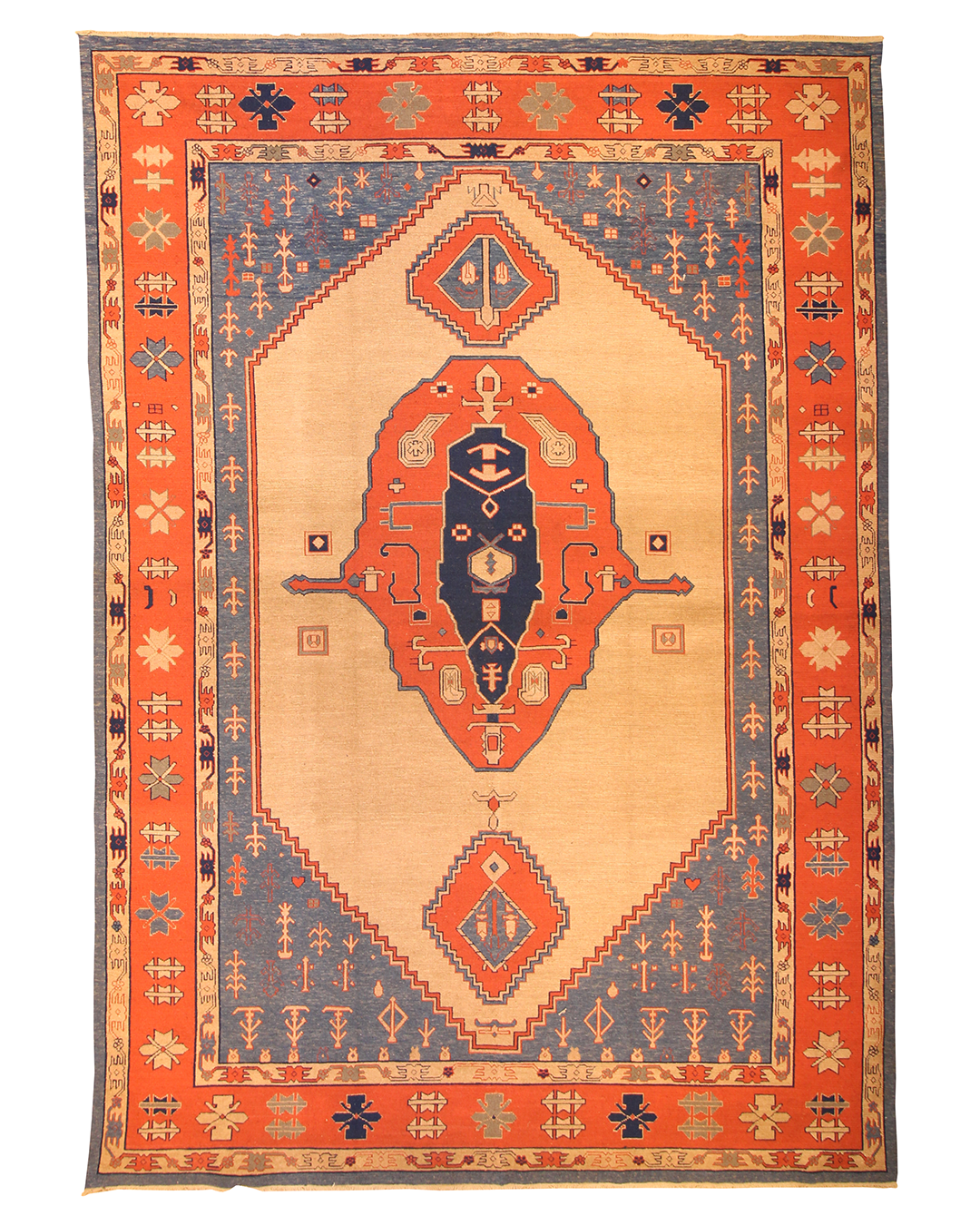 This striking handwoven rug showcases a bold tribal medallion design, rooted in tradition and rich with symbolic motifs. A commanding central medallion in navy and terracotta rests within an open beige field, framed by stepped corners in slate blue and accented with stylized figures and flora. Its saturated tones and geometric composition evoke a strong, grounded atmosphere—perfect for interiors that embrace heritage and strength.