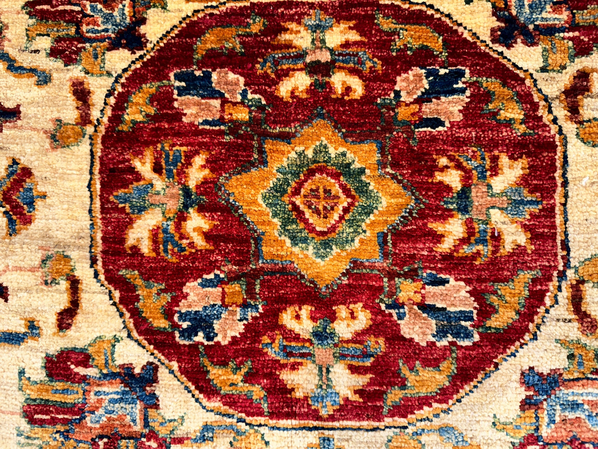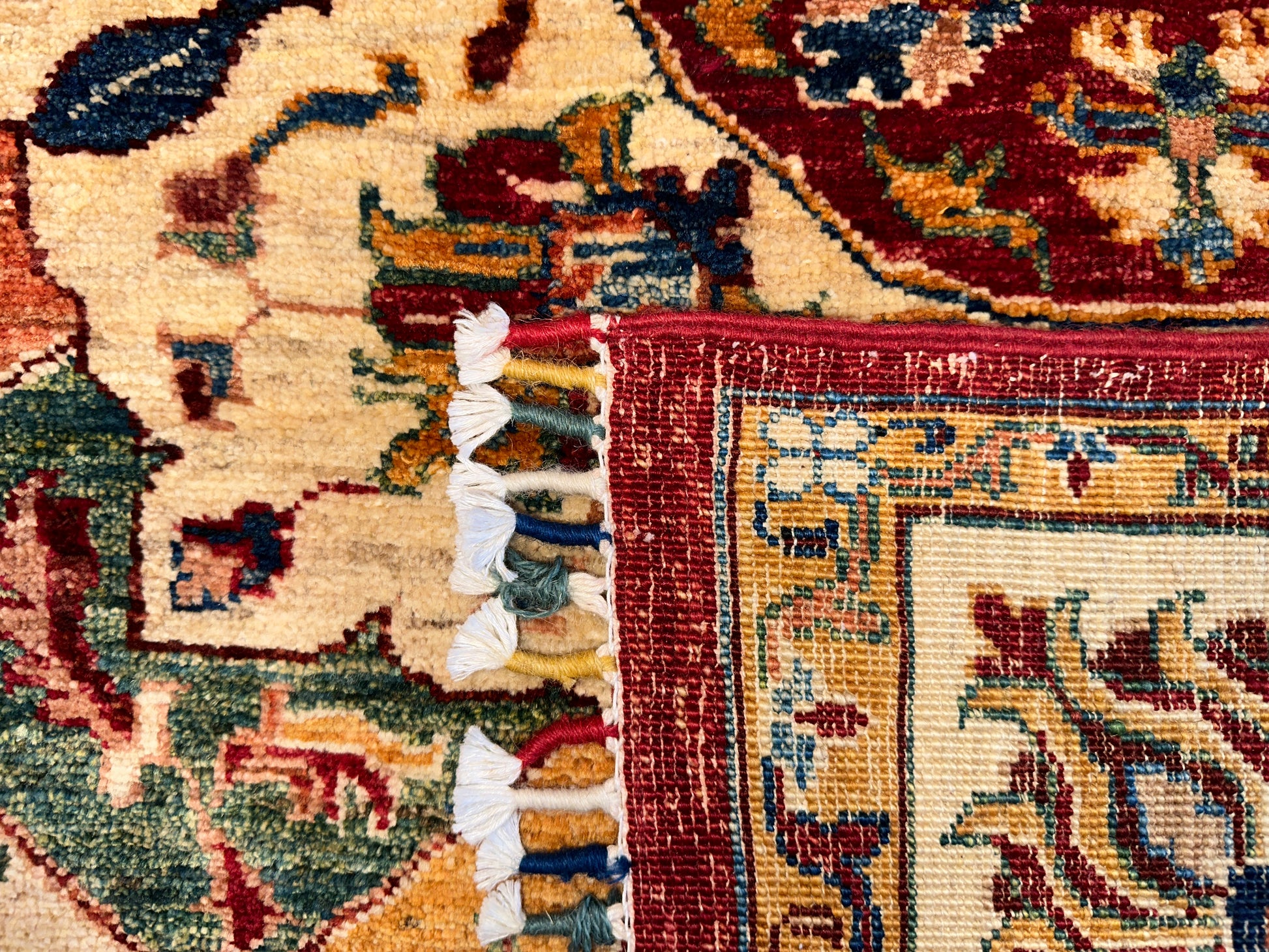 - Design: Central medallion with multicolor diamond lattice and floral border
