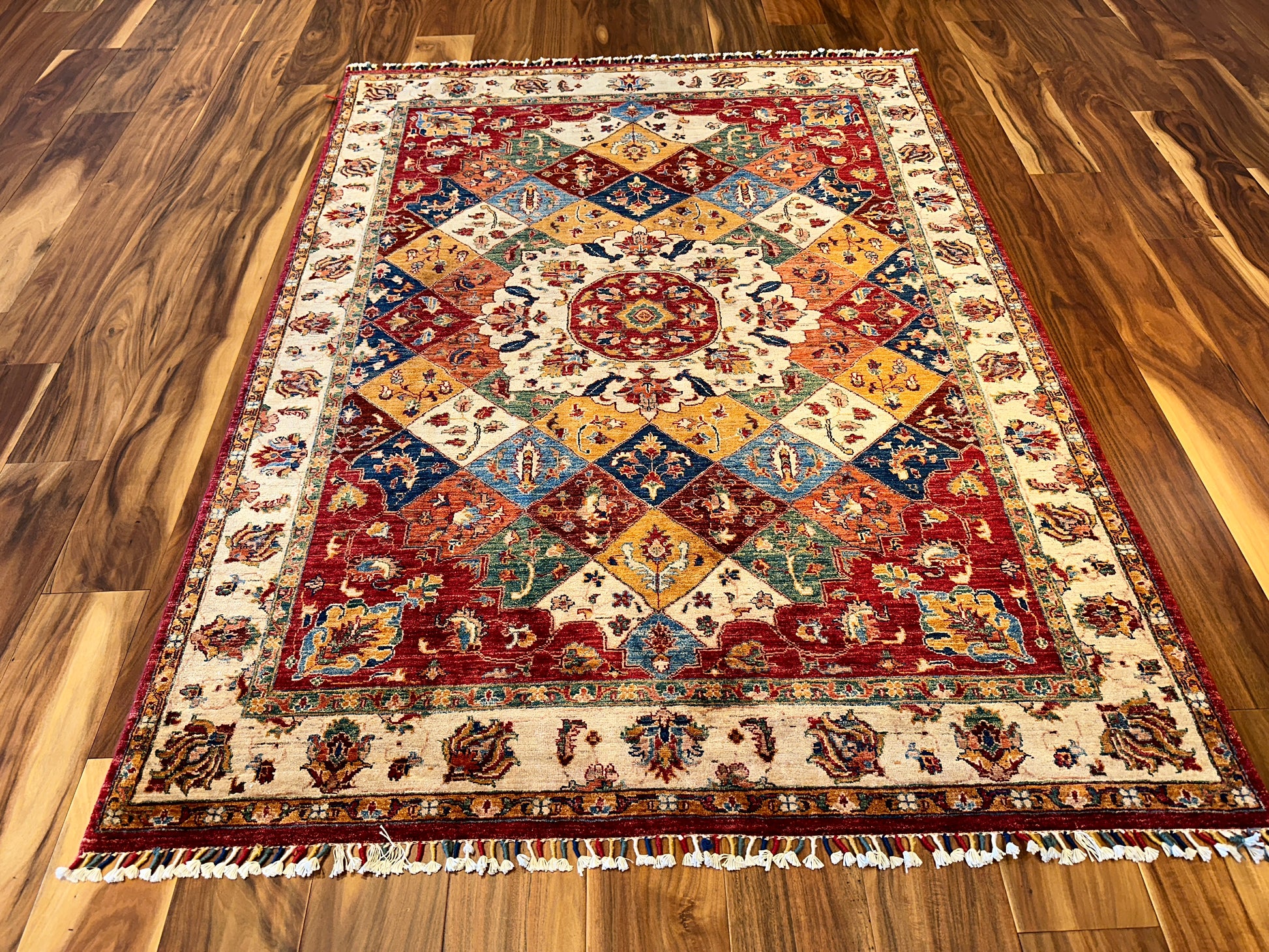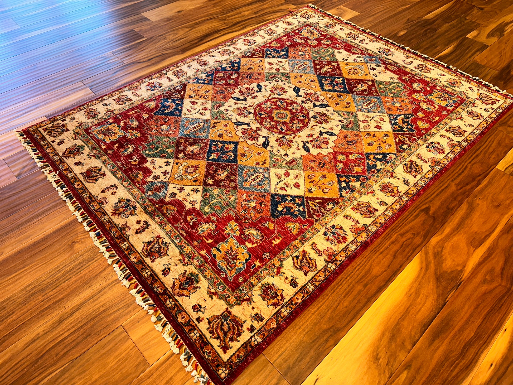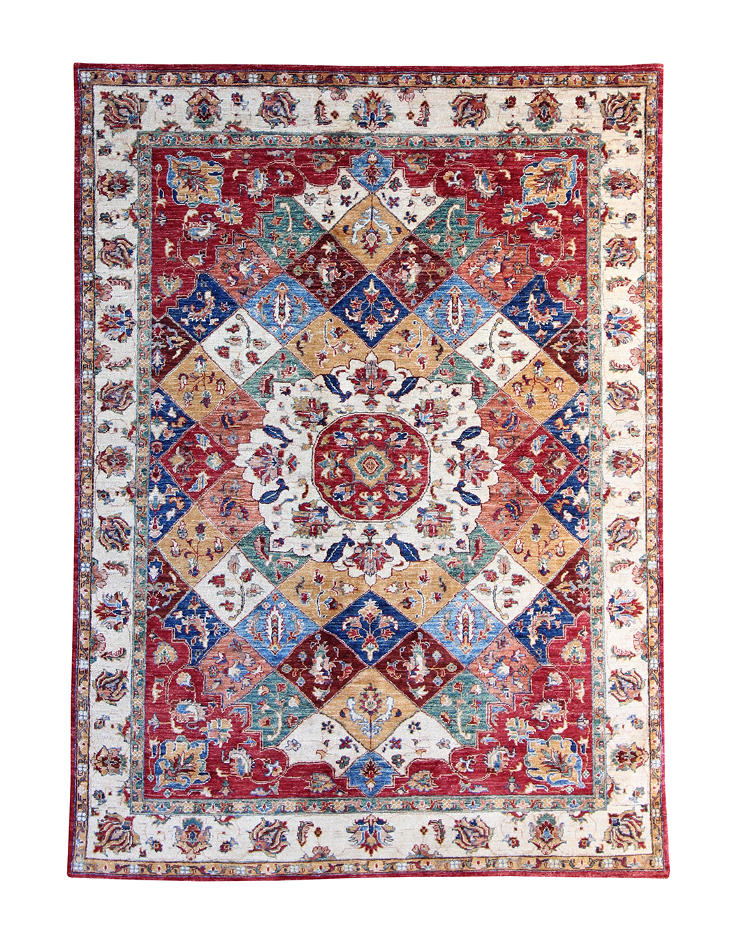 Vibrant and intricately composed, this handmade wool rug features a richly ornamented medallion set within a lattice of diamond-shaped floral panels. Jewel-toned reds, blues, golds, and greens create a patchwork of visual interest, framed by a cream-toned border filled with elegant scrolling florals. The dynamic structure and color story evoke the classical beauty of Persian design with a slightly whimsical twist.