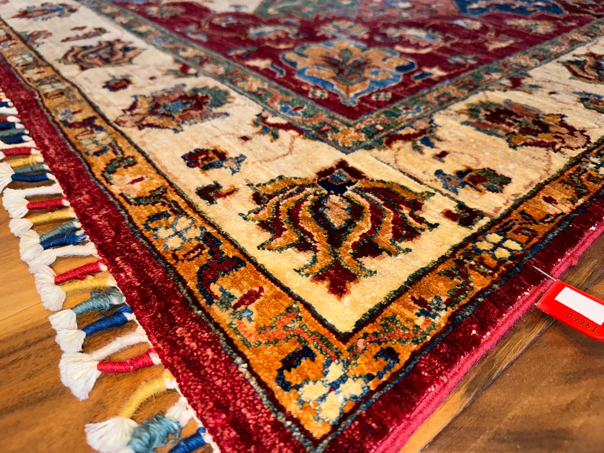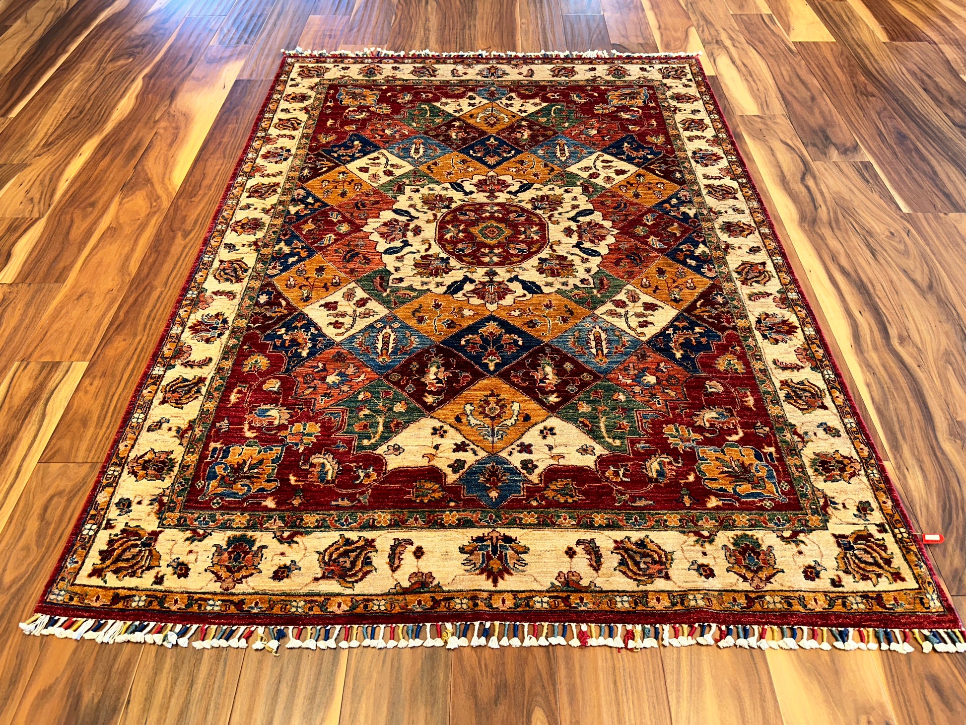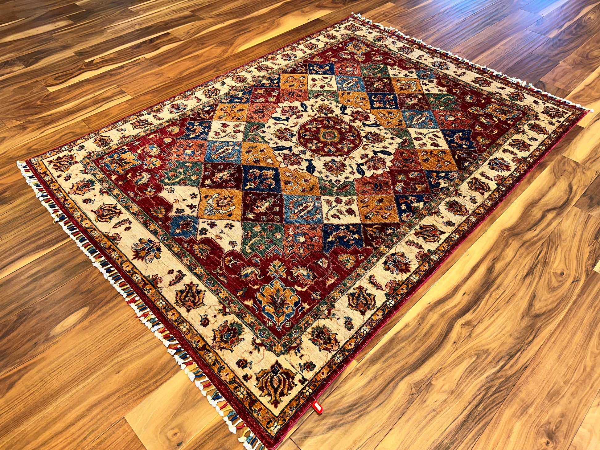 Vibrant and intricately composed, this handmade wool rug features a richly ornamented medallion set within a lattice of diamond-shaped floral panels. Jewel-toned reds, blues, golds, and greens create a patchwork of visual interest, framed by a cream-toned border filled with elegant scrolling florals. The dynamic structure and color story evoke the classical beauty of Persian design with a slightly whimsical twist.