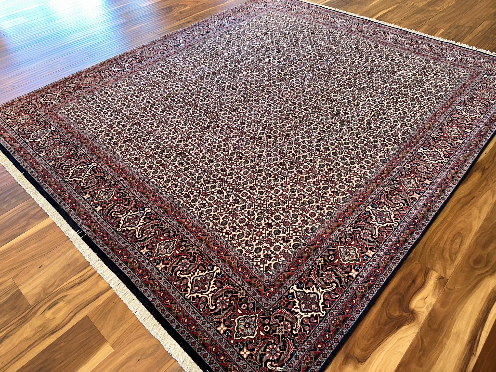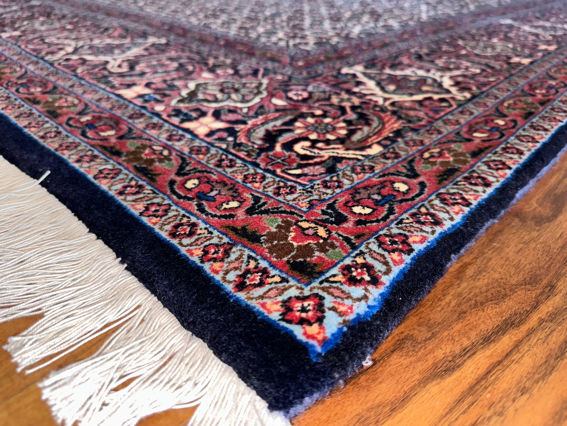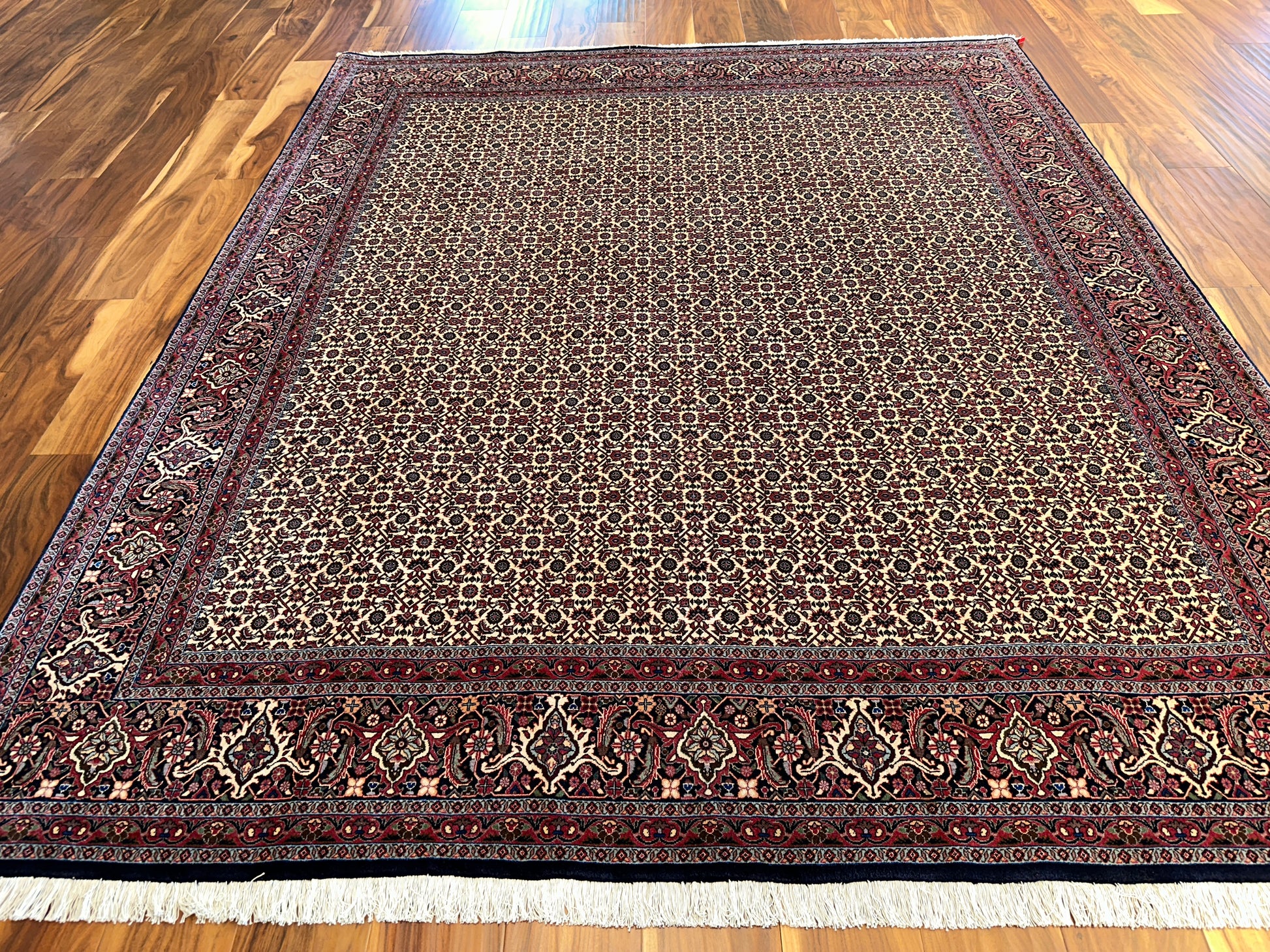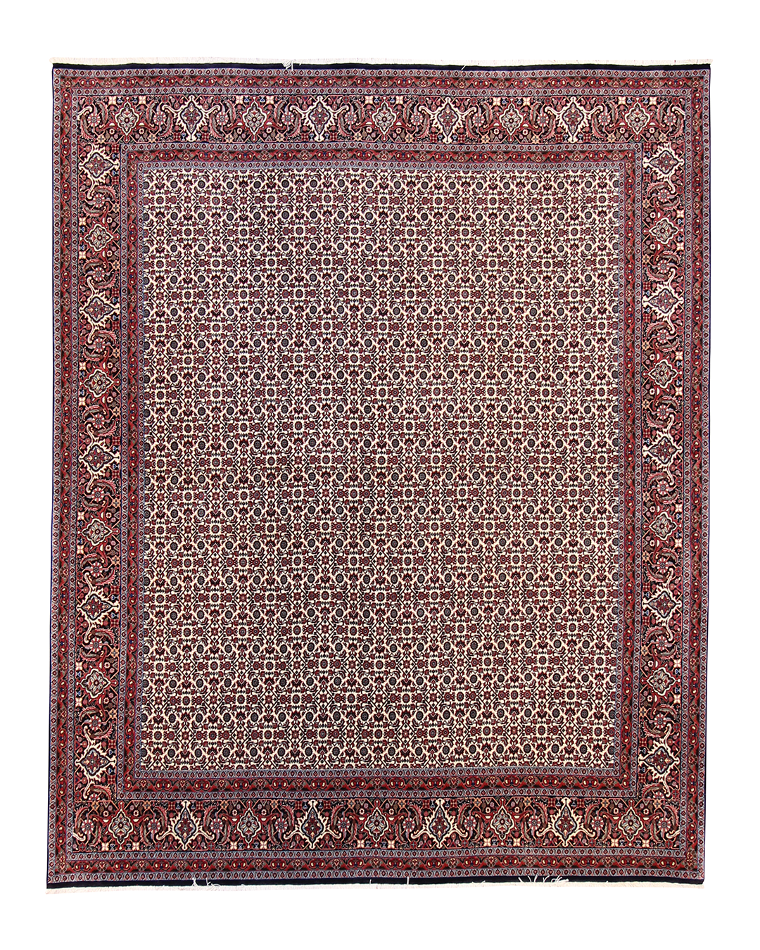 This refined Persian rug presents an allover Herati design in an intricate latticework of floral diamonds, bordered by deeply layered rosettes and arabesques. The fine detailing and rich contrast between deep red, navy, and ivory tones lend the piece a stately presence, ideal for anchoring formal interiors or elevating traditional spaces with its elegant precision.