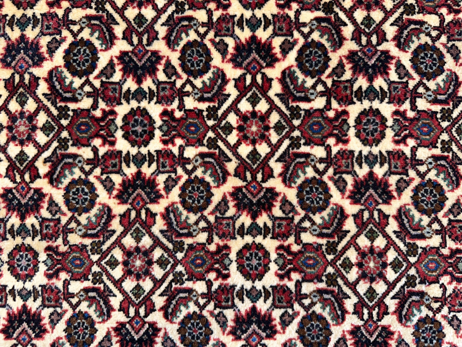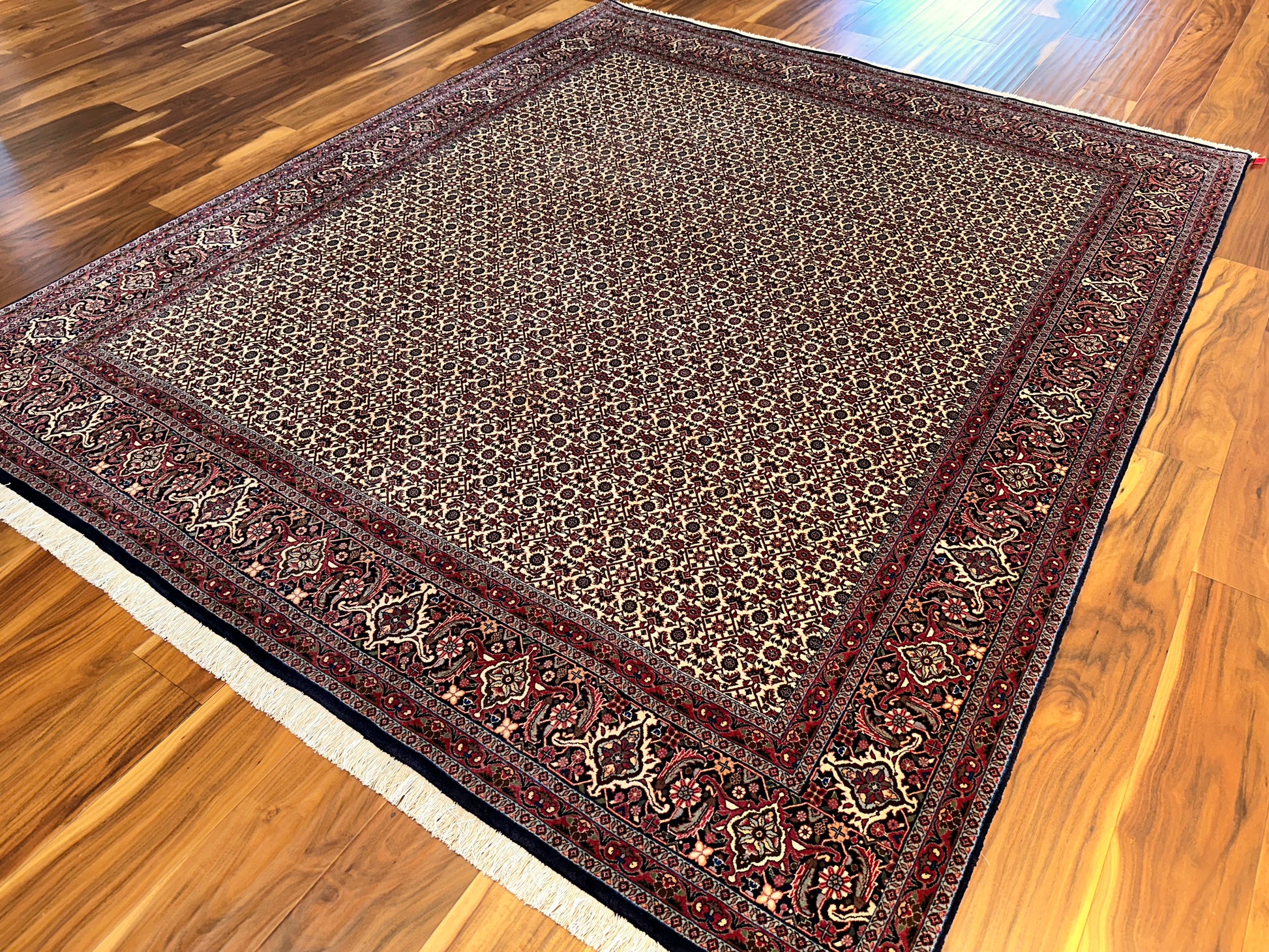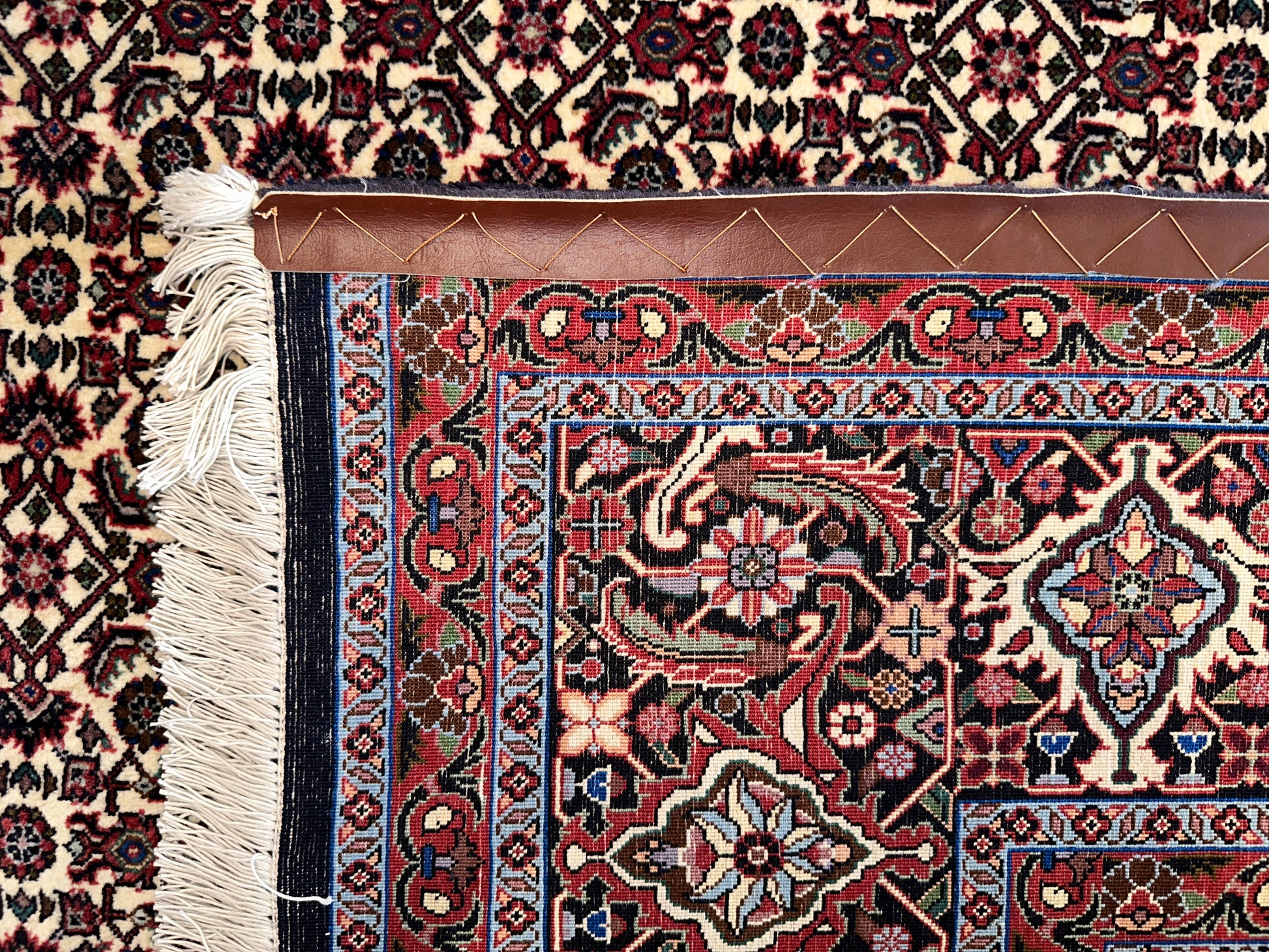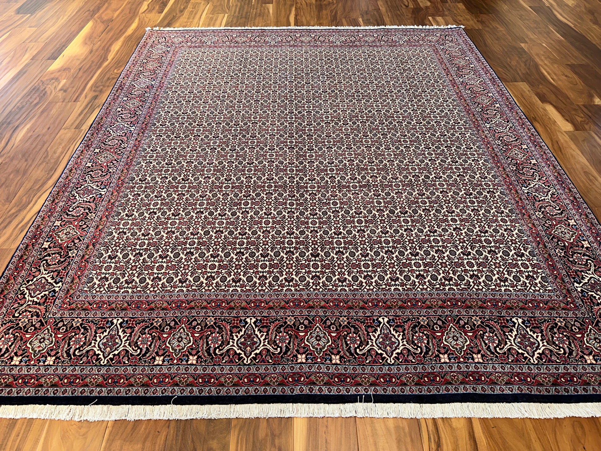 This refined Persian rug presents an allover Herati design in an intricate latticework of floral diamonds, bordered by deeply layered rosettes and arabesques. The fine detailing and rich contrast between deep red, navy, and ivory tones lend the piece a stately presence, ideal for anchoring formal interiors or elevating traditional spaces with its elegant precision.