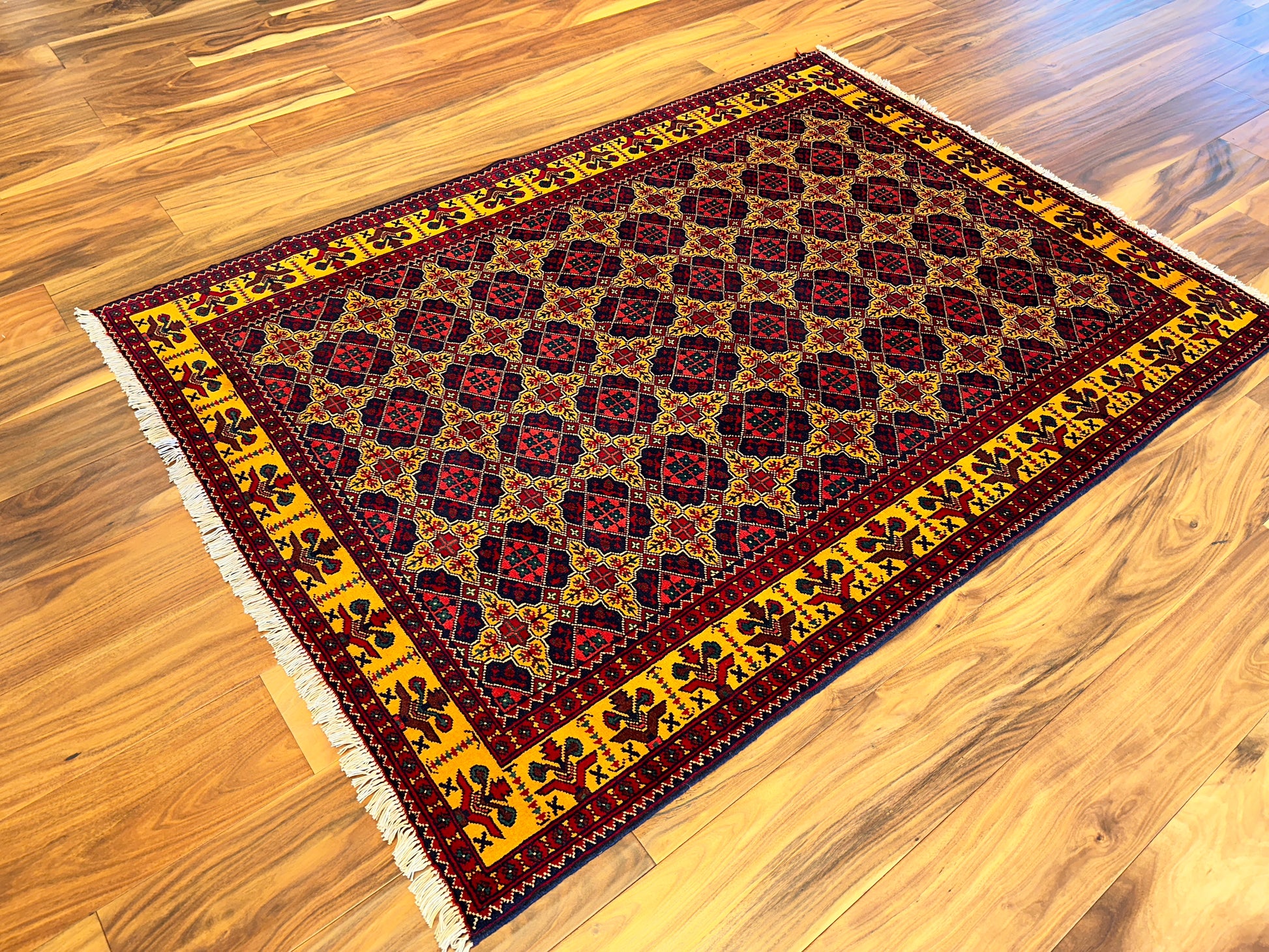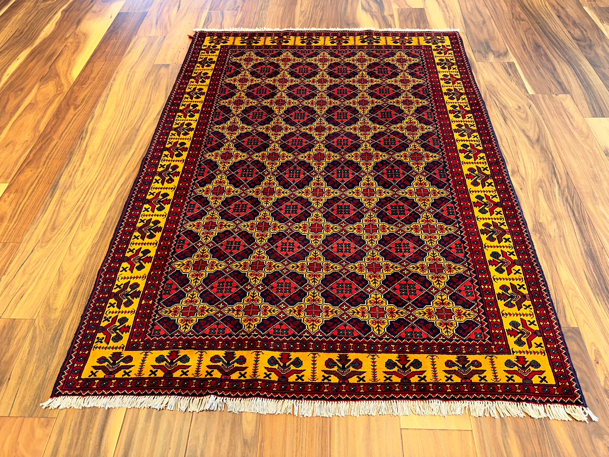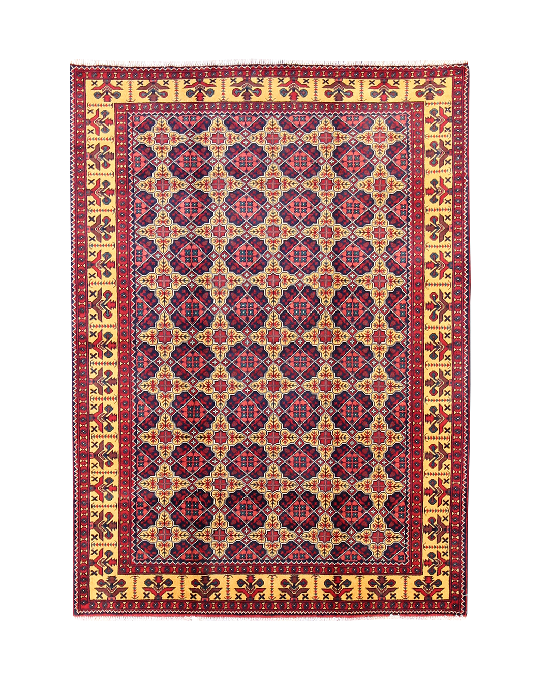 This vibrant rug features a striking lattice medallion pattern in red, navy, and yellow, set within a bold golden border. Each motif is carefully placed to create a rhythmic, balanced design, giving the rug a sense of regal symmetry and visual richness. The palette and precise patterning make this piece ideal for rooms that aim to blend energy with structure.