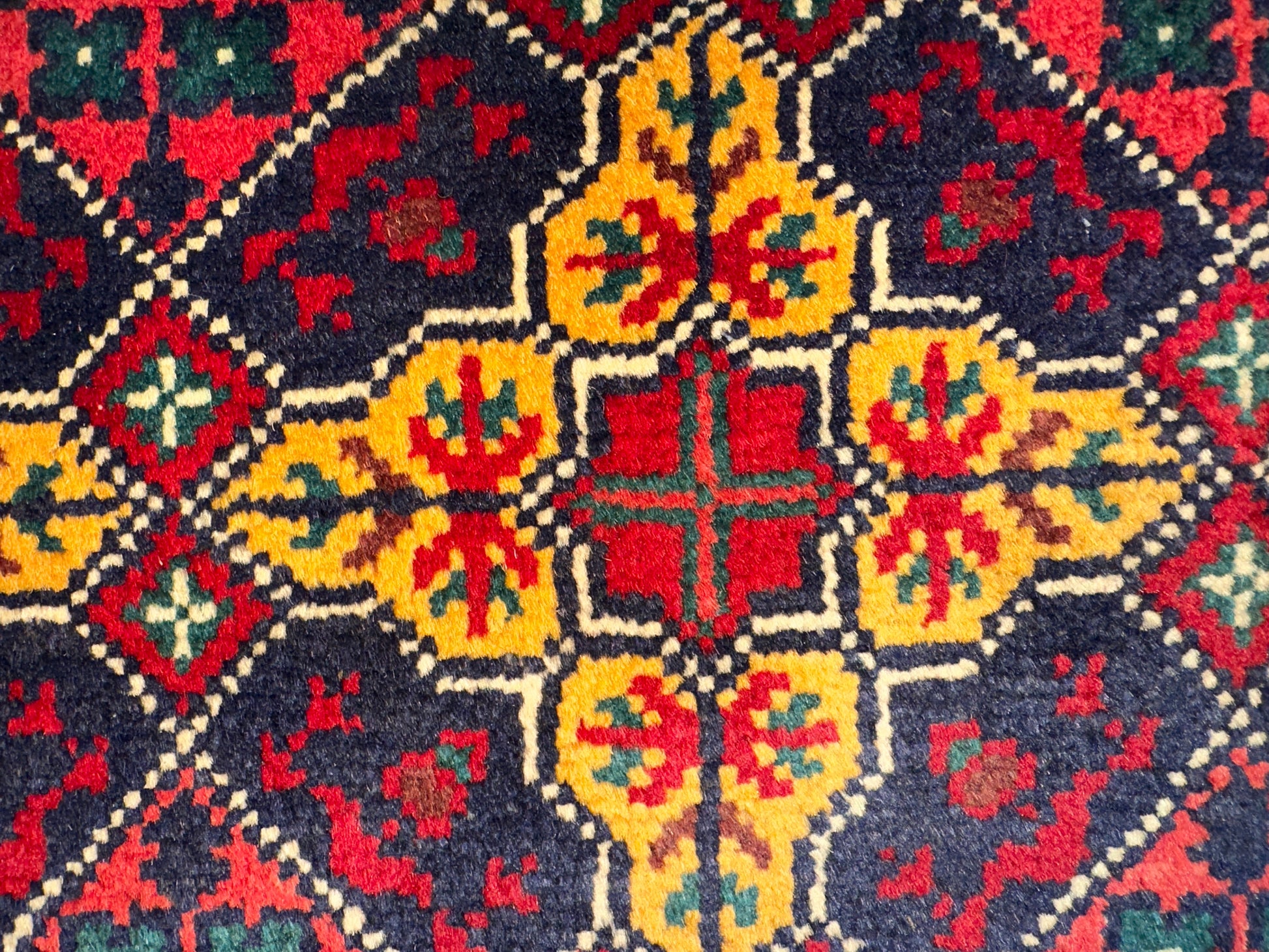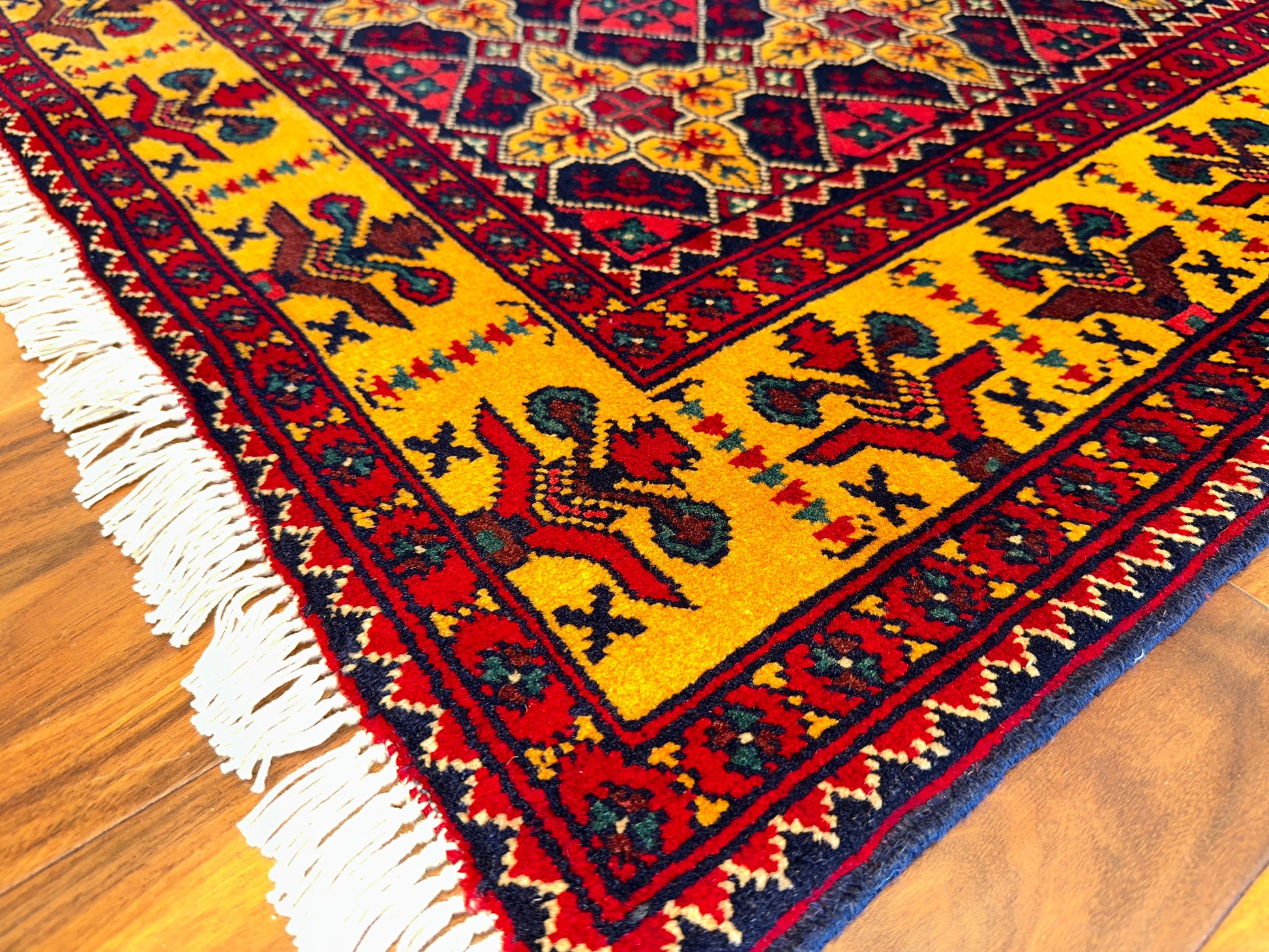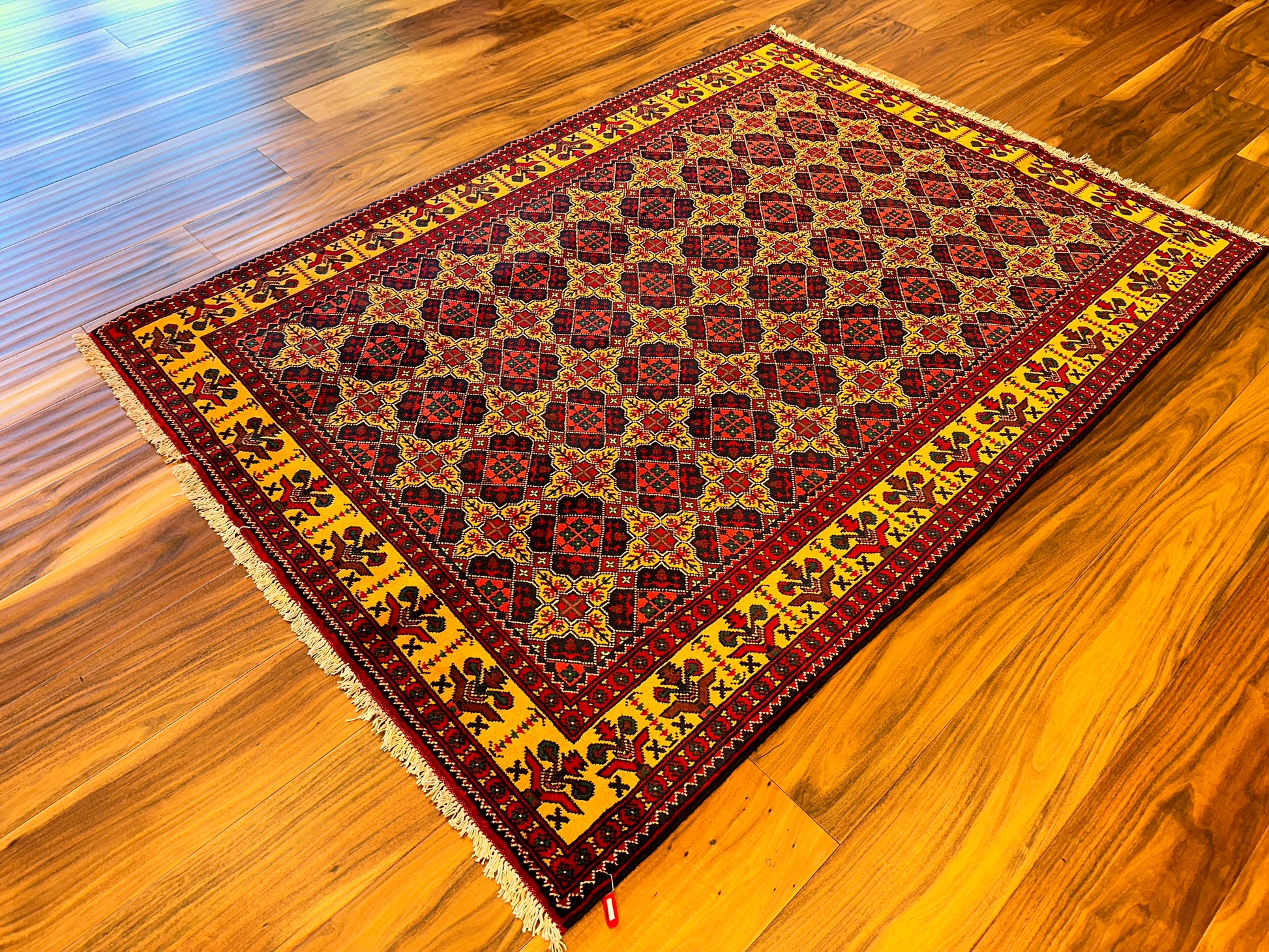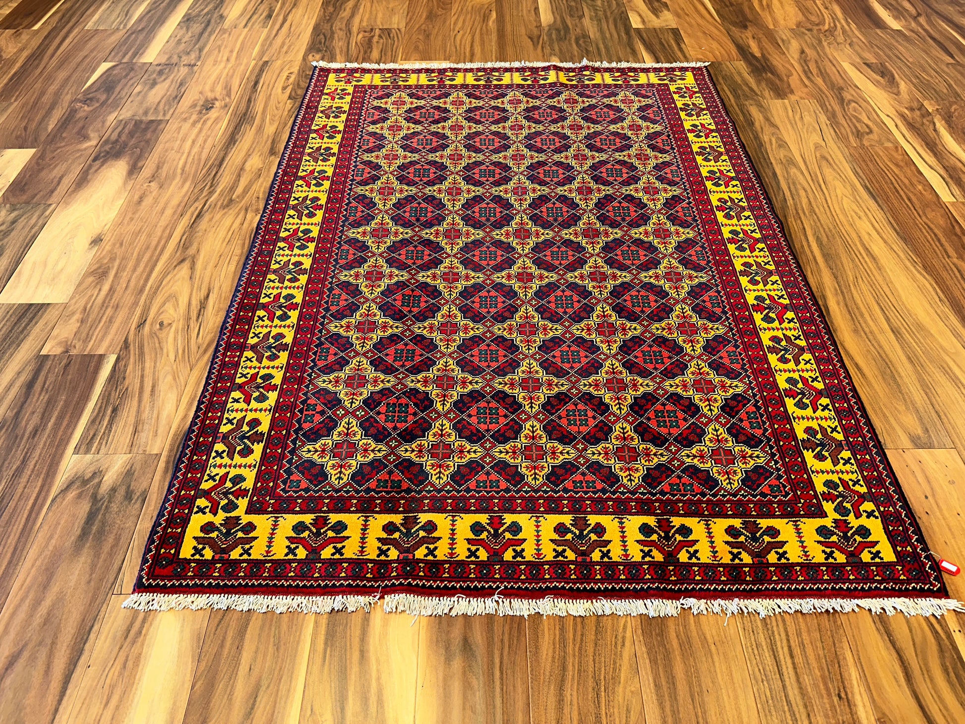 This vibrant rug features a striking lattice medallion pattern in red, navy, and yellow, set within a bold golden border. Each motif is carefully placed to create a rhythmic, balanced design, giving the rug a sense of regal symmetry and visual richness. The palette and precise patterning make this piece ideal for rooms that aim to blend energy with structure.