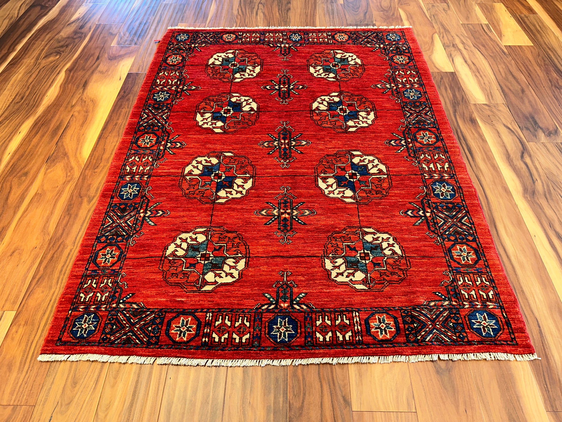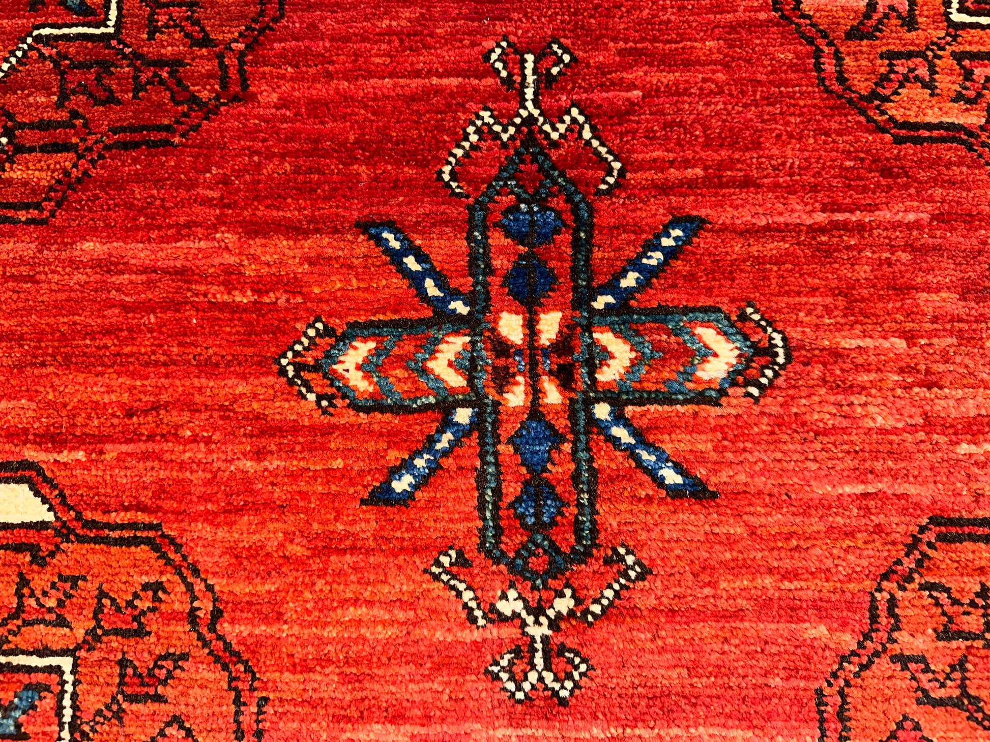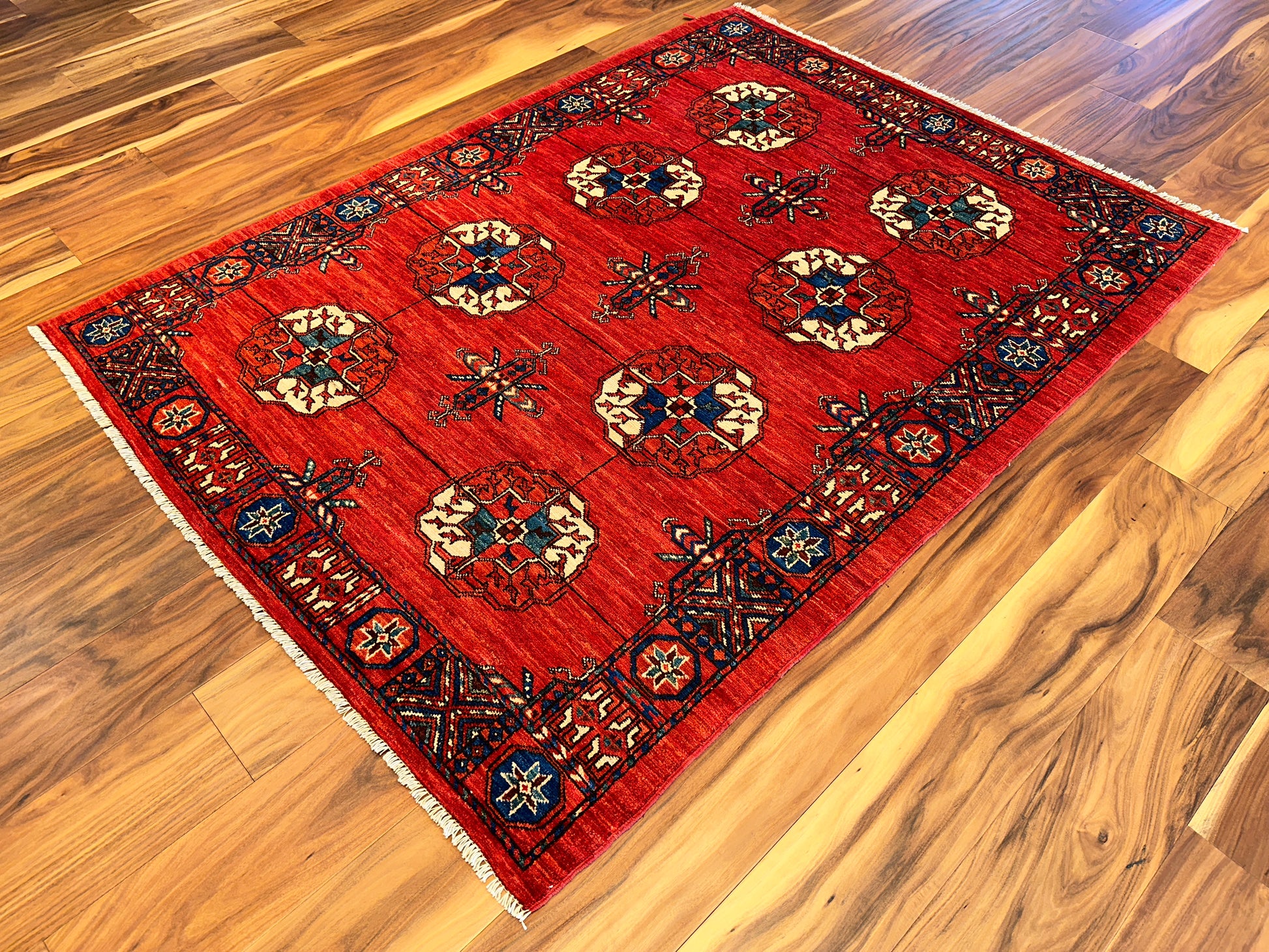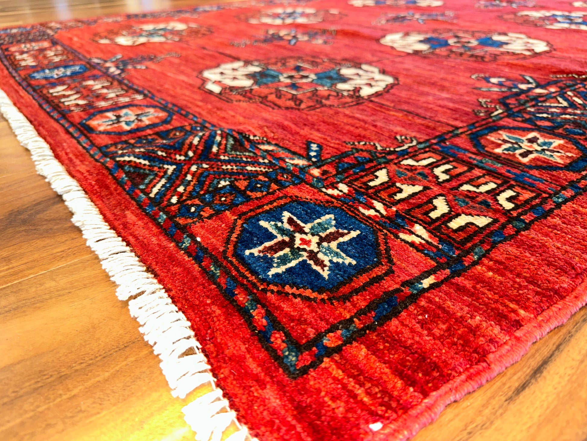 This vibrant handmade rug features a traditional Turkoman-inspired design, showcasing rows of octagonal guls set against a rich red ground. Accents of ivory, blue, and rust create a lively interplay of color, while the geometric floral border reinforces its tribal heritage. With its bold symmetry and saturated palette, this piece brings timeless charm to any space.