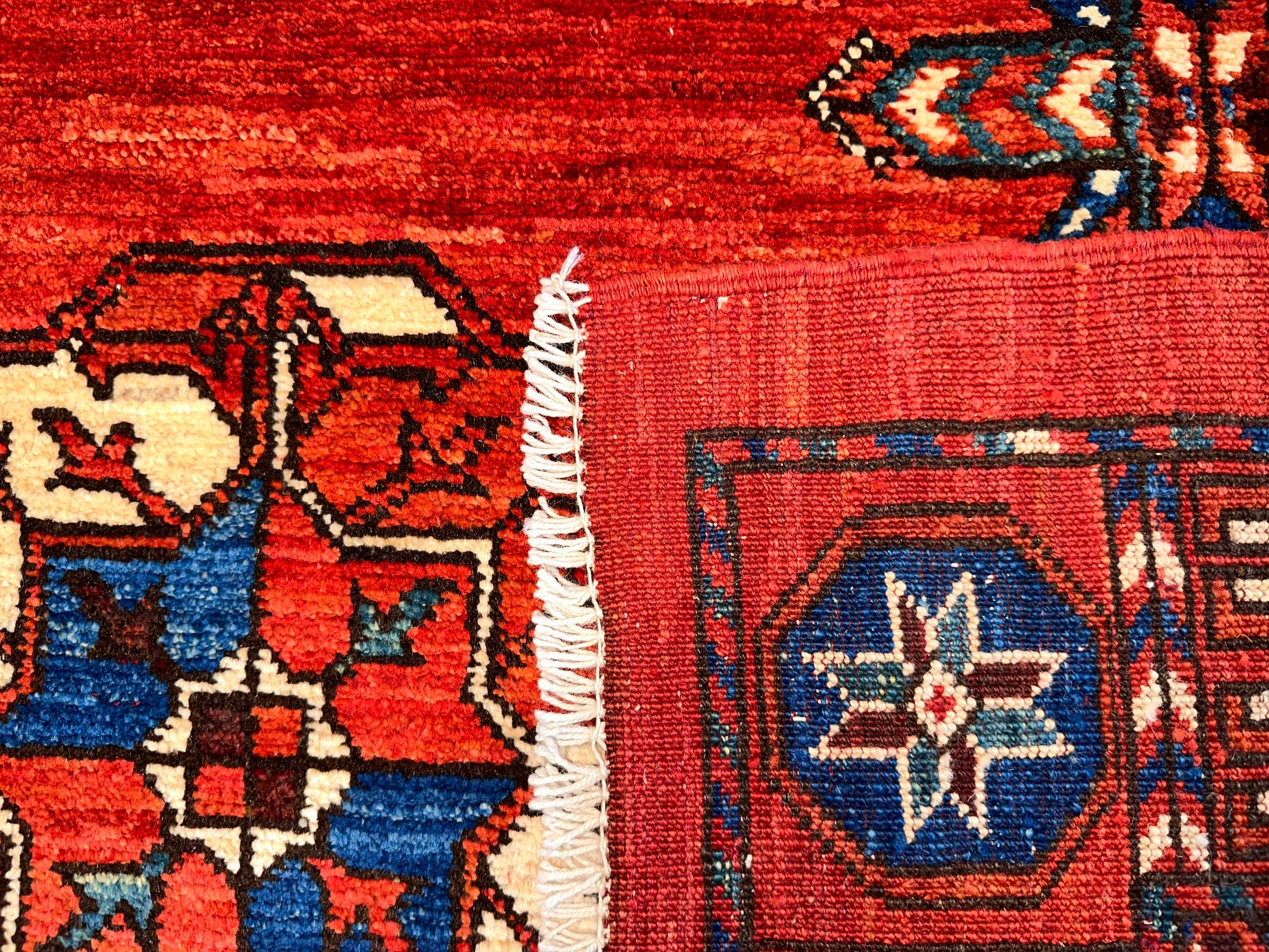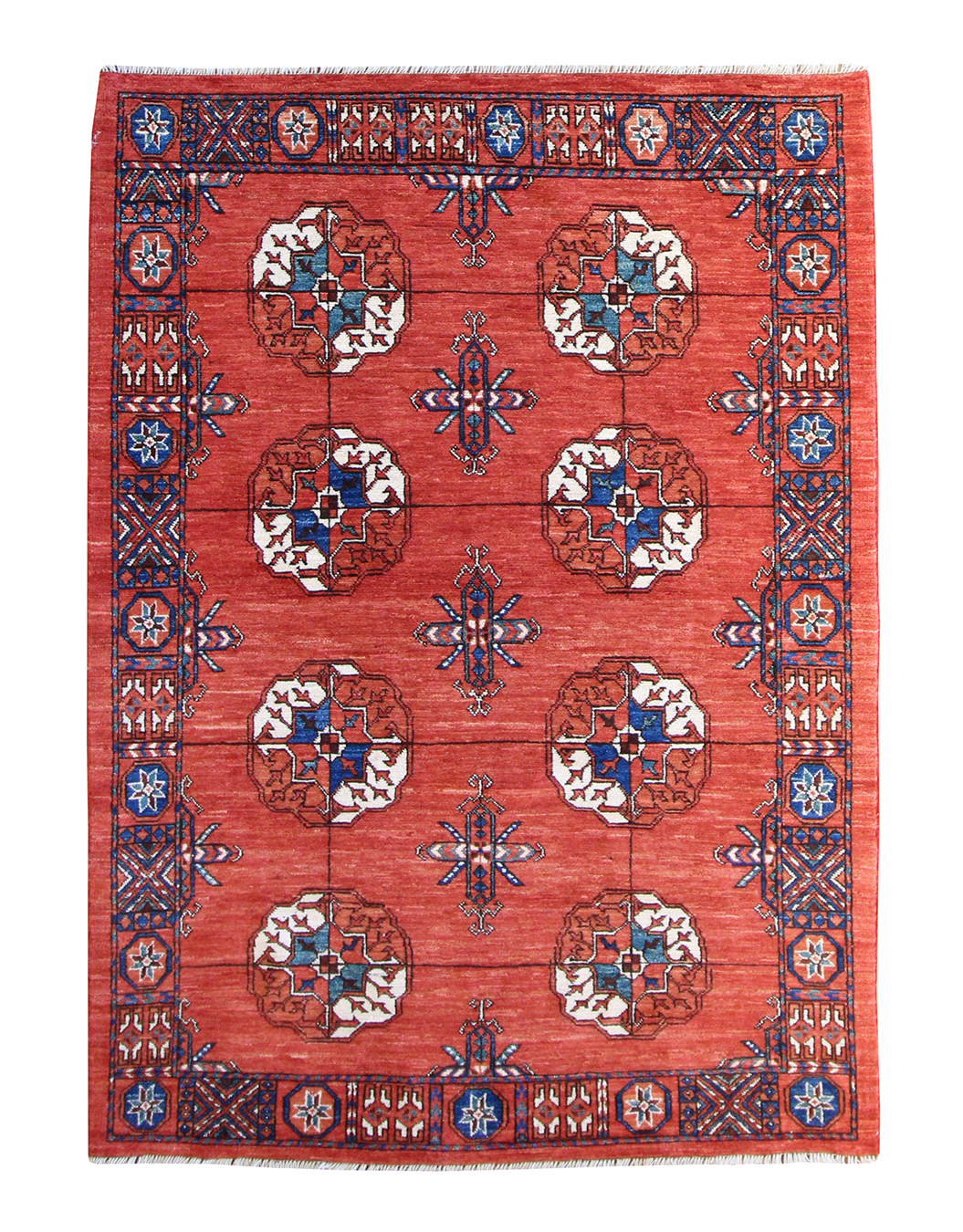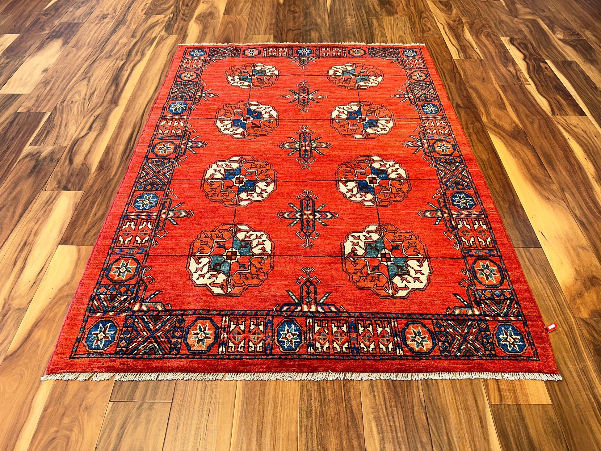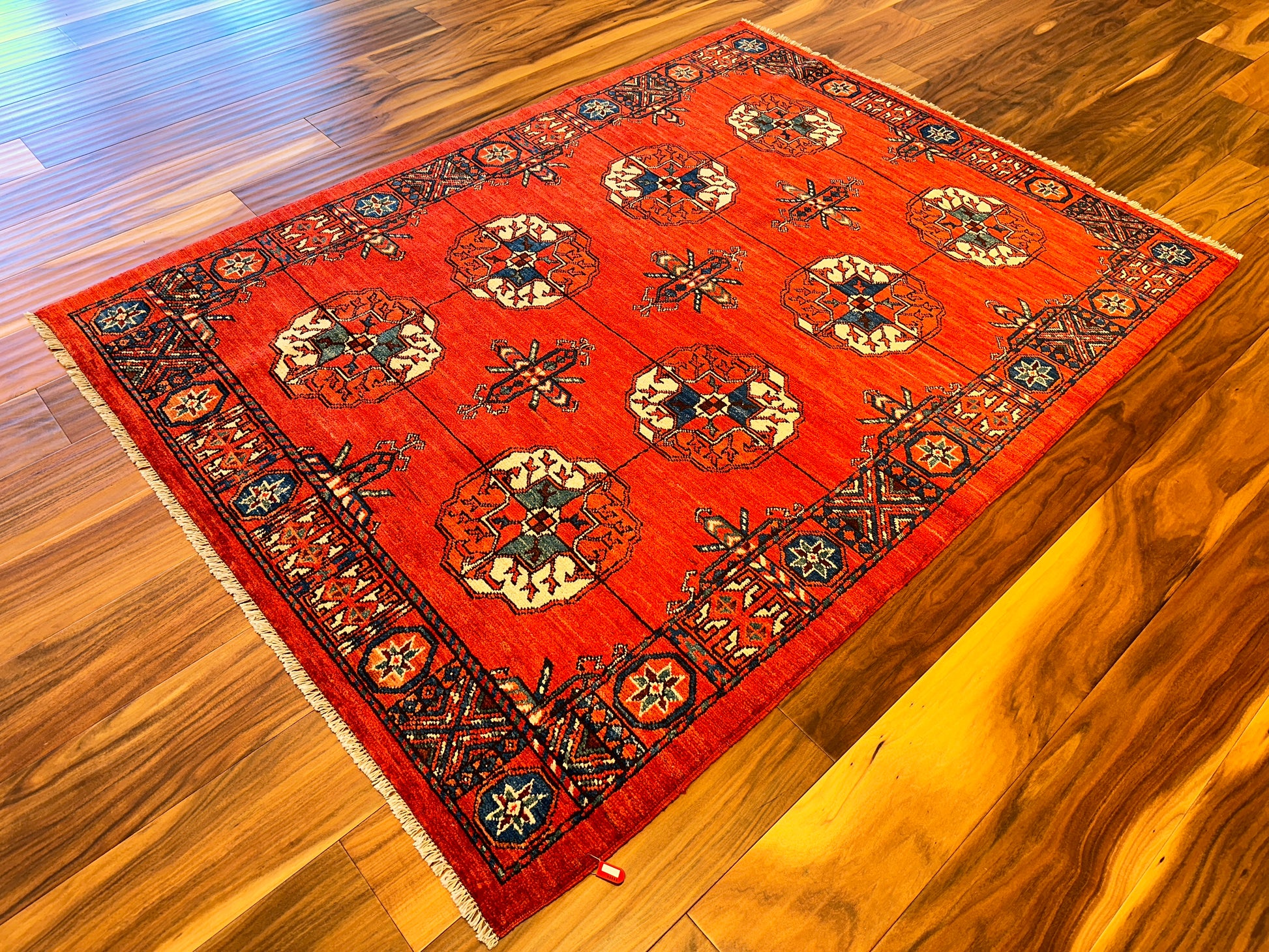 This vibrant handmade rug features a traditional Turkoman-inspired design, showcasing rows of octagonal guls set against a rich red ground. Accents of ivory, blue, and rust create a lively interplay of color, while the geometric floral border reinforces its tribal heritage. With its bold symmetry and saturated palette, this piece brings timeless charm to any space.