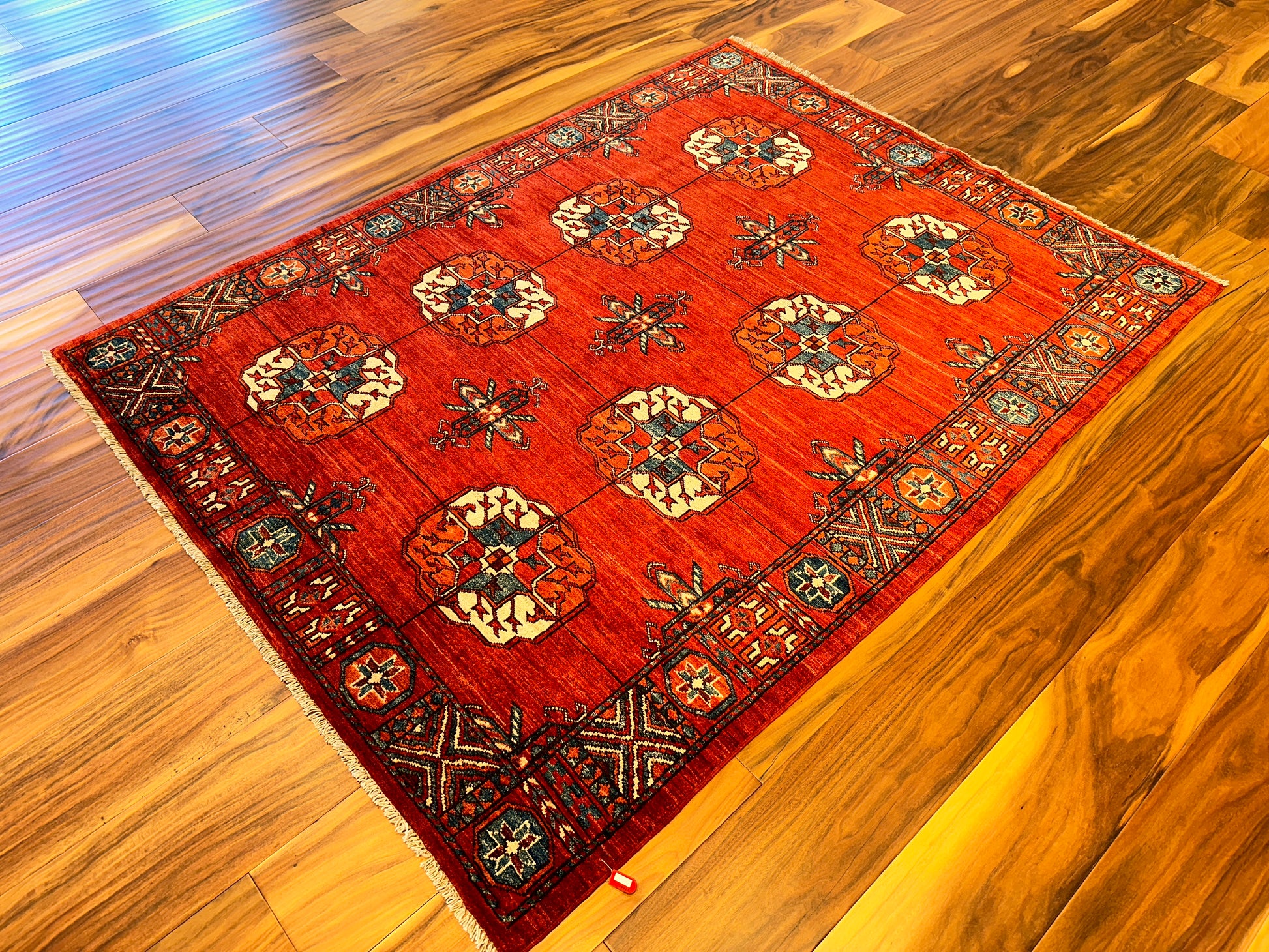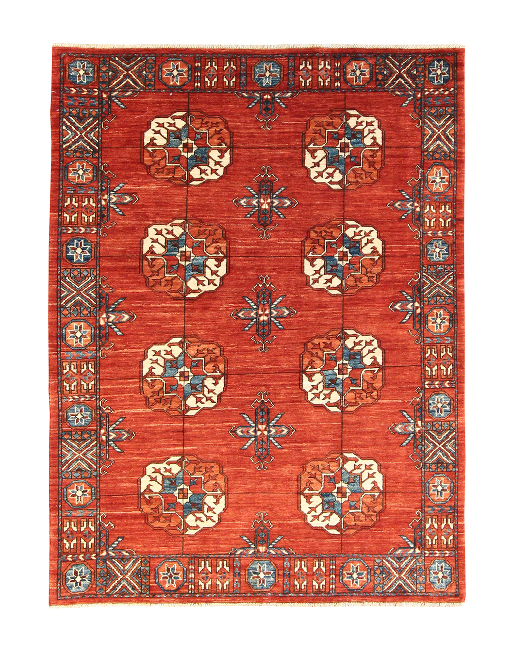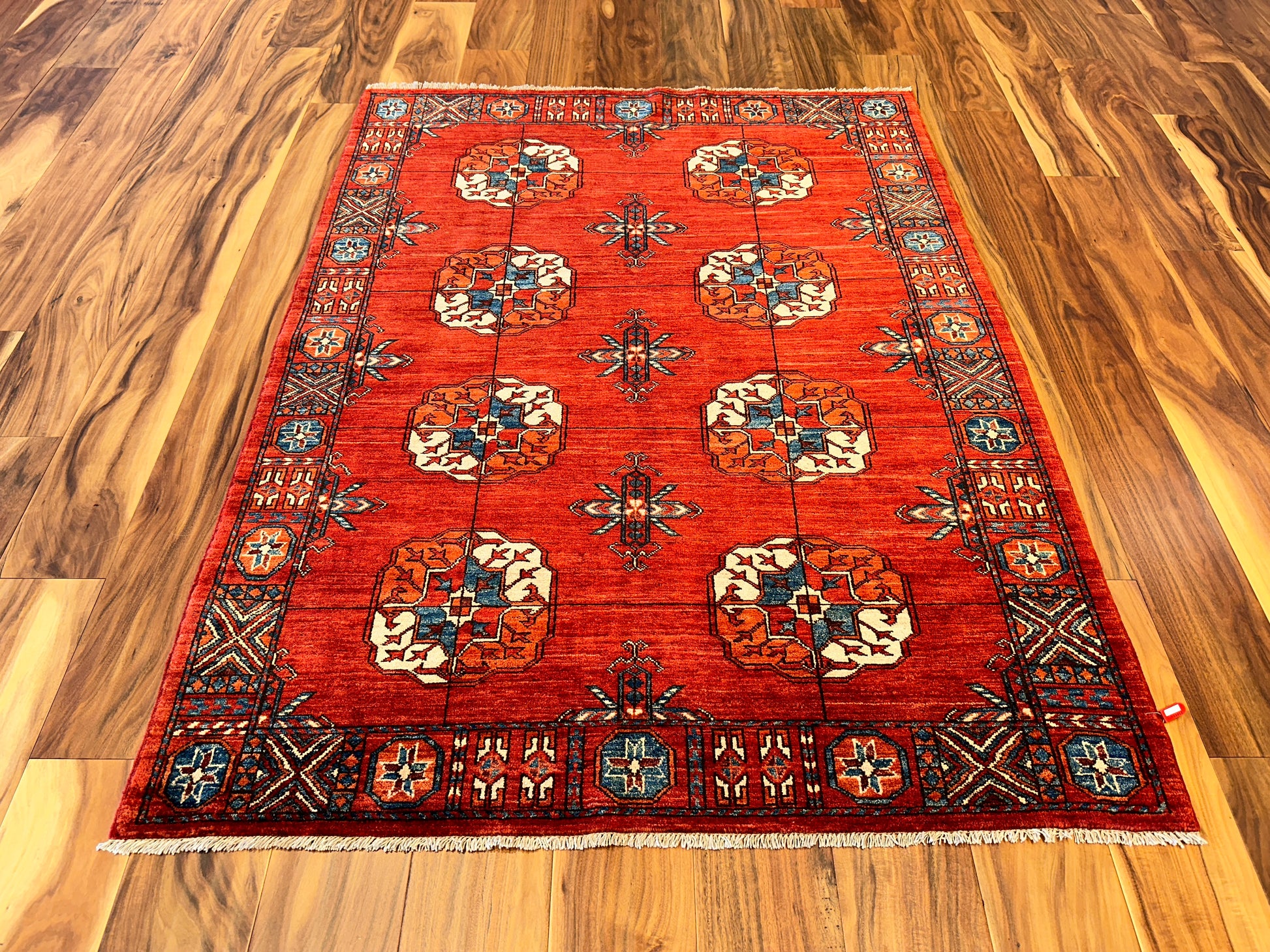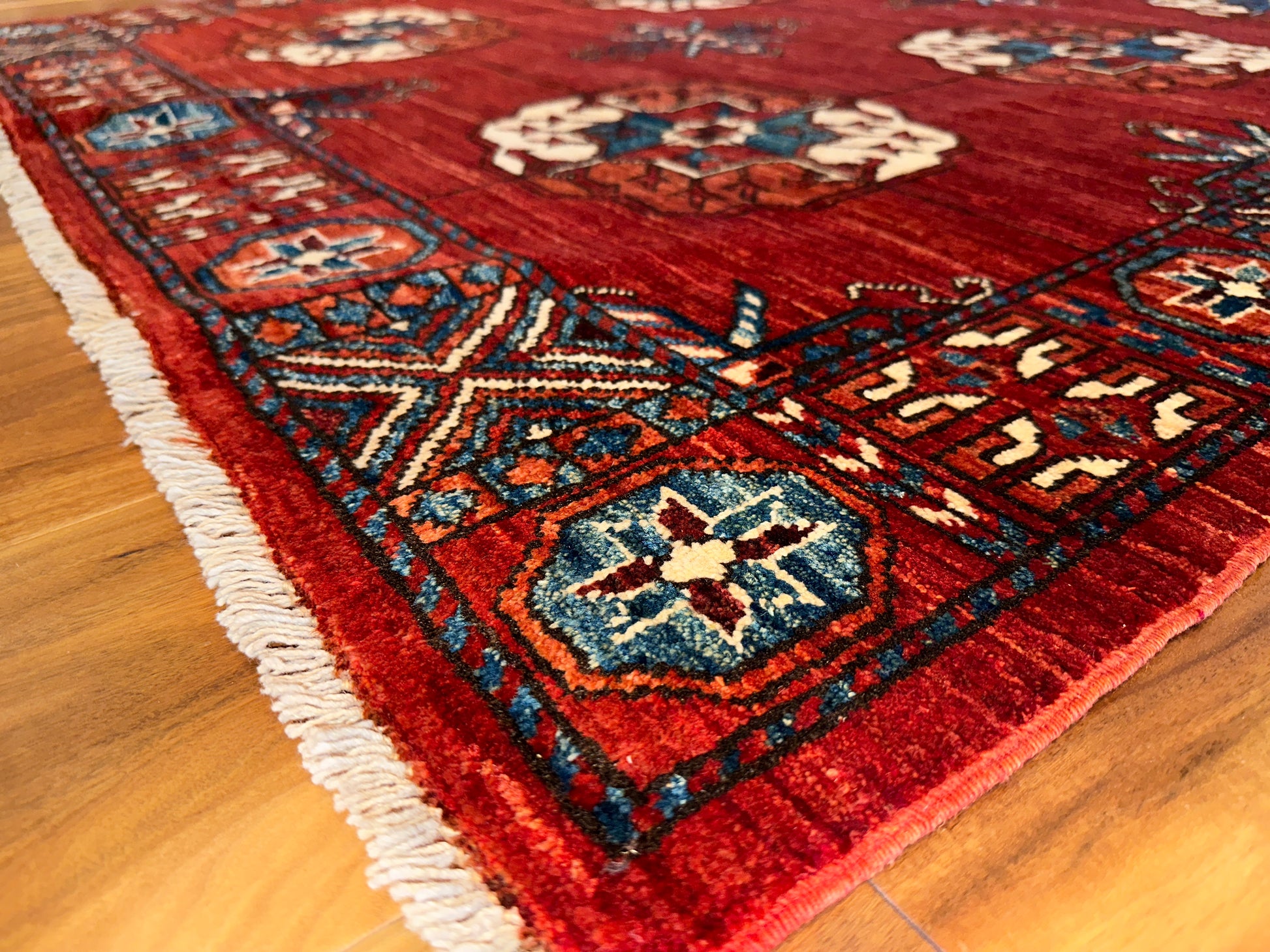 With its deep rust-red ground and bold gul medallions, this handmade wool rug brings a timeless tribal spirit to any space. The symmetrical layout of ivory, terracotta, and blue motifs creates a striking contrast against the rich field, framed by intricate geometric borders. A classic design that balances strength and clarity, this rug feels both grounded and vibrant.
