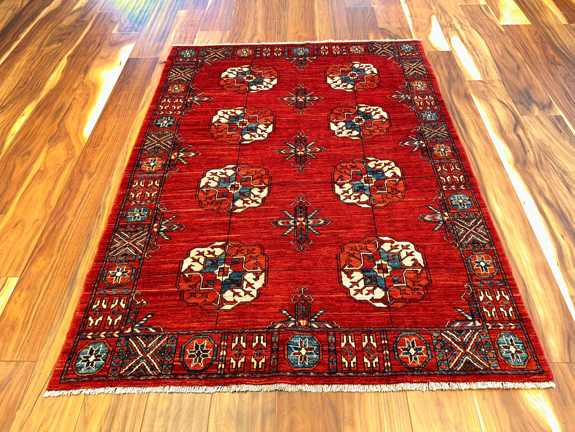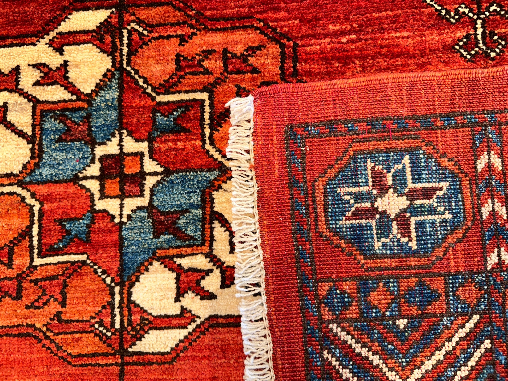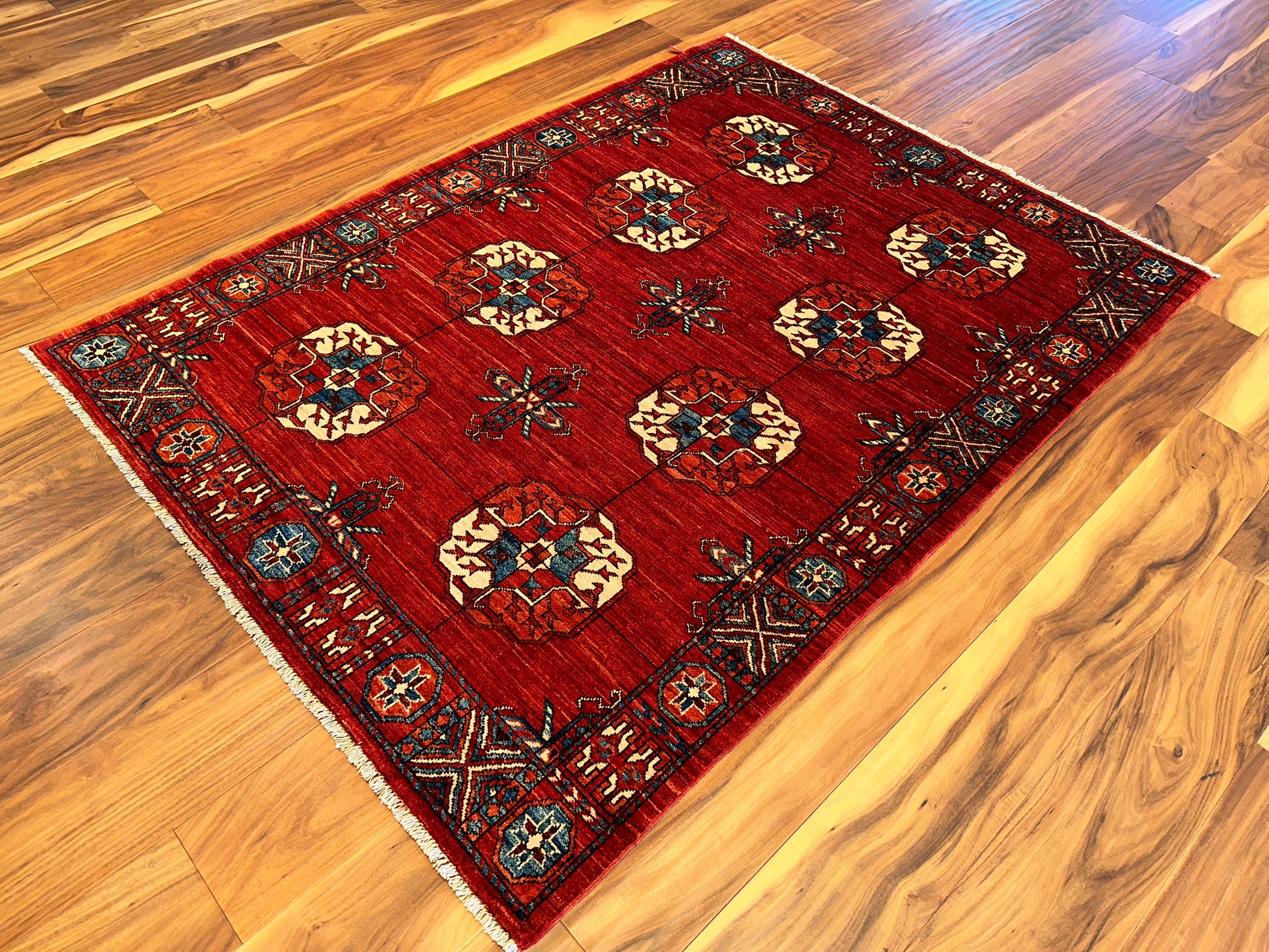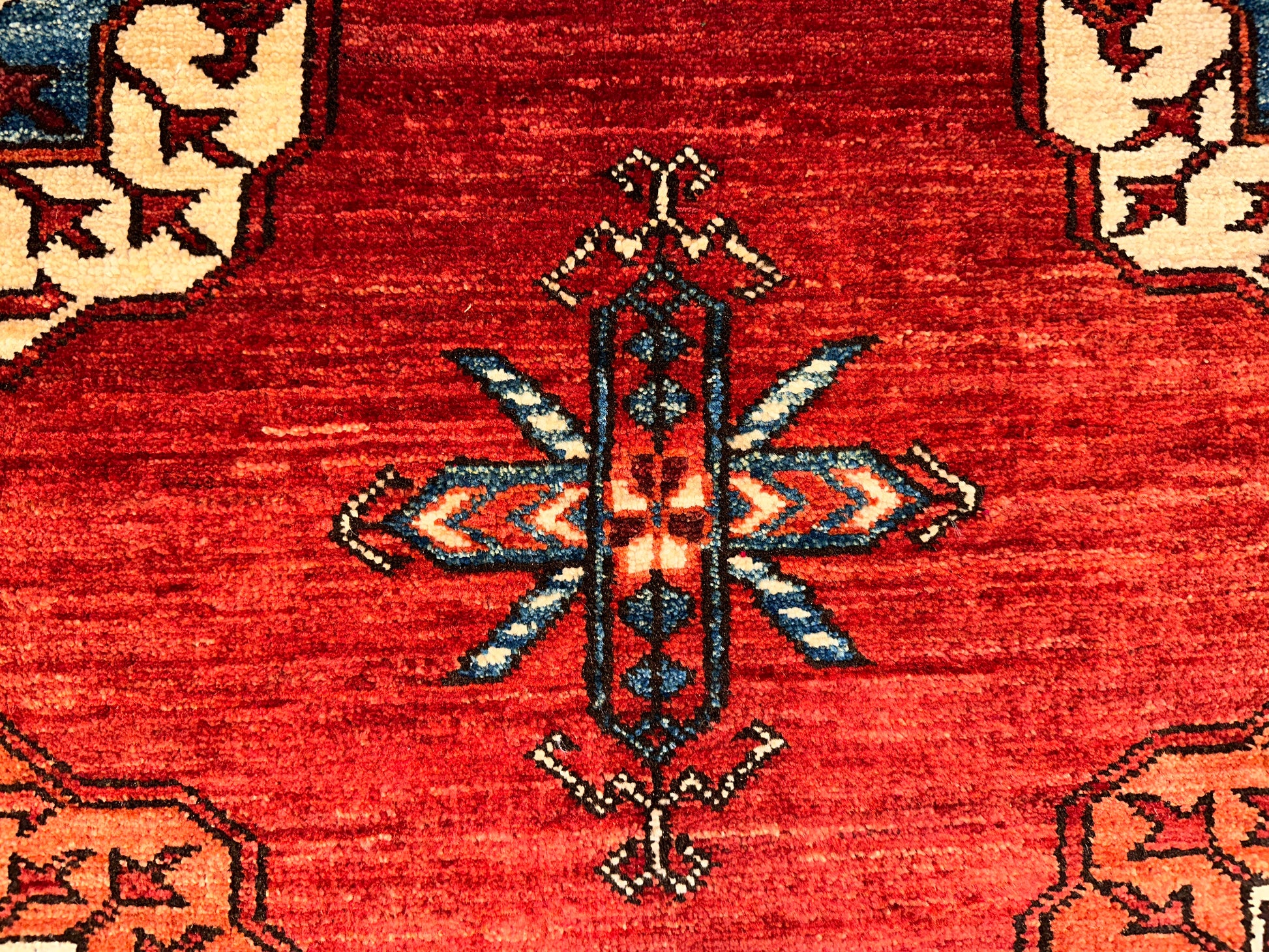 With its deep rust-red ground and bold gul medallions, this handmade wool rug brings a timeless tribal spirit to any space. The symmetrical layout of ivory, terracotta, and blue motifs creates a striking contrast against the rich field, framed by intricate geometric borders. A classic design that balances strength and clarity, this rug feels both grounded and vibrant.