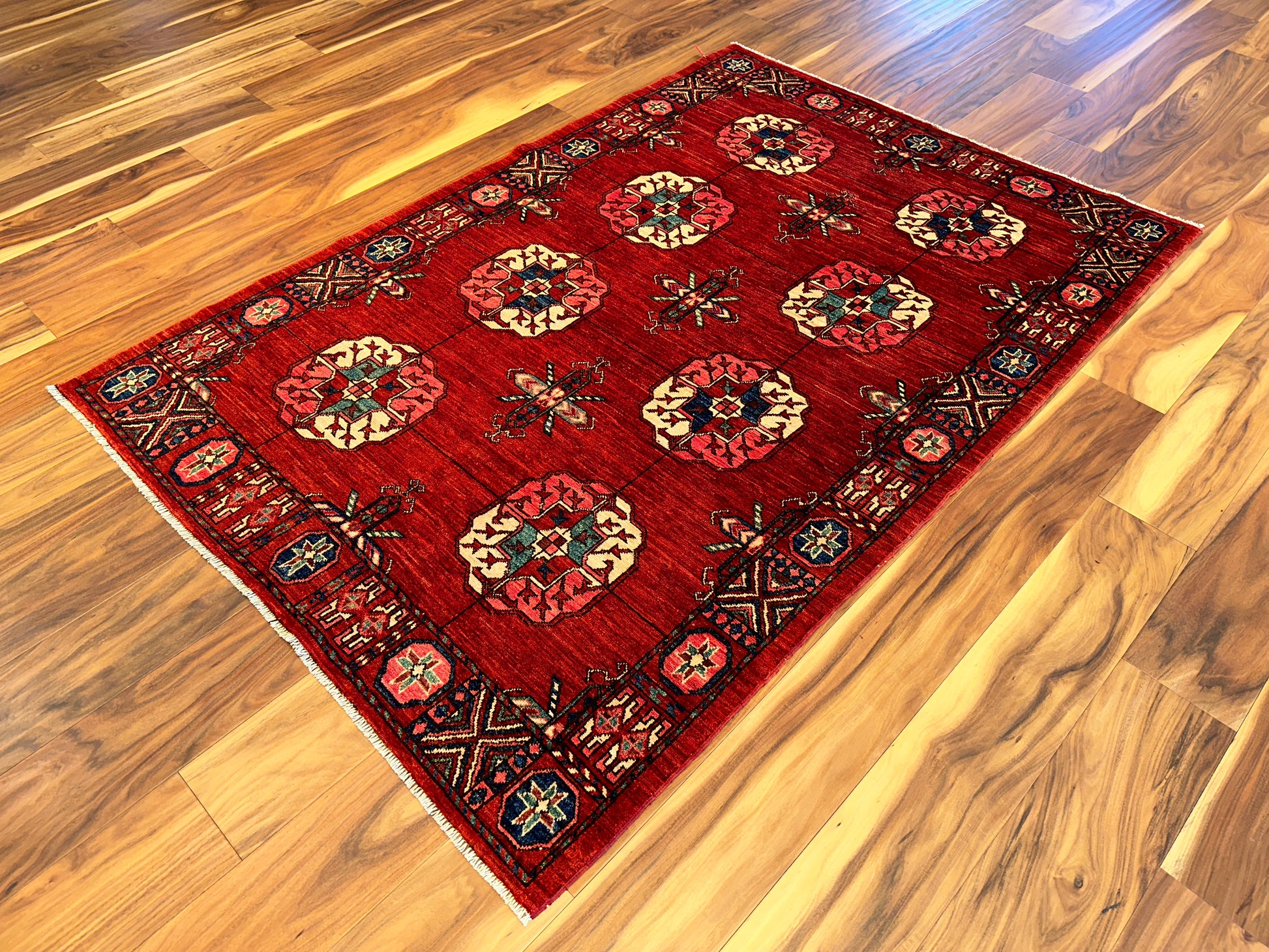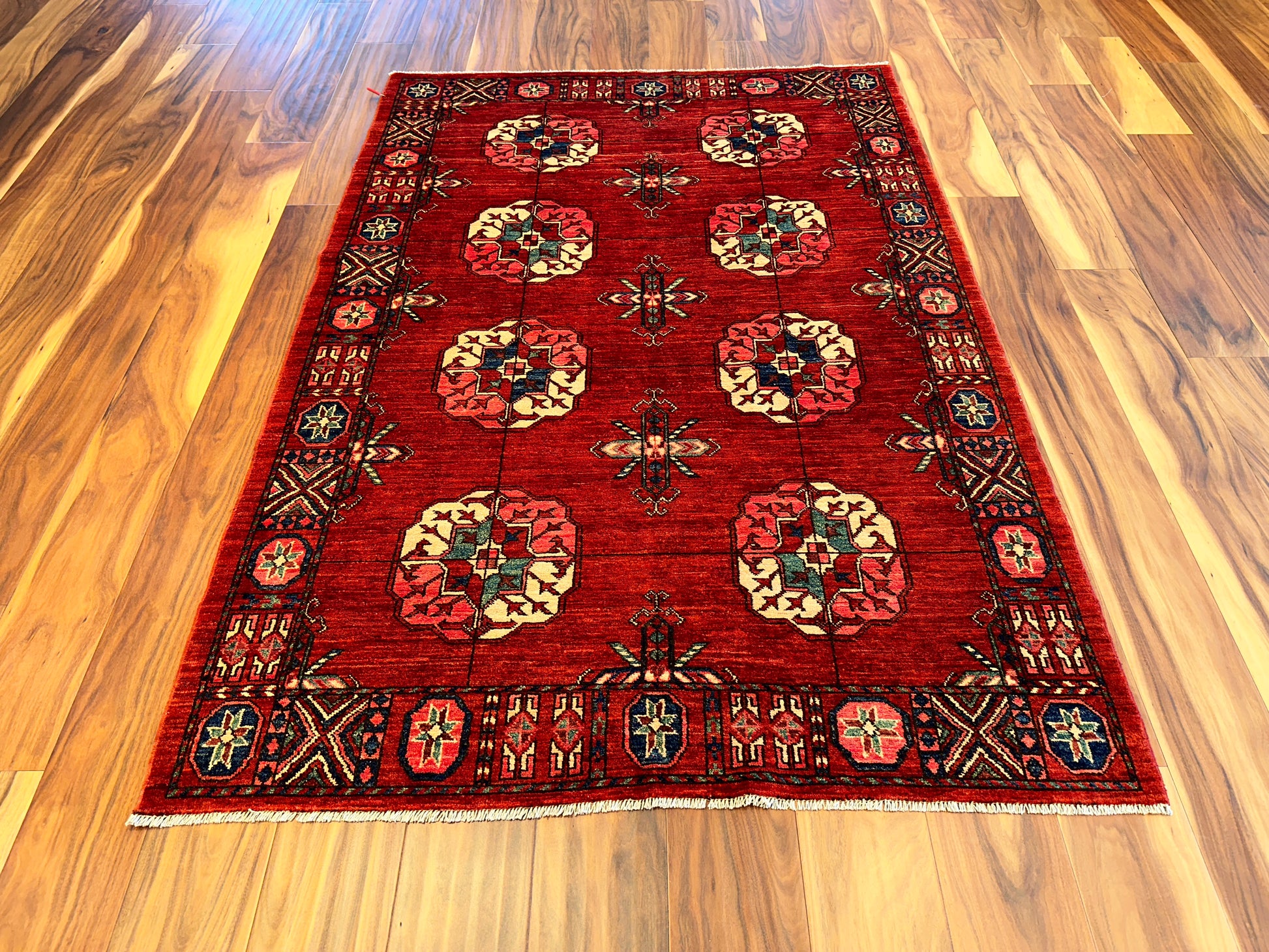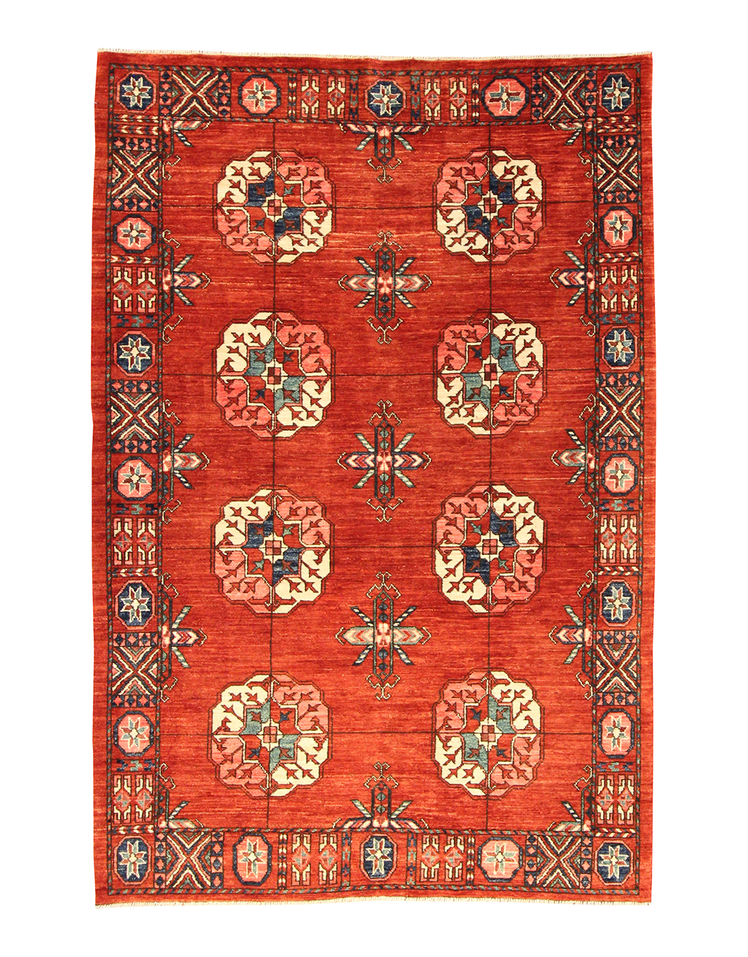 - Design: Repeating gul medallions with geometric border
