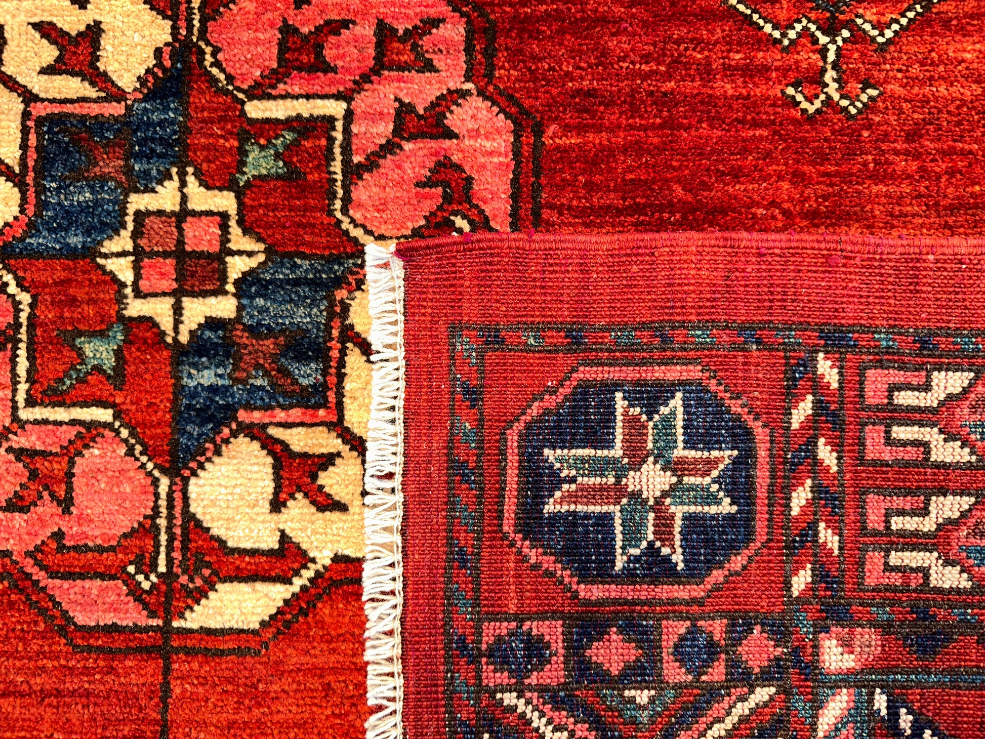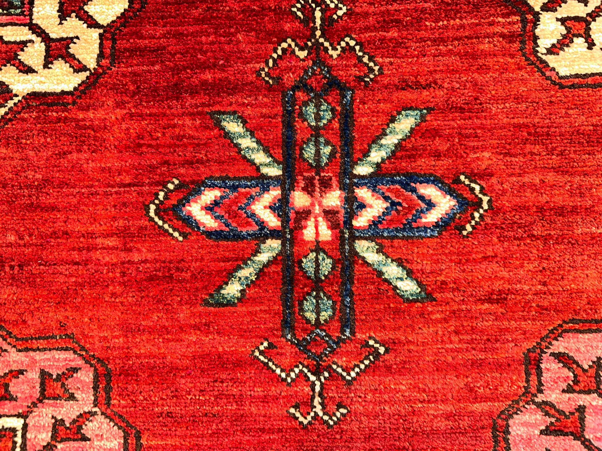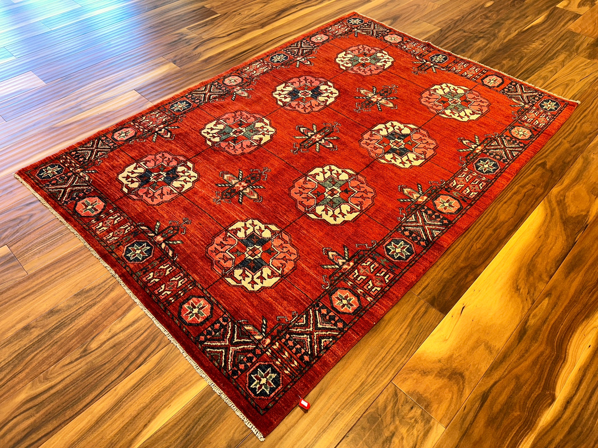 - Design: Repeating gul medallions with geometric border