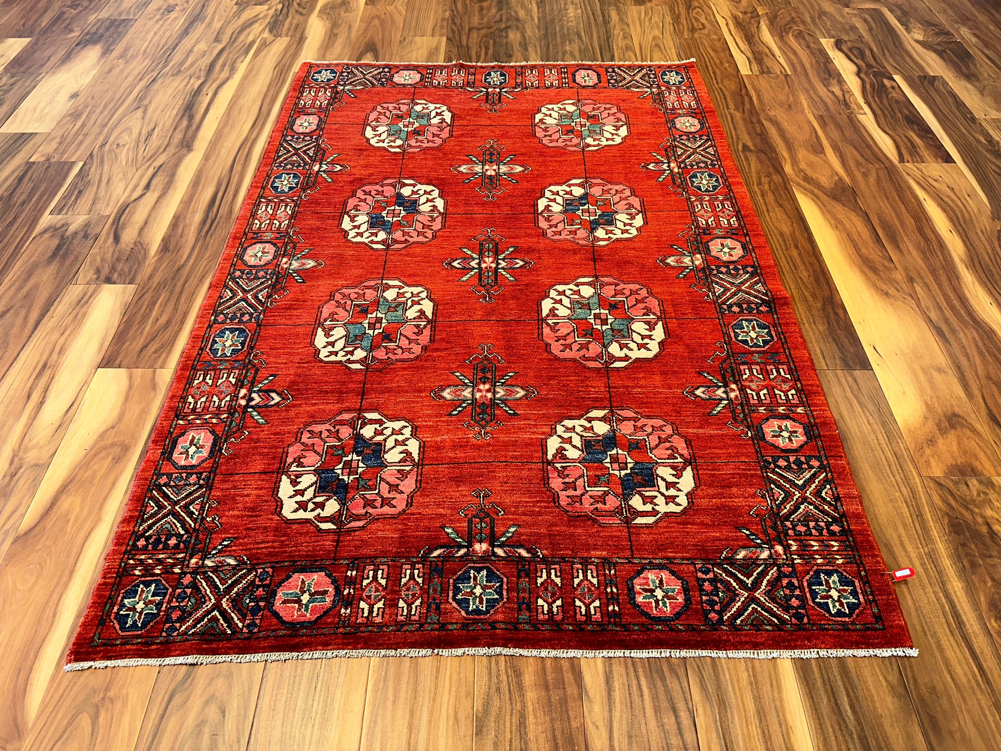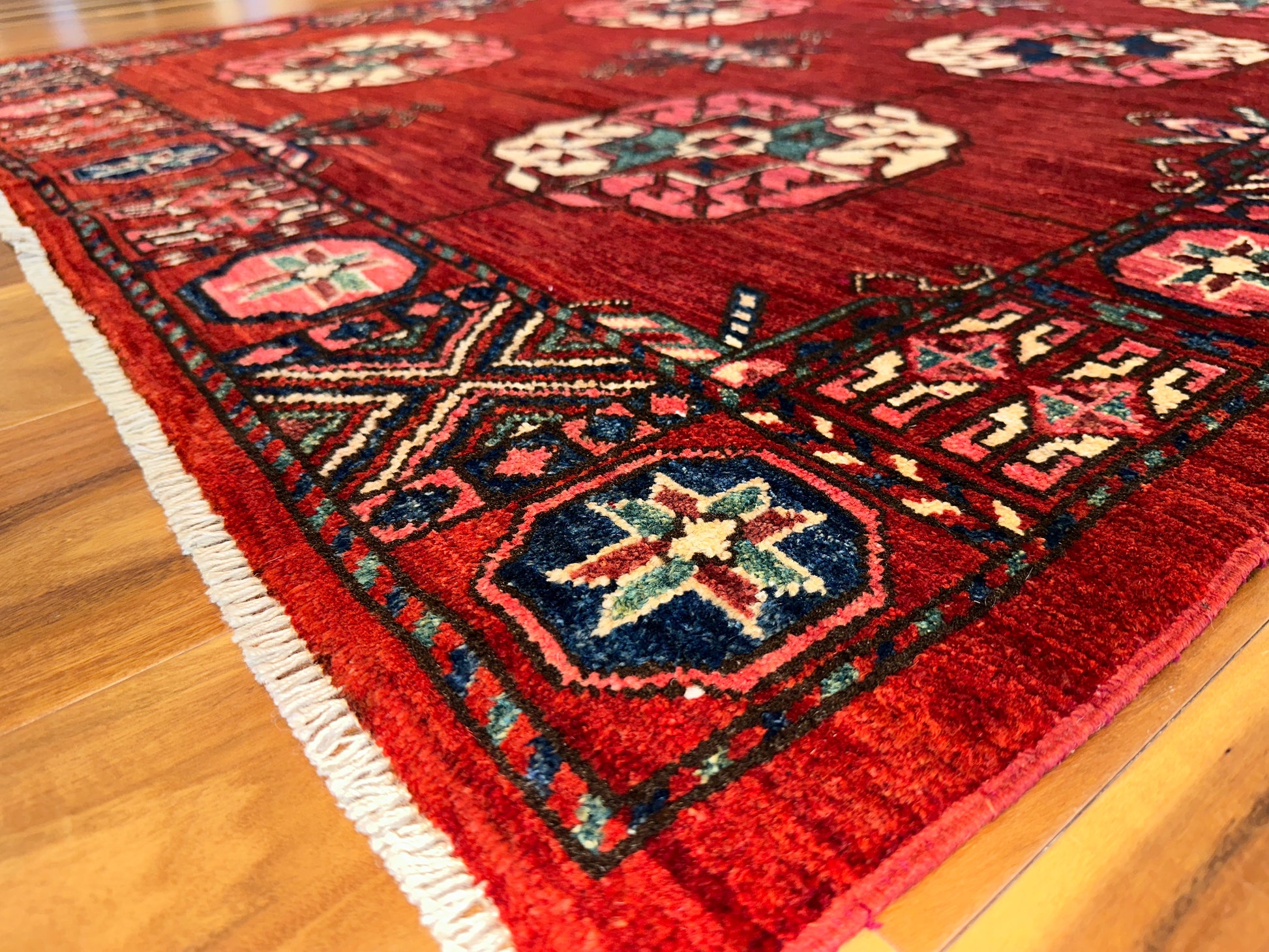 This handmade rug features a vivid red field adorned with large, soft-edged gul medallions in ivory, coral, and teal. The intricate border of navy and red geometric motifs frames the composition with striking balance, offering a classic Turkmen aesthetic elevated by bold color contrast and rhythmic symmetry.