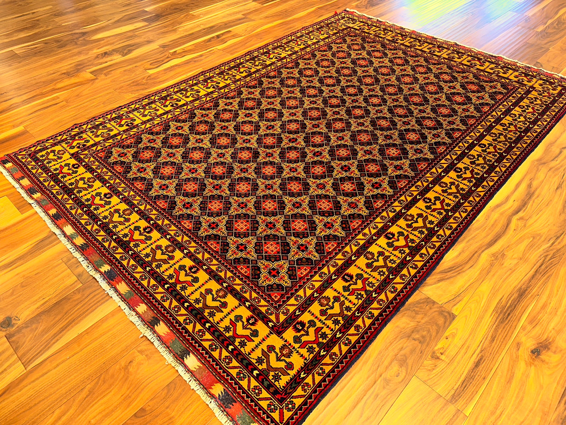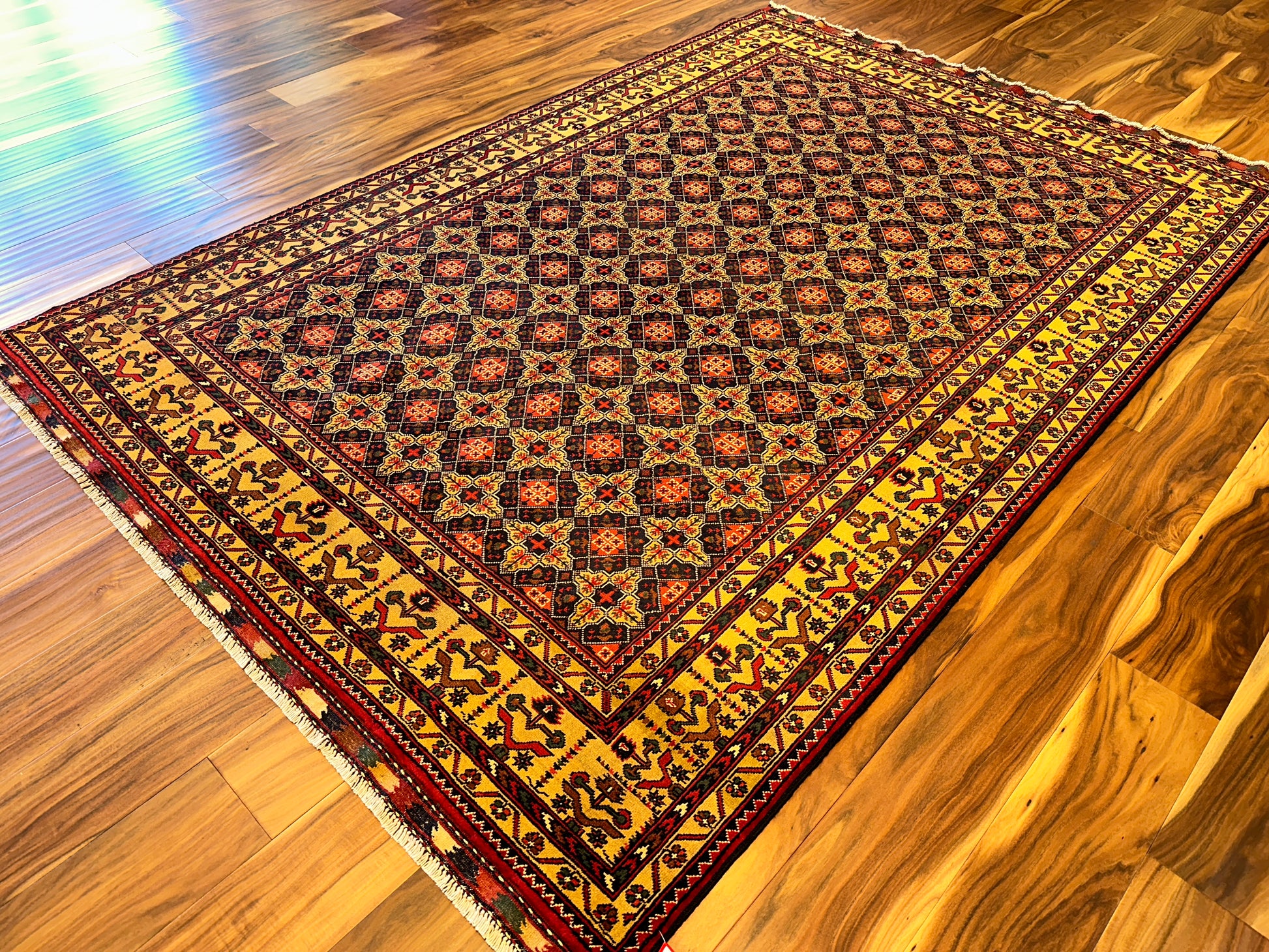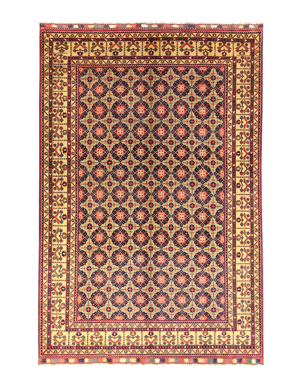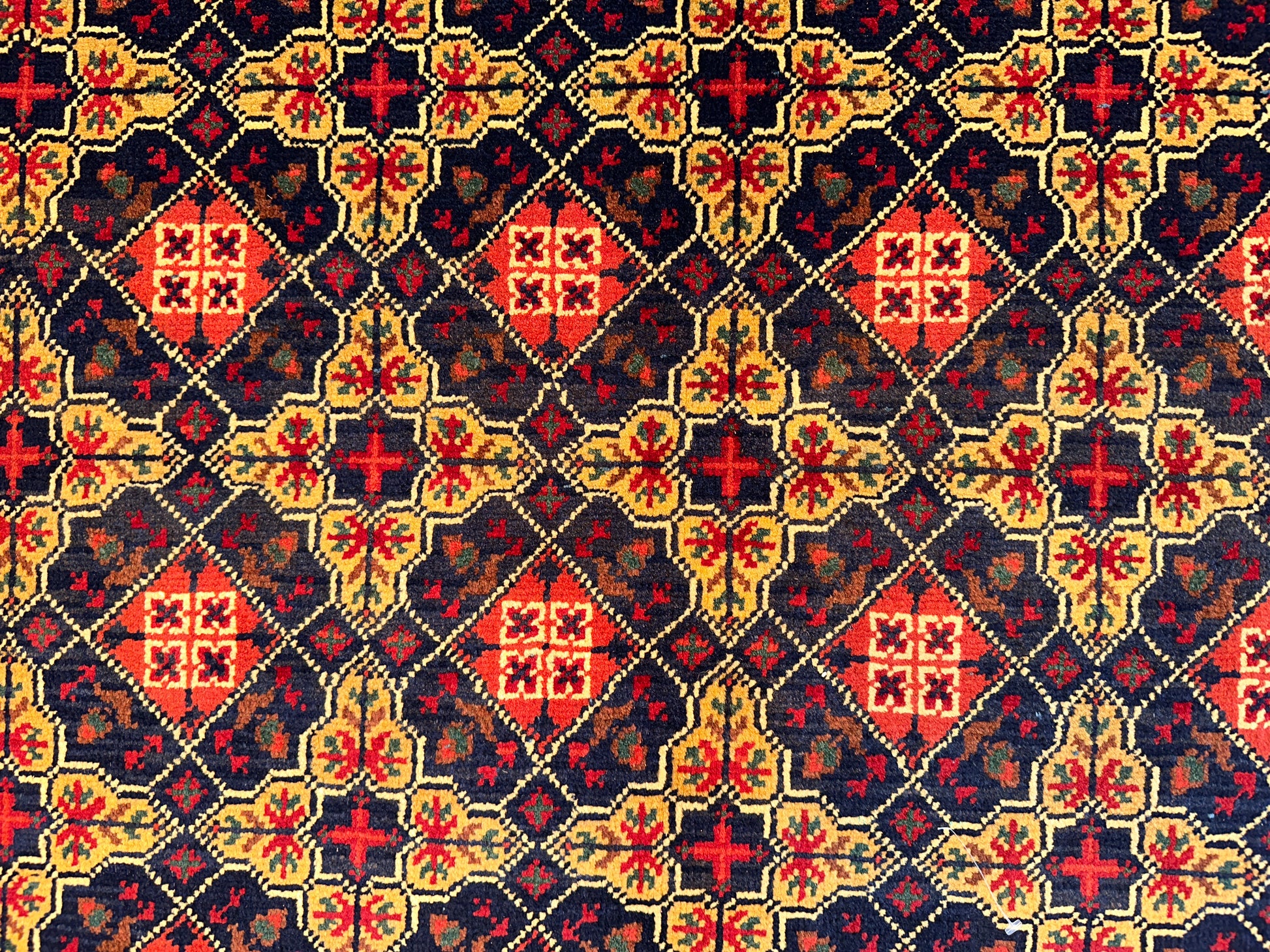 Bright and intricate, this hand-knotted rug features a dense lattice of stylized rosettes and cross motifs set against a deep red and navy field. Framed by wide golden-yellow borders with playful tribal accents, the pattern feels both structured and full of life. A compelling balance of color and geometry rooted in traditional design.