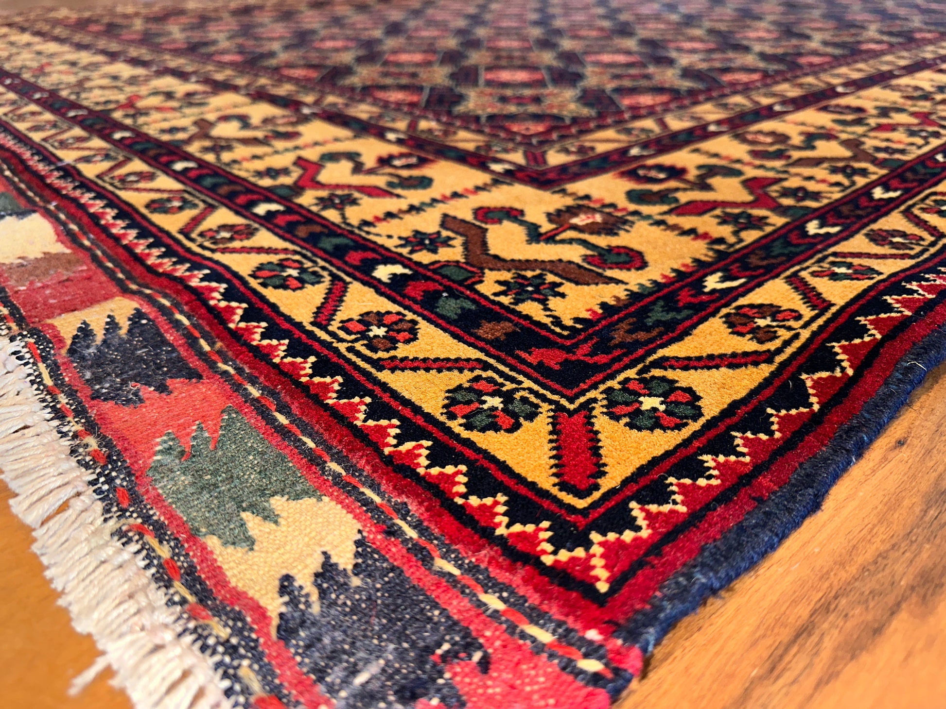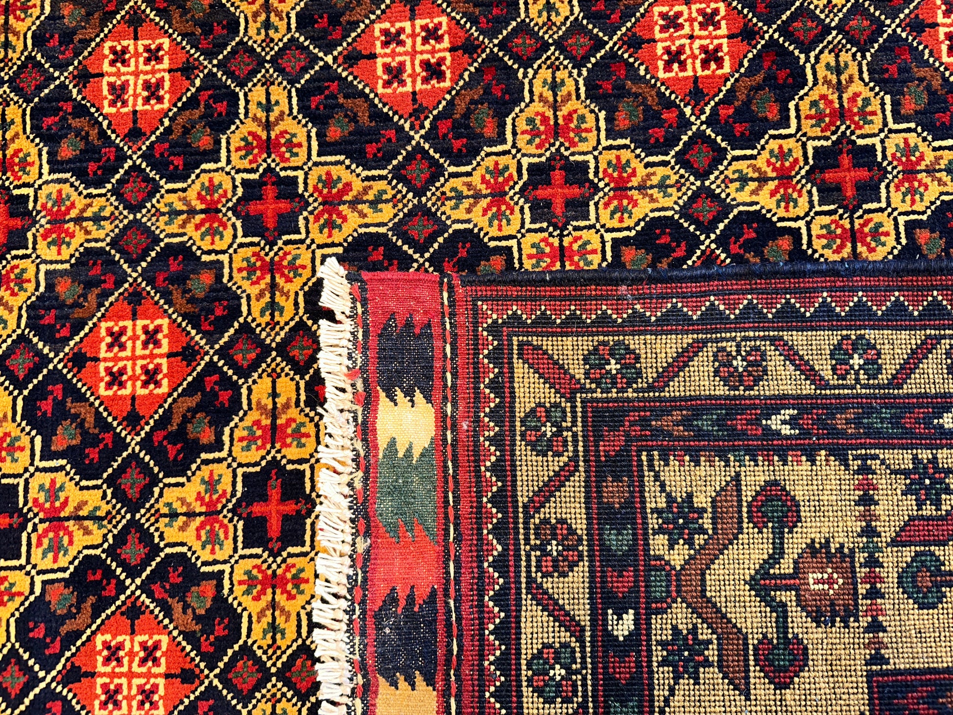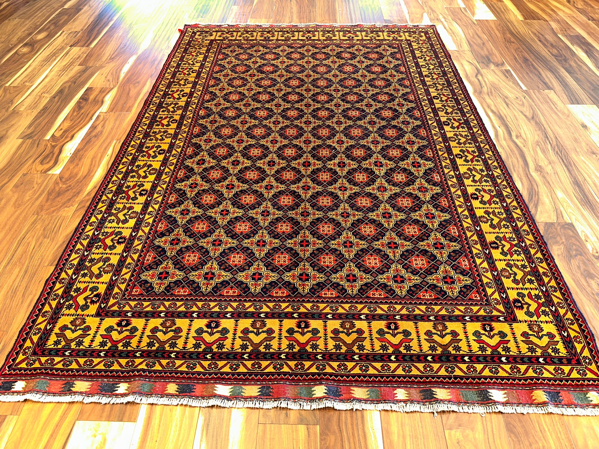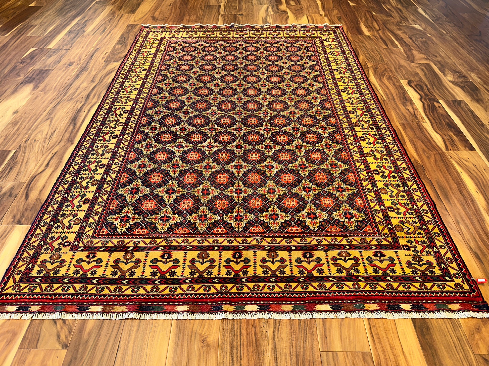 Bright and intricate, this hand-knotted rug features a dense lattice of stylized rosettes and cross motifs set against a deep red and navy field. Framed by wide golden-yellow borders with playful tribal accents, the pattern feels both structured and full of life. A compelling balance of color and geometry rooted in traditional design.