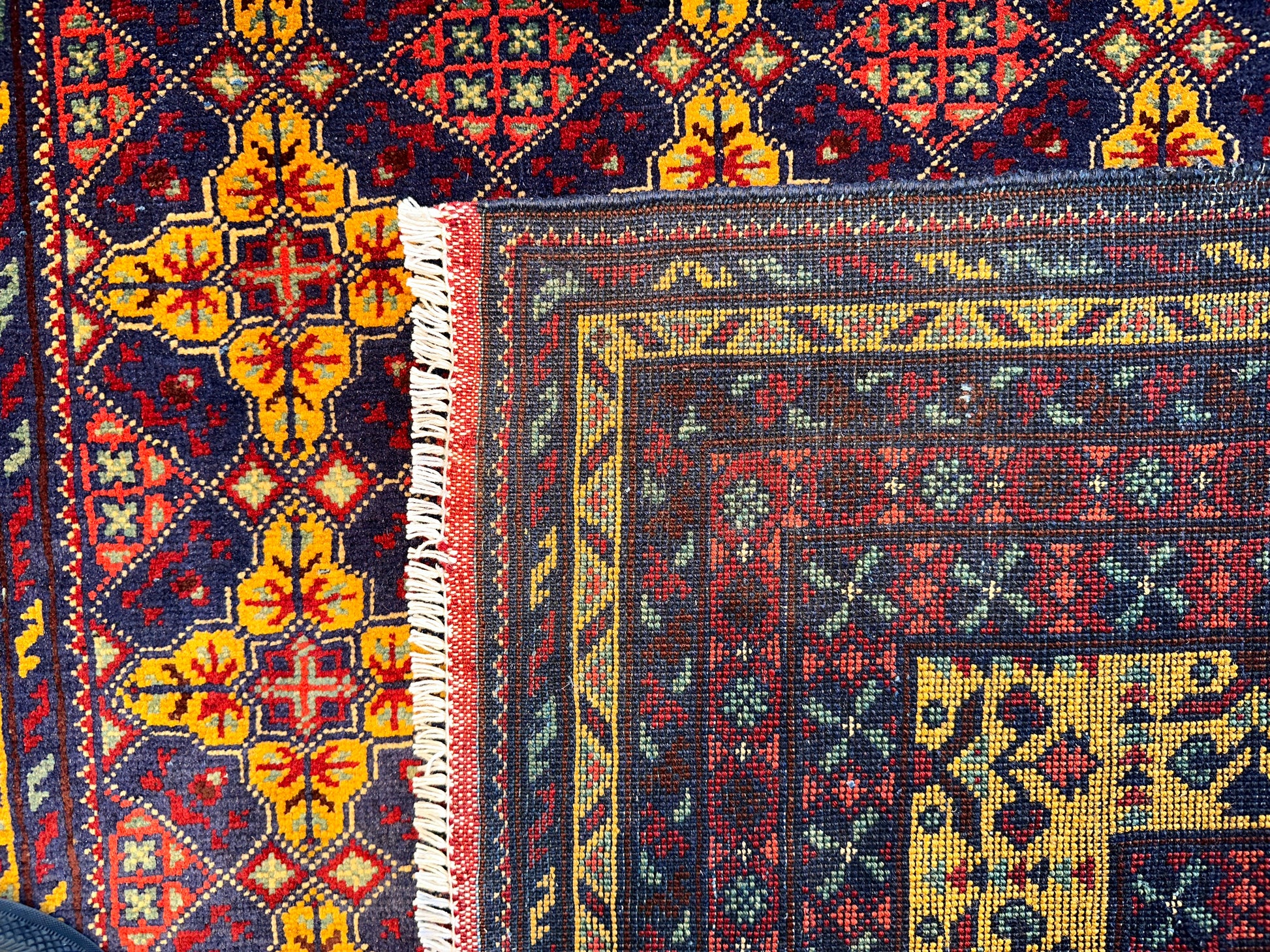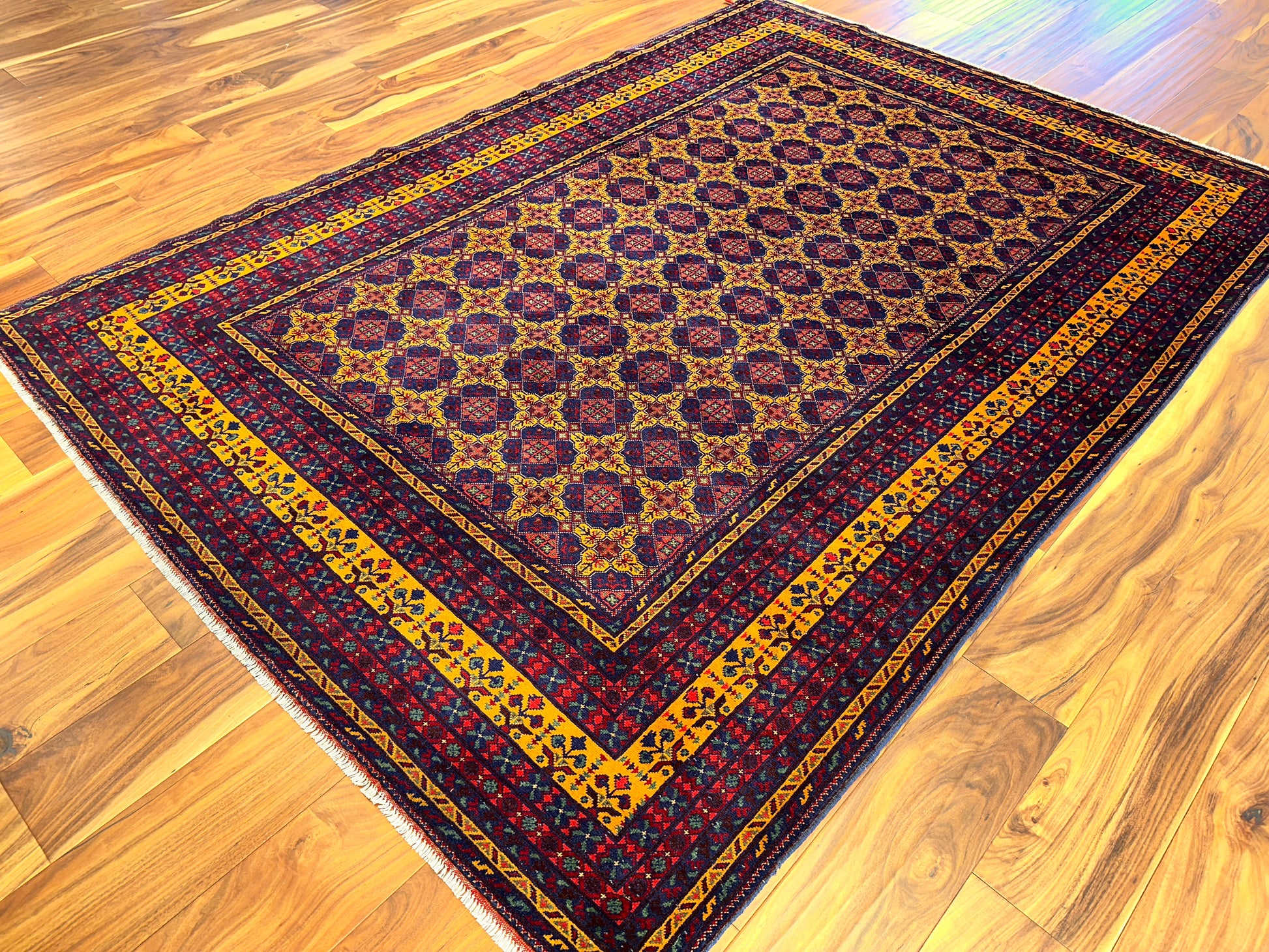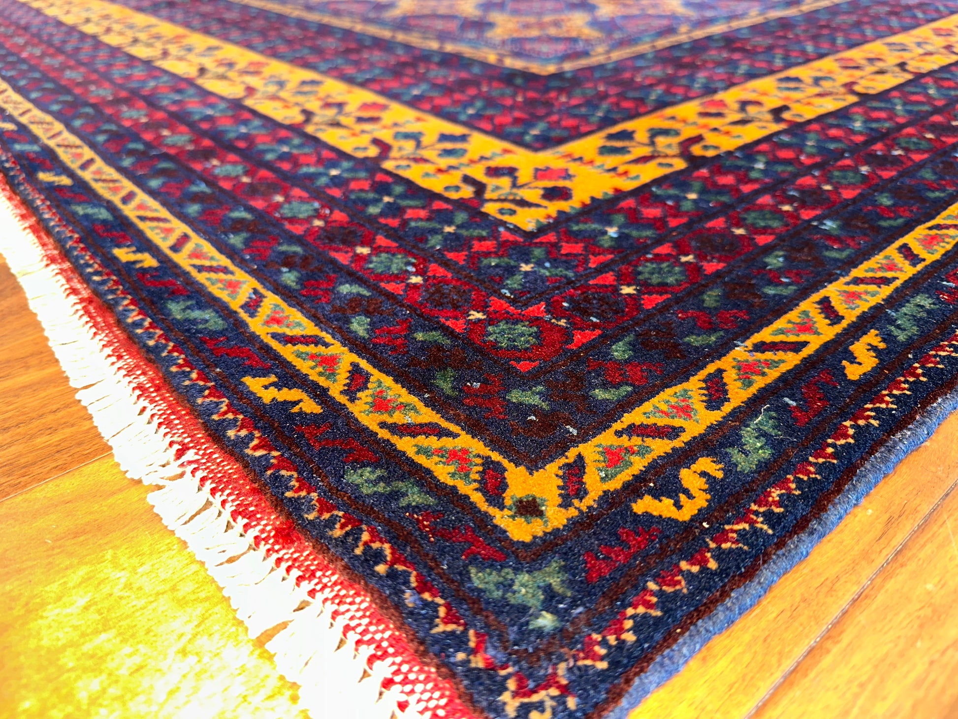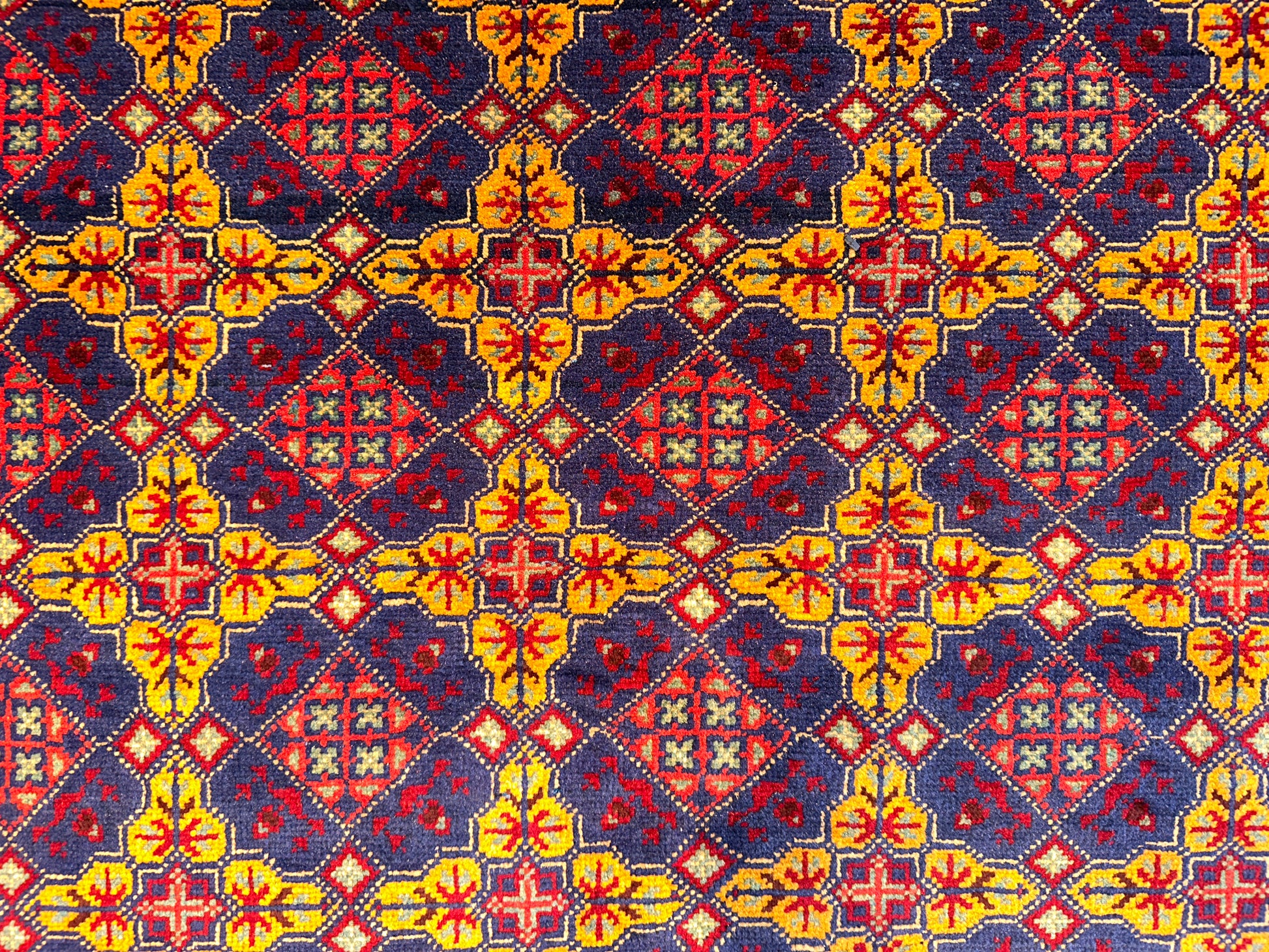 Graphic and vibrant, this hand-knotted rug features a lattice of repeating medallions in rich red and navy, accented by golden yellow flourishes that bring the pattern to life. The layered borders mirror the geometric rhythm of the field, creating a strong frame with folkloric charm. Its vivid palette and sharp symmetry make it a bold centerpiece.