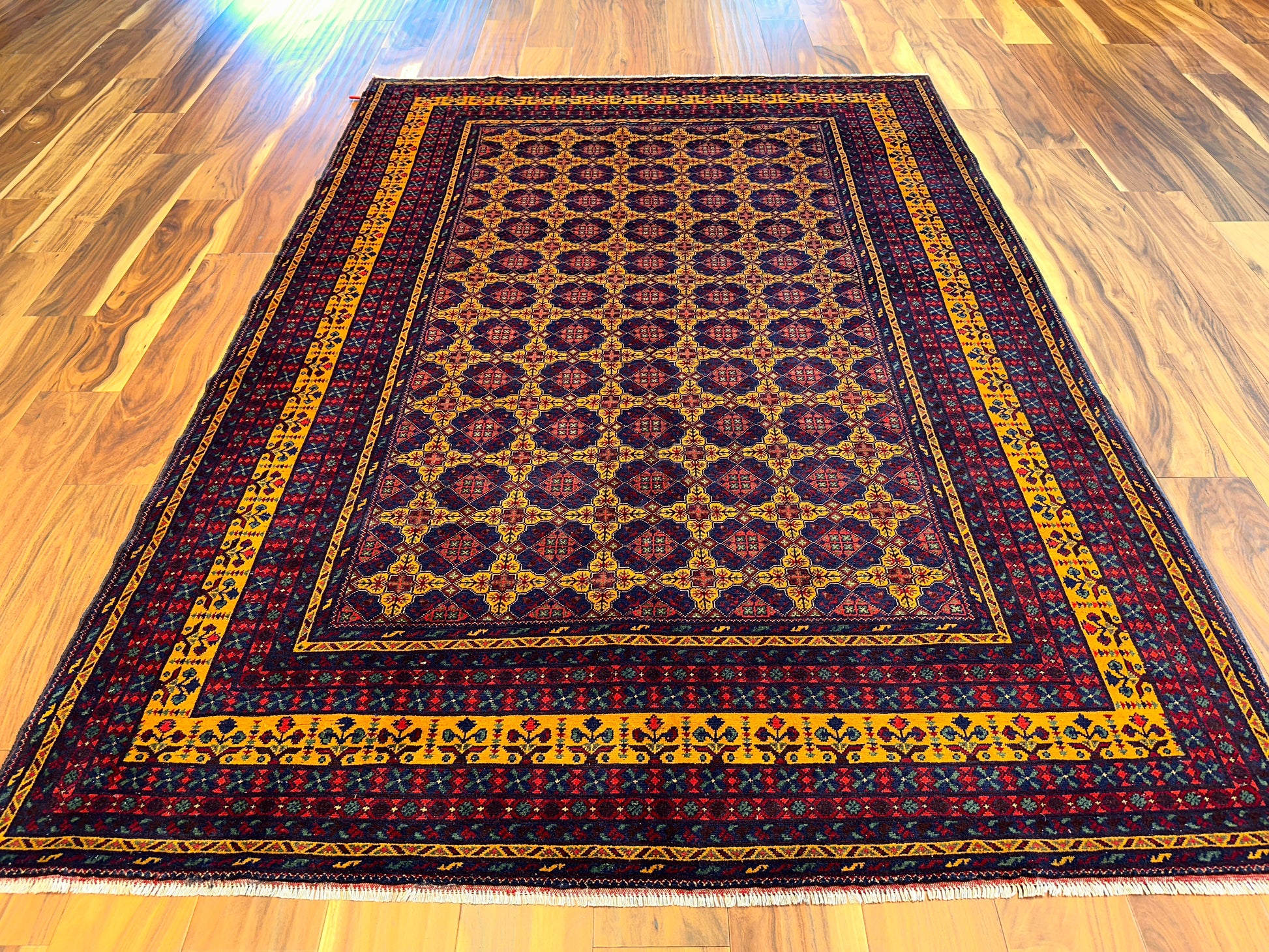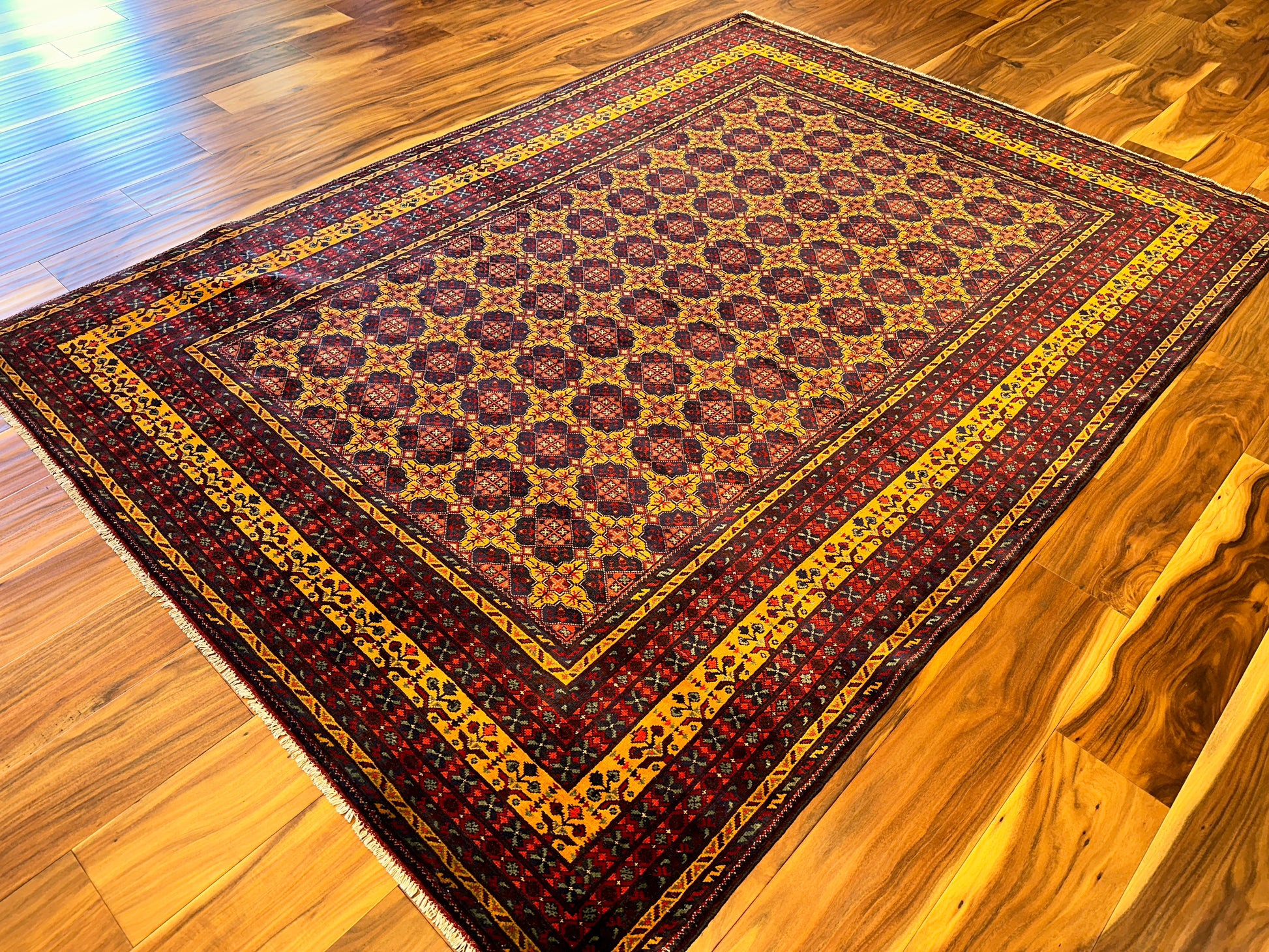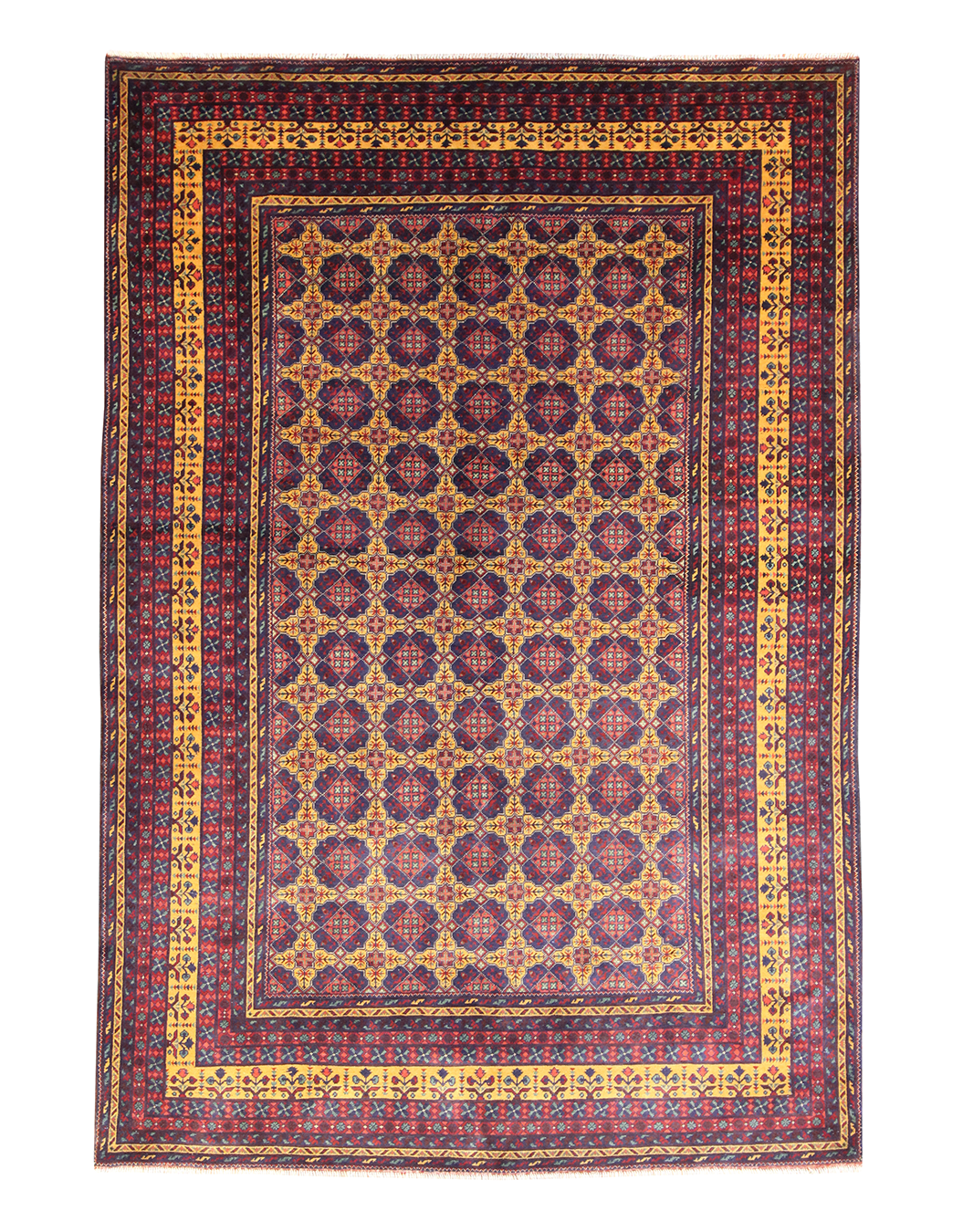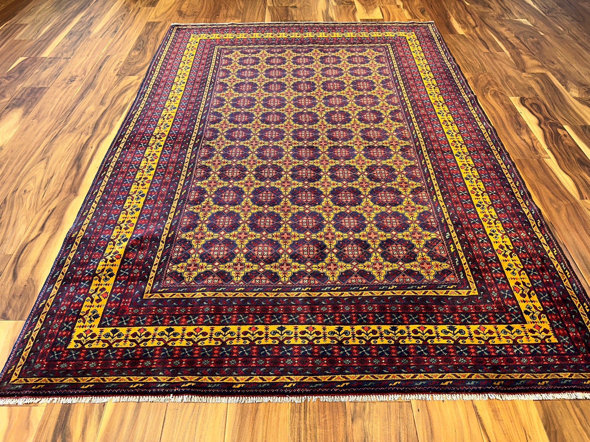 Graphic and vibrant, this hand-knotted rug features a lattice of repeating medallions in rich red and navy, accented by golden yellow flourishes that bring the pattern to life. The layered borders mirror the geometric rhythm of the field, creating a strong frame with folkloric charm. Its vivid palette and sharp symmetry make it a bold centerpiece.