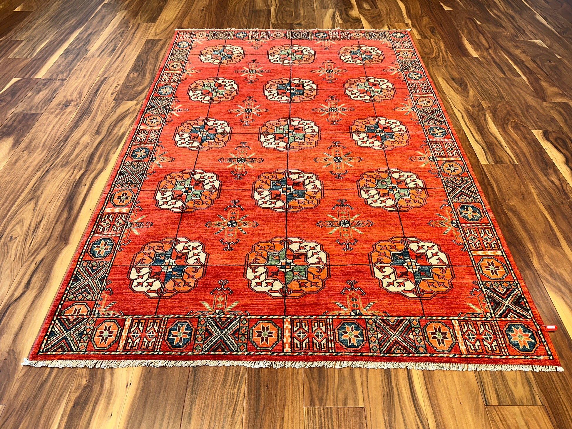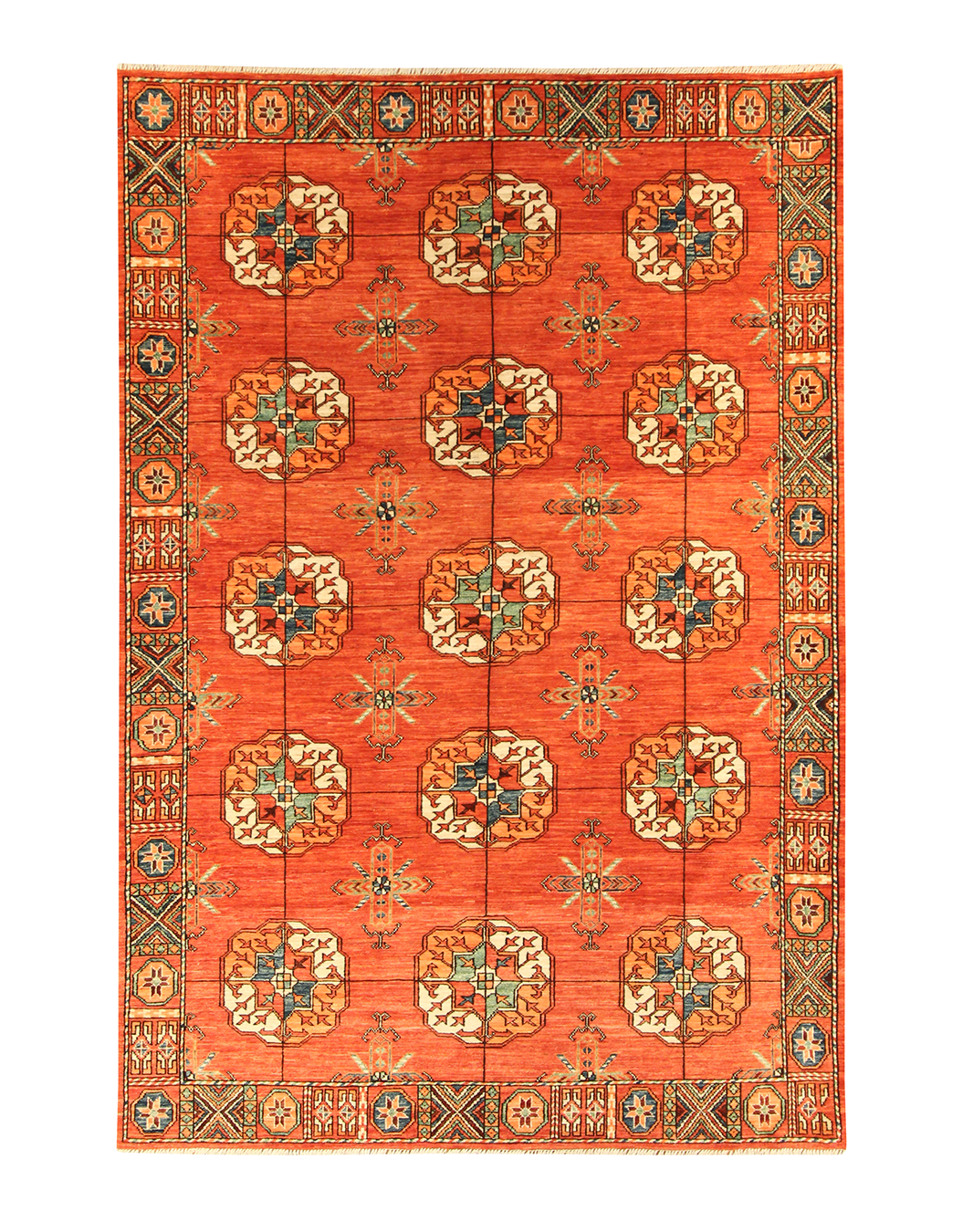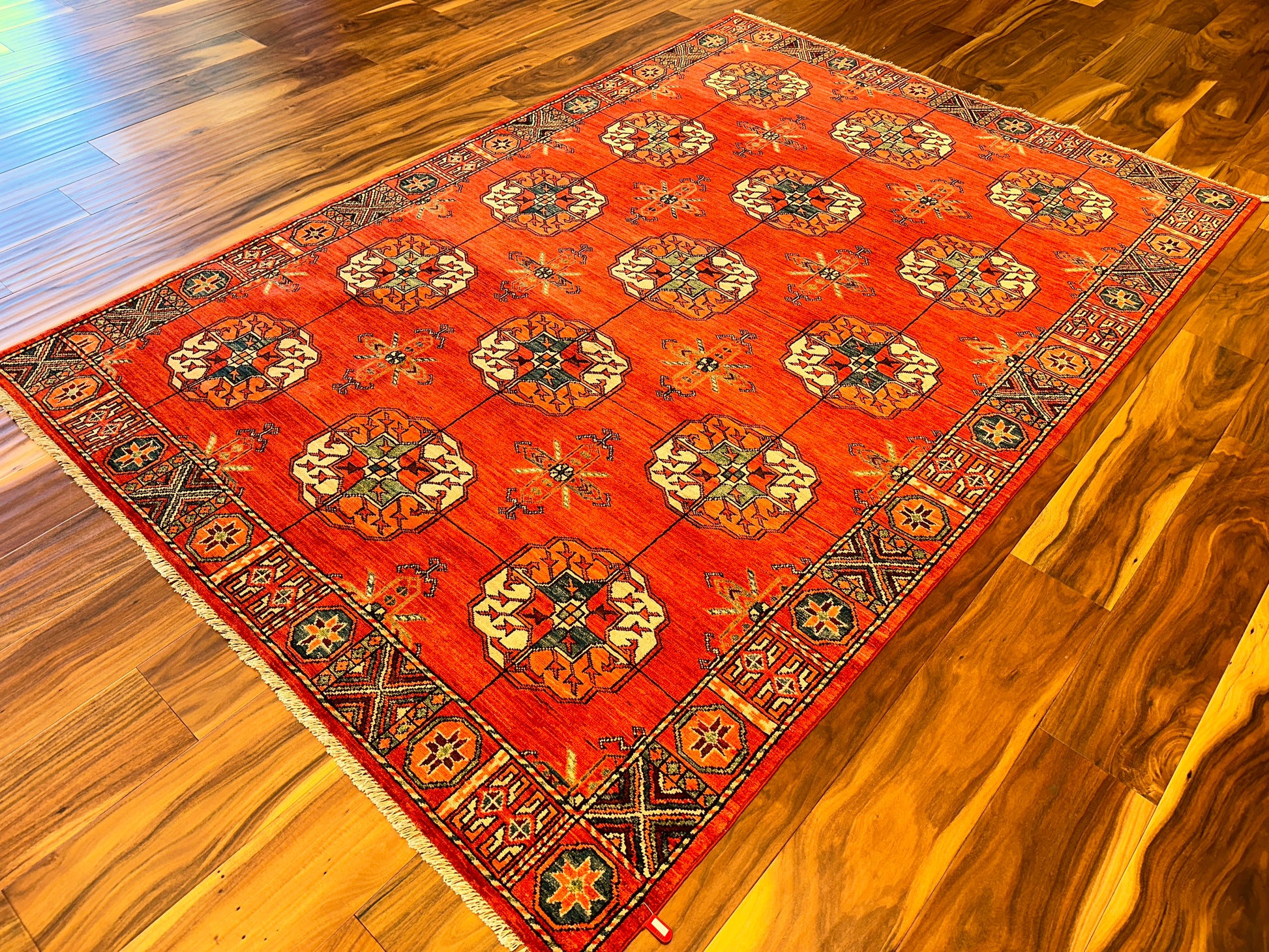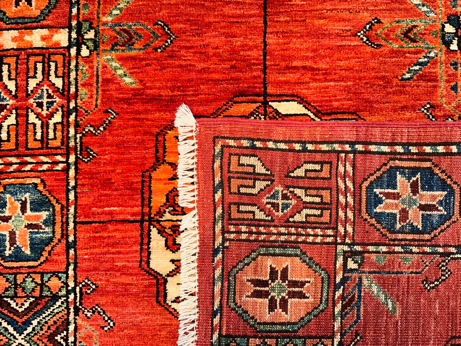 Bold and radiant, this handmade rug features a classic Turkmen-inspired gul motif set against a glowing red-orange ground. The large, repeated medallions are filled with geometric detail in shades of ivory, blue, and green, offering vibrant contrast and visual depth. A wide border of intricate tribal emblems frames the composition with symmetry and strength, giving the piece a distinctly heritage-rich feel.