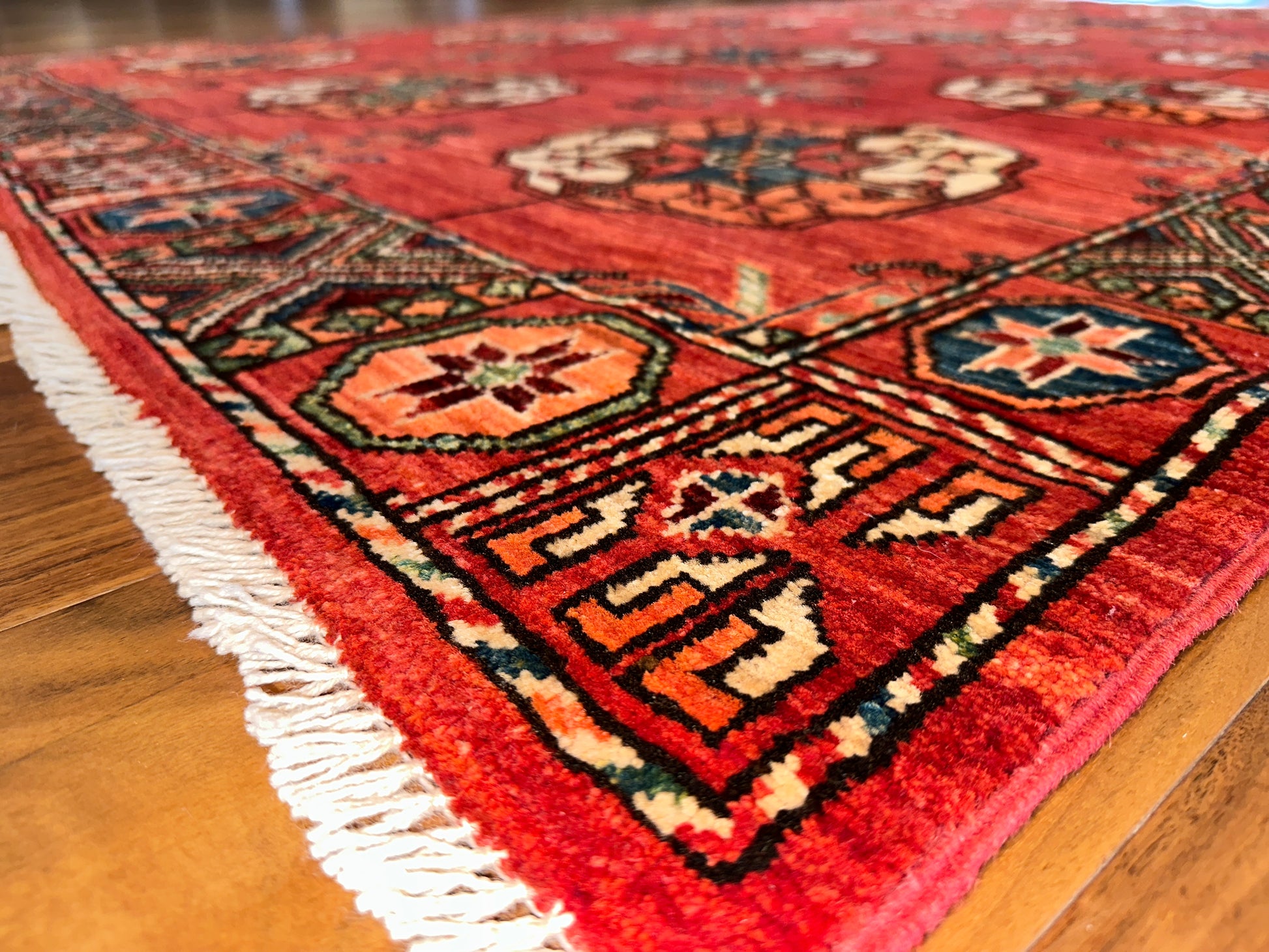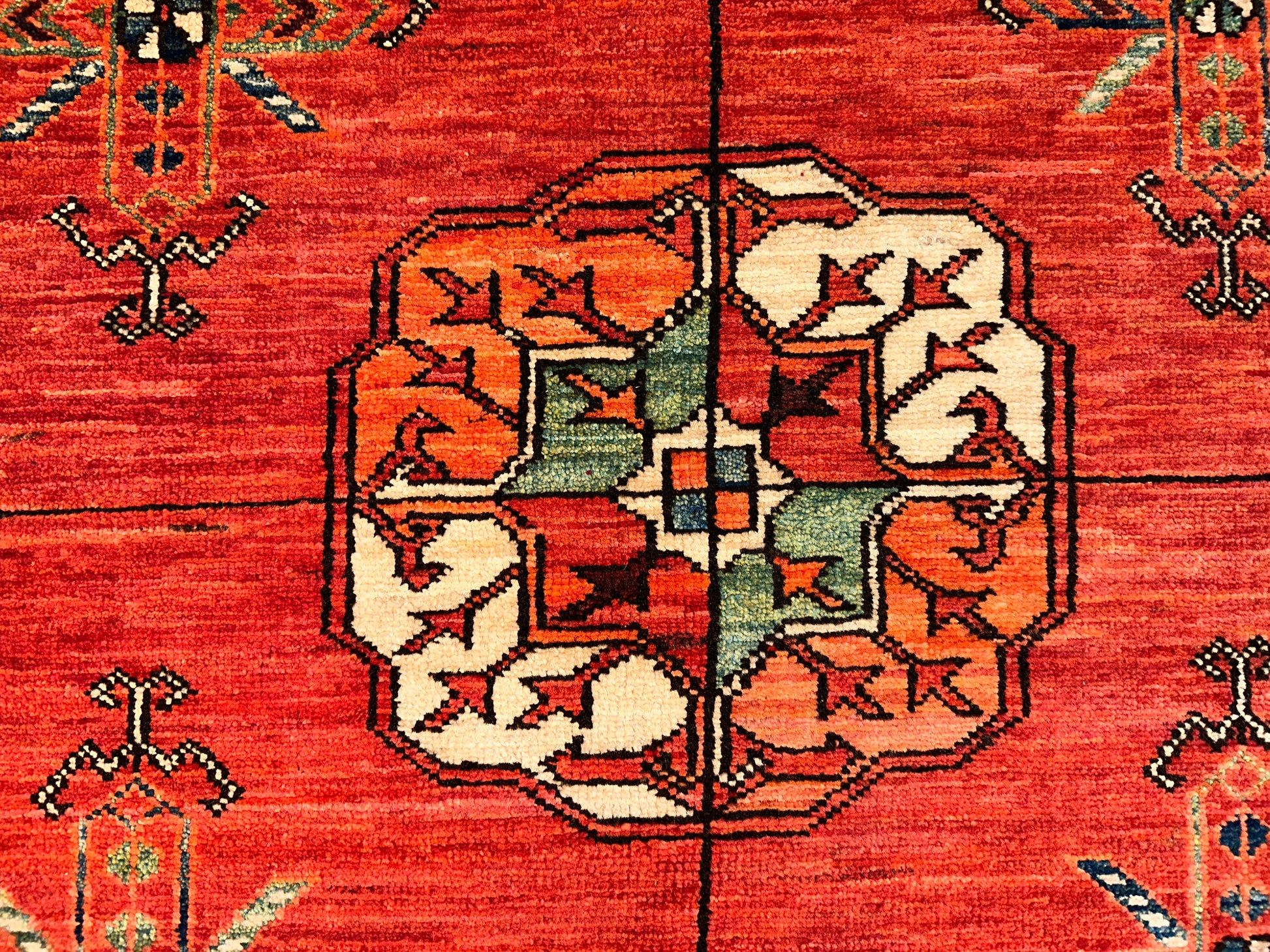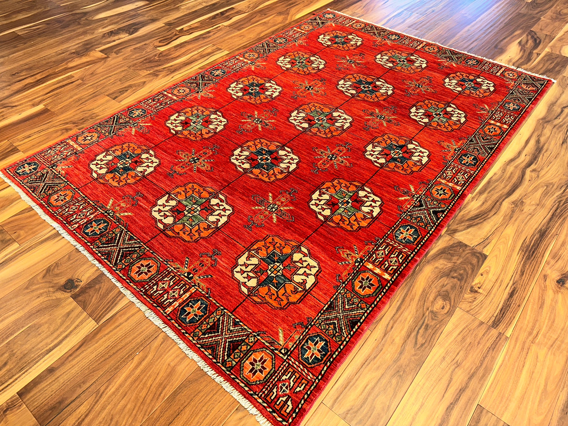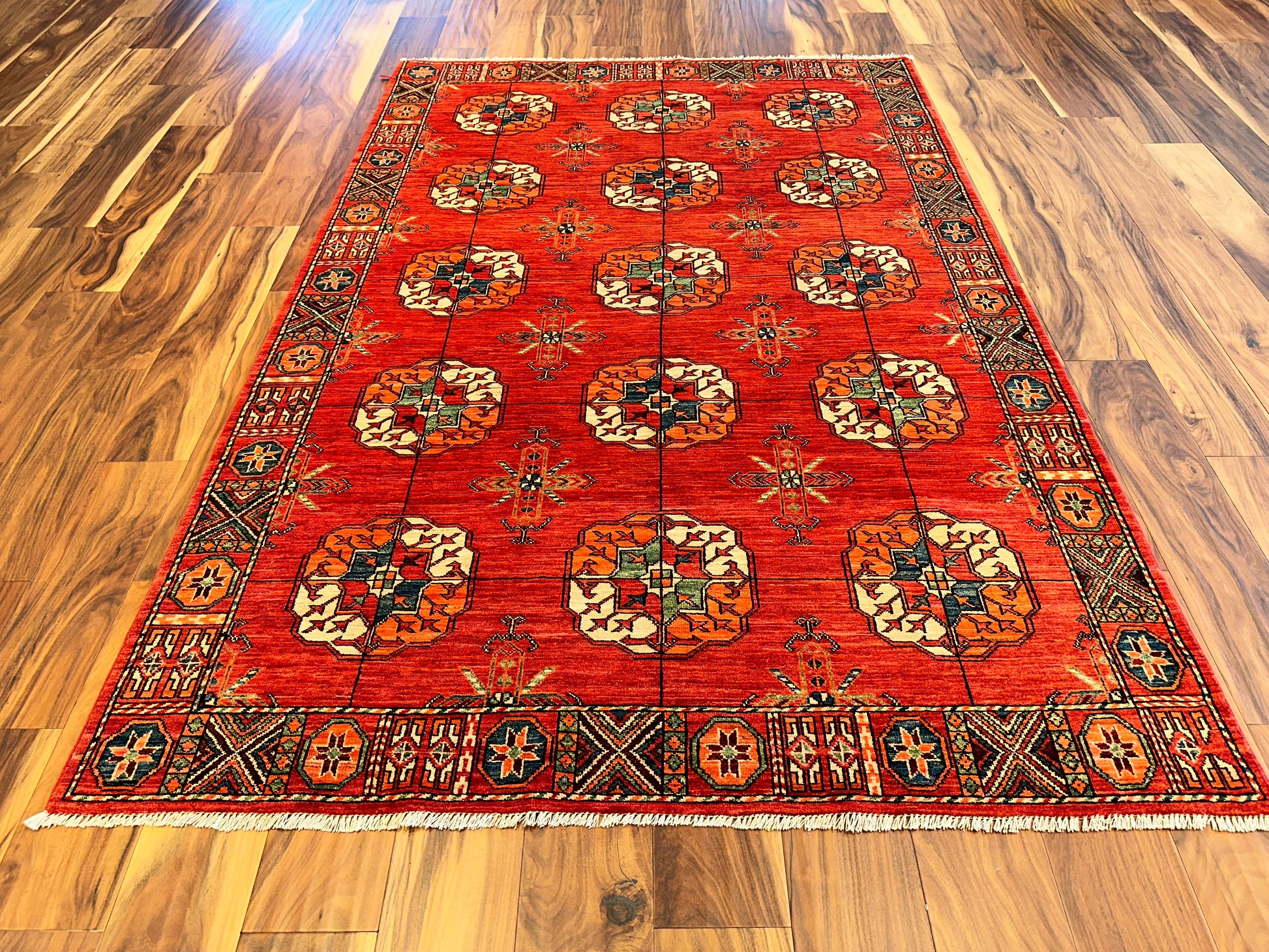 Bold and radiant, this handmade rug features a classic Turkmen-inspired gul motif set against a glowing red-orange ground. The large, repeated medallions are filled with geometric detail in shades of ivory, blue, and green, offering vibrant contrast and visual depth. A wide border of intricate tribal emblems frames the composition with symmetry and strength, giving the piece a distinctly heritage-rich feel.