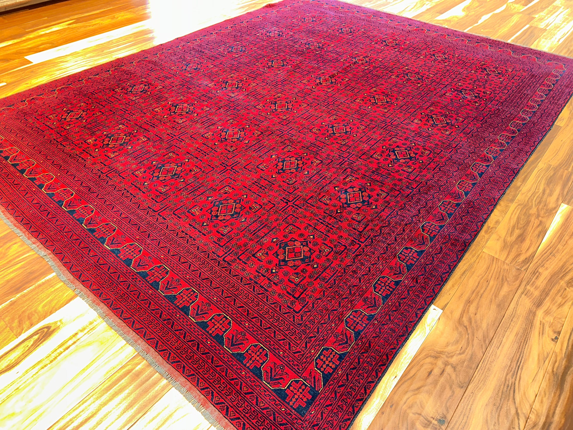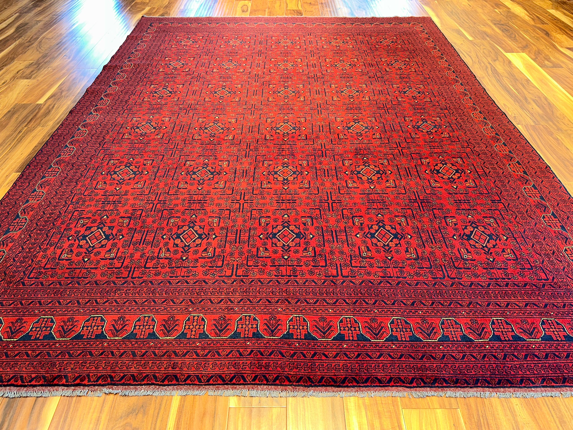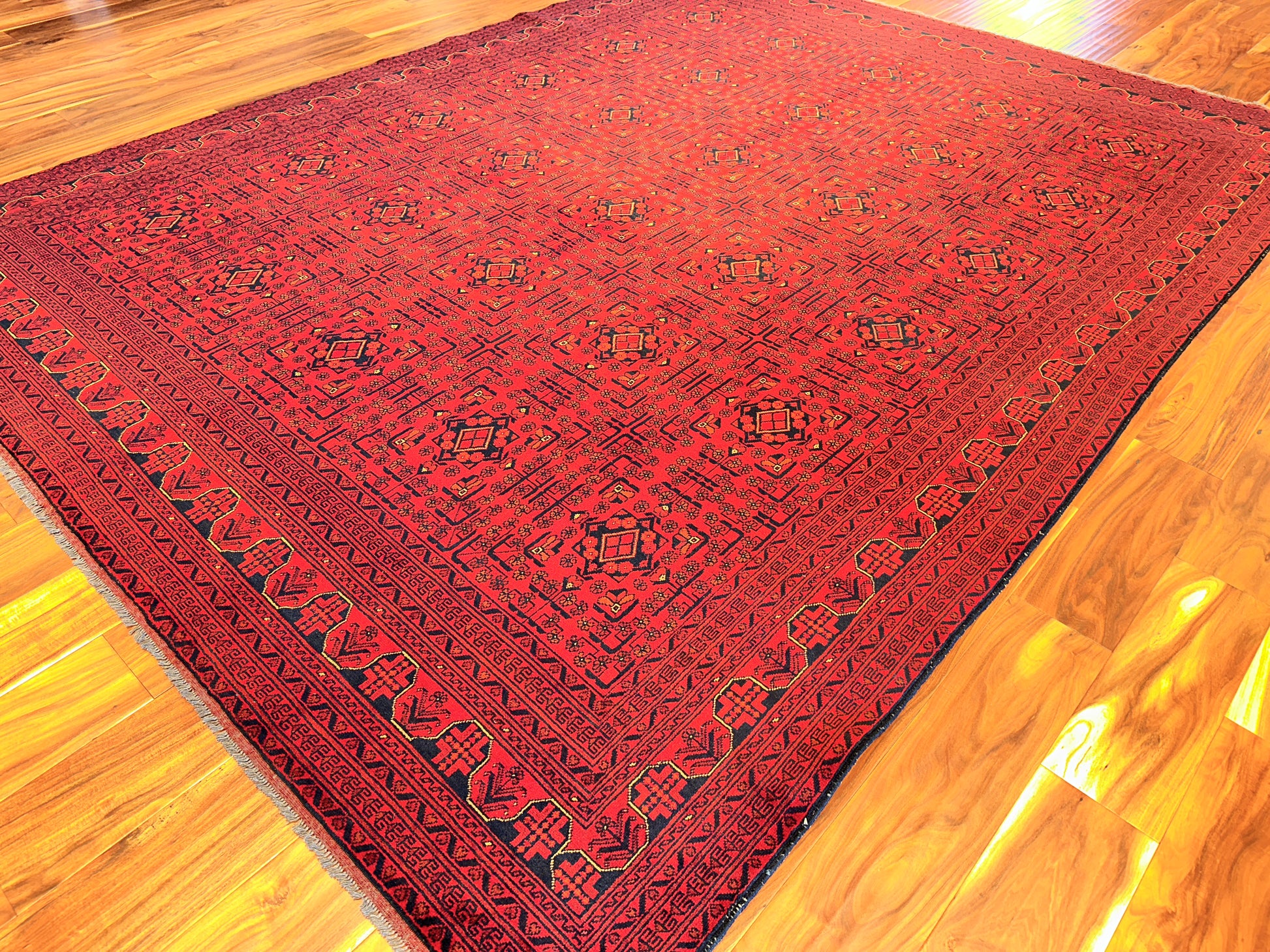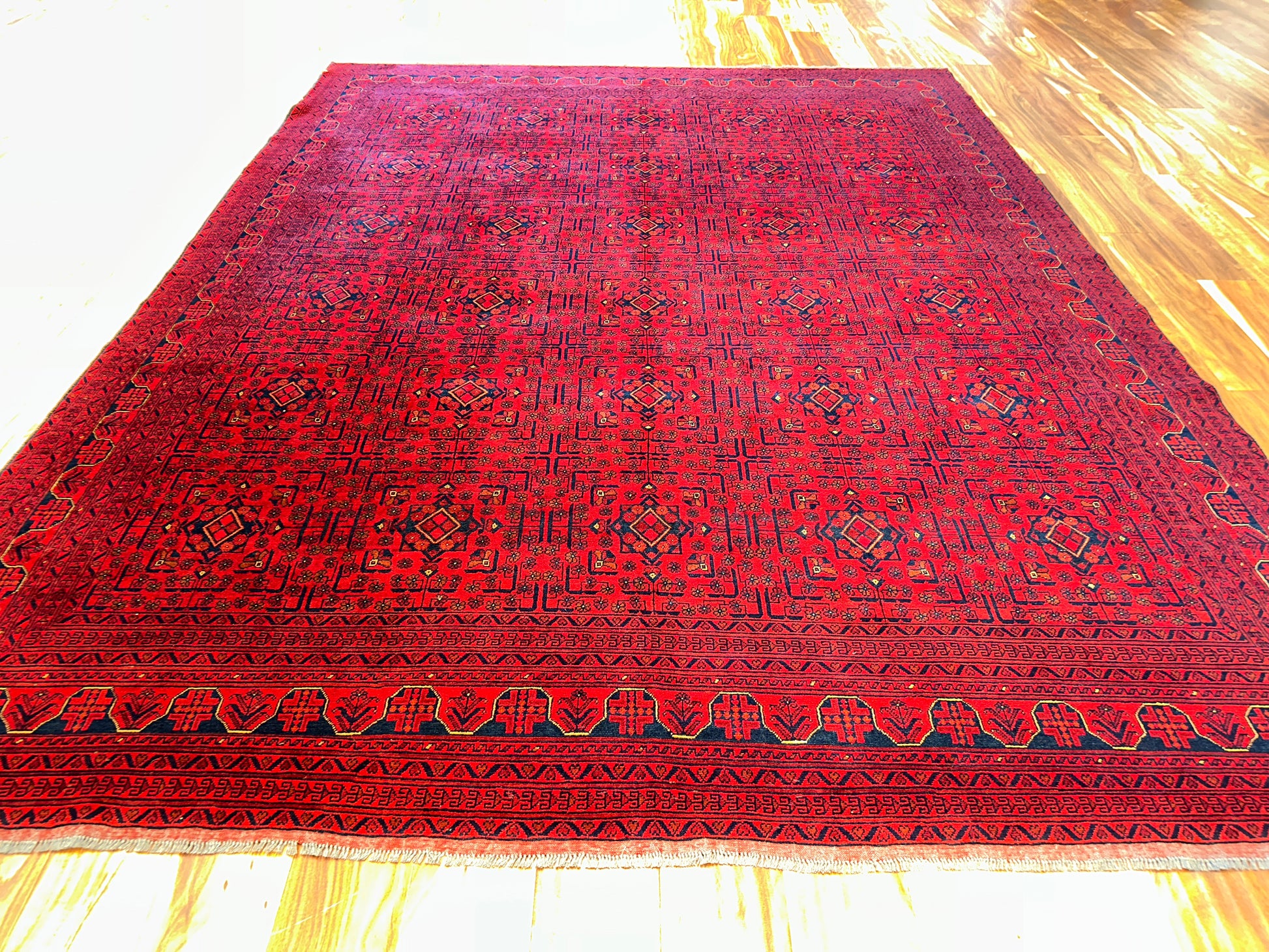 This commanding handwoven rug showcases a rich crimson ground densely patterned with repeating gul motifs, a hallmark of traditional Turkoman and Afghan tribal design. Deep navy and black accents add weight and structure, while fine detailing in ivory and soft rust tones bring subtle dimension. With its compact geometry and saturated palette, this rug adds warmth and depth to any room.