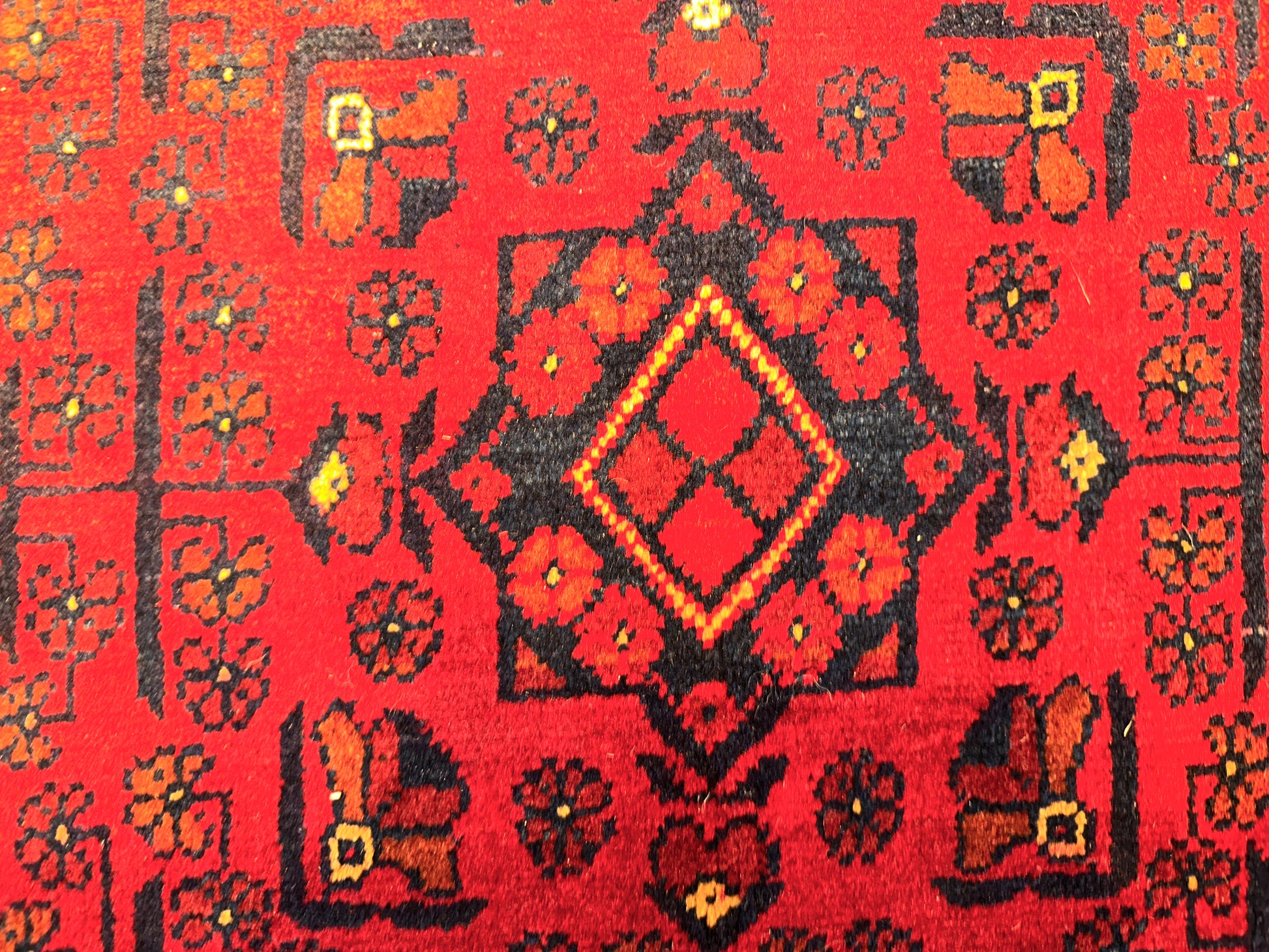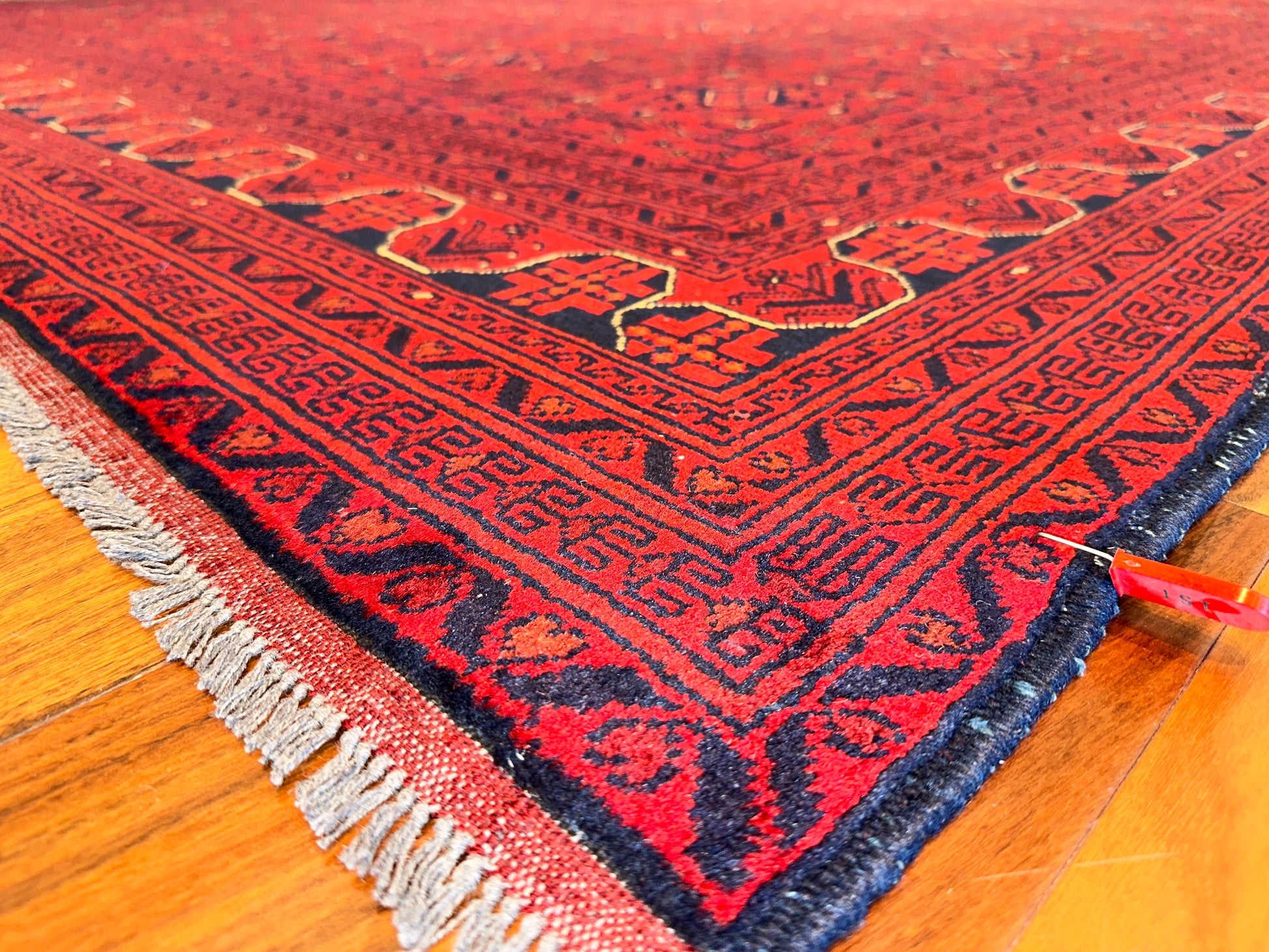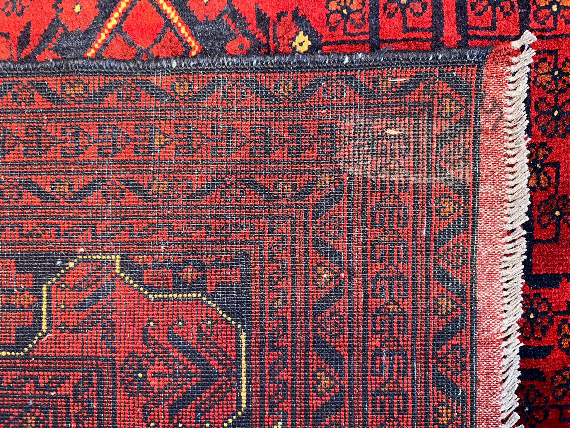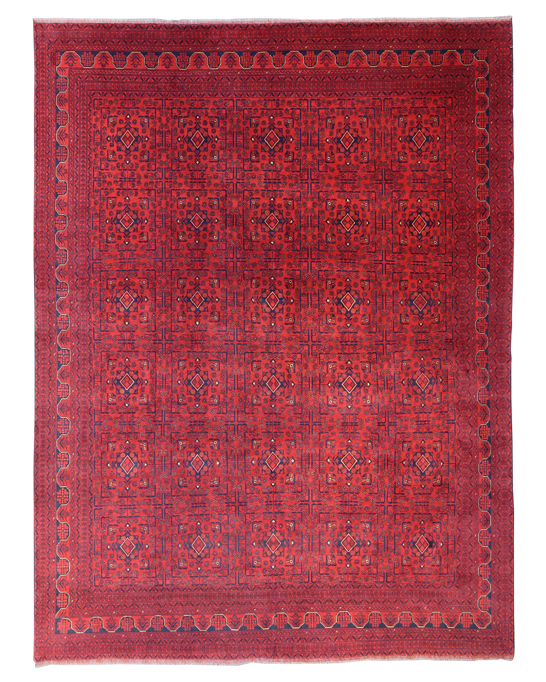 This commanding handwoven rug showcases a rich crimson ground densely patterned with repeating gul motifs, a hallmark of traditional Turkoman and Afghan tribal design. Deep navy and black accents add weight and structure, while fine detailing in ivory and soft rust tones bring subtle dimension. With its compact geometry and saturated palette, this rug adds warmth and depth to any room.